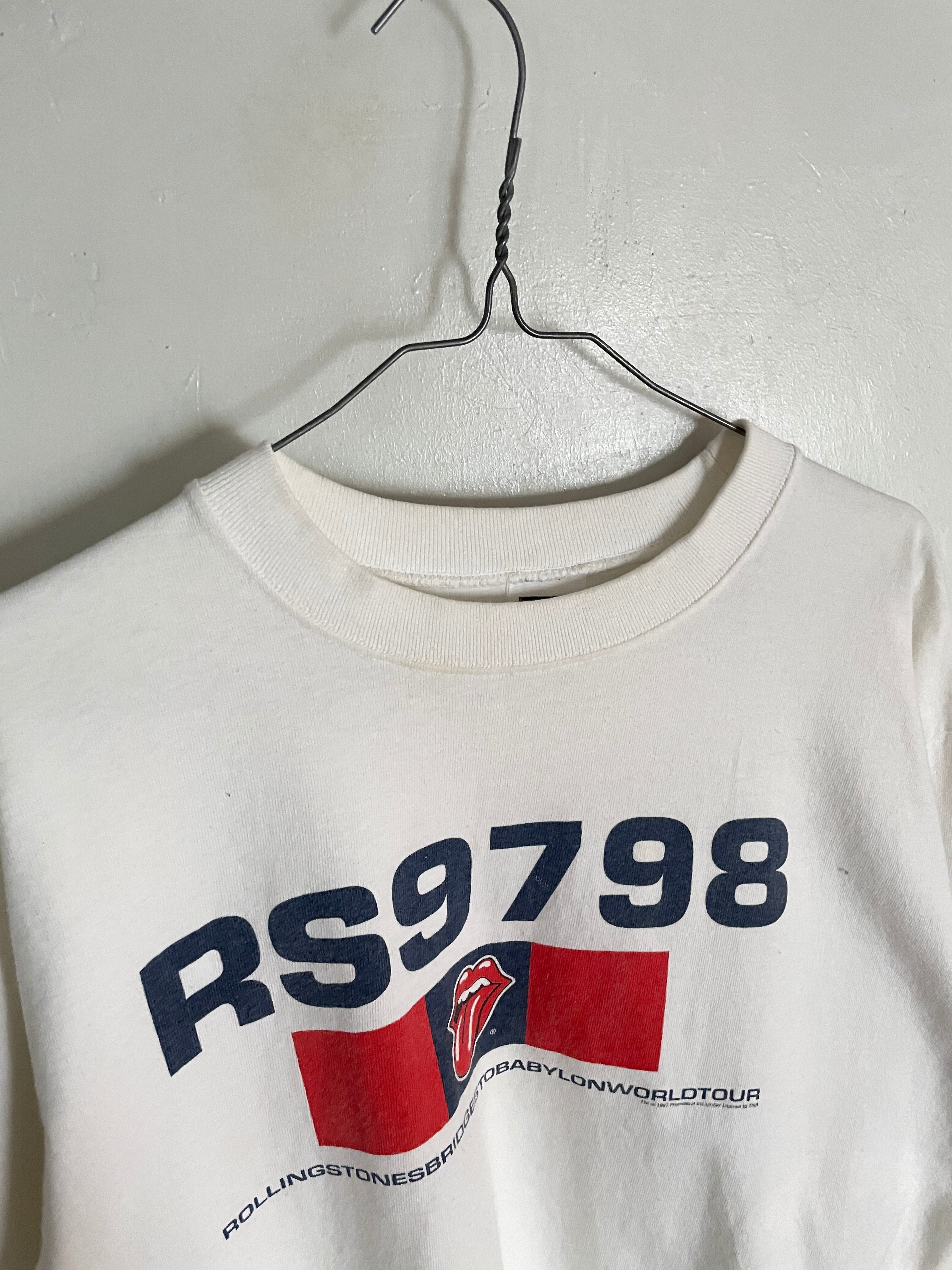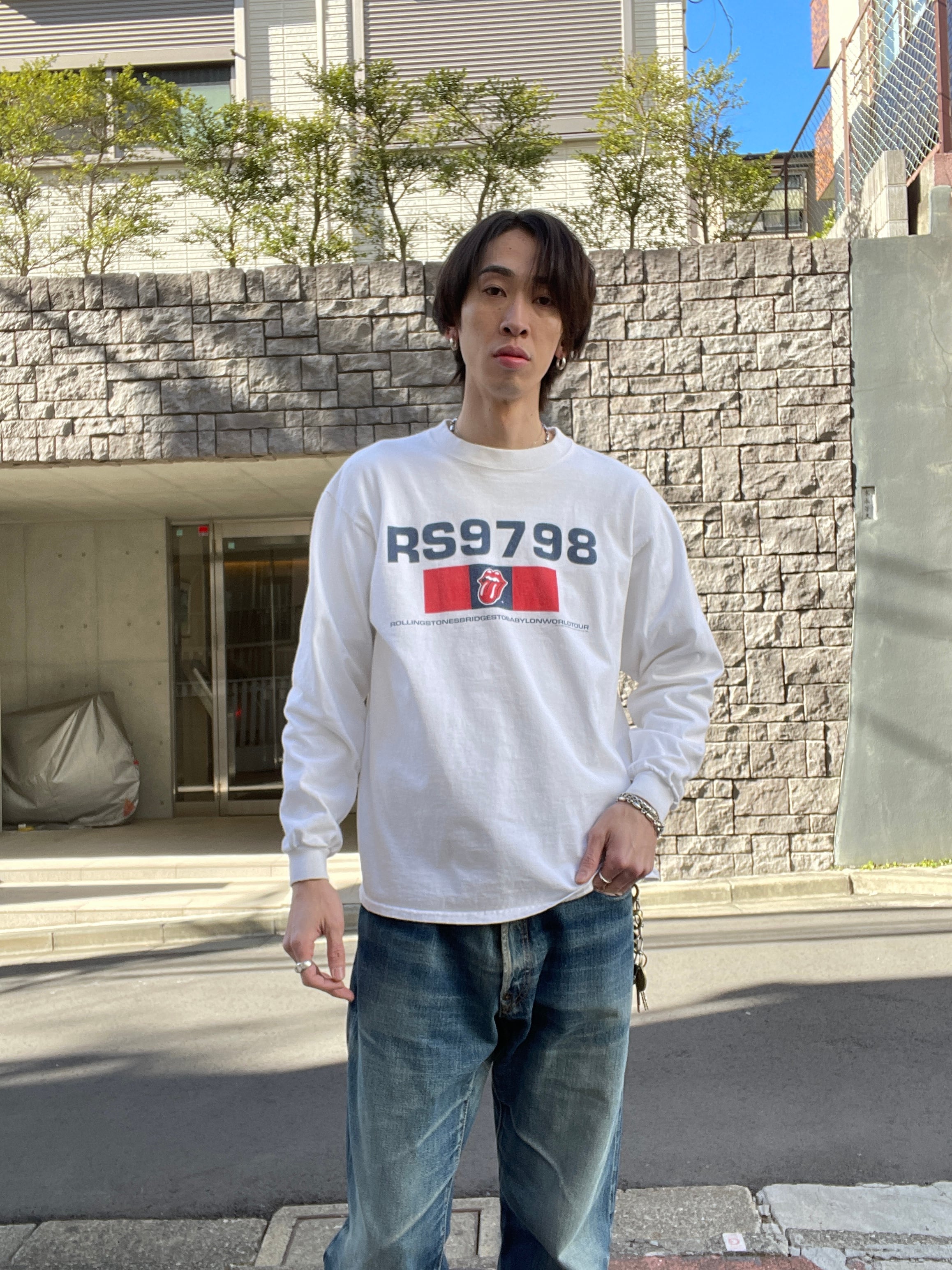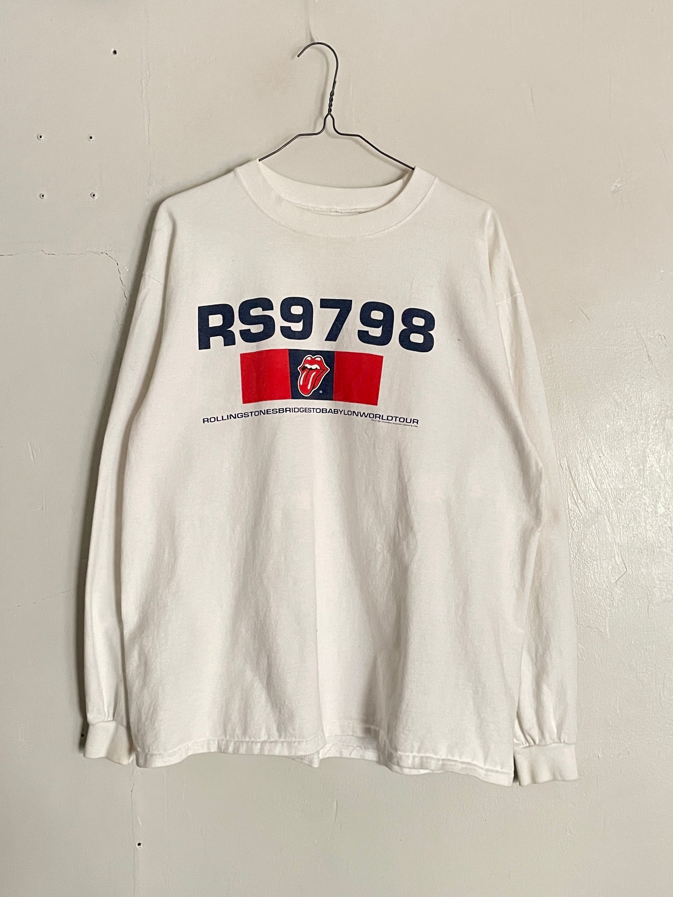 ホワイトボディに、ローリングストーンズの”Bridges to Babylon World Tour"のプリントが施されたロンT。ローリングストーンズのシンボル”リップス・アンド・タン”のプリントと、”RS9798"のプリントが特徴的です。もちろんUSA製で、サイズもLとゆったりめ。バンドTシャツの長袖はなかなか手に入りにくくなってきました。お探しの方は是非。