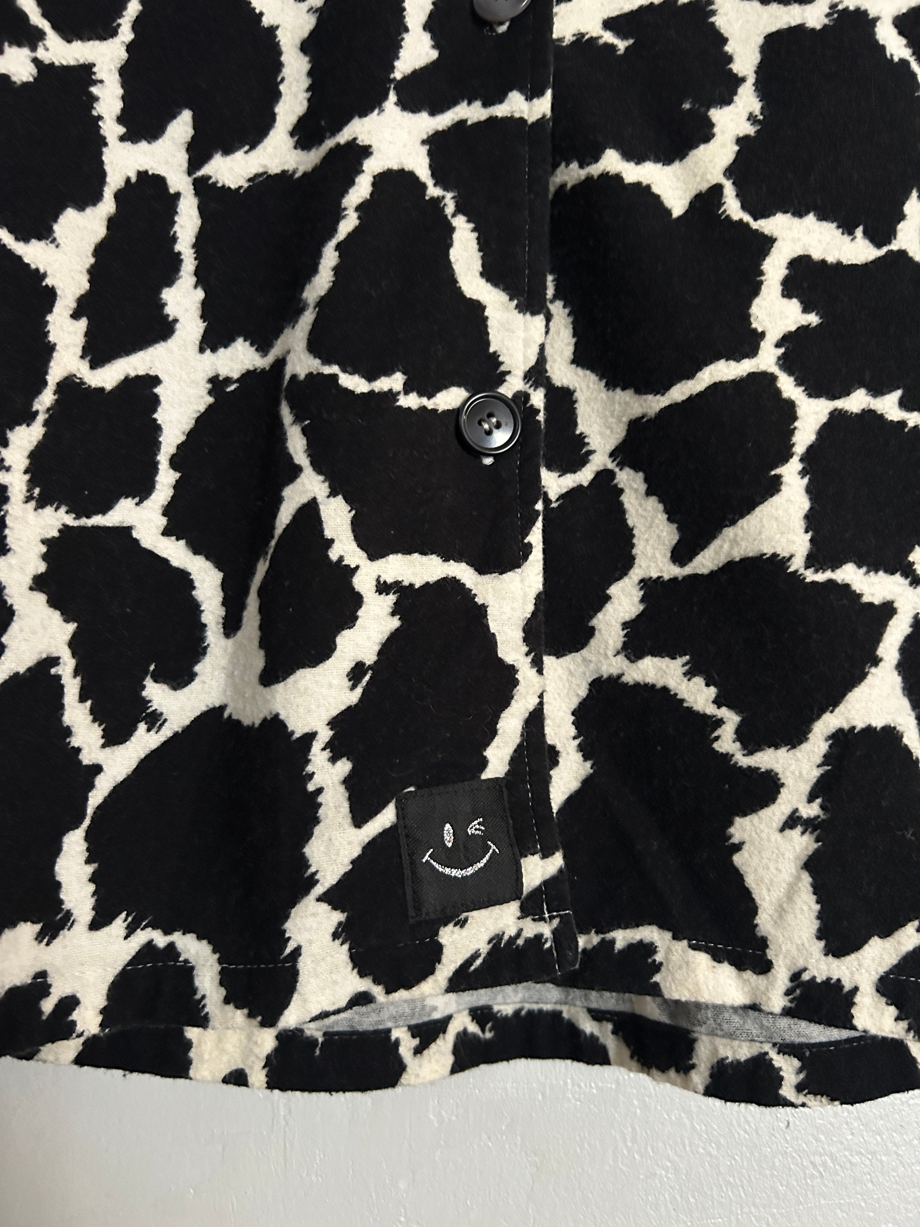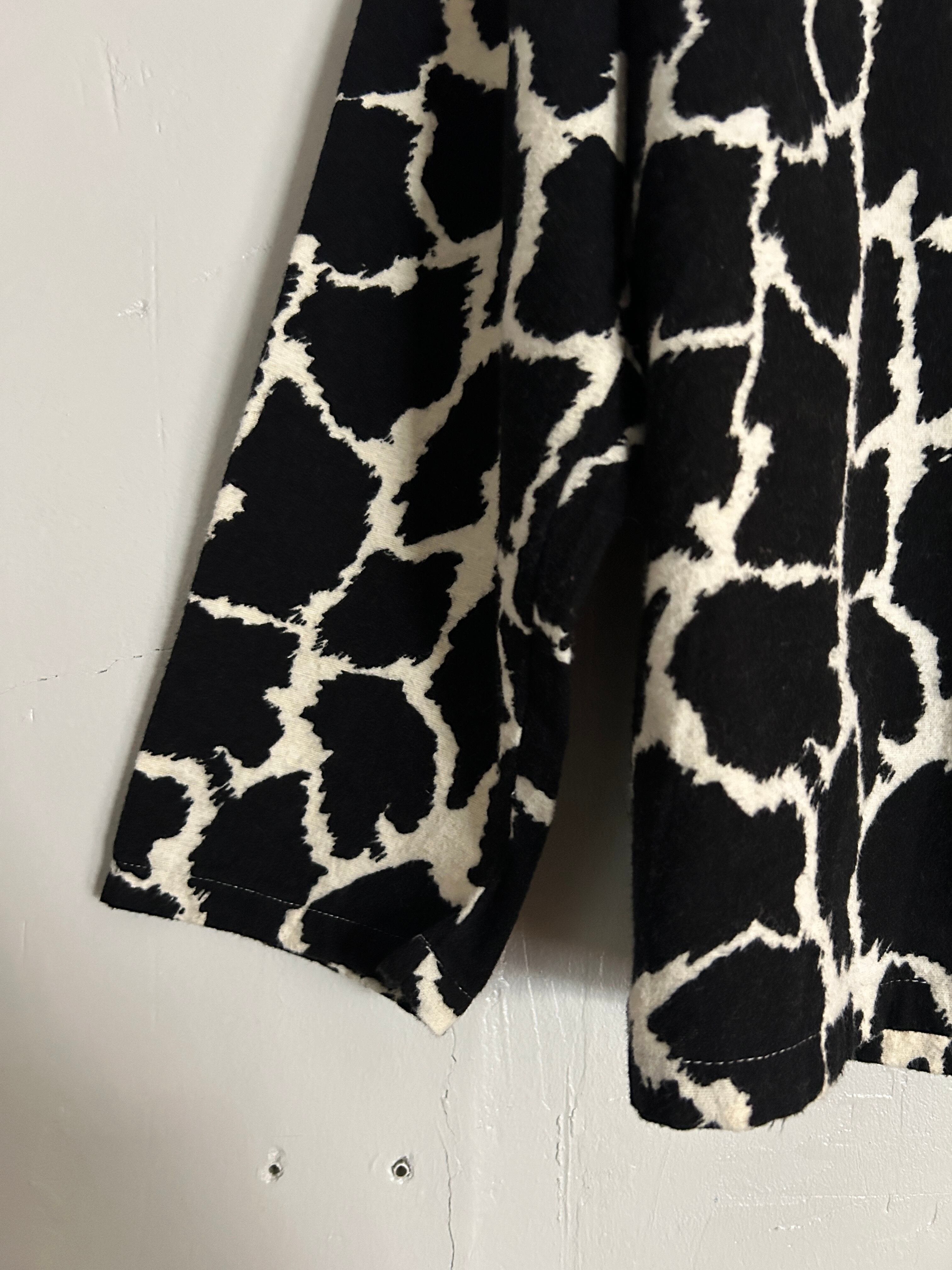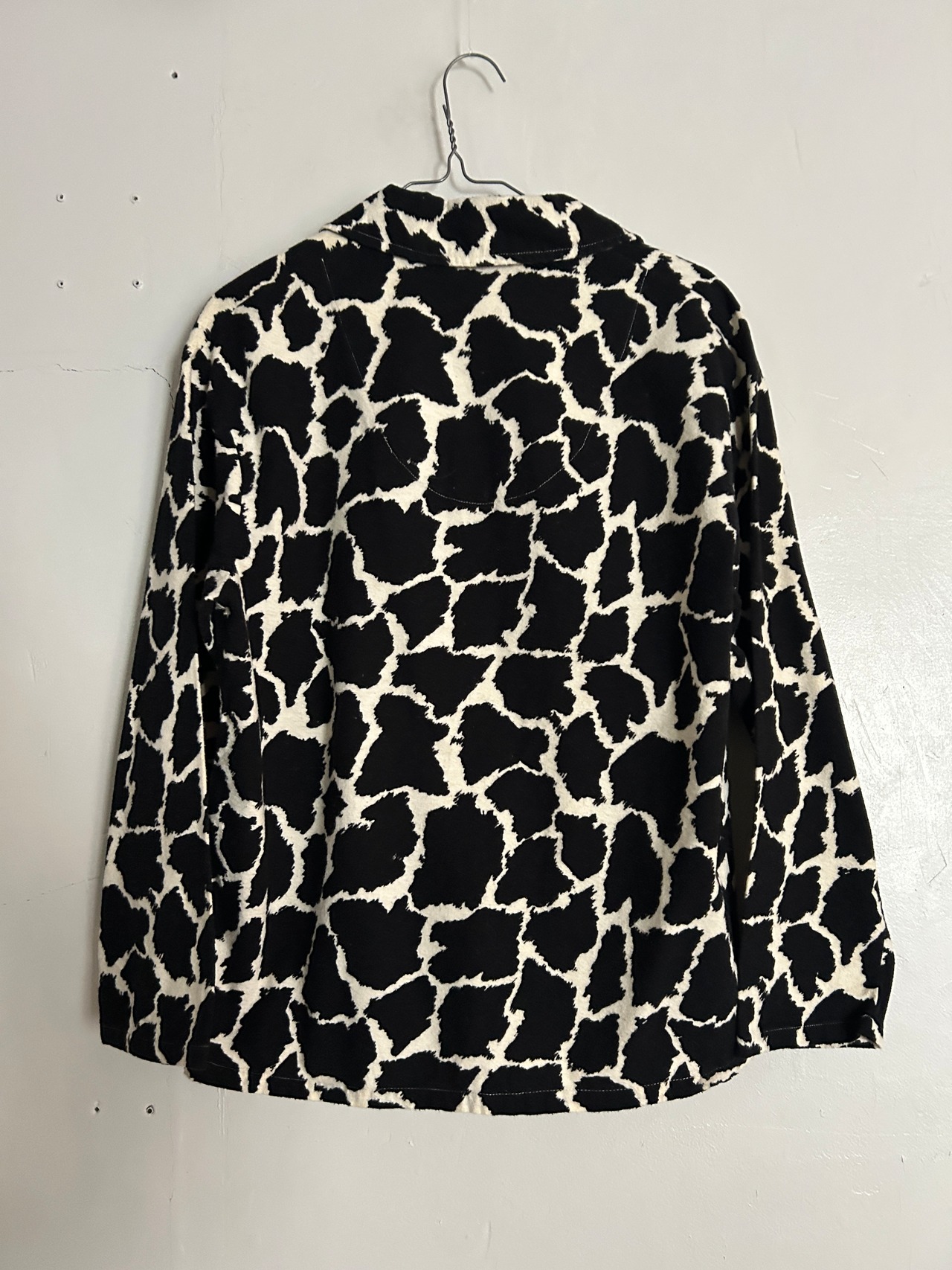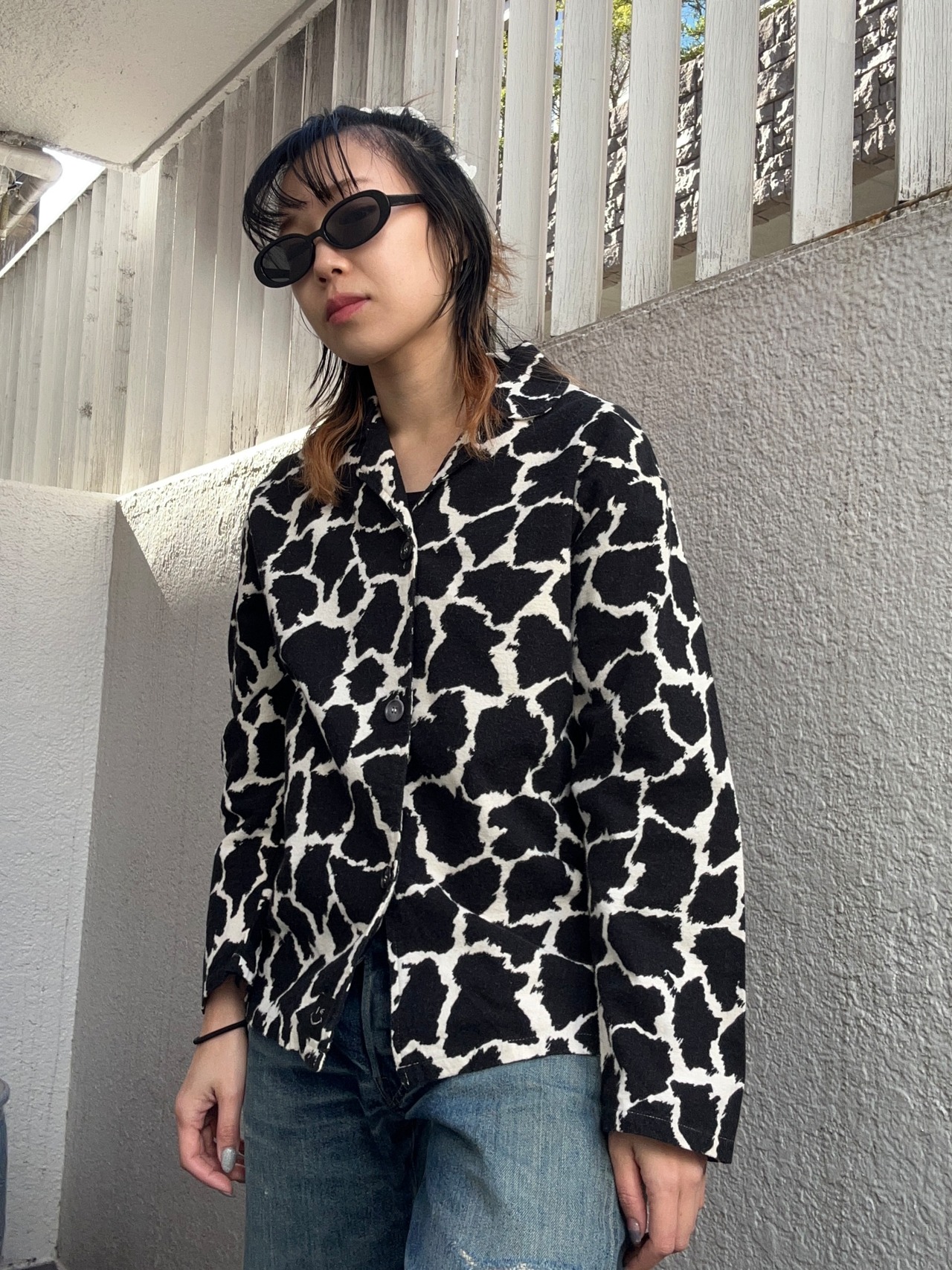 ひび割れのような総柄が目を引くパジャマシャツ。アニマル柄にも見える独特なパターンで、シンプルなコーデに羽織るだけで一気に主役級。よくあるパジャマシャツよりしっかりとした生地感です。一枚でもレイヤードでチラッと見せても◎