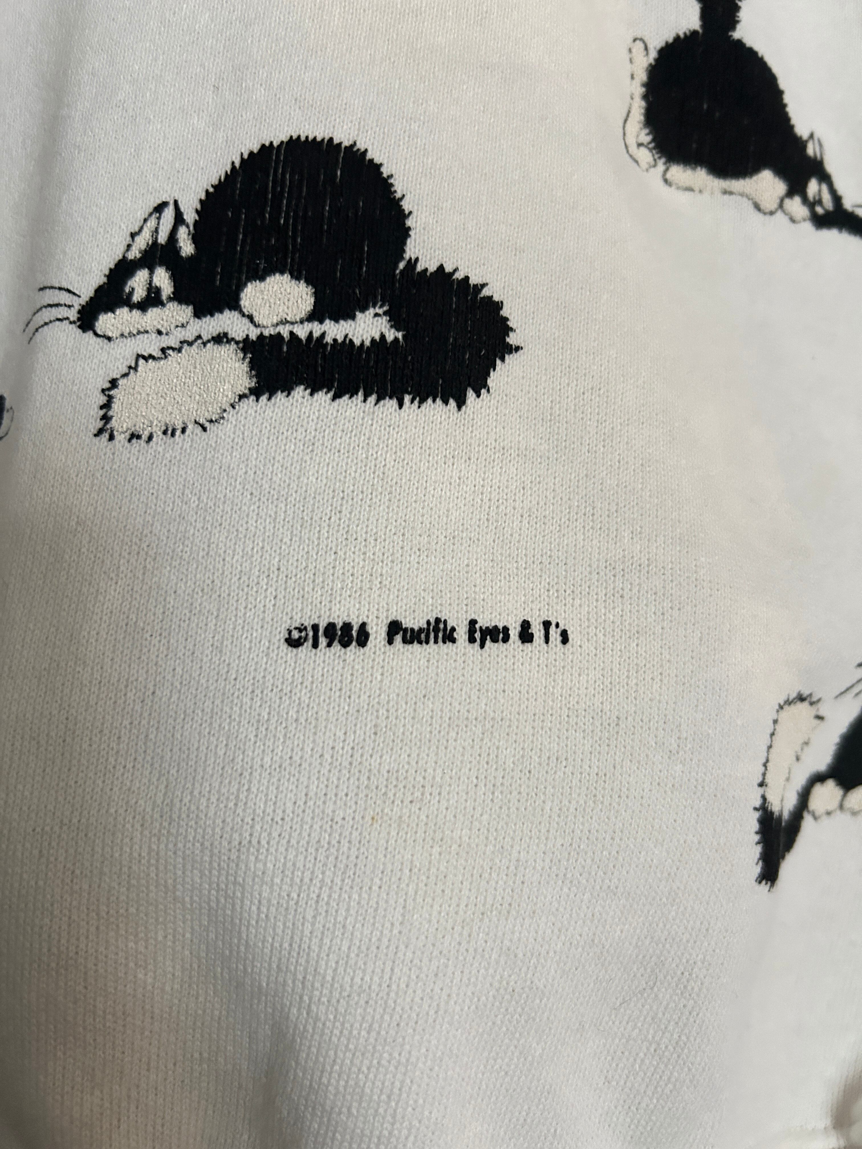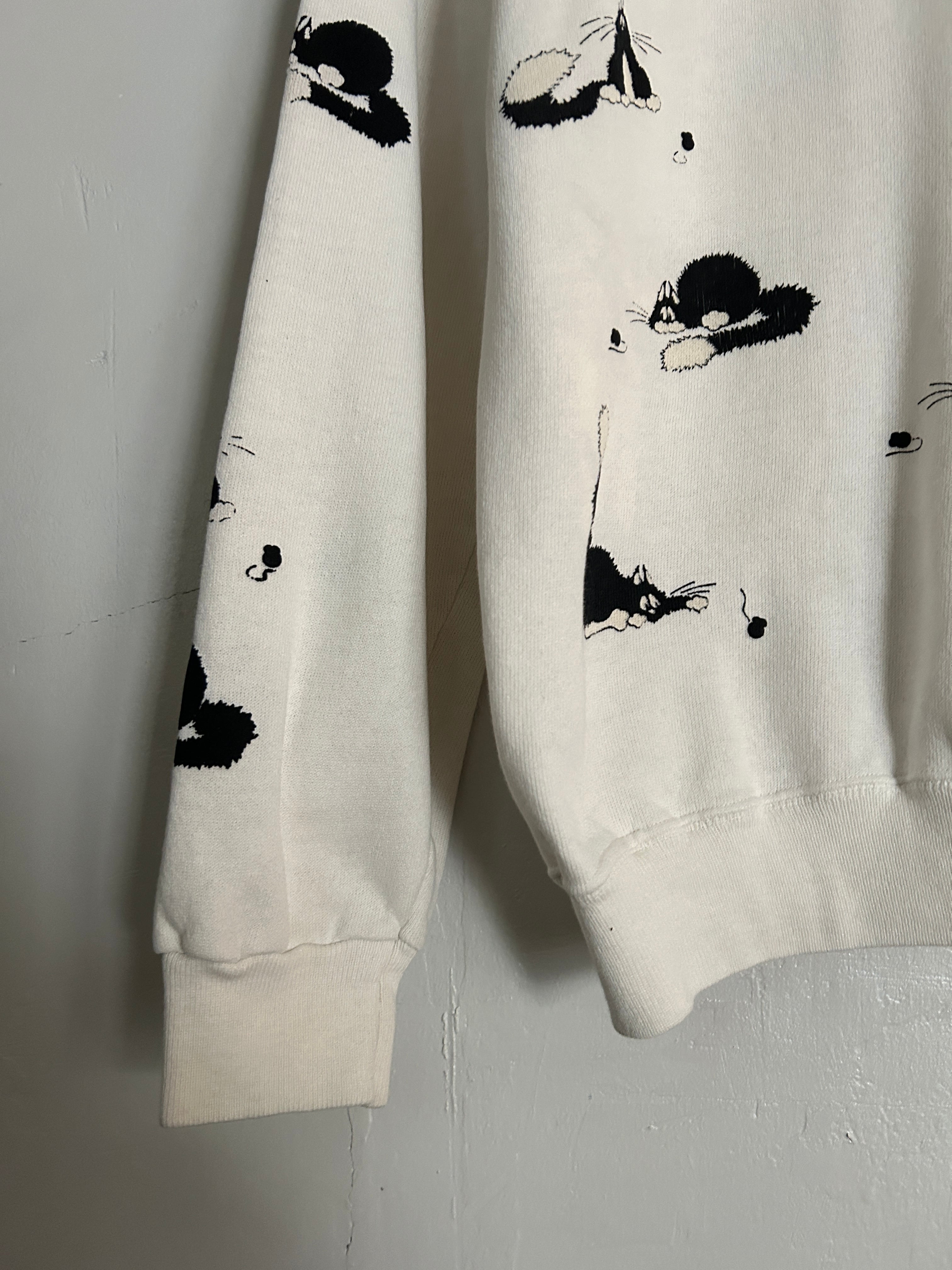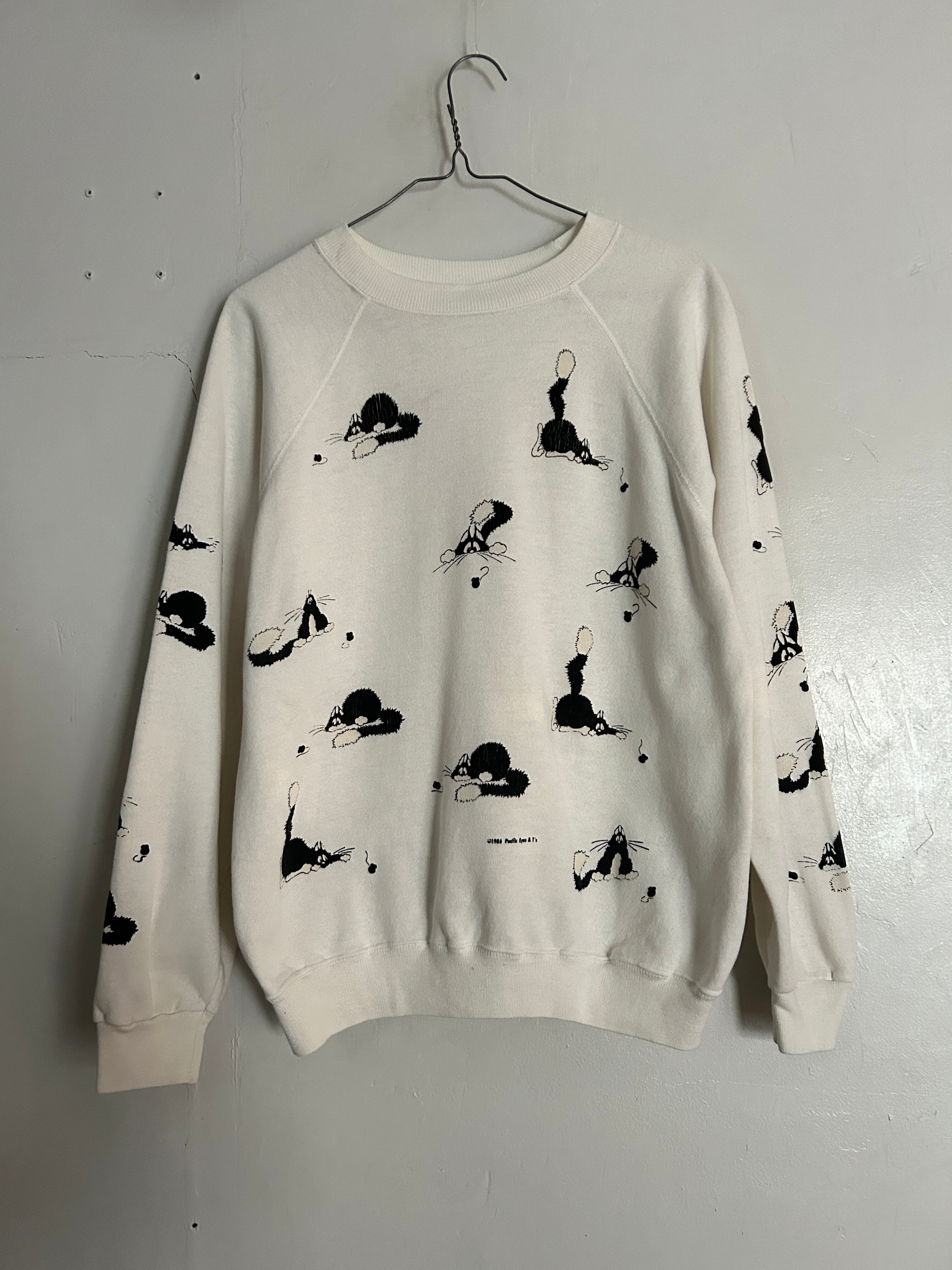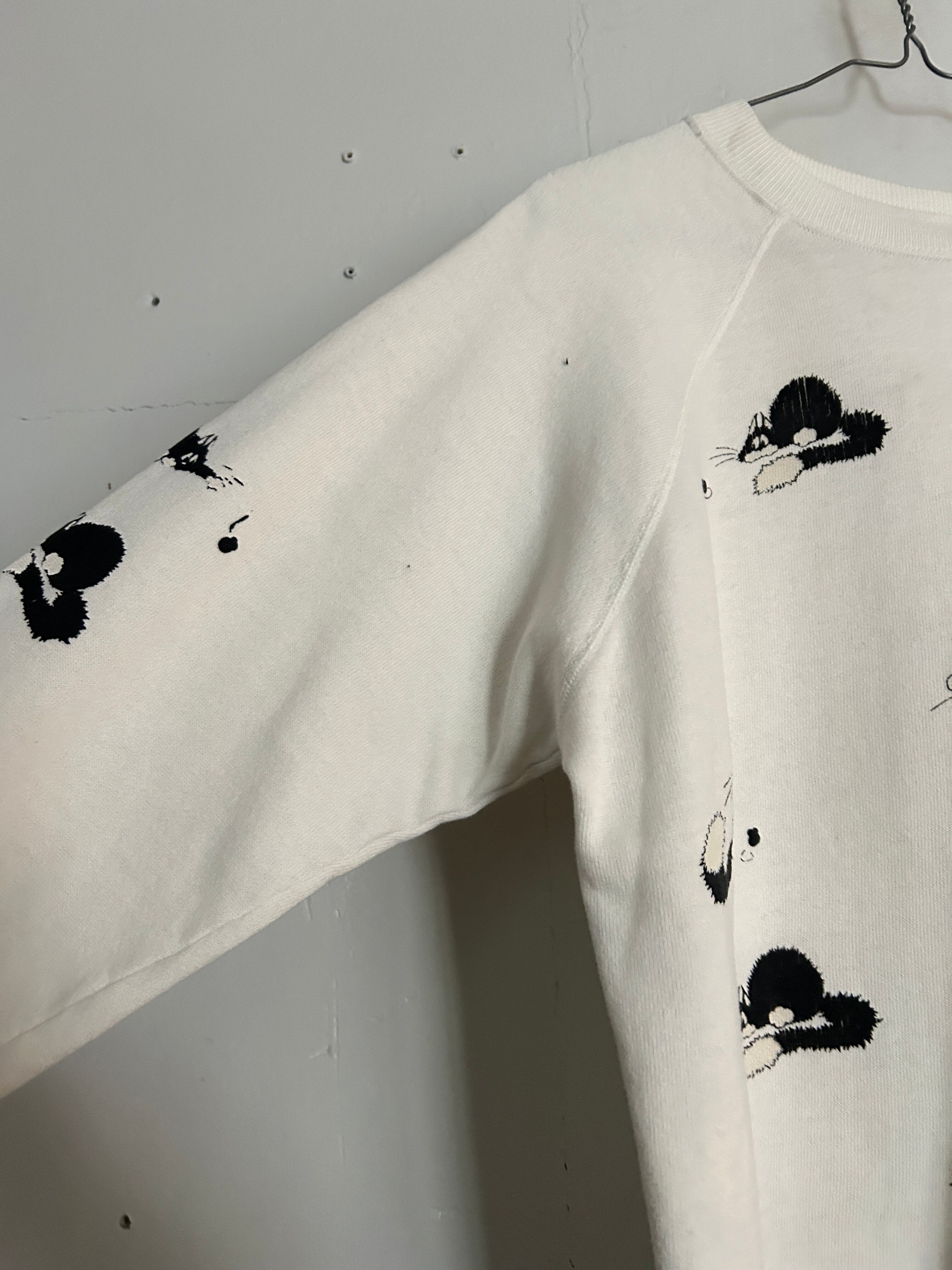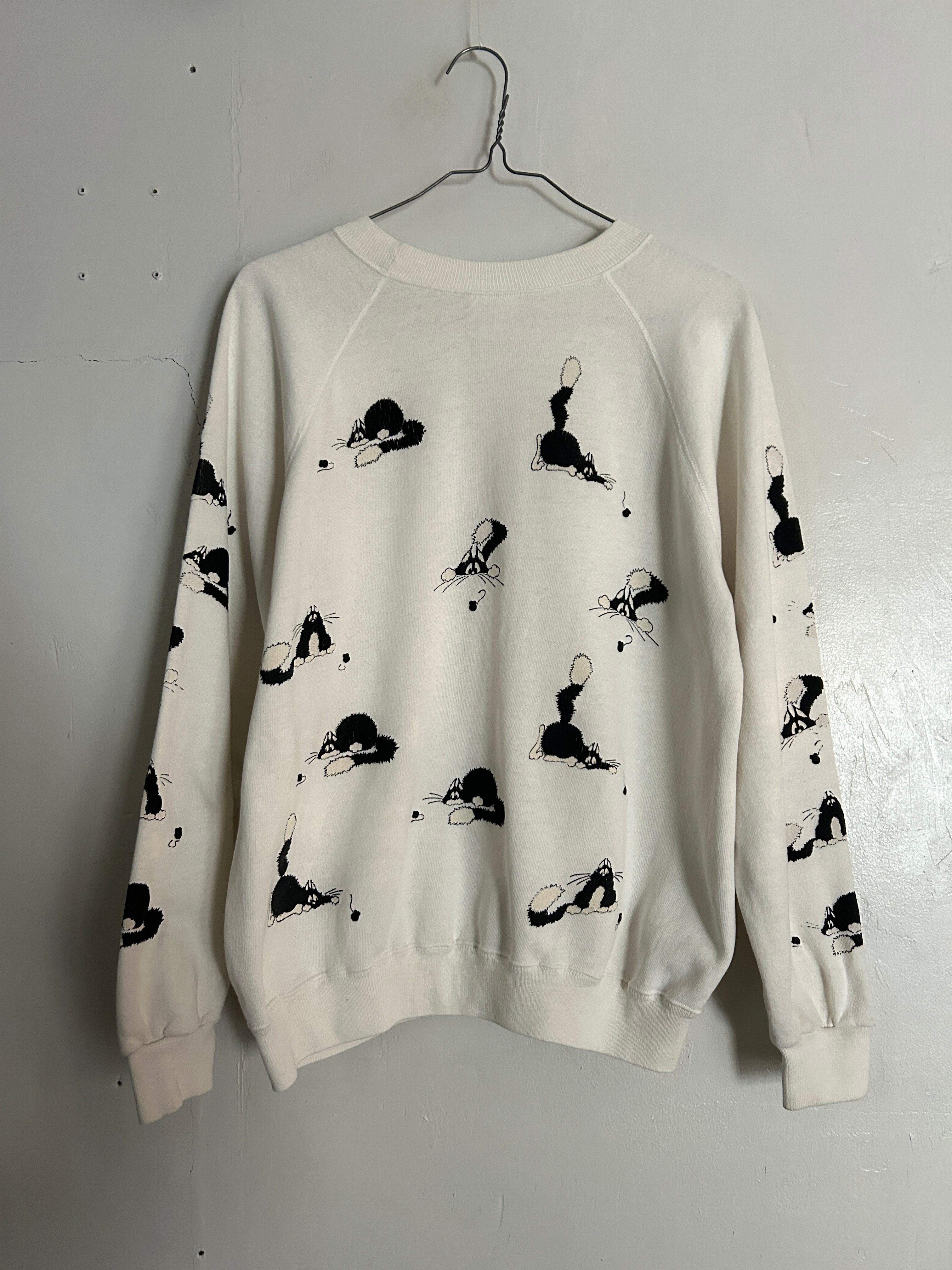 ホワイトボディに、いたずらっぽい表情のネコモチーフが散りばめられた総柄スウェット。ふ袖までしっかりプリントがあり単色配色ながら、動きのあるデザインで程よく存在感のある一枚です。ラグランスリーブで肩まわりも楽な着心地。86年のコピーライト有り。