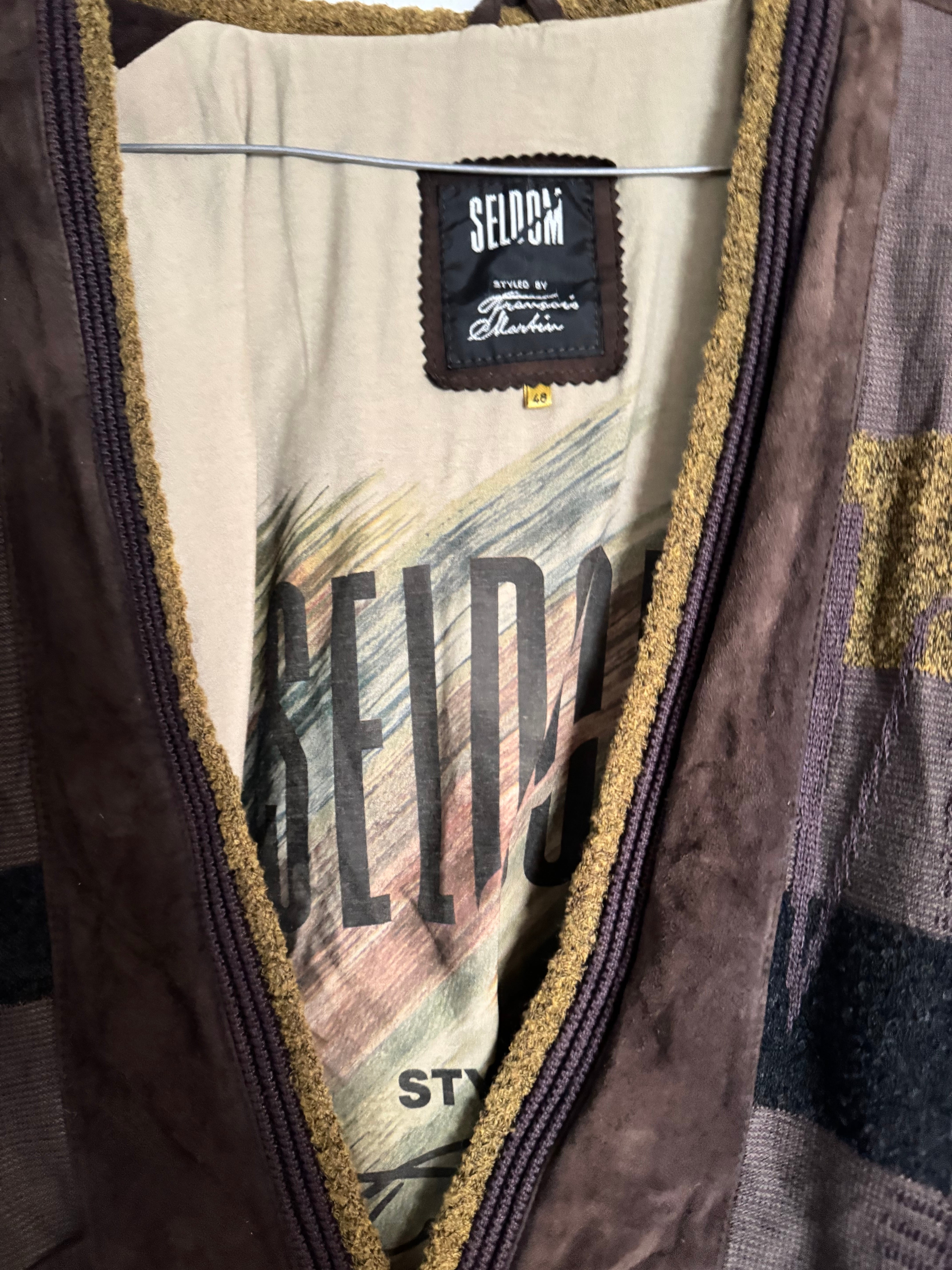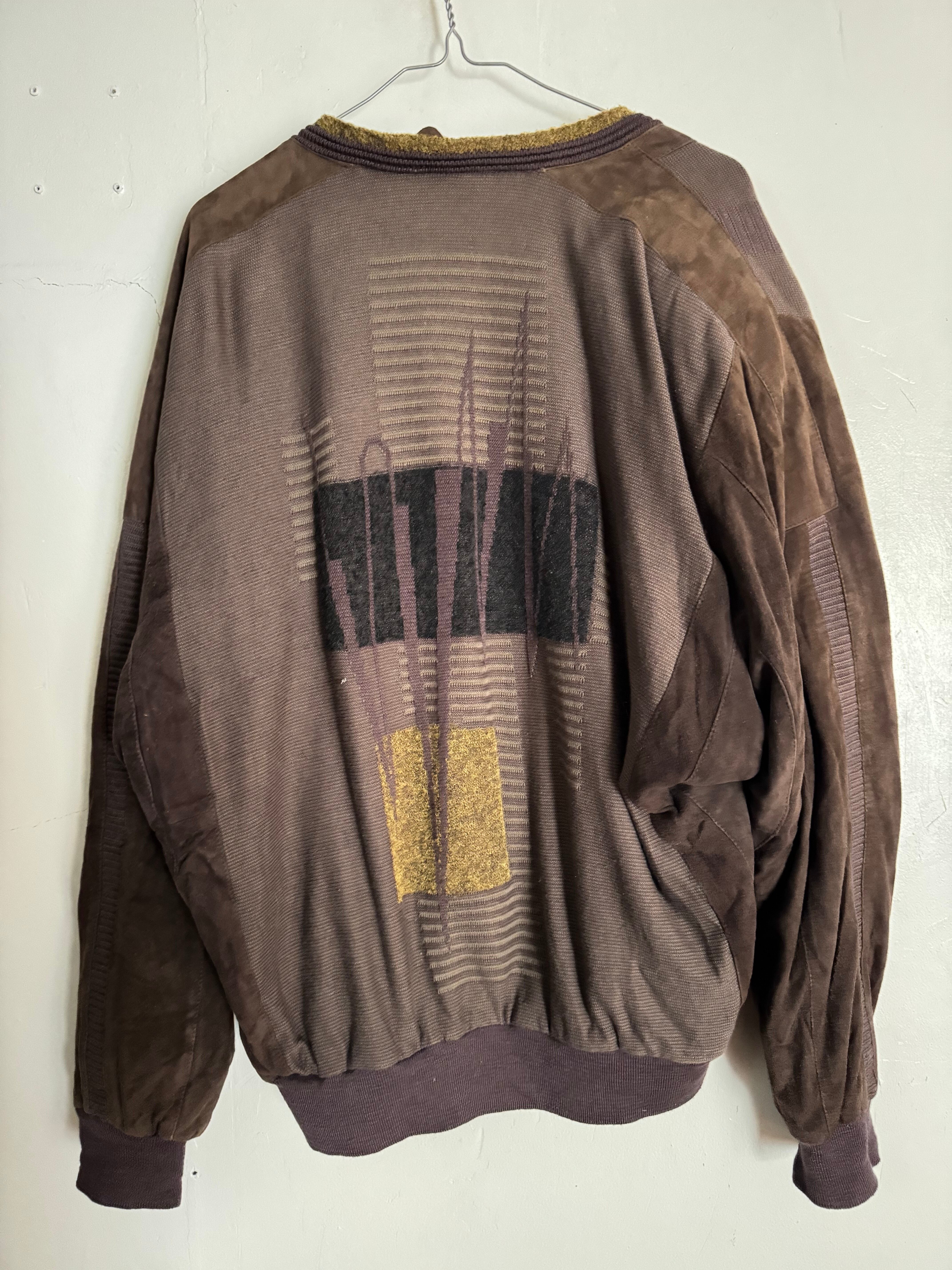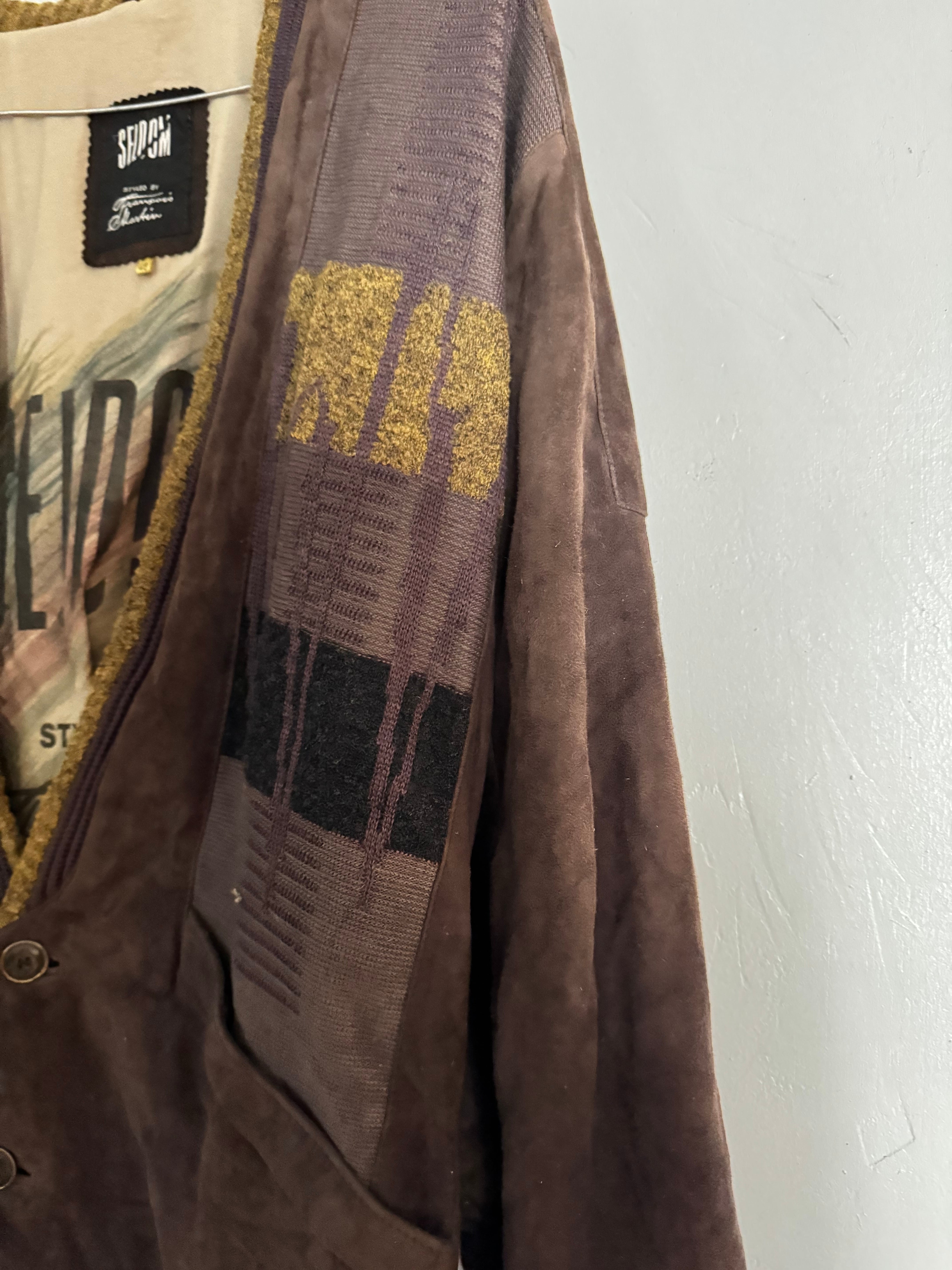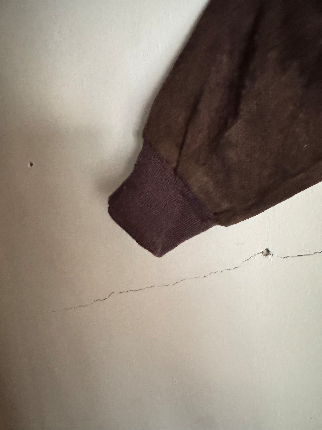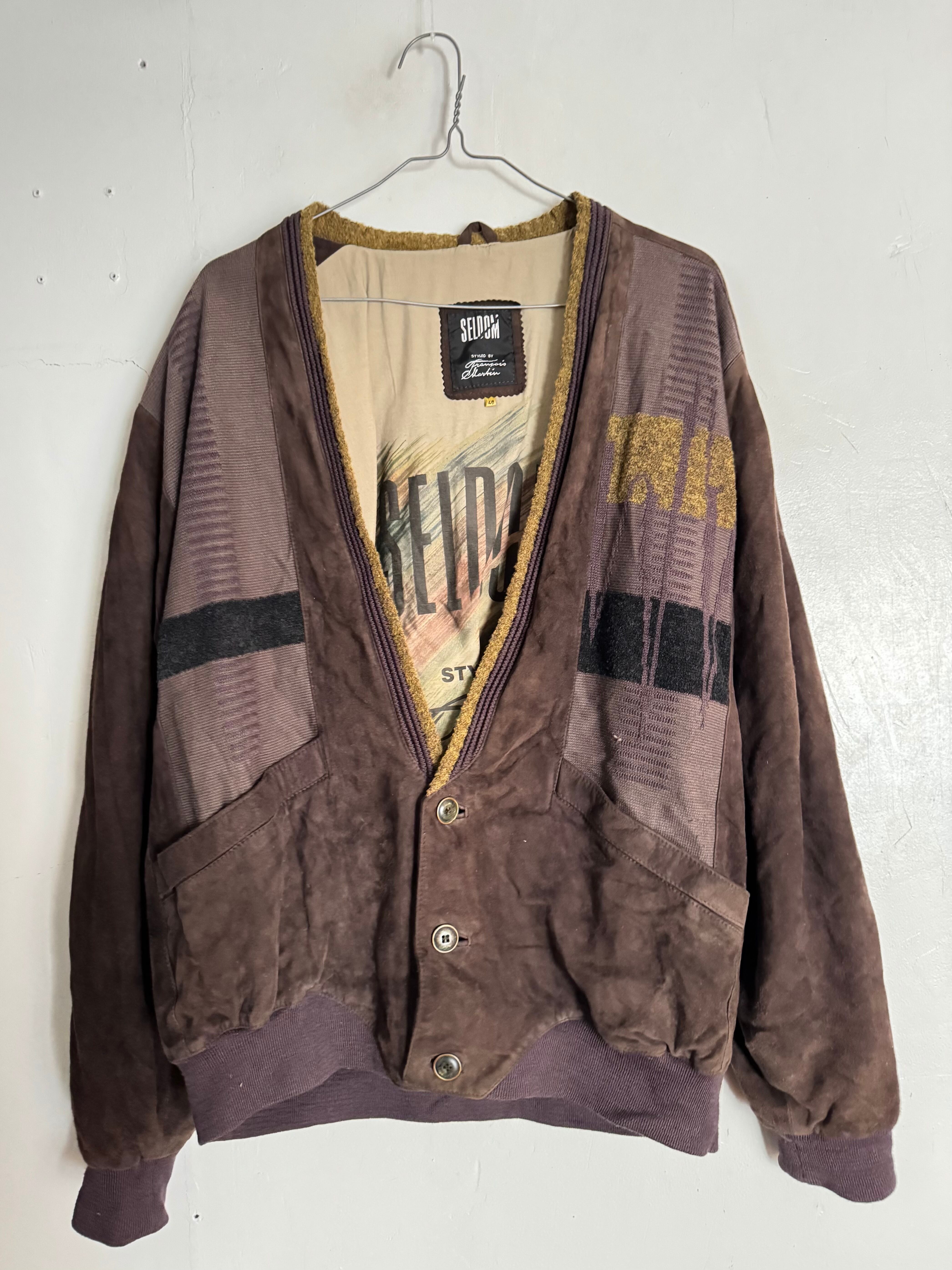 素材の切り替えが印象的なデザインカーディガン。スエード調の起毛素材とニットパネルを組み合わせた、雰囲気のある一着です。落ち着いたブラウン系カラーで合わせやすく、羽織るだけでスタイリングに表情が出ます。