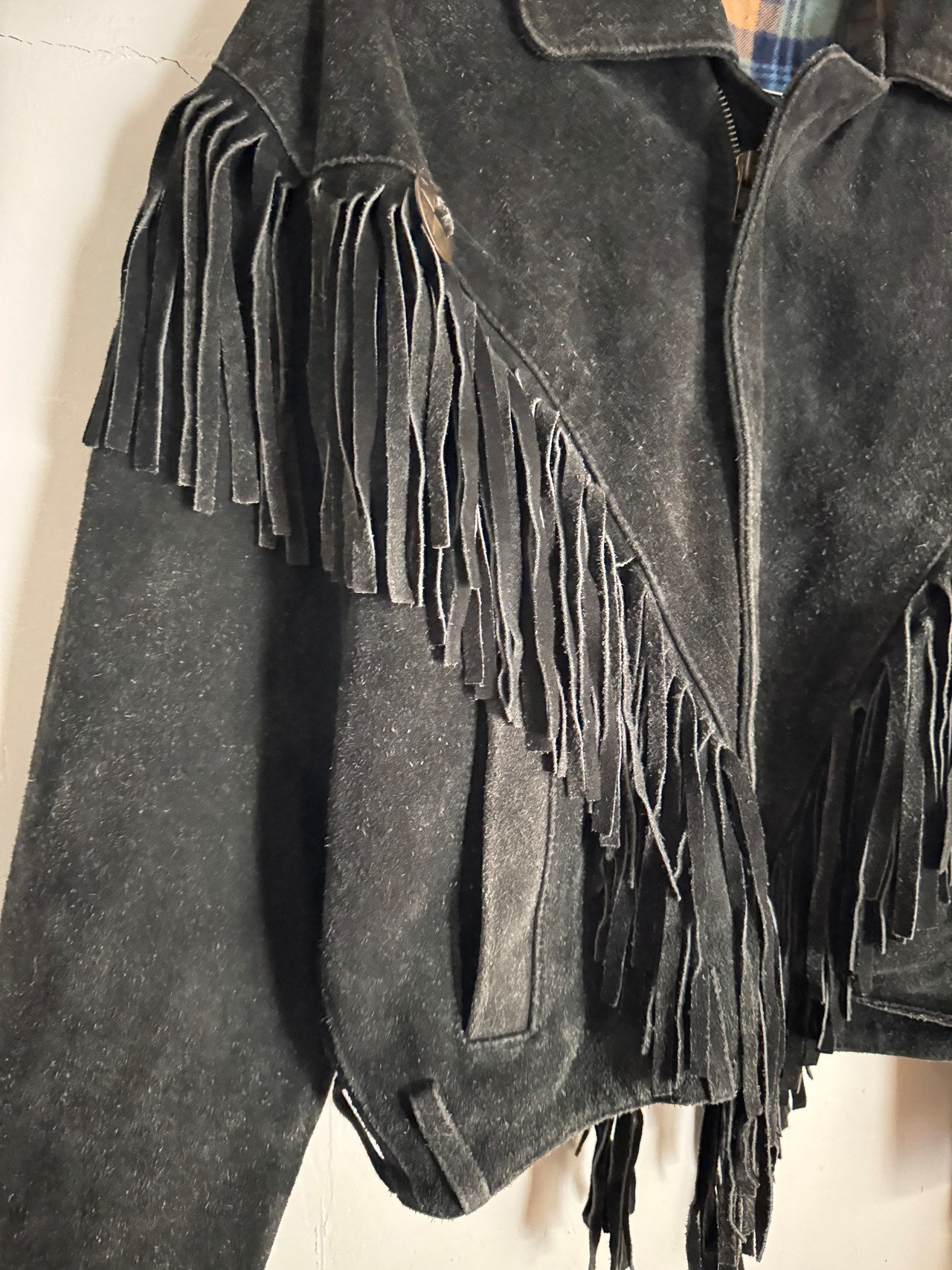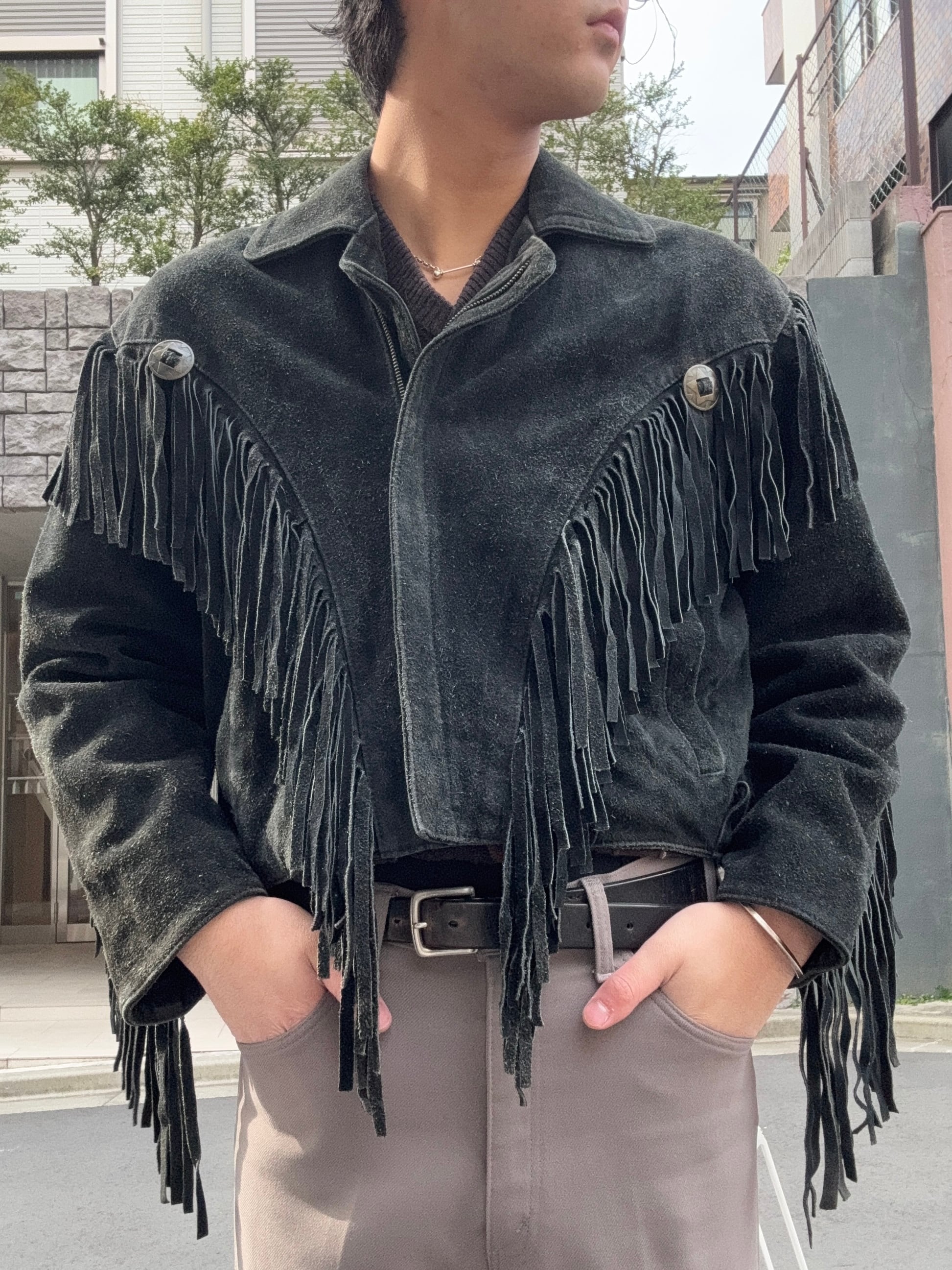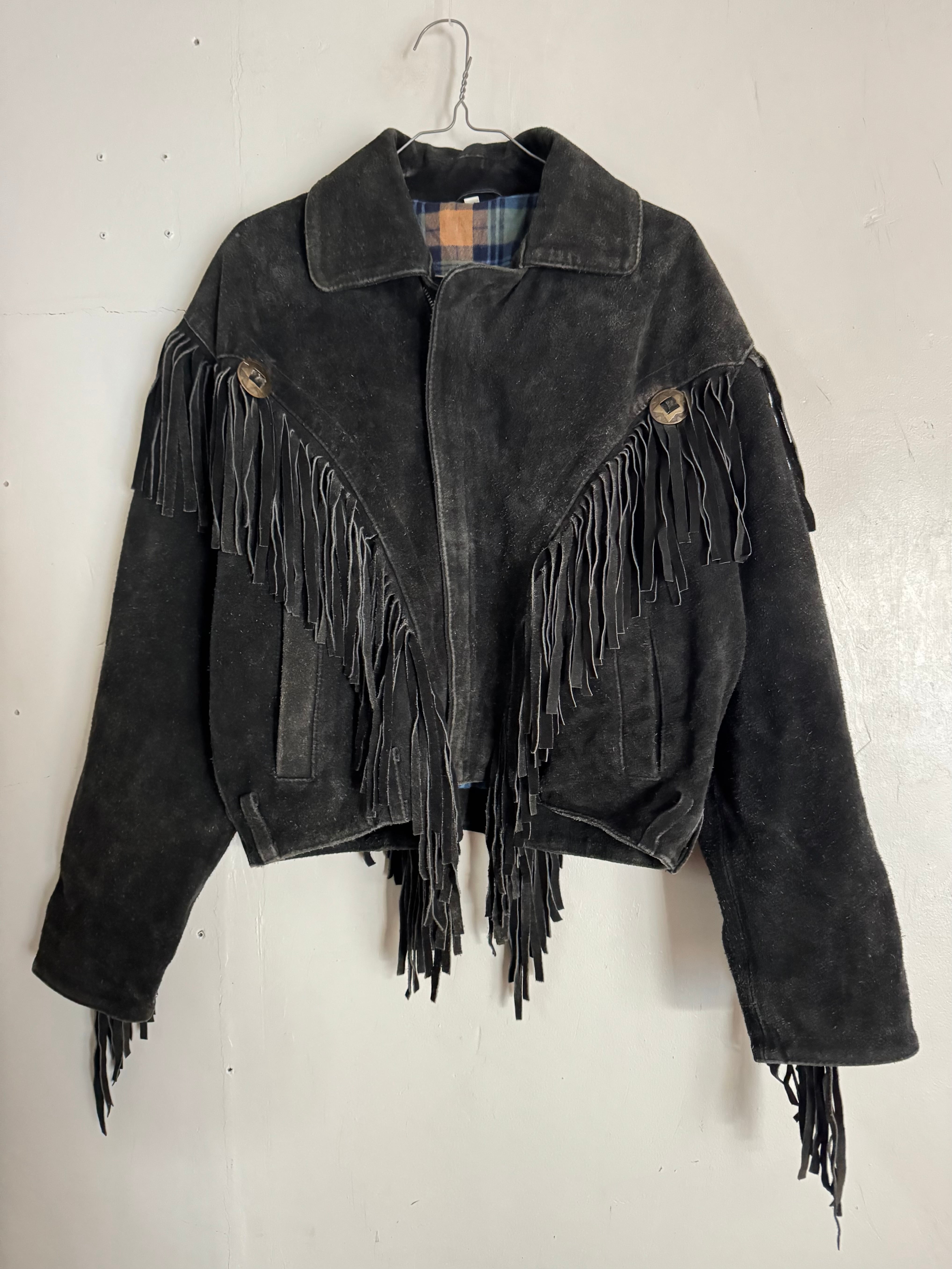 重厚感のある黒レザーに大胆なロングフリンジとコンチョを配した、存在感抜群のヴィンテージジャケットです。80s-90s特有の短めの丈感とボリューム袖が今っぽく、裏地のチェック柄など細部にまで凝った作りになっています。