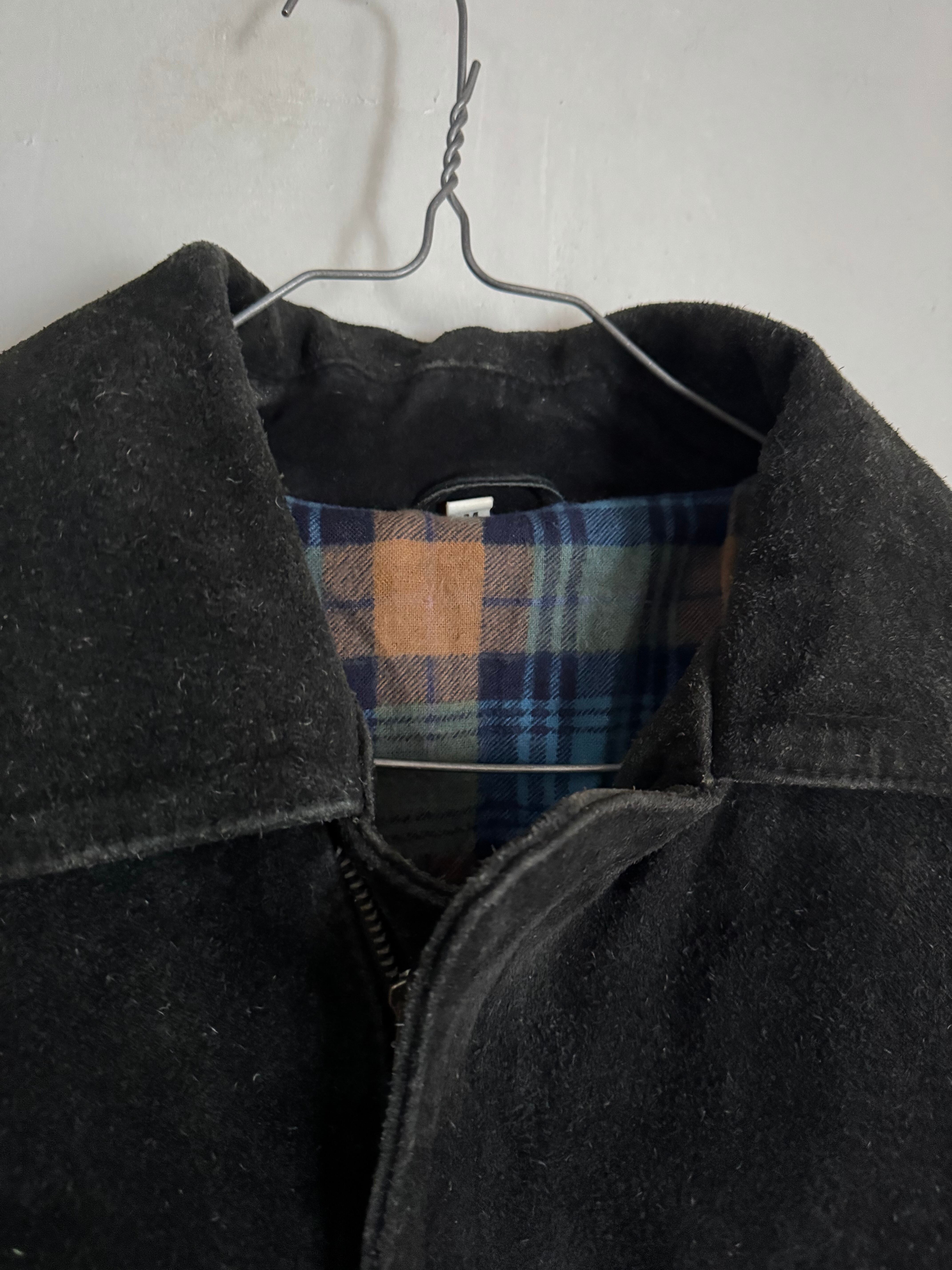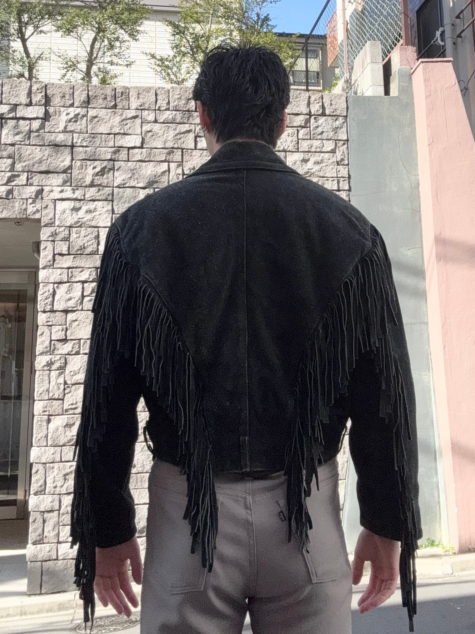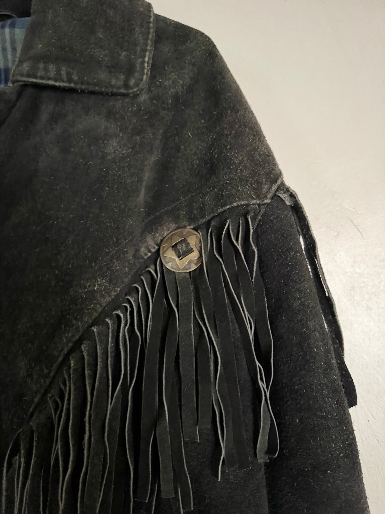 重厚感のある黒レザーに大胆なロングフリンジとコンチョを配した、存在感抜群のヴィンテージジャケットです。80s-90s特有の短めの丈感とボリューム袖が今っぽく、裏地のチェック柄など細部にまで凝った作りになっています。