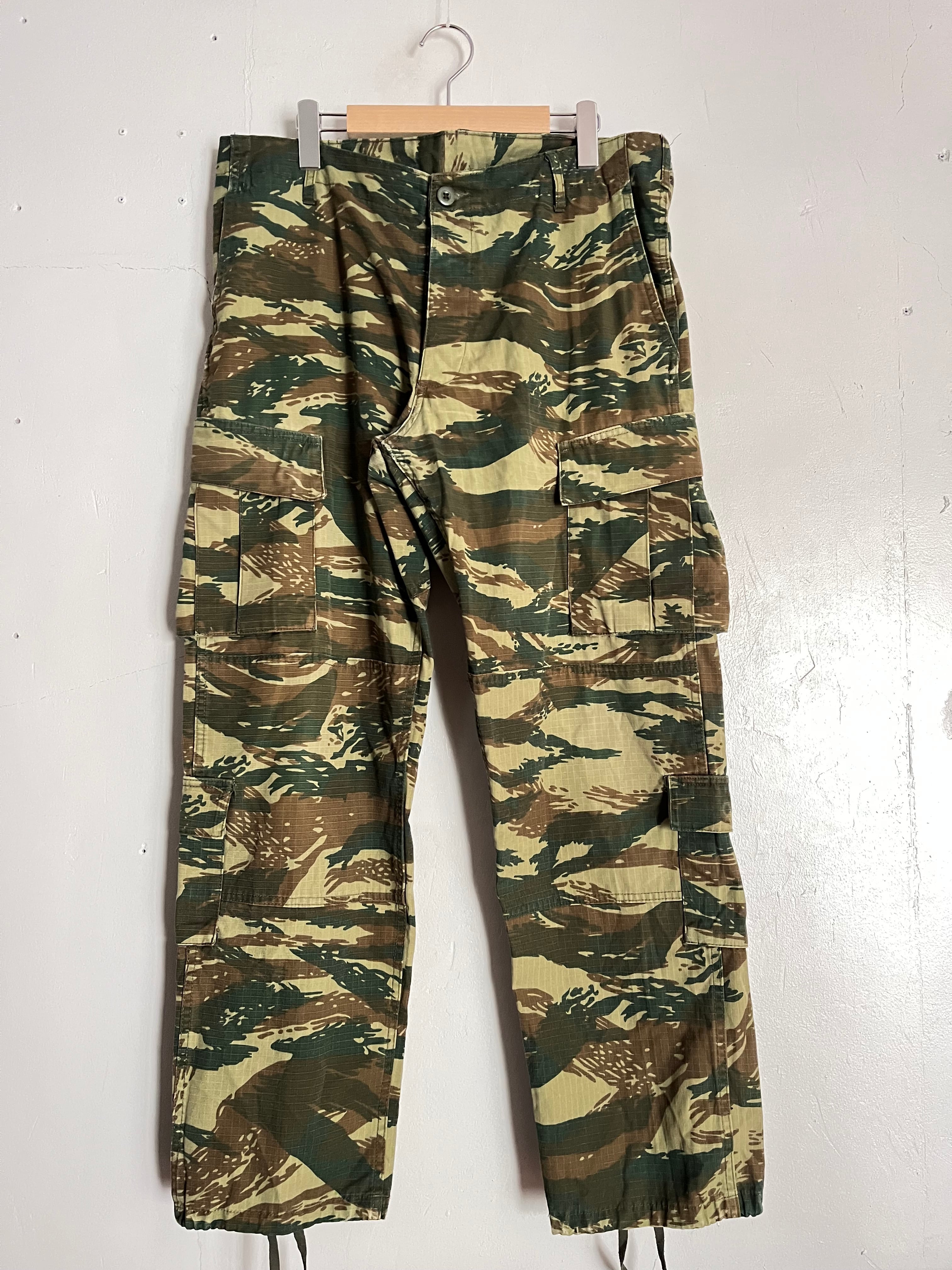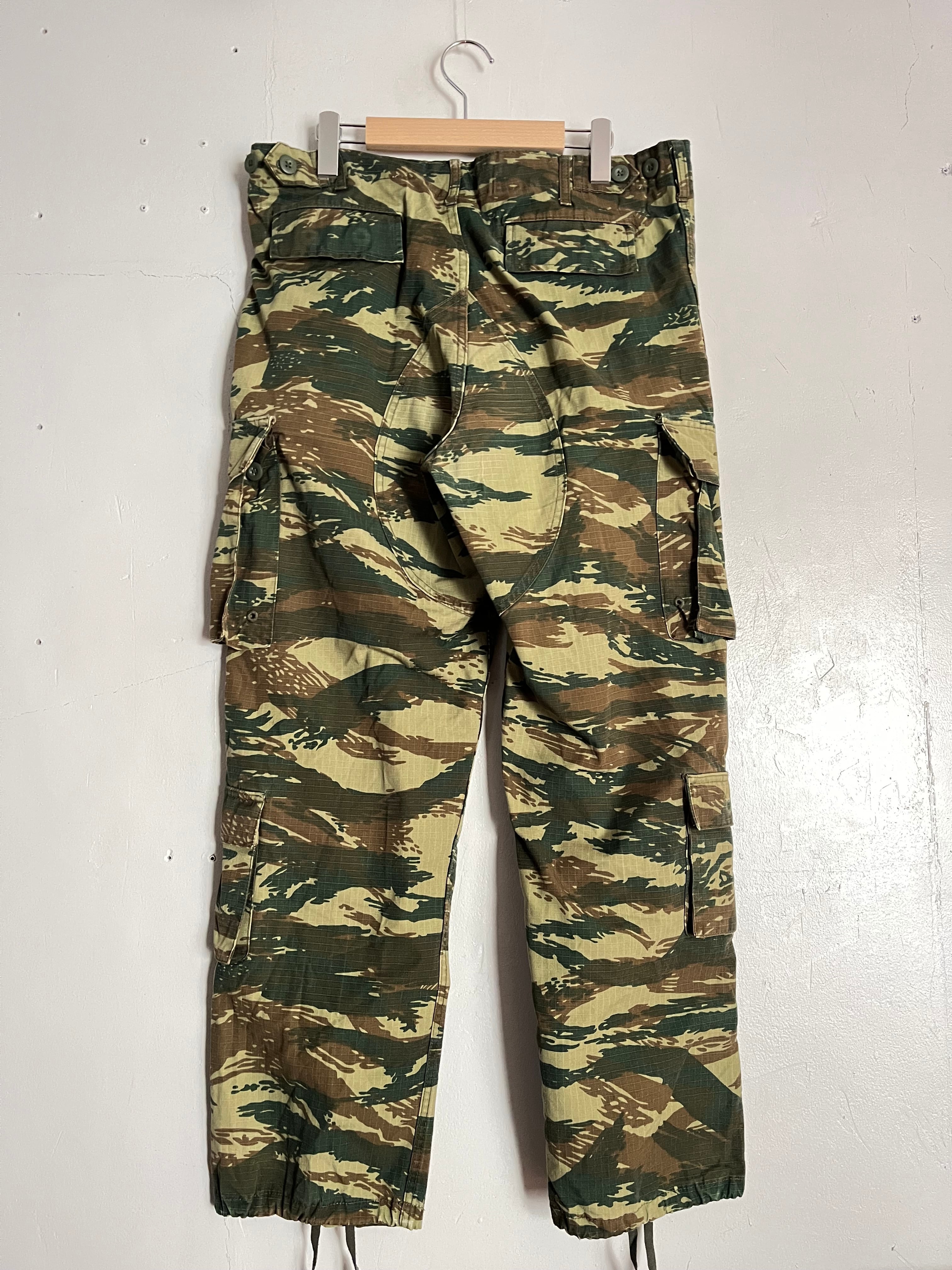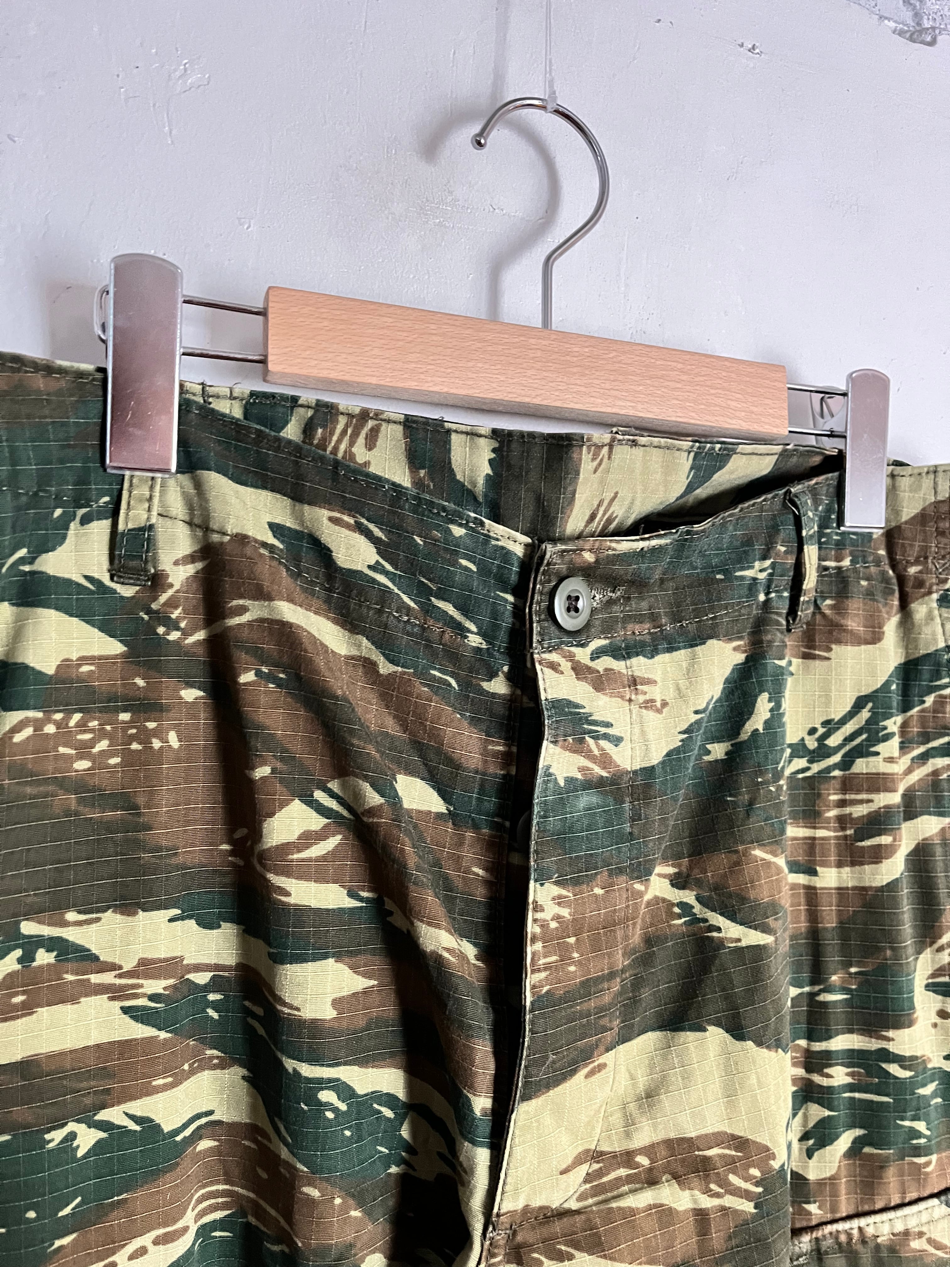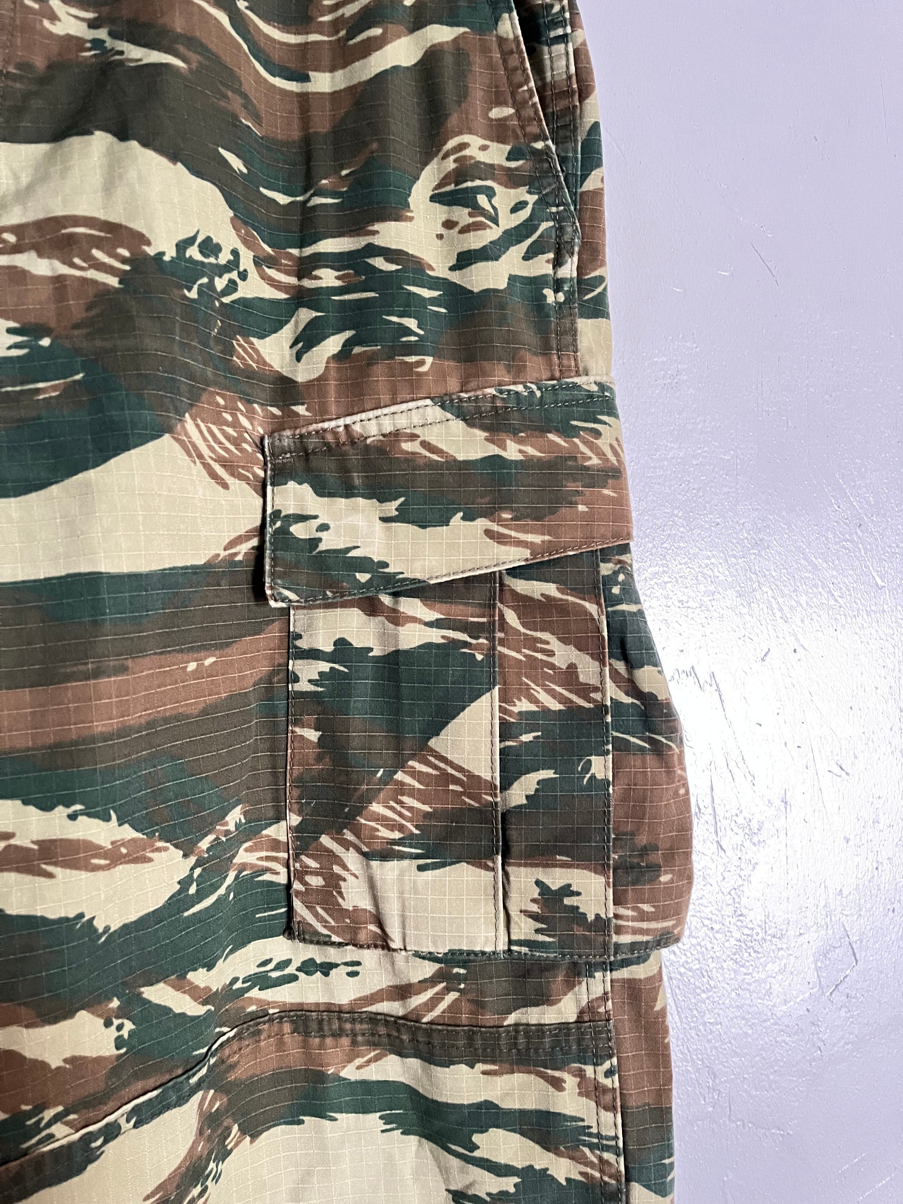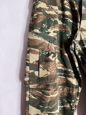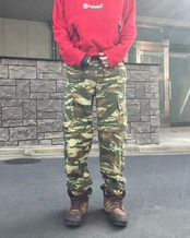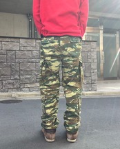 迷彩柄のカーゴパンツで、裾のところに紐がついているので絞って履くこともできるものになってます。色合いとしては淡い色でデザインされているため色んなトップスと合わせやすいです。また、裾が絞れることからブーツインなども可能となるので沢山のお洒落を楽しめるアイテムです。