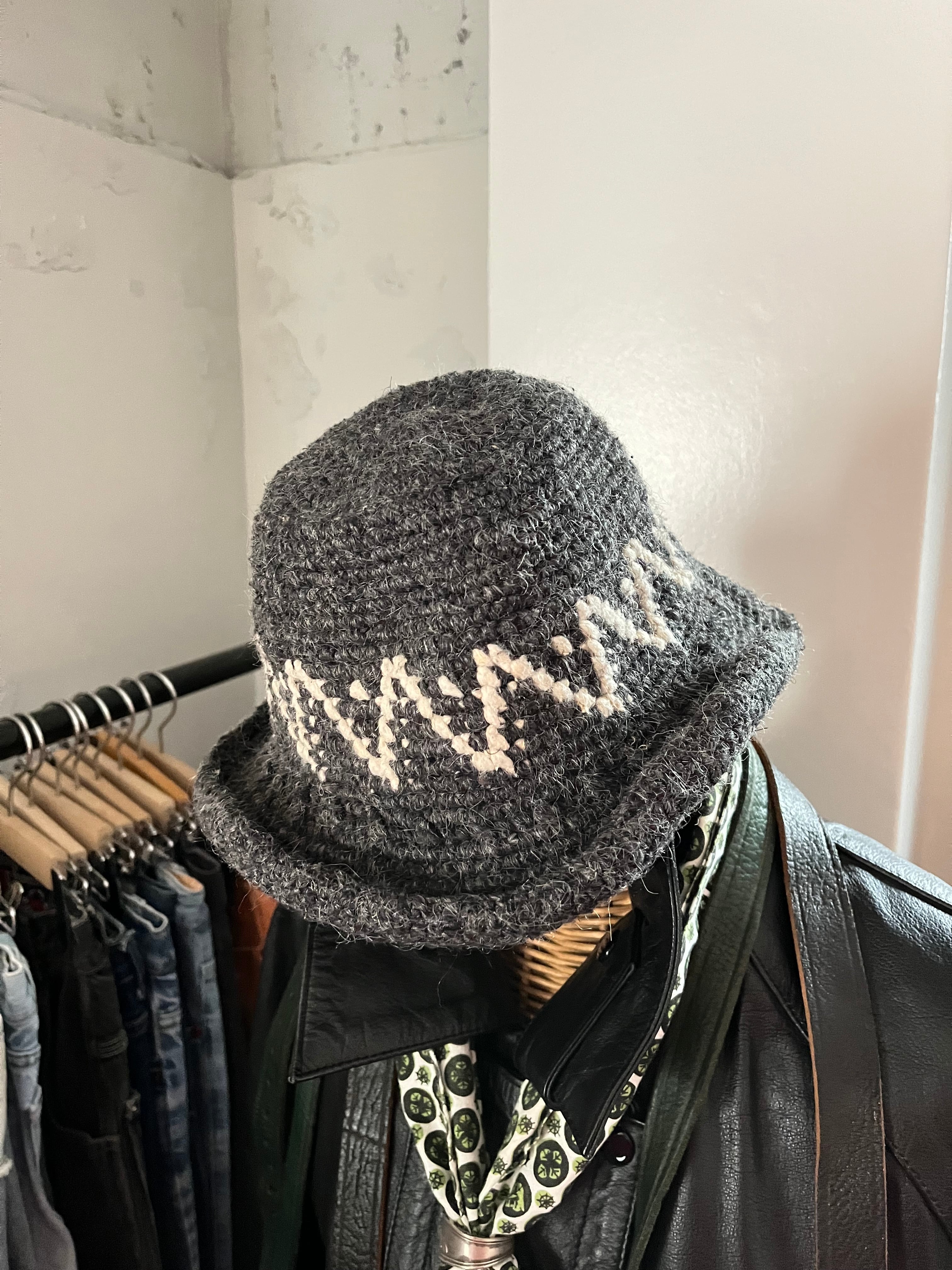 グレーをベースに白の毛糸で編み込まれたようなデザインのハットです。よくある編み物のハットとは違いつばが上に巻いているのでフォーマルなスタイルにも組み込めるようなハットとなっています。また、やや浅めなので浅めが好みの方にはイチオシのアイテムです。