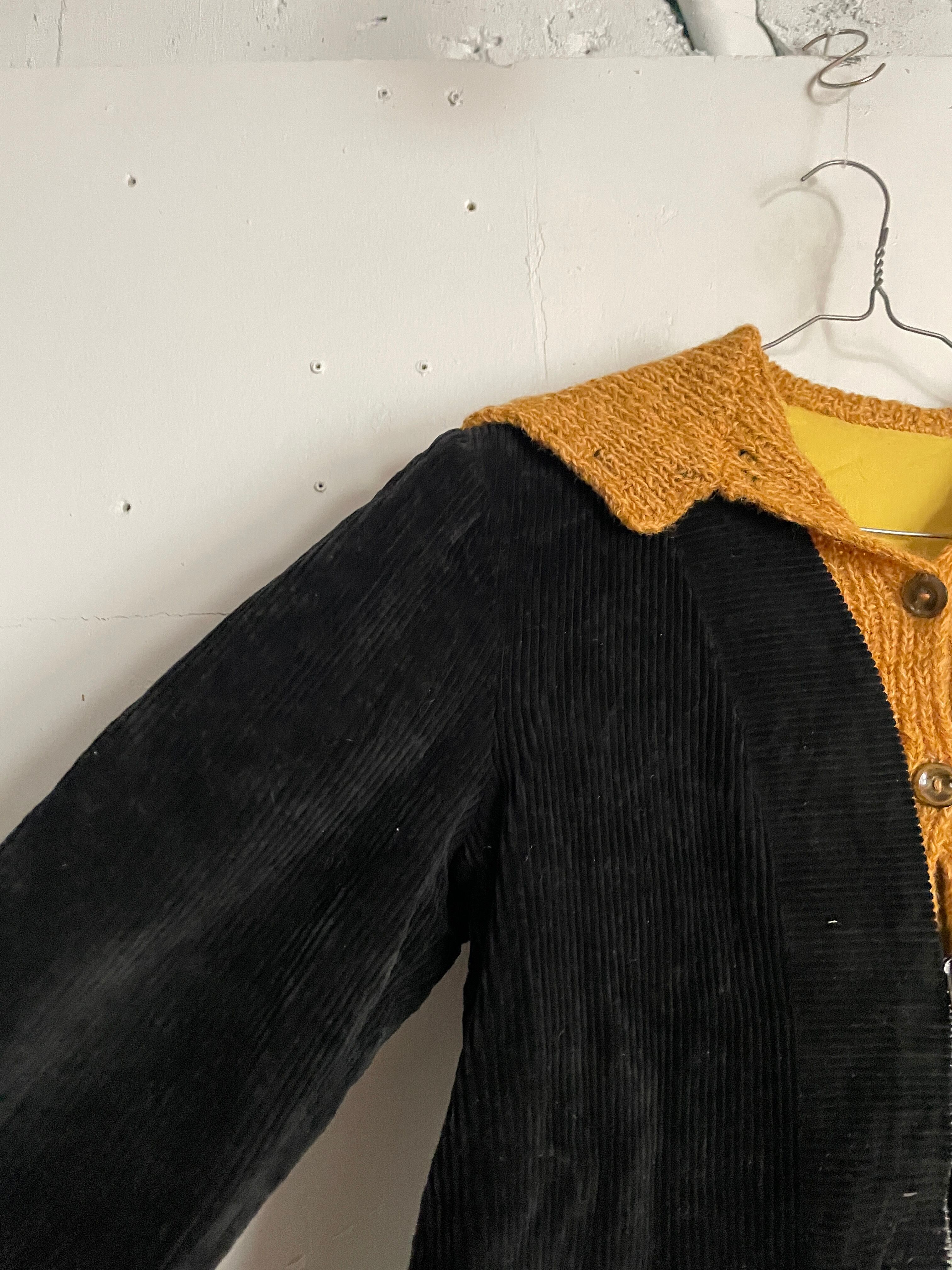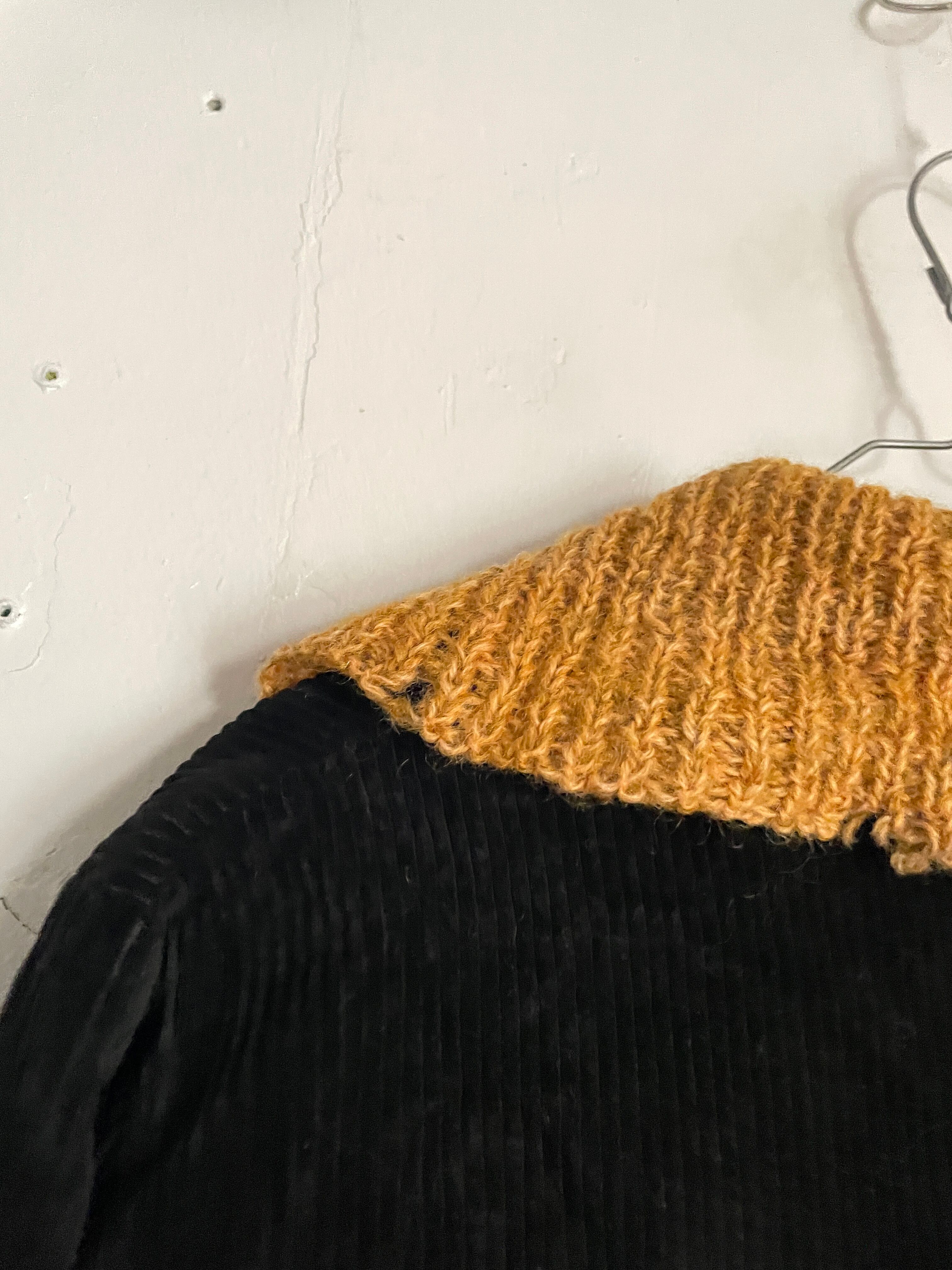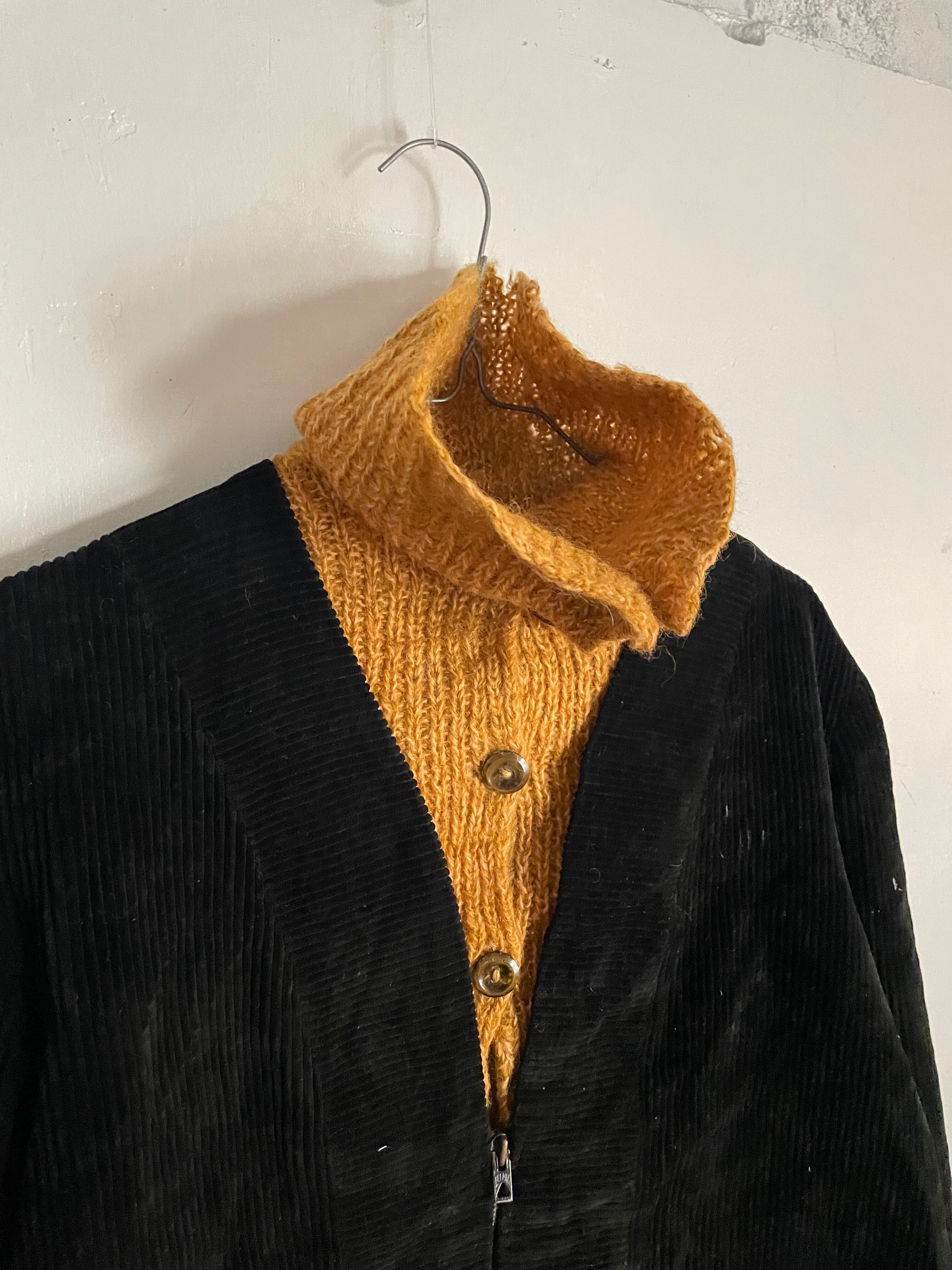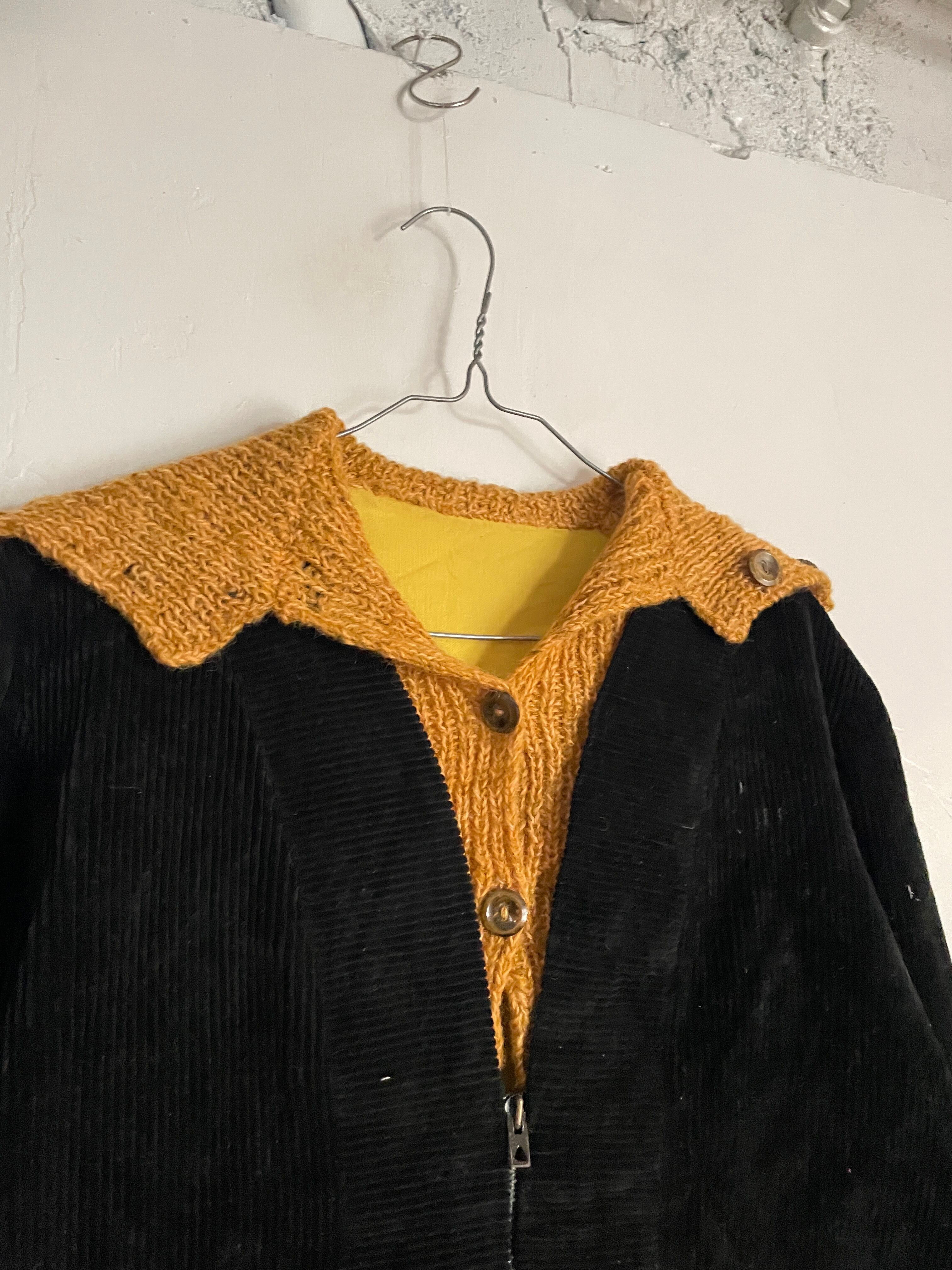 ブラックボディのコーデュロイと、マスタードカラーのニットがドッキングしたジャケット。あまり見かけない面白いデザインになっています。ニットはかなりネックが高め。顔が半分隠れるくらいの高さまであります。コーデュロイの色気と、ニットの可愛らしさが、良い具合にミックスした1着。短丈めでややタイトめな今っぽいシルエットなのも魅力的です。