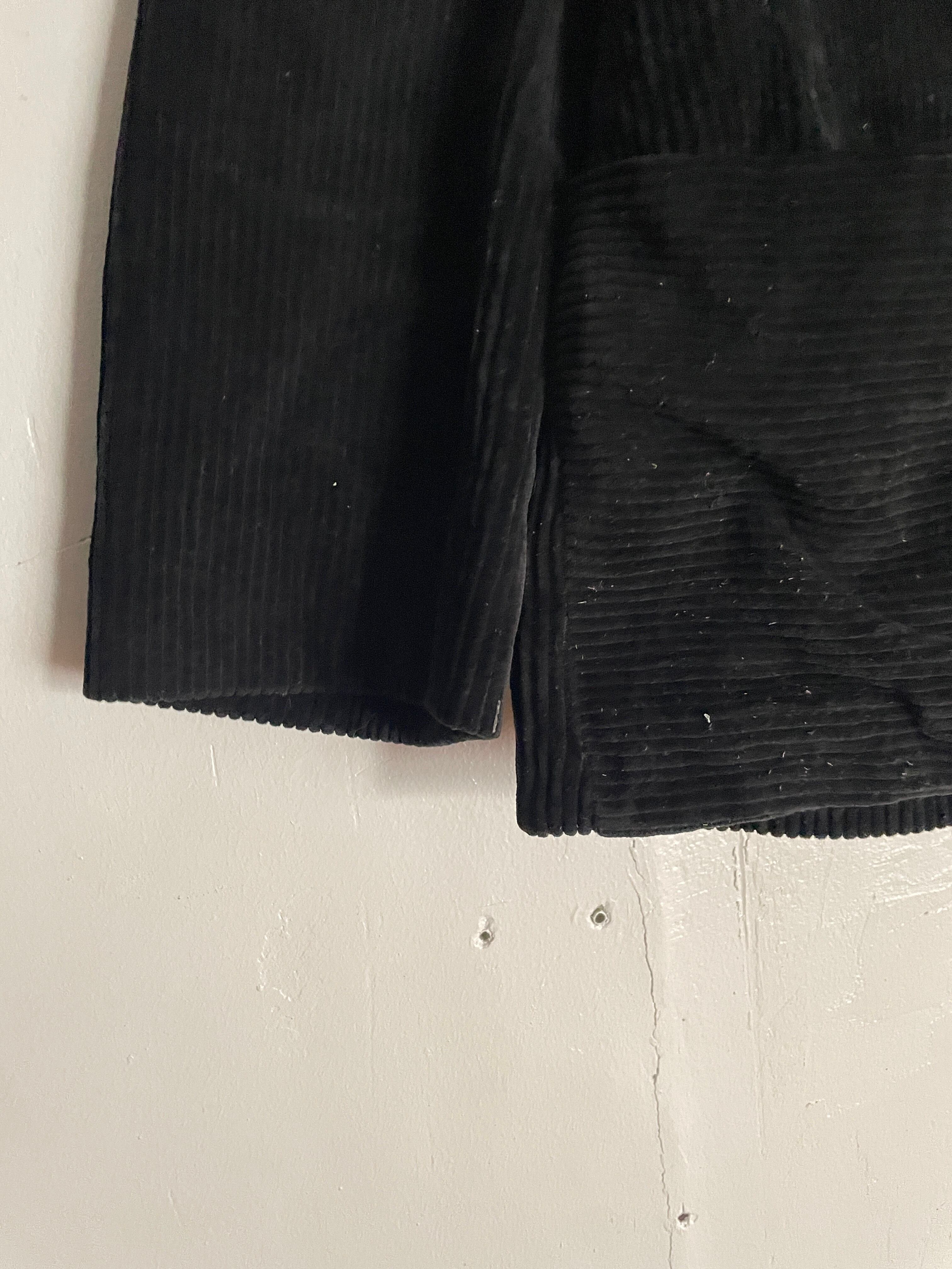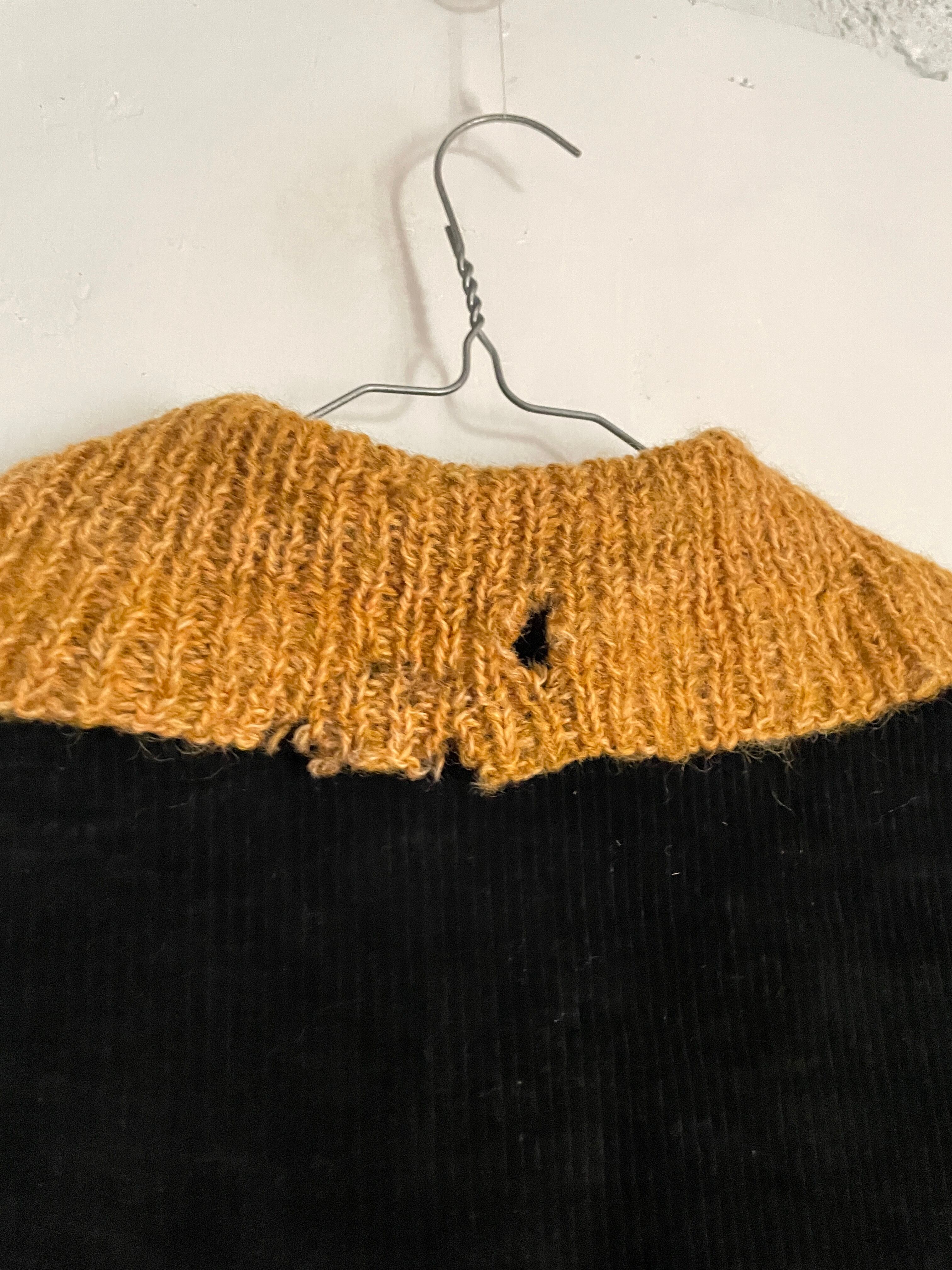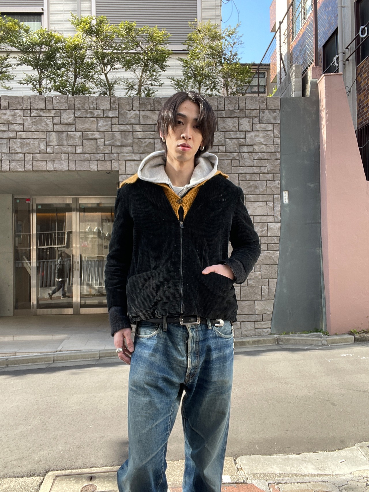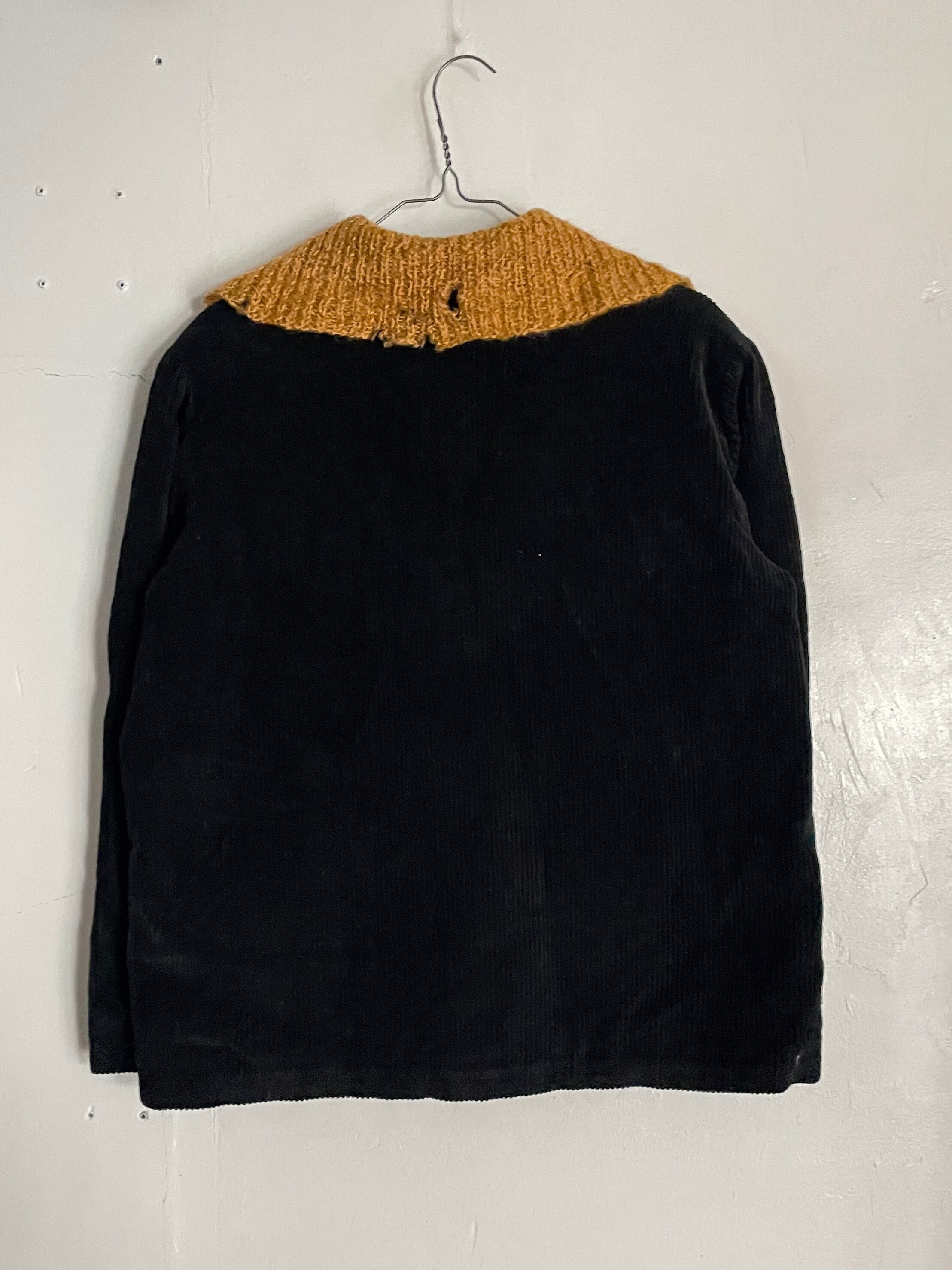 ブラックボディのコーデュロイと、マスタードカラーのニットがドッキングしたジャケット。あまり見かけない面白いデザインになっています。ニットはかなりネックが高め。顔が半分隠れるくらいの高さまであります。コーデュロイの色気と、ニットの可愛らしさが、良い具合にミックスした1着。短丈めでややタイトめな今っぽいシルエットなのも魅力的です。
