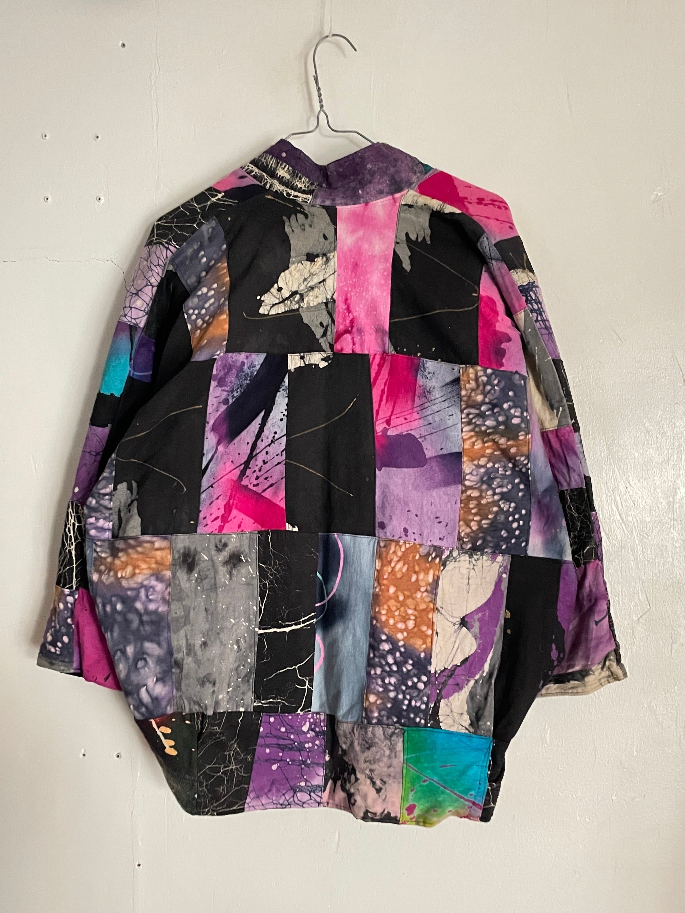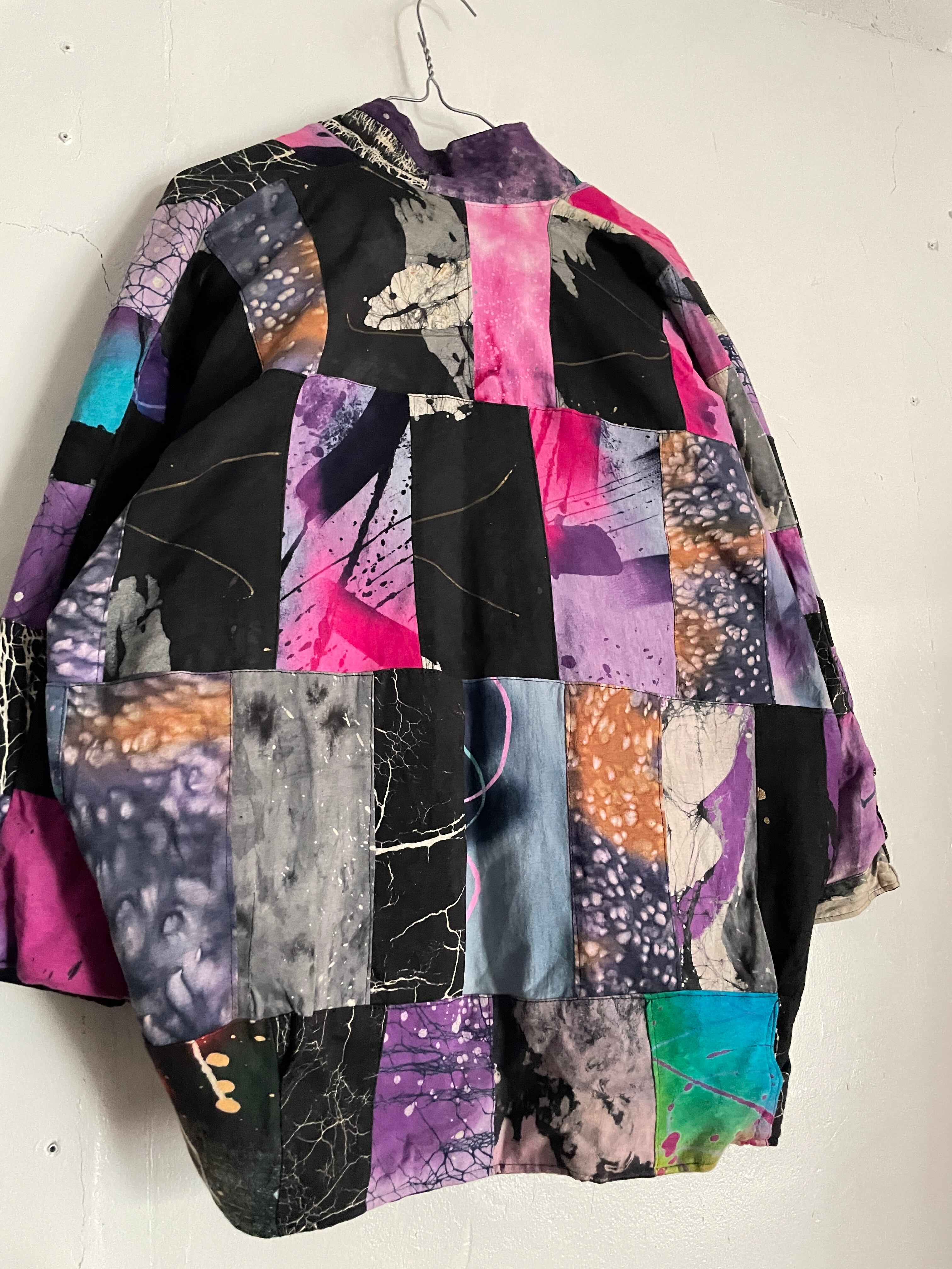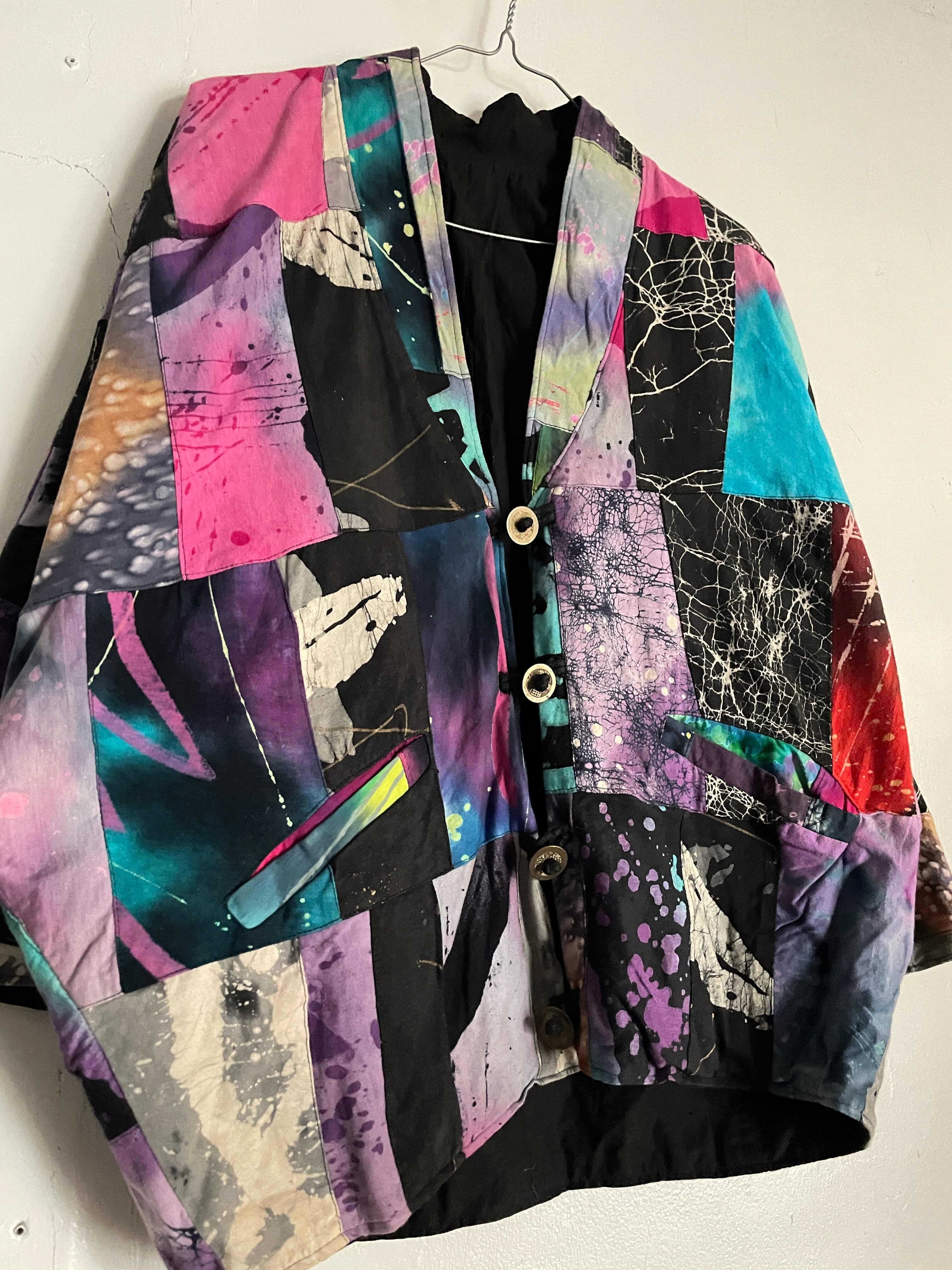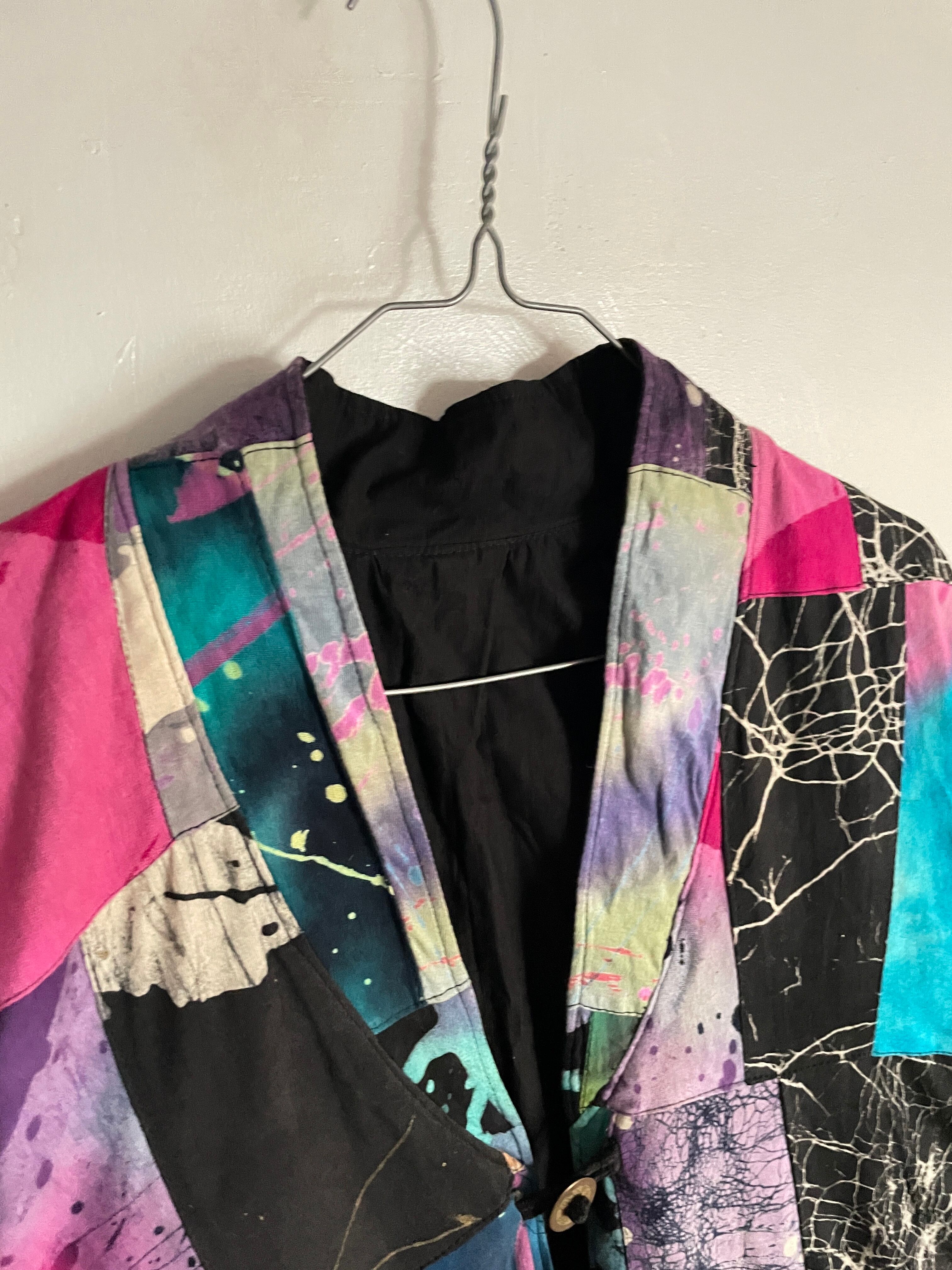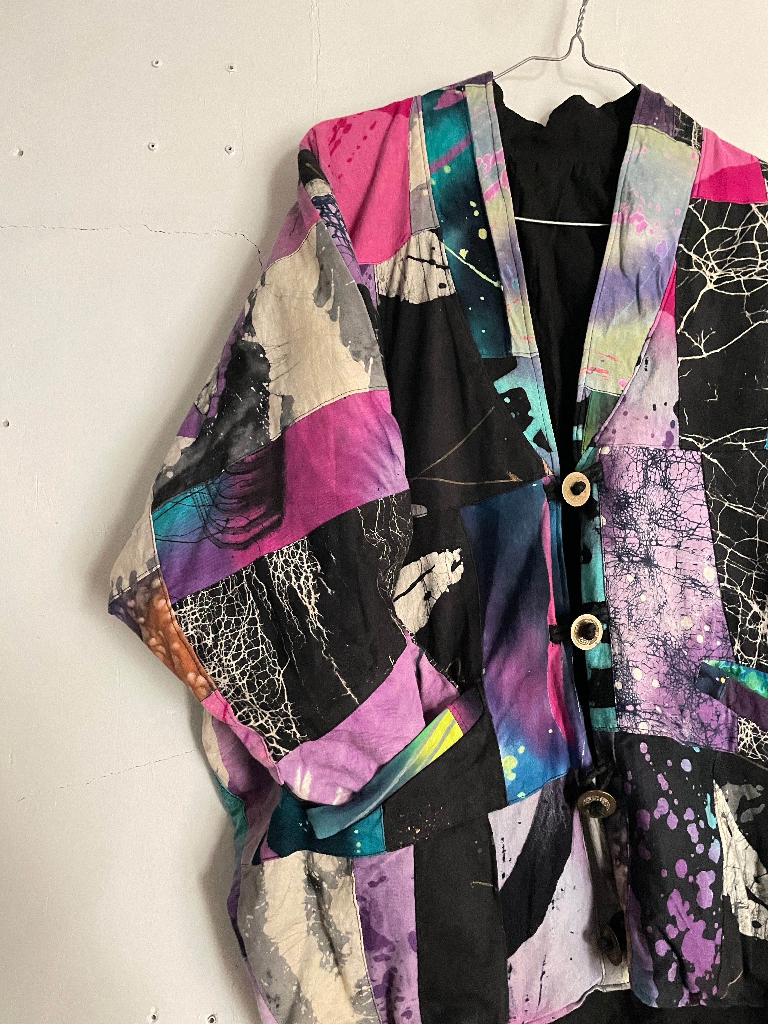 様々な柄がパッチワークされた、羽織りジャケット。見ているだけで楽しい気分になる1着です。芸術的で個性的なピースになっています。ボタン部分は日本のお金っぽくデザインされていて、歴史や文化のバックボーンが感じられます。身幅とアーム部分がガッツリと広めで、アウター上からでも羽織れそうです。間違い無くファッションの主役になる1着かと思います。