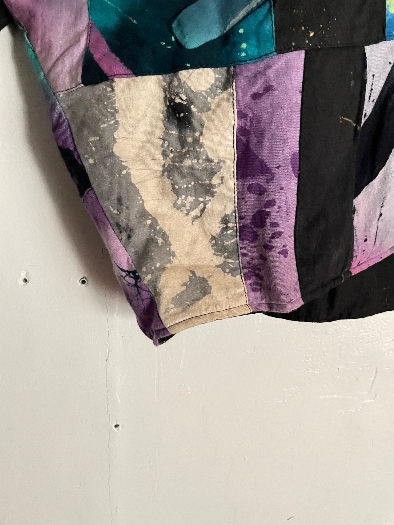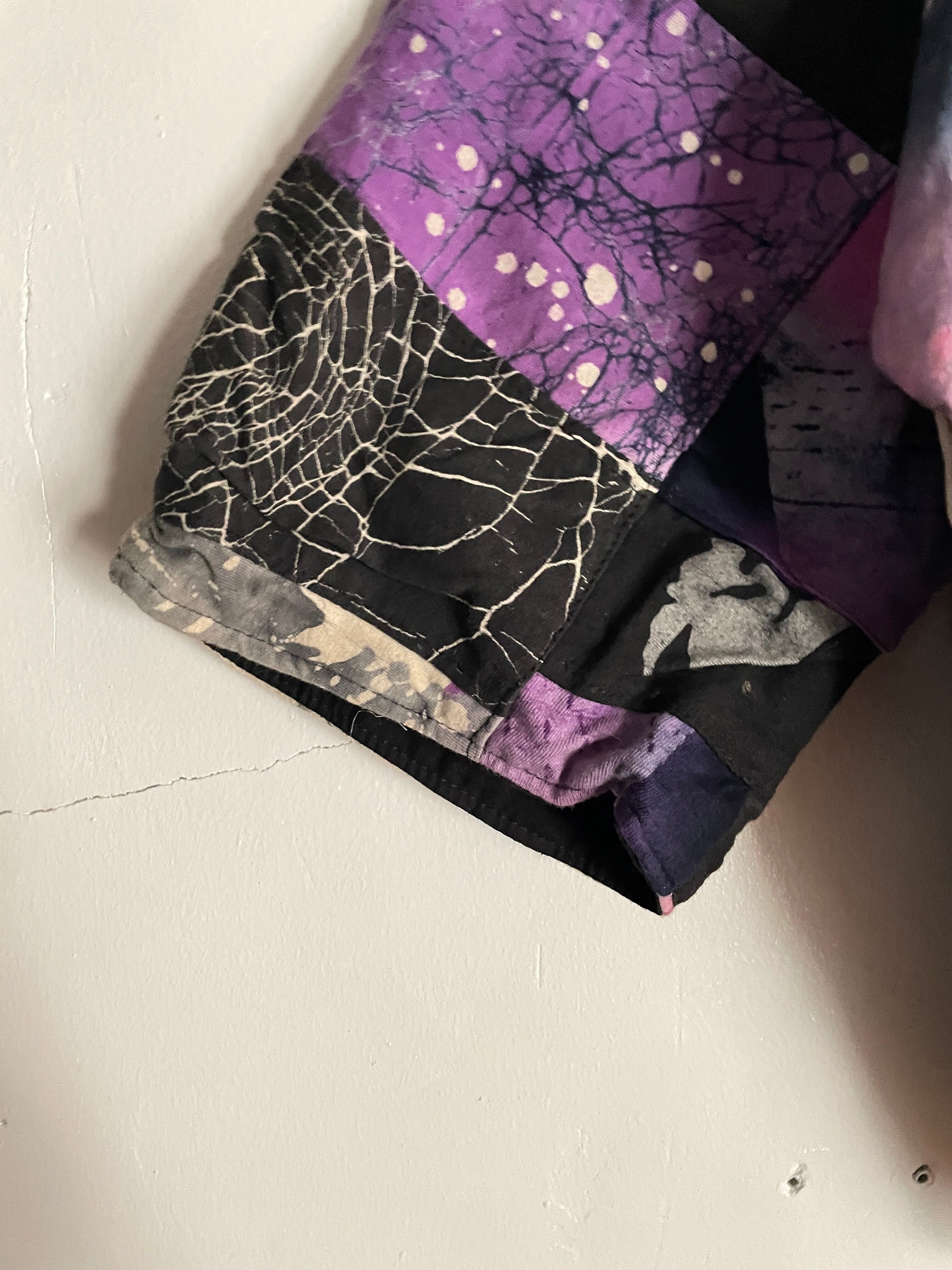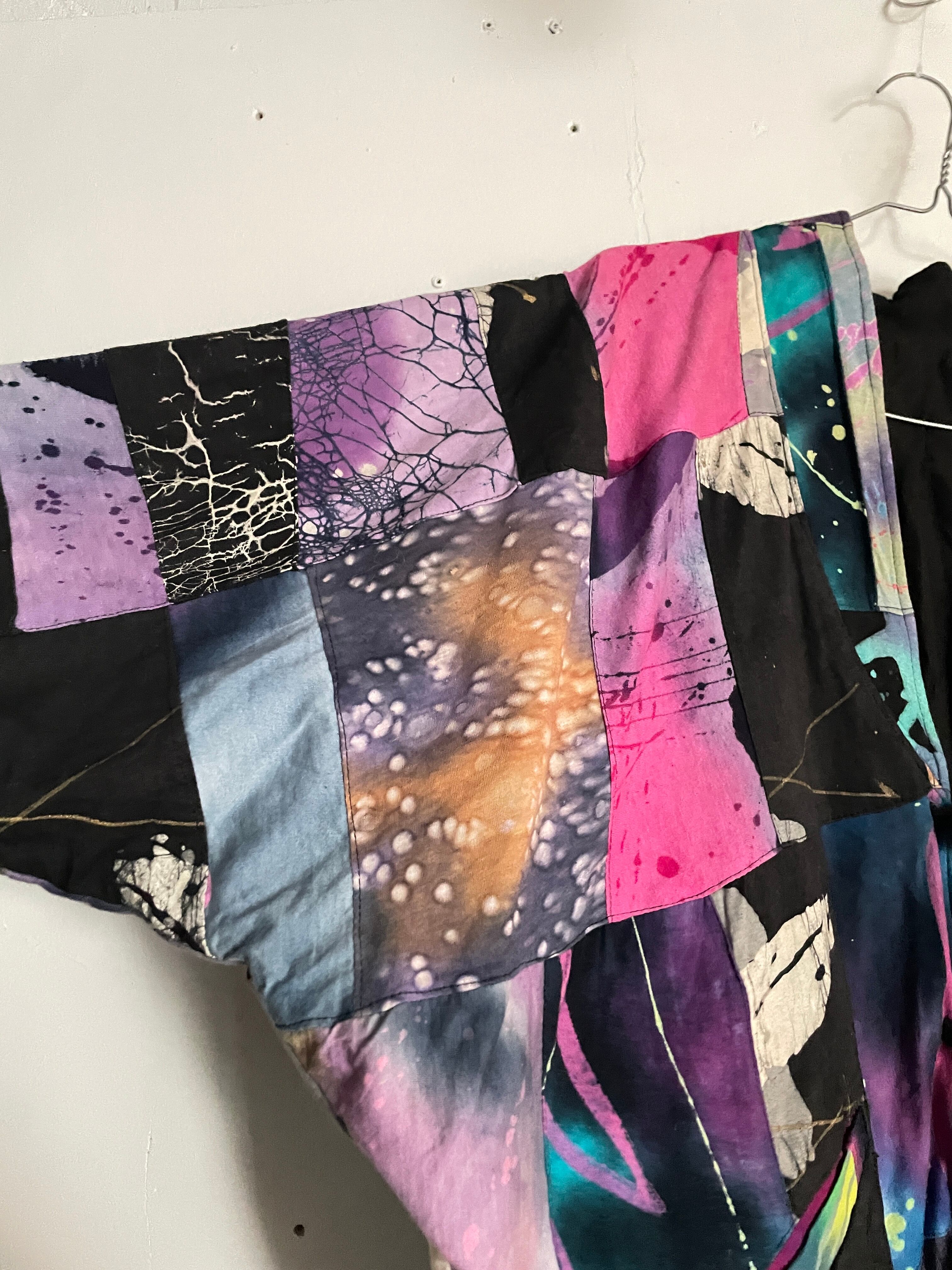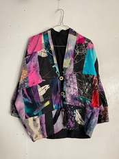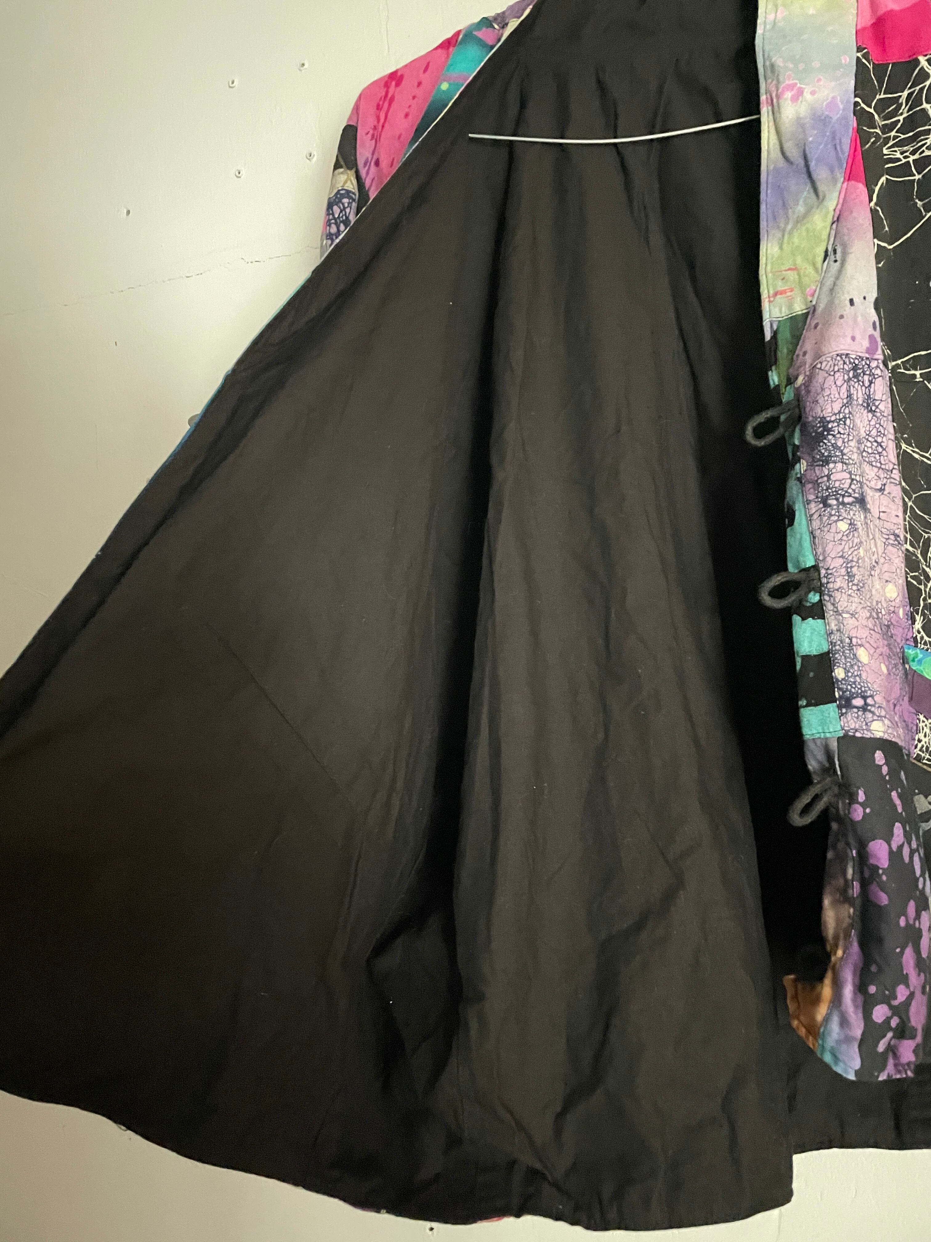 様々な柄がパッチワークされた、羽織りジャケット。見ているだけで楽しい気分になる1着です。芸術的で個性的なピースになっています。ボタン部分は日本のお金っぽくデザインされていて、歴史や文化のバックボーンが感じられます。身幅とアーム部分がガッツリと広めで、アウター上からでも羽織れそうです。間違い無くファッションの主役になる1着かと思います。