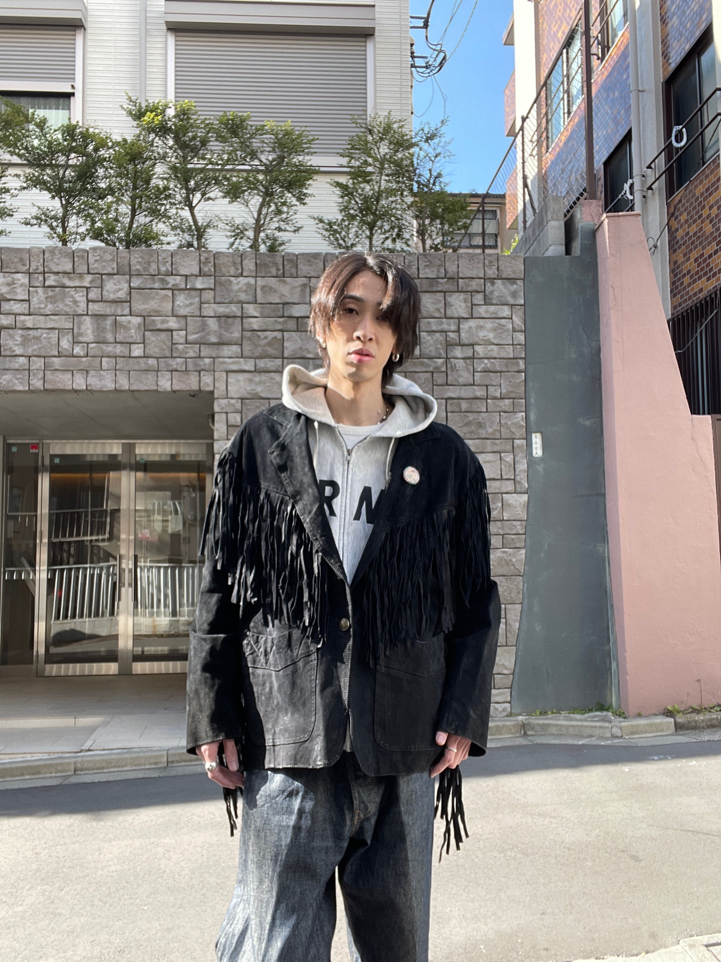 ブラックボディで、フロントとバックから袖口にかけて、フリンジデザインが施された、スエードレザージャケット。モードとロックな雰囲気がミックスしたようなクールな1着。襟部分にはローリングストーンズのバッチ付き。良いアクセントになっています。レザー特有の良い重量感ががり、高級感もしっかりと感じられます。ゆったりとしたサイズ感なので、インナーにも着込めて、ファッションの主役になる事間違いなしのアイテムです。