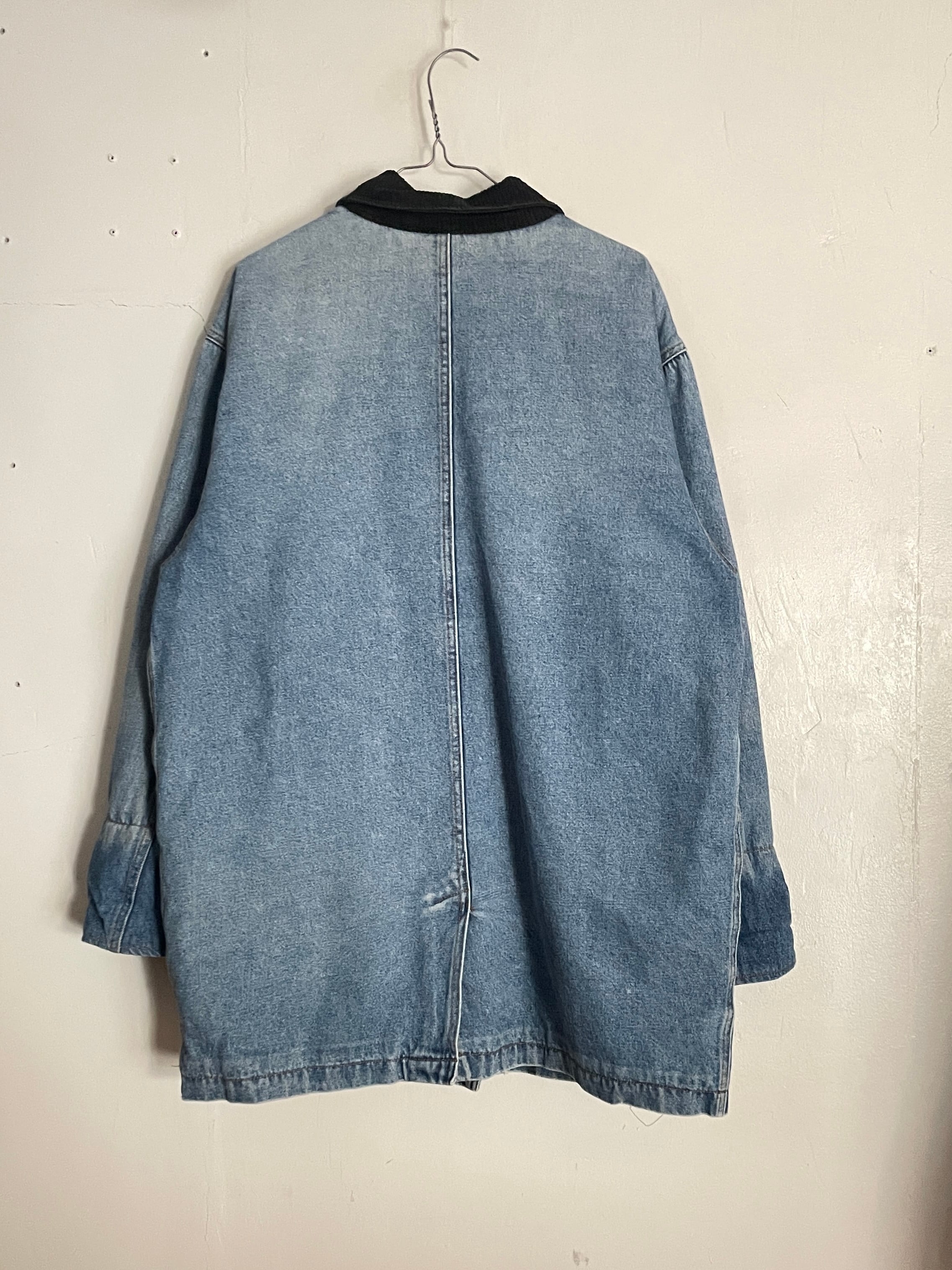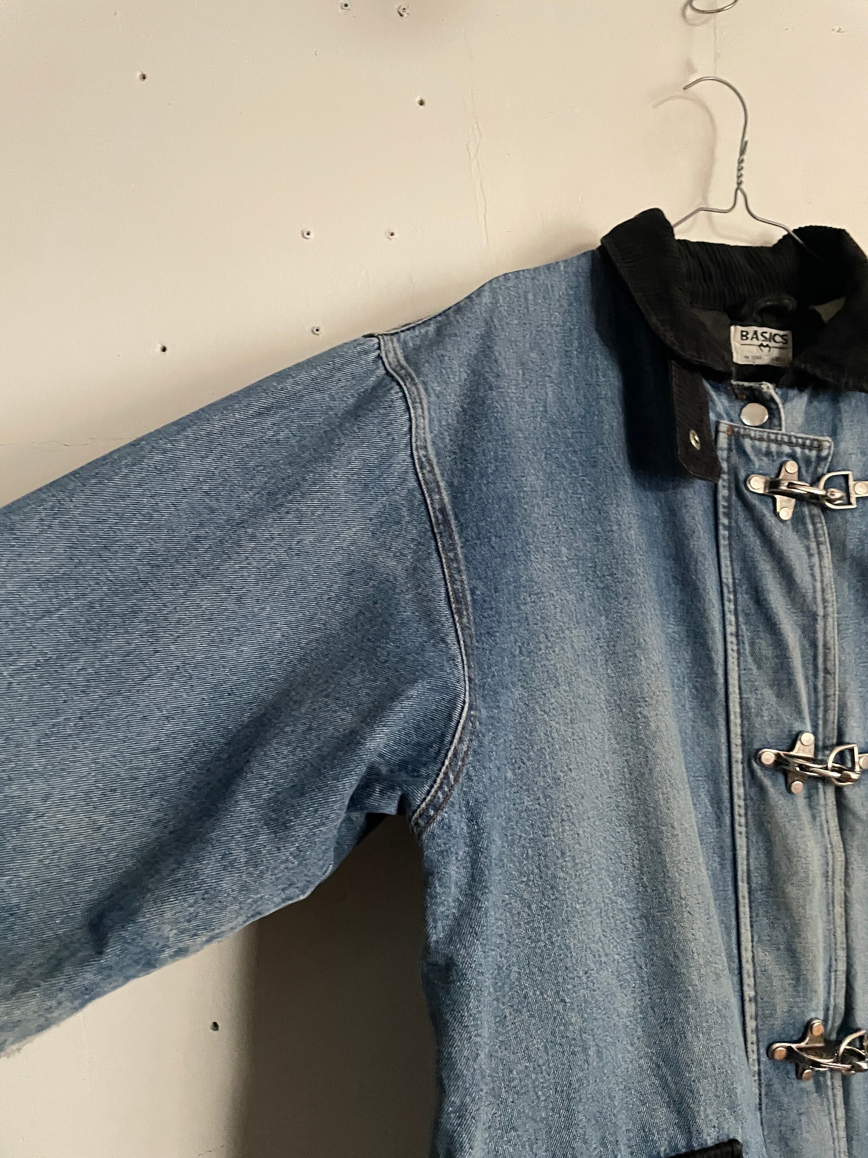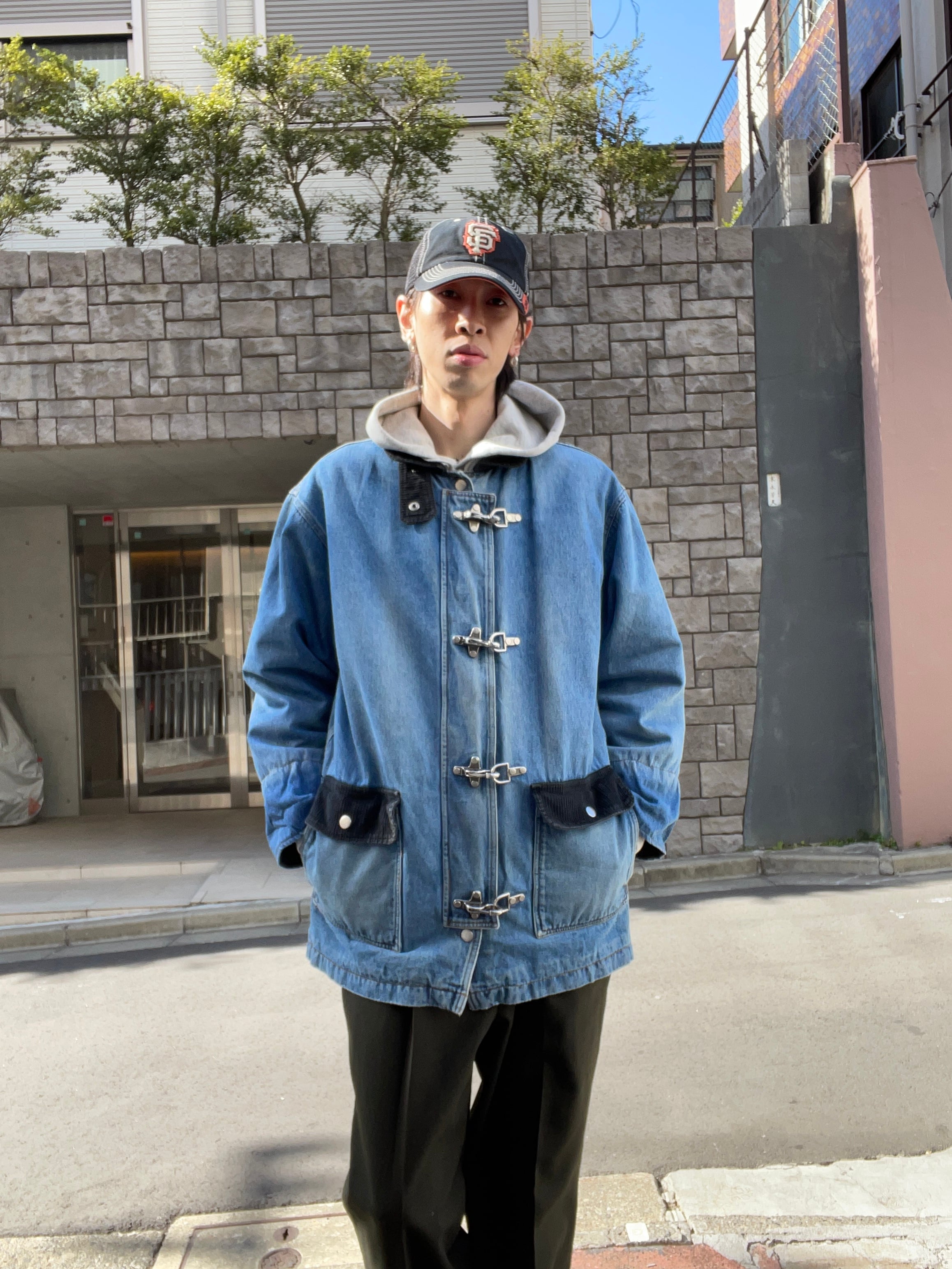 やや褪せたボディで、襟、ポケットのフラップ部分にブラックのコーデュロイ生地があしらわれた、デニムファイヤーマンジャケット。フックの留め具が特徴的な一着です。高級感が感じられます。裏地はキルティング素材で、保温性もしっかりと兼ね備えています。ゆったりとしたサイズ感で、インナーにもしっかりと着込めて、今の時期には間違いなくファッションの主役になるアイテムかと思います。