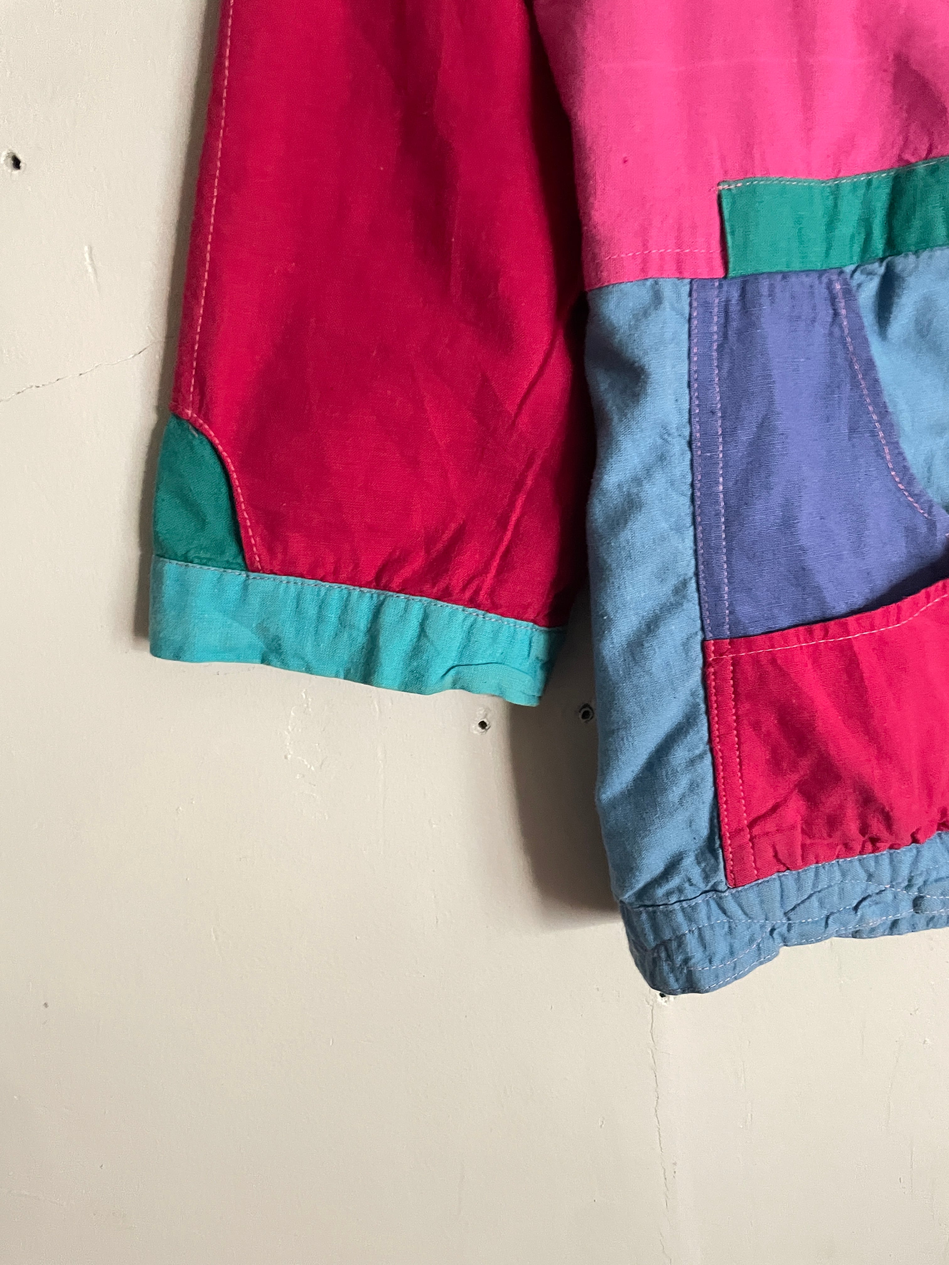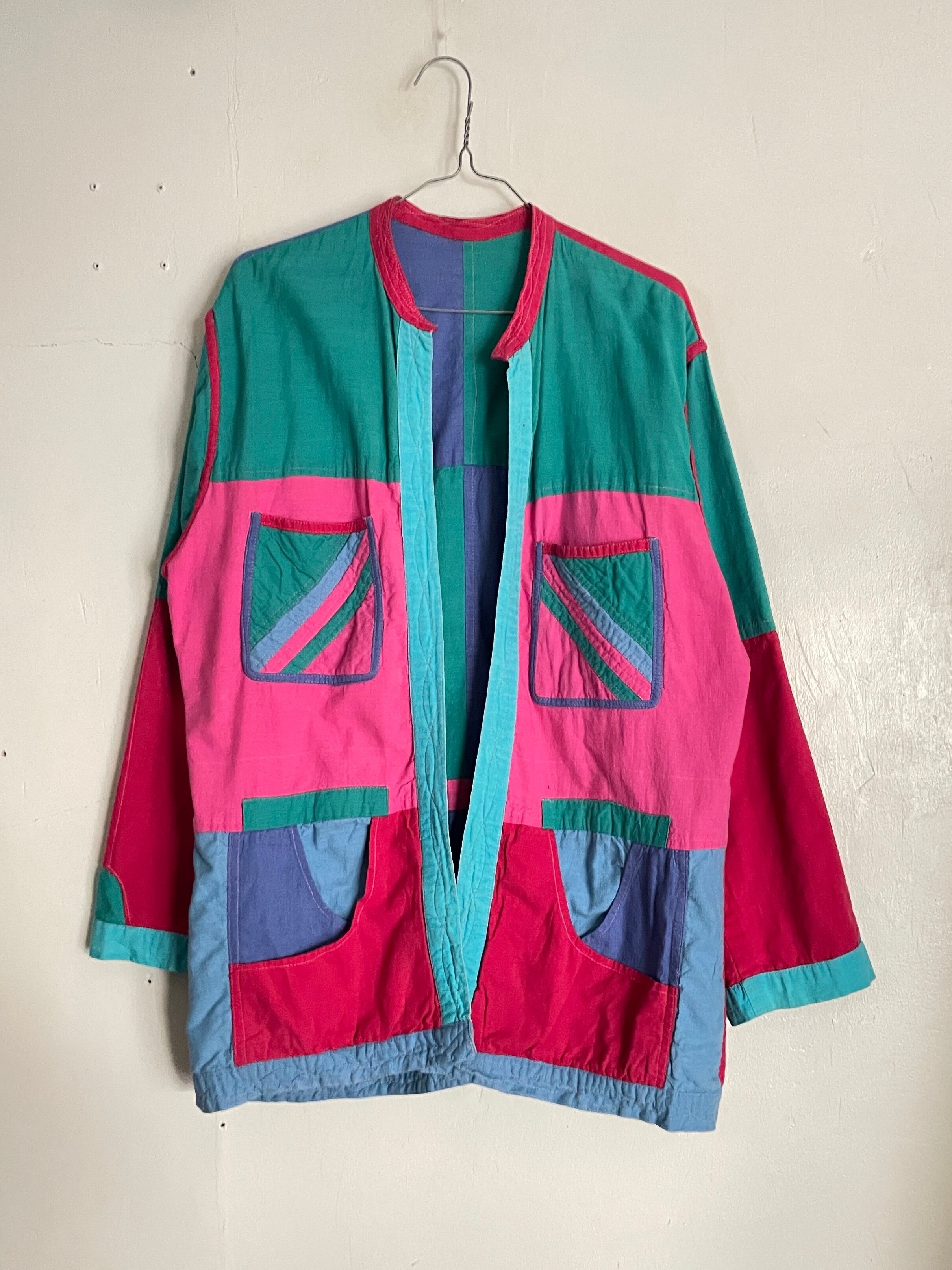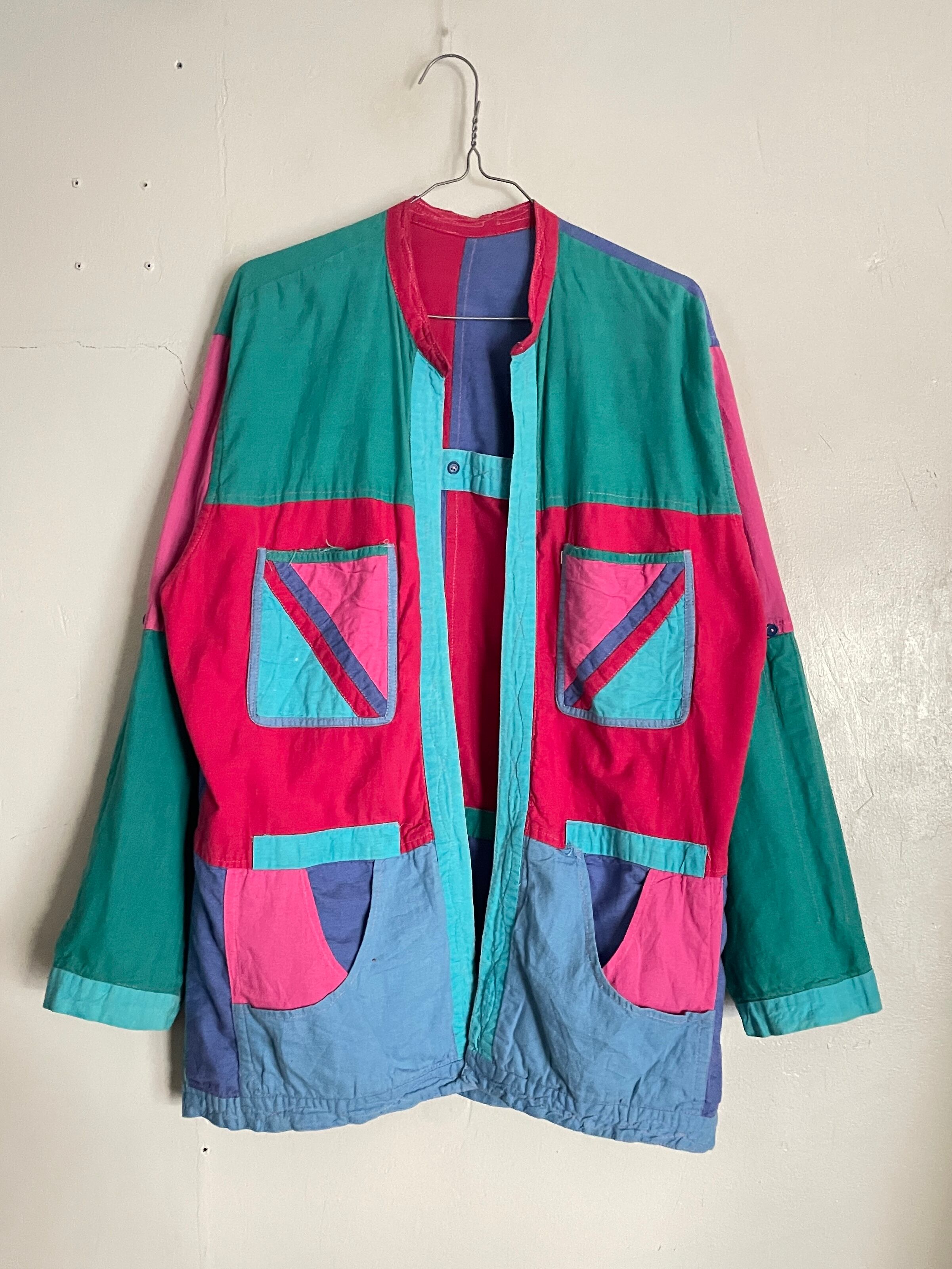 カラフルなパッチワークデザインがお洒落な、リバーシブルシャツジャケットボタンなどが無い羽織りタイプ。ハンドメイド感の感じられる可愛すぎるディテール。これだけの色が使われていてもしっかりと統一感が感じられます。気分によって、表裏使い分けられるお得感。これでポケットもかなり多めなのも嬉しいポイントです。ゆったりとしたサイズ感なので、ラフに着られて、今の時期にはインナーの差し色としても活躍してくれそうです。