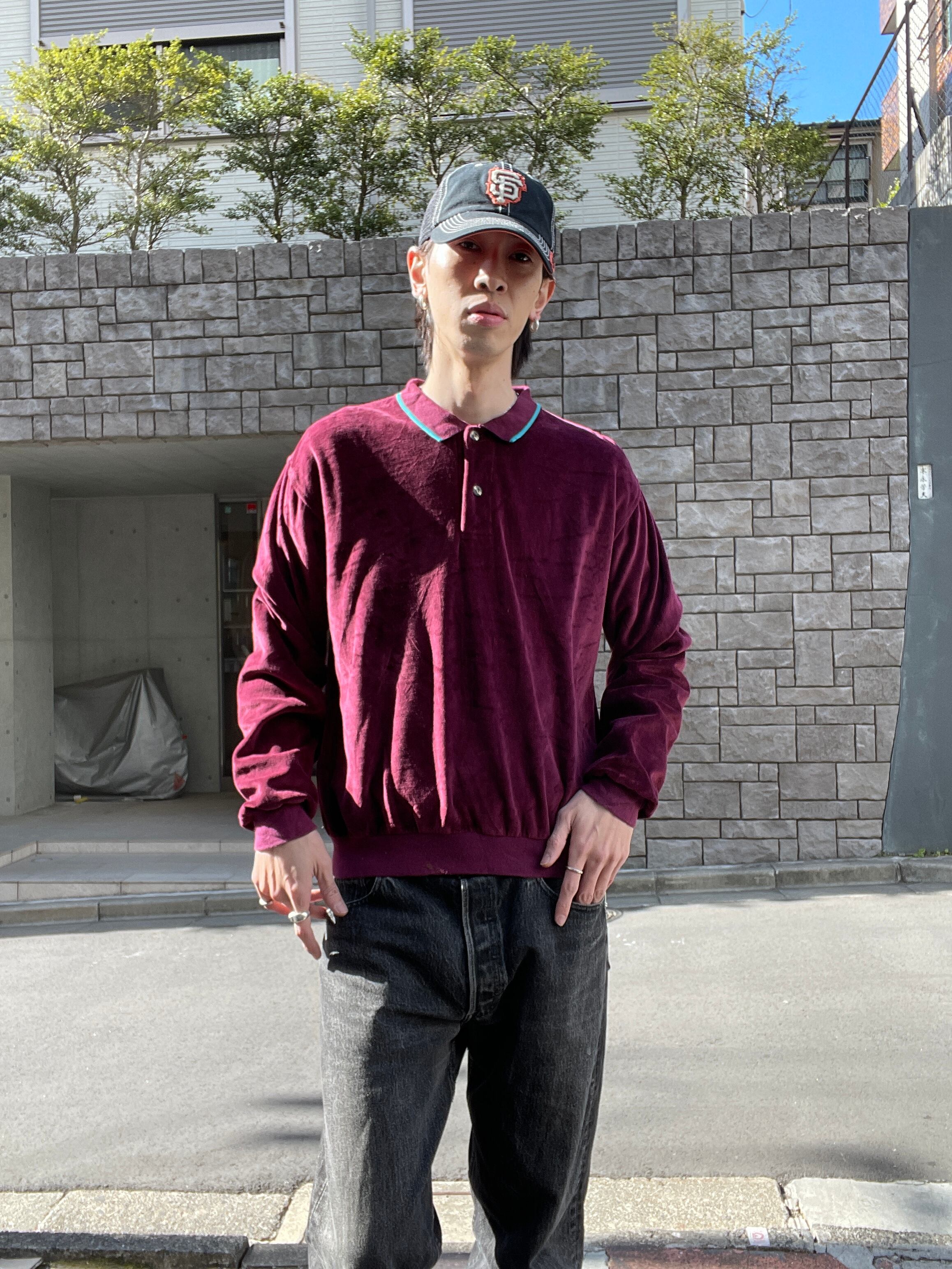 色気のあるワインレッドボディのベロアポロシャツ。やや光沢のある上品なベロア素材。ネック部分のライトブルーの切り替えもお洒落です。伸縮性のある素材なので、着心地抜群です。大き過ぎず。、小さ過ぎないサイズ感なので、男女共におすすめしたいアイテムです。一枚ではもちろんですが、インナーとしても活躍してくれる一着です。