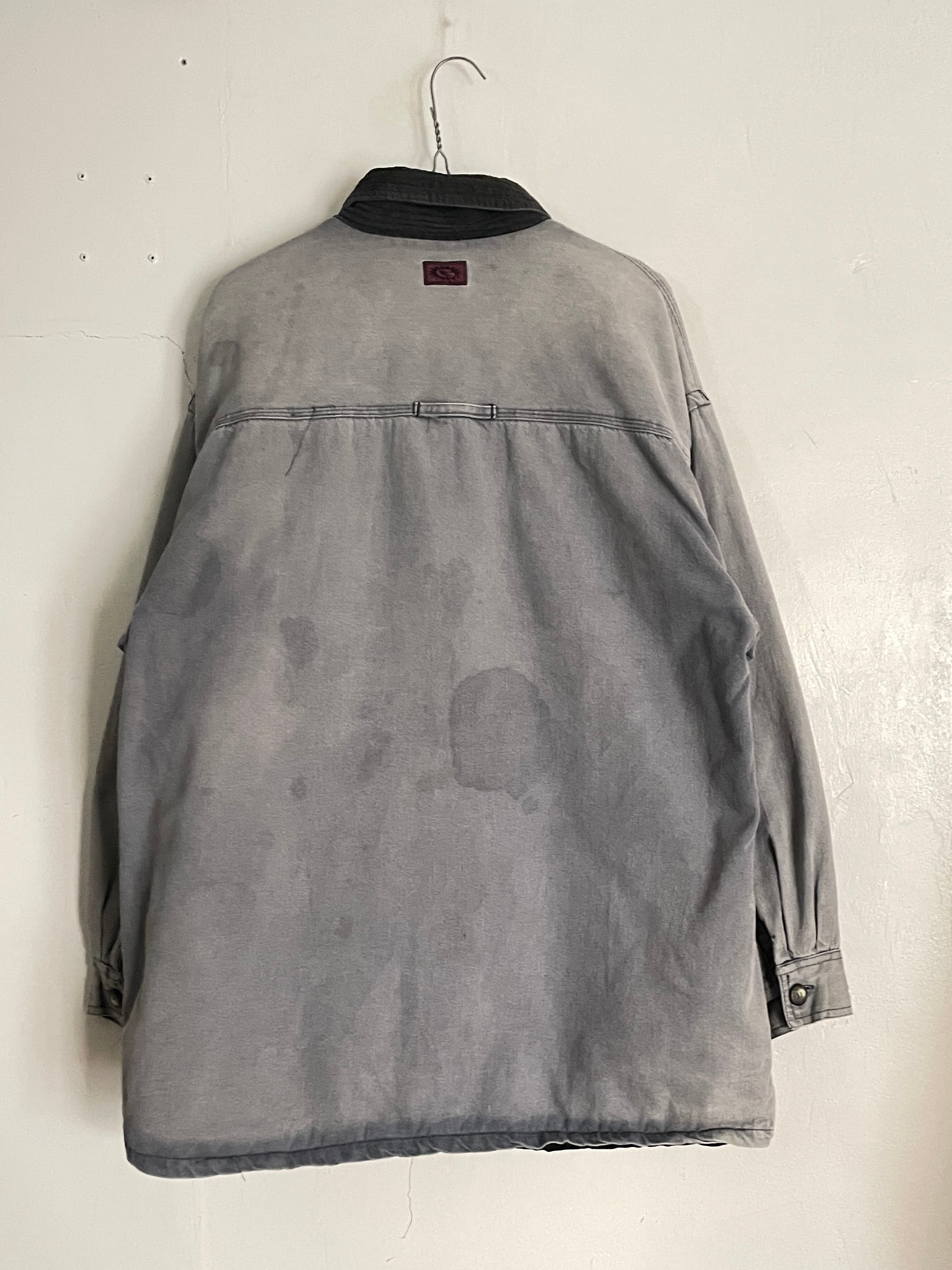 ややフェードしたグレーボディで、襟がコーデュロイで切り替えられた、ガッチャのワークシャツジャケット。厚みのあるコットン素材で、裏地はキルティング仕様。まさに今の時期にはファッションのメインになってくれそうです。汚れなどが所々に見られますが、ワークウェアはこれくらいが一番雰囲気あります。ゆったりとしたサイズ感なので、インナーにもしっかり着込めそうです。
