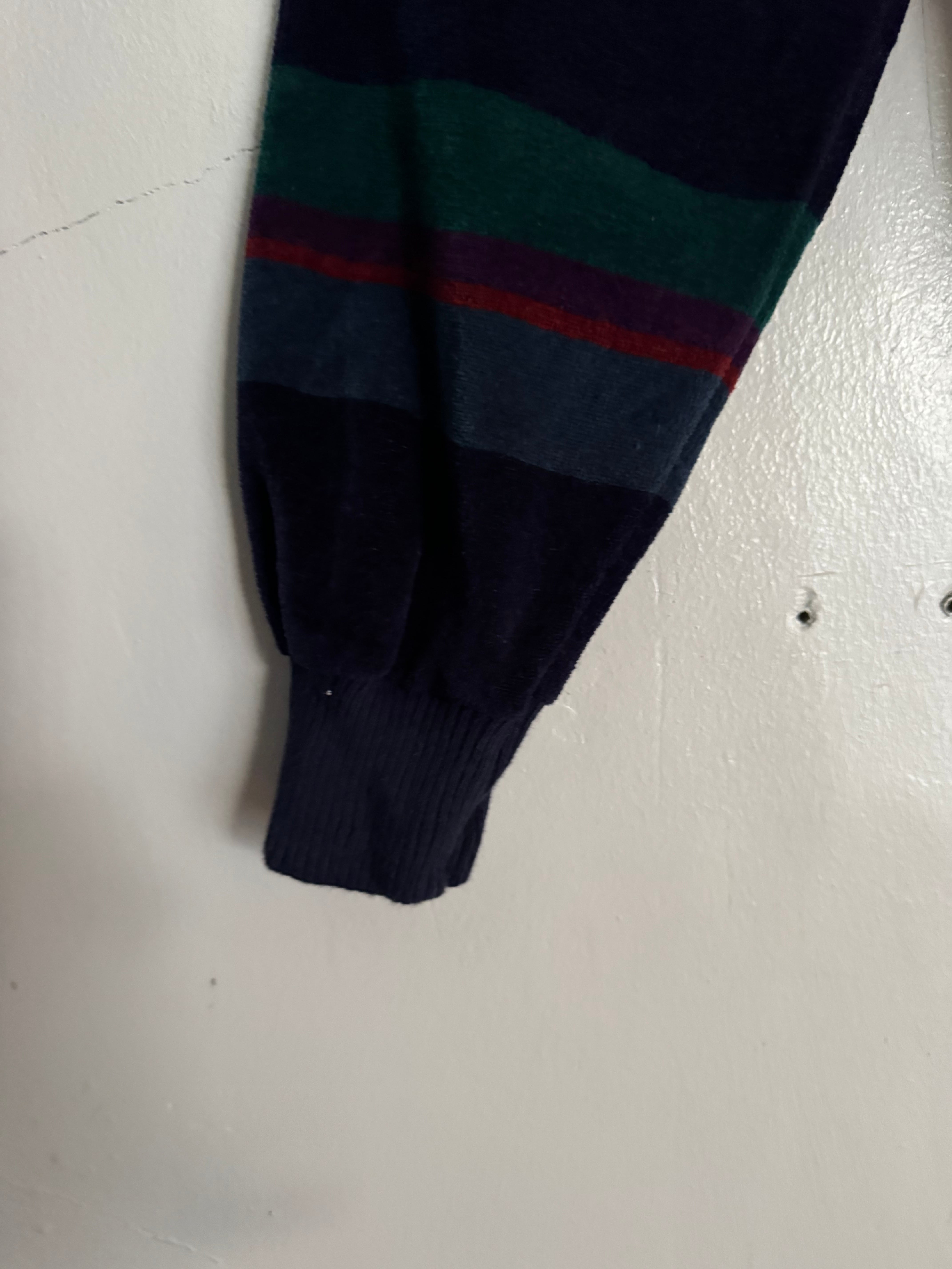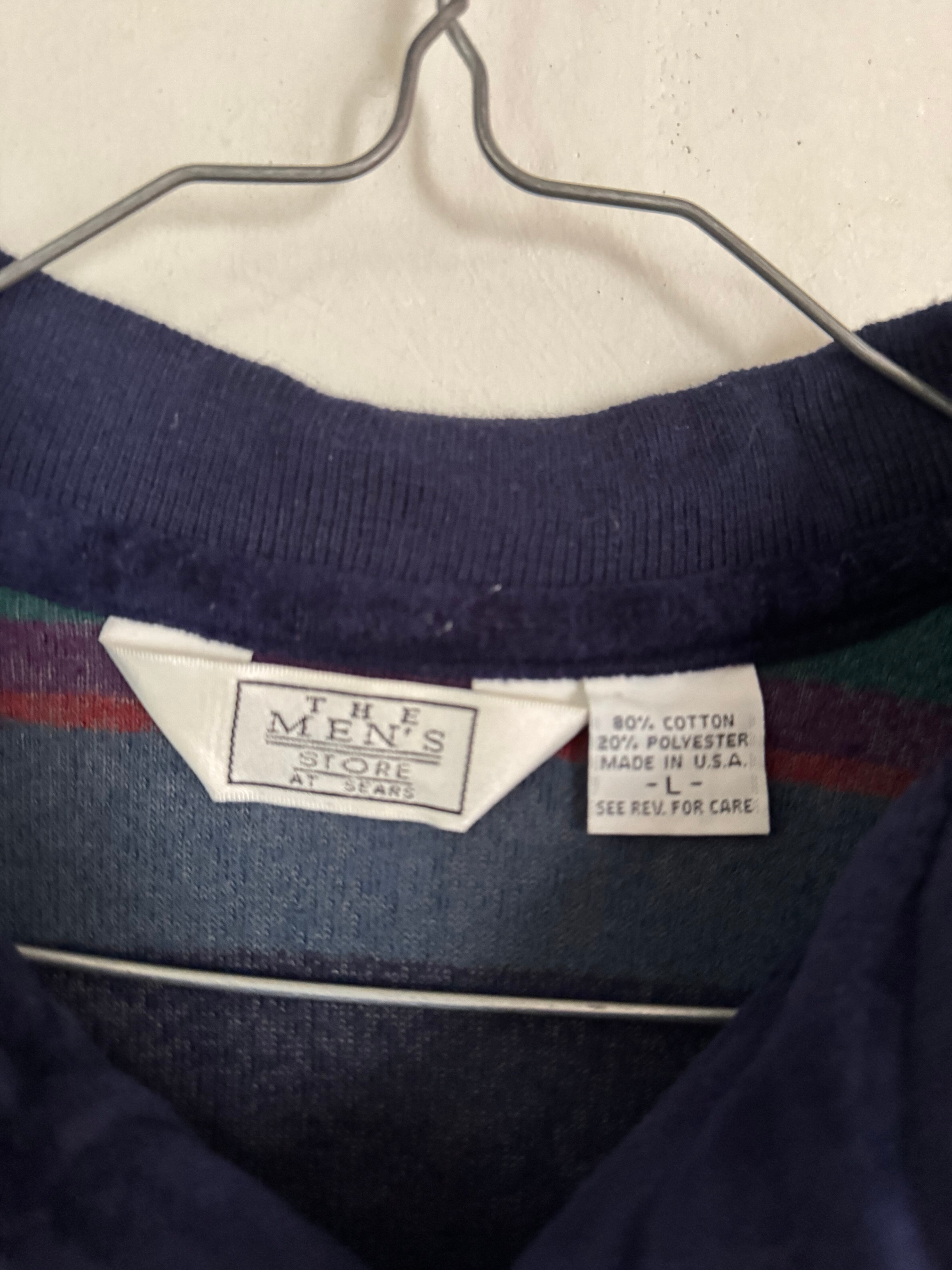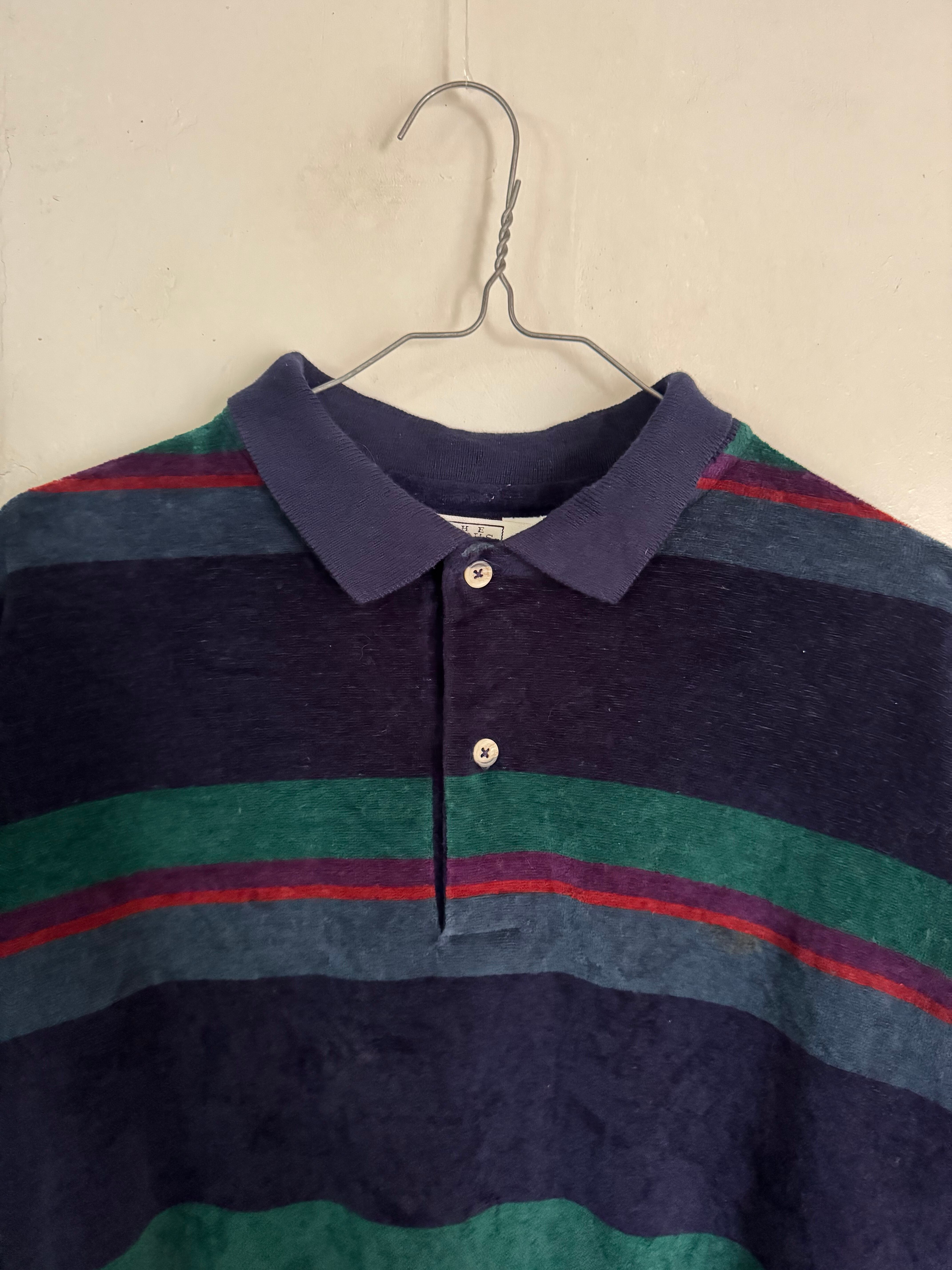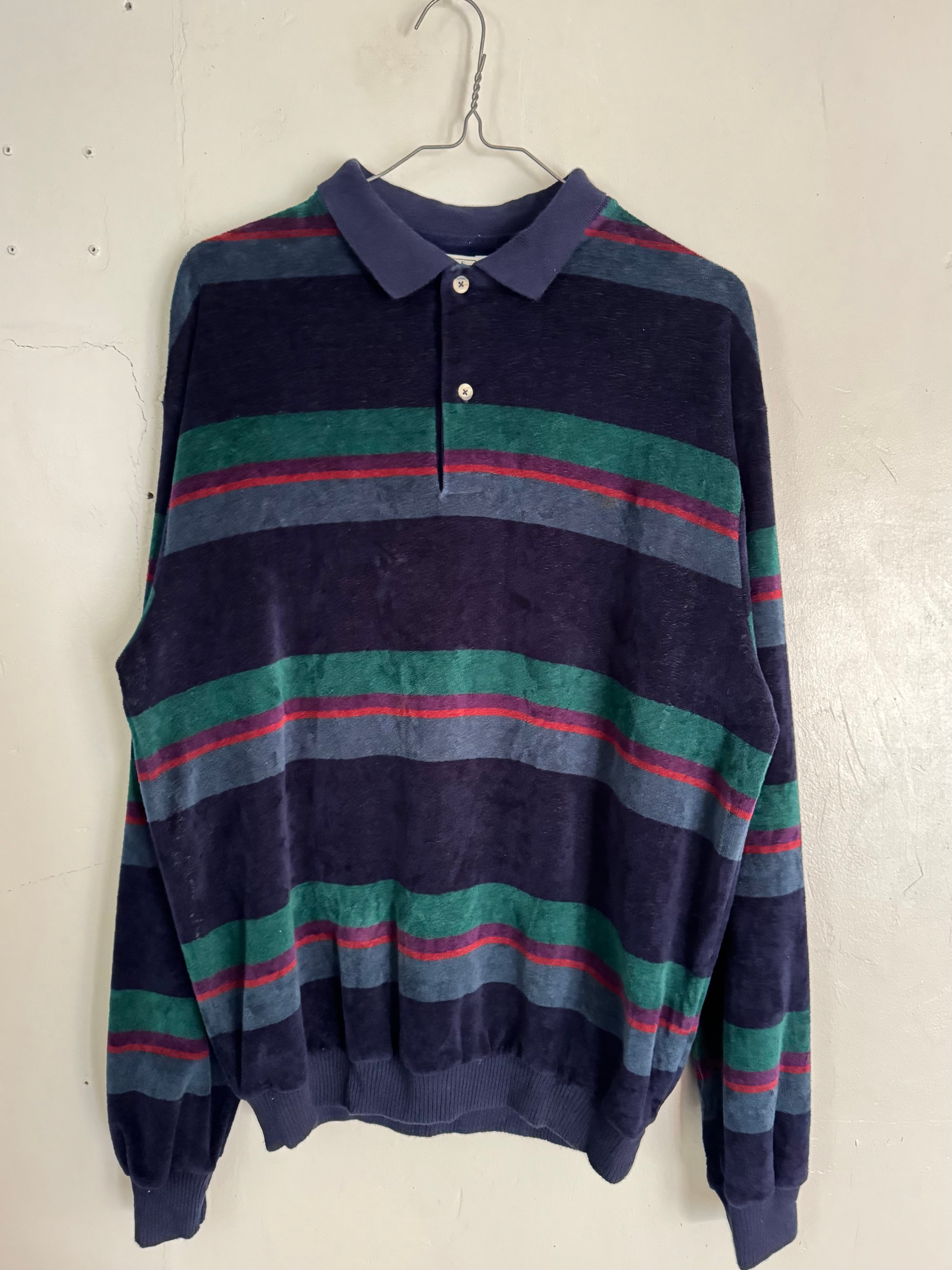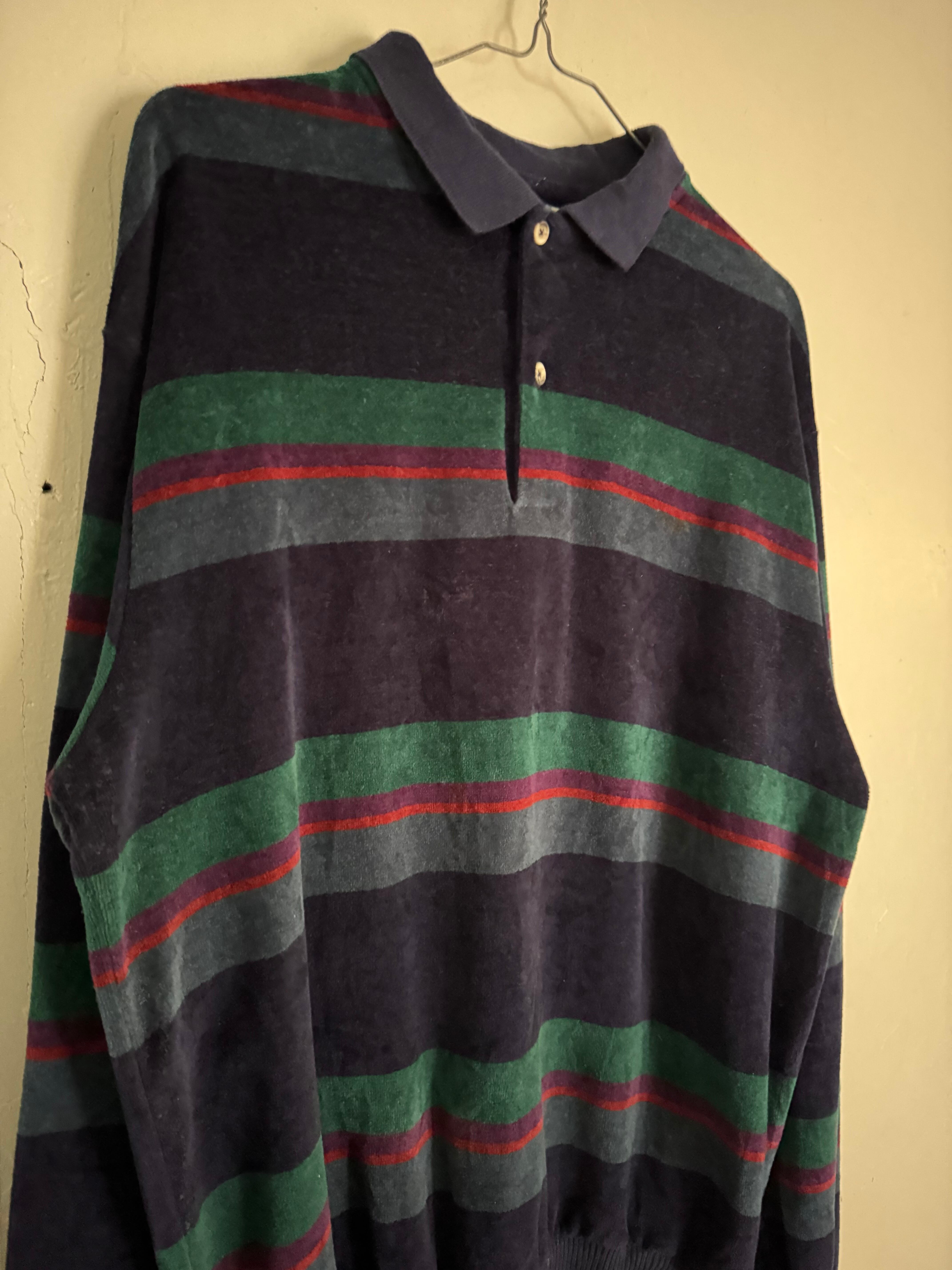 光沢感のあるベロア素材を使用したボーダーシャツ。ネイビーをベースに、グリーンやレッドを織り交ぜたマルチボーダーが印象的な一着。柔らかく滑らかな質感で、リラックス感がありながらも何処か品のある佇まい。一枚で主役にもなる、存在感のある一着です。