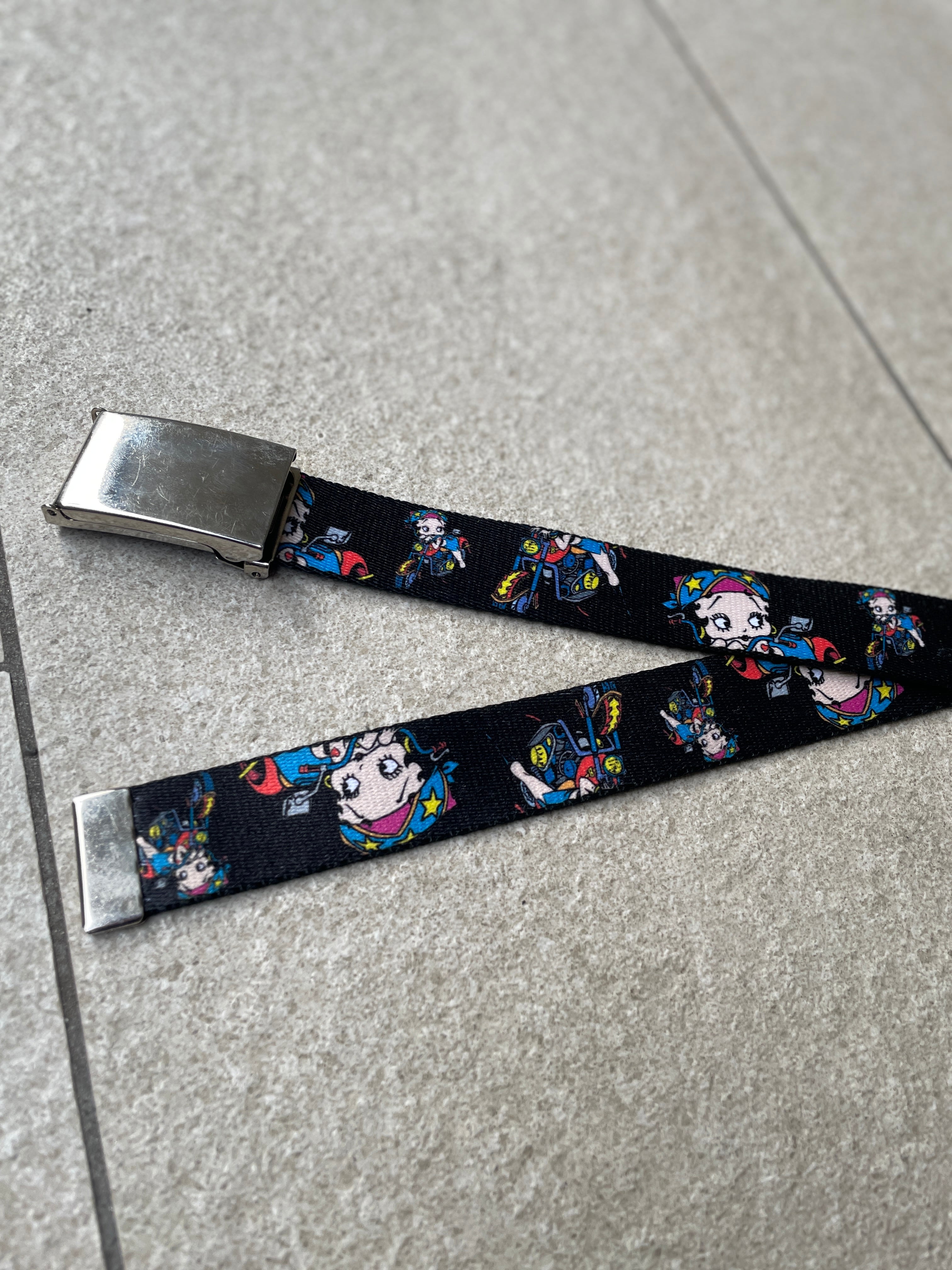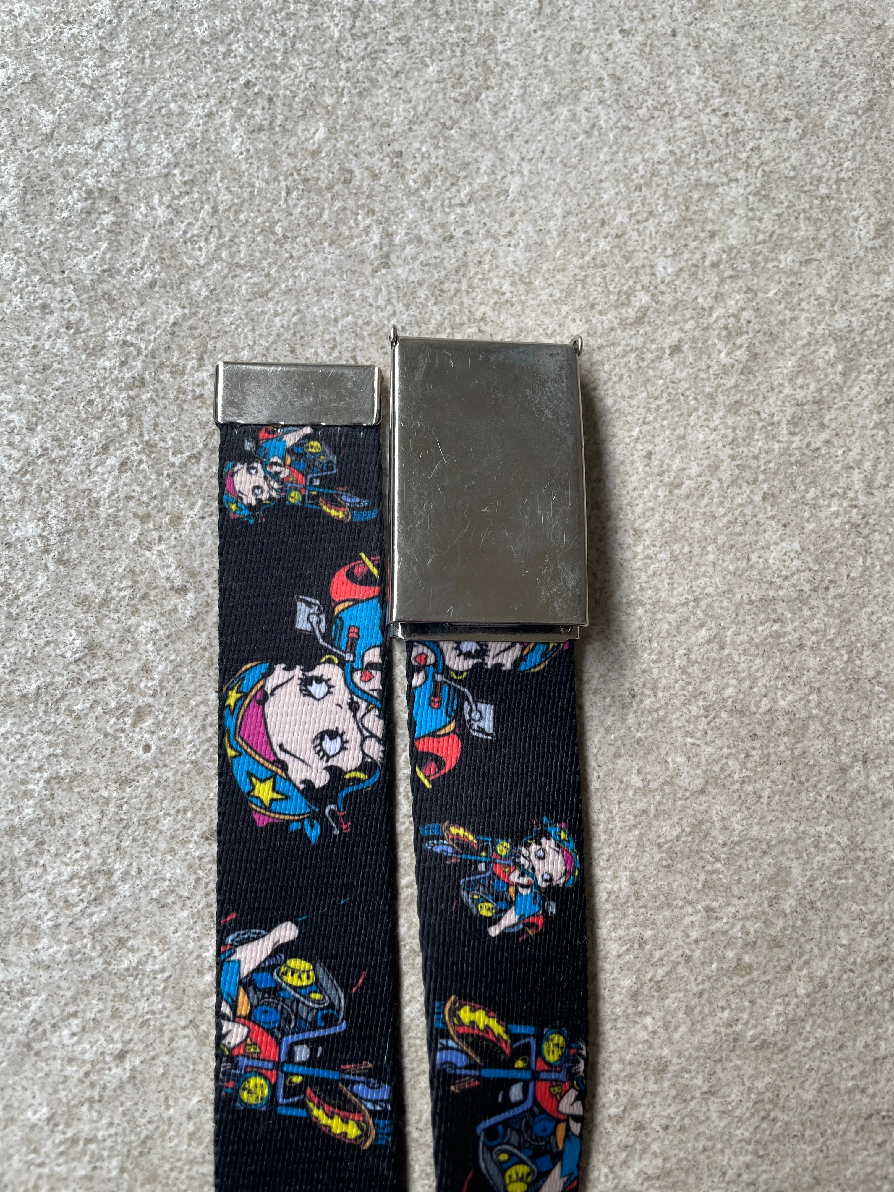 ブラックカラーに、バイクに跨ったベティ・ブープが全体にデザインされた、ガチャベルト。ベティの服装には様々な柄が使われていて、ポップでレトロな雰囲気がお洒落です。ガチャベルトなので、サイズ調節がしやすく、男女共にお使い頂けるベルトになっています。間違いなくファッションの良いアクセントになってくれるアイテムです。