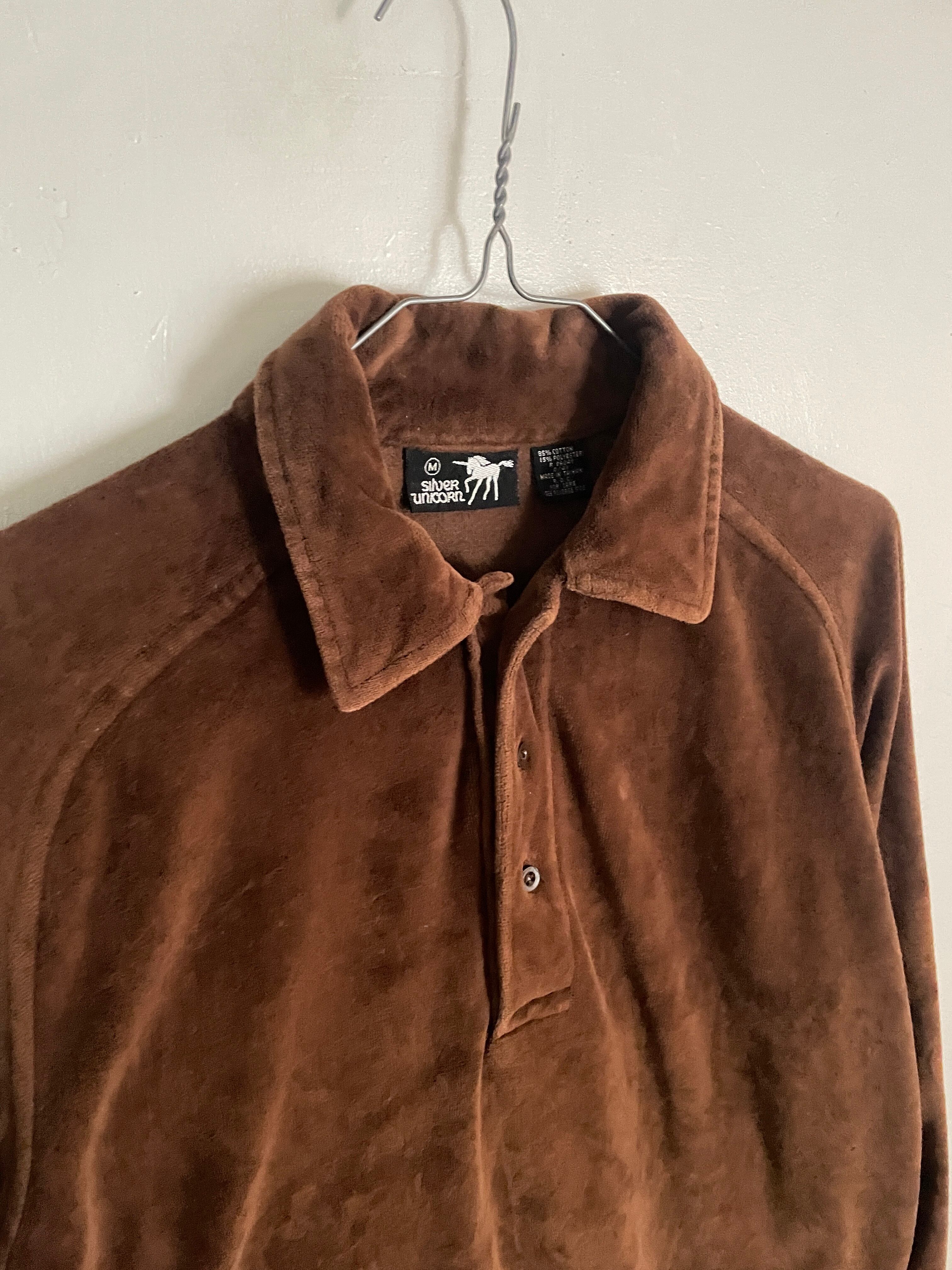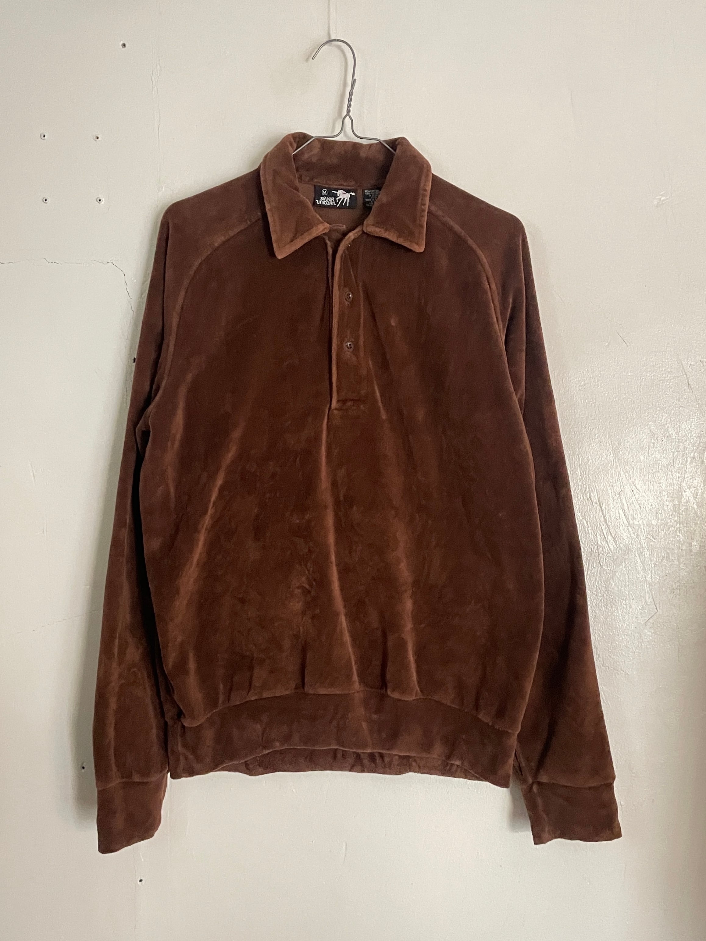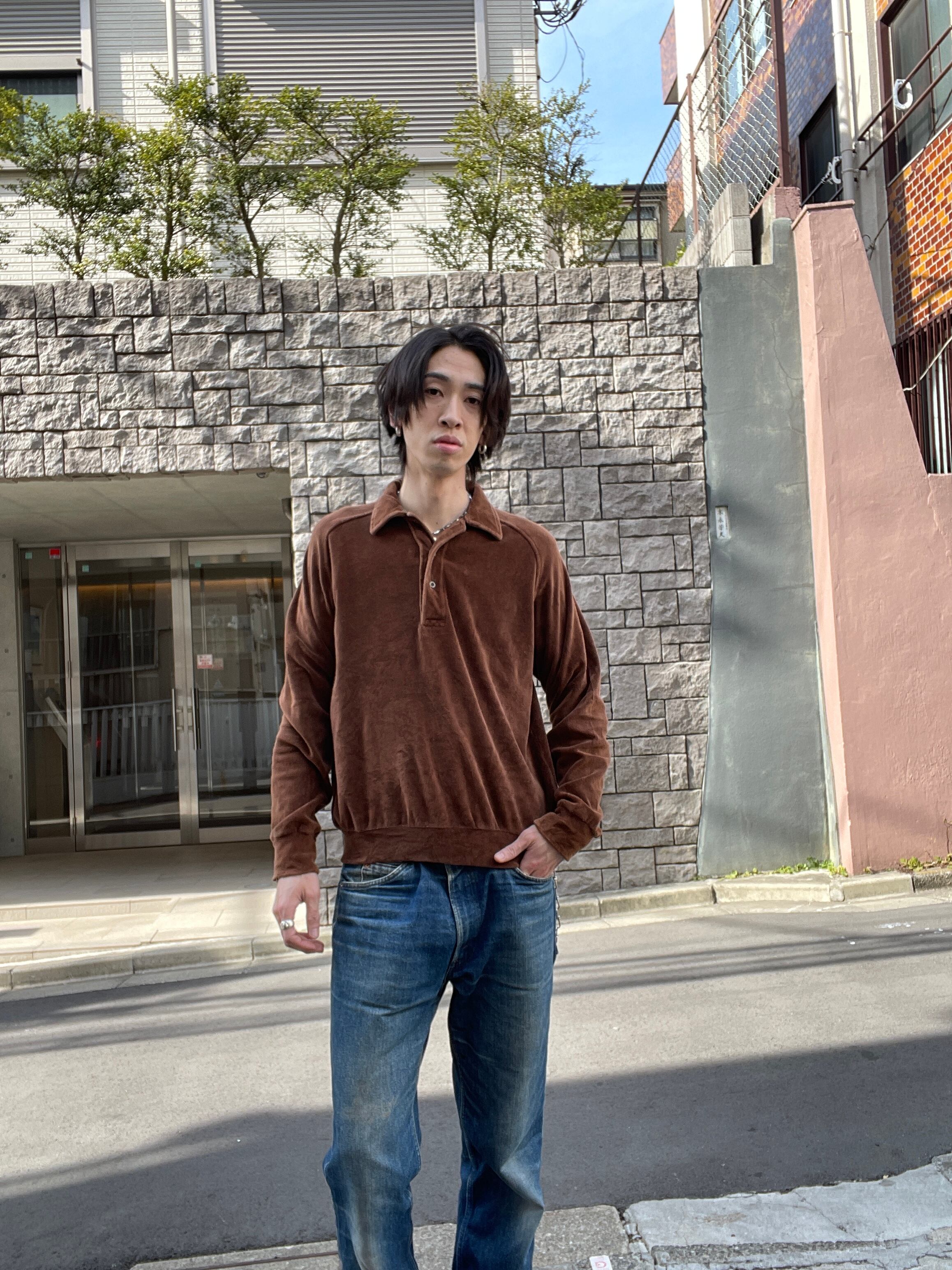渋さと色気が感じられるブラウンボディのベロアポロシャツ。フワッとした上質なベロア素材。伸縮性もあって、着心地も抜群です。70年代の雰囲気もしっかりと感じられる一着です。大き過ぎず、小さ過ぎないサイズ感なので、男女共におすすめしたいアイテムです。今の時期はインナーとしても活躍してくれます。