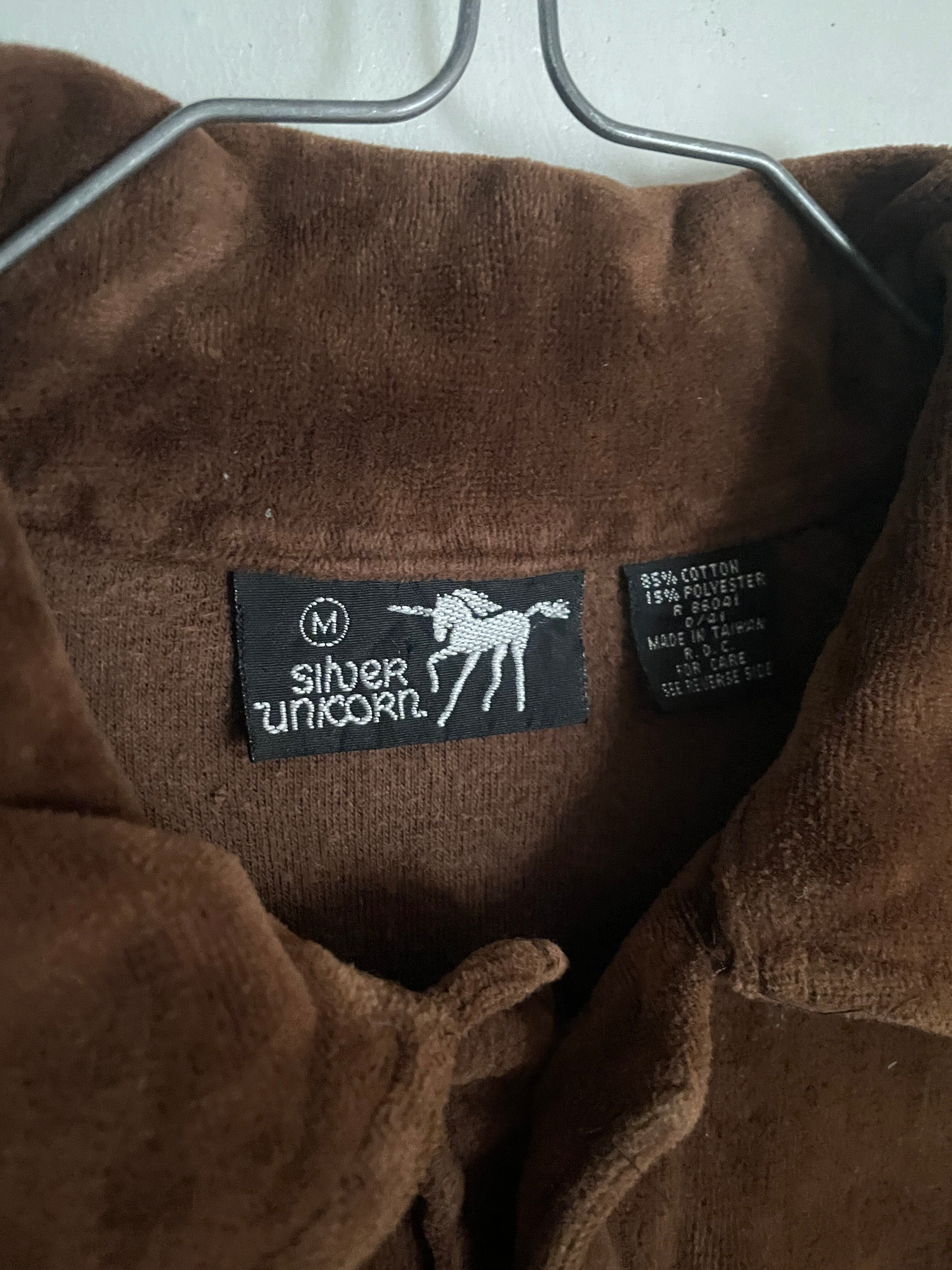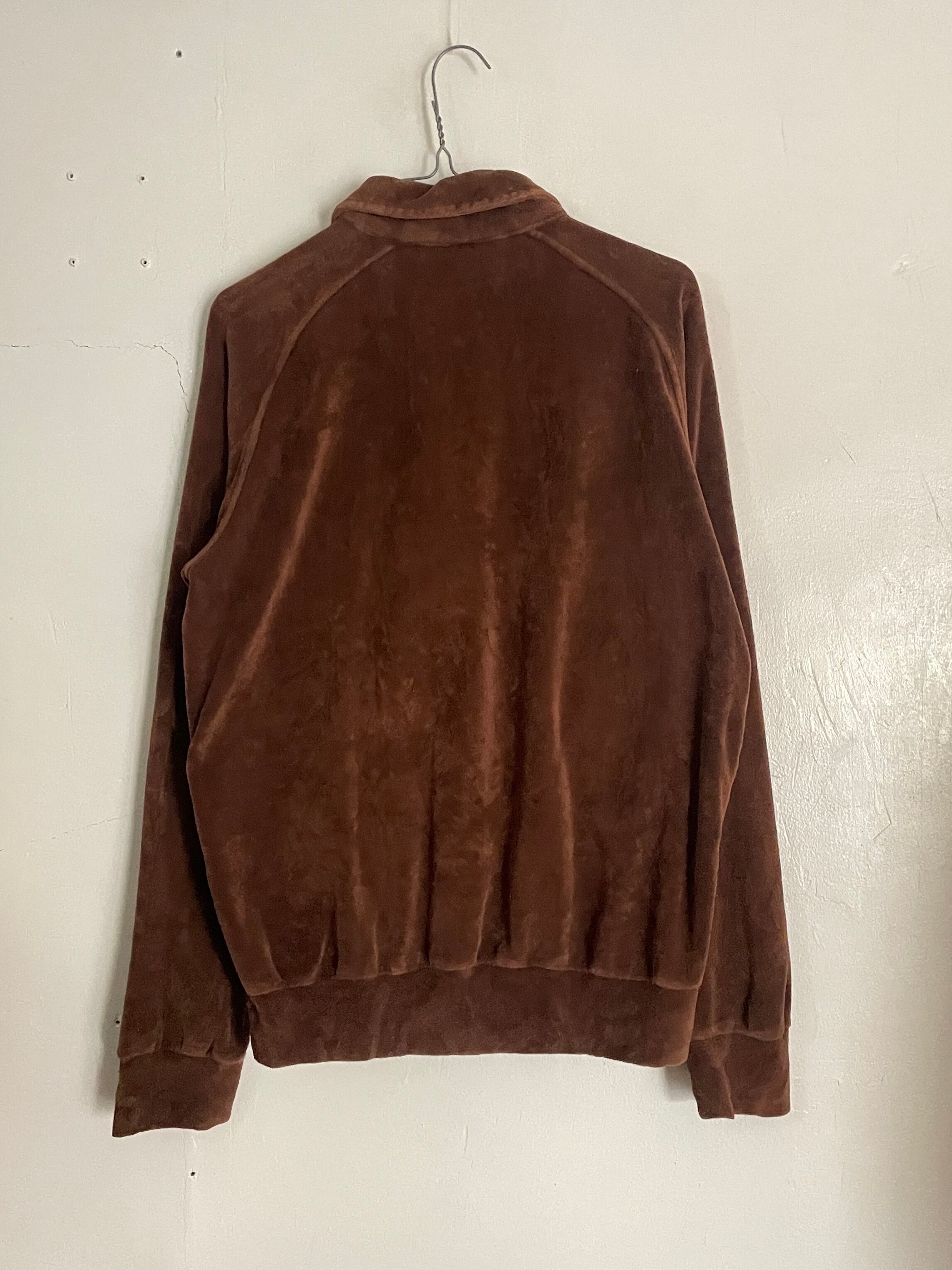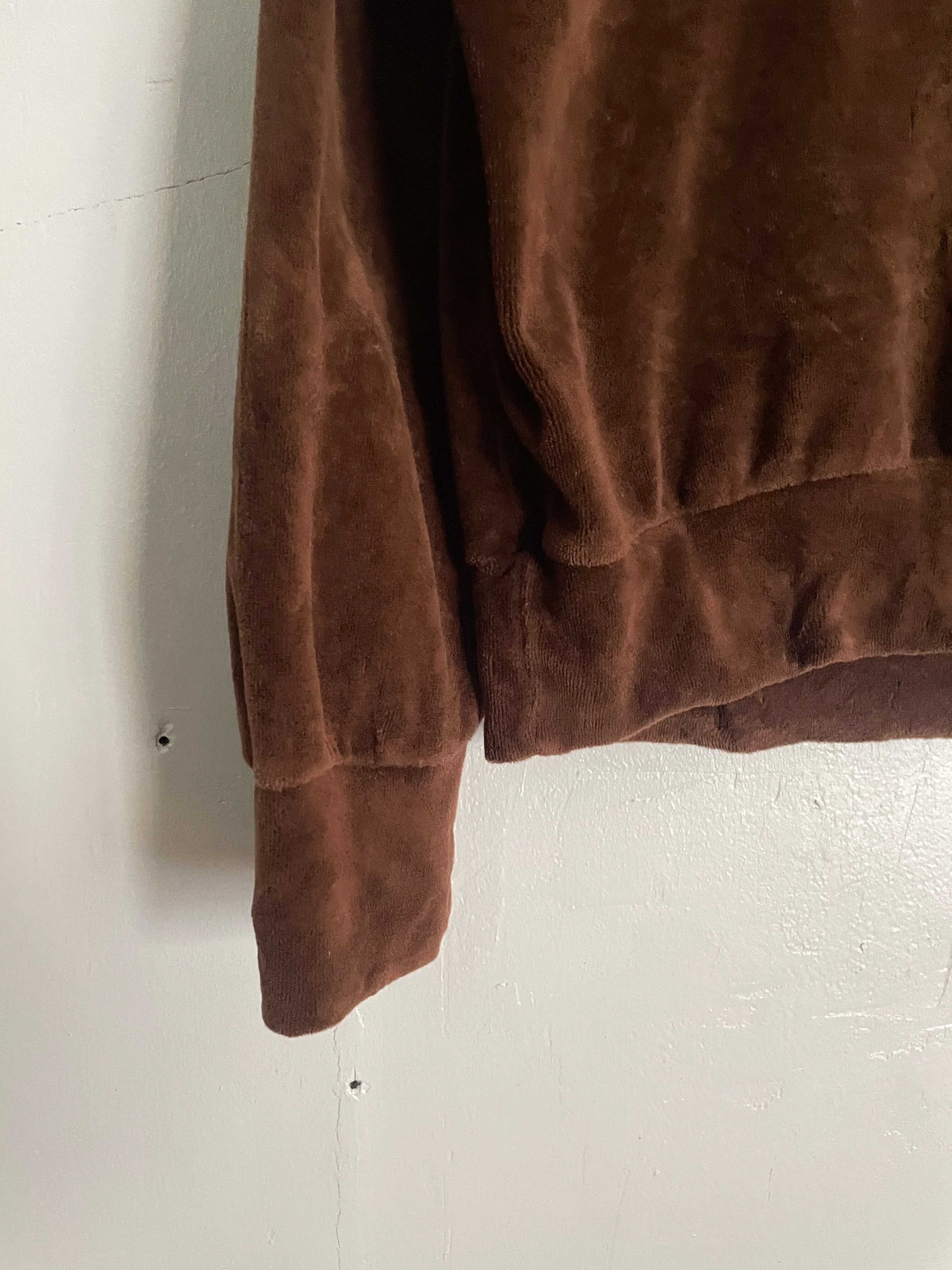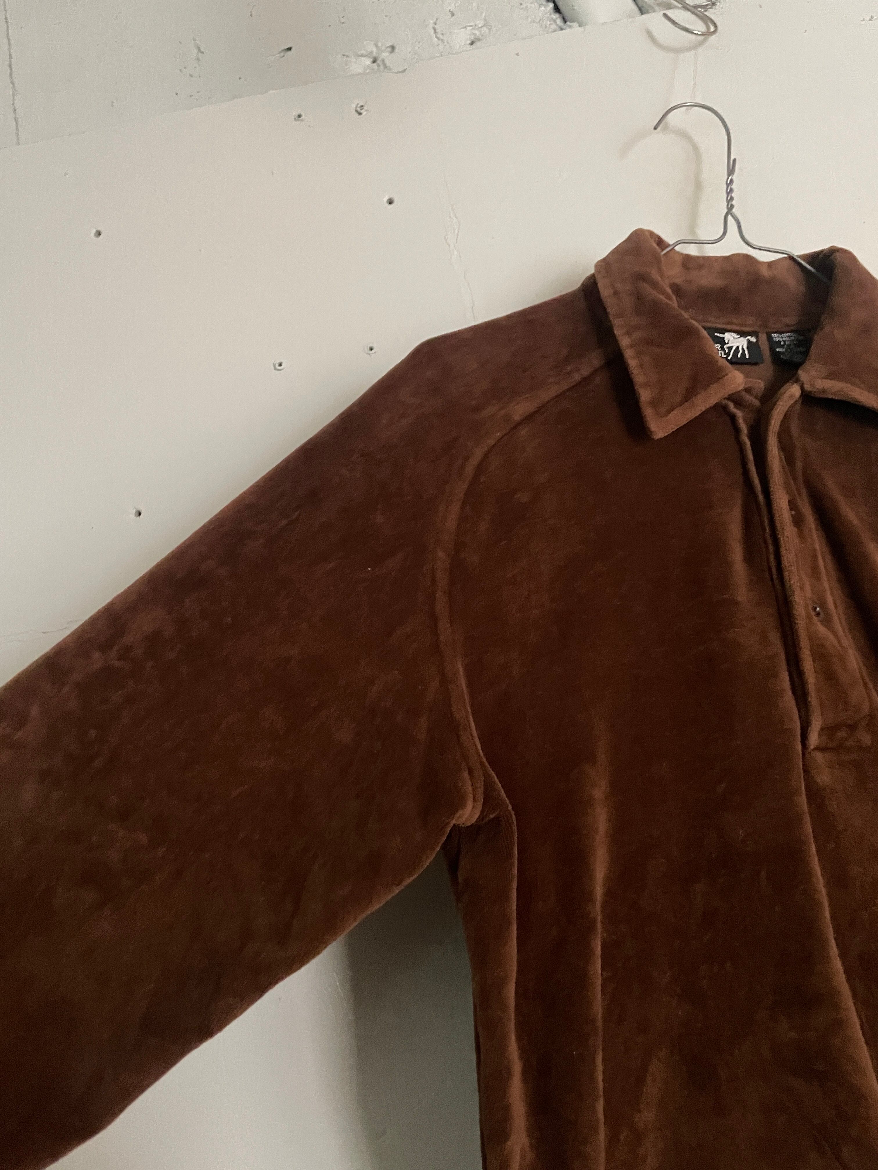 渋さと色気が感じられるブラウンボディのベロアポロシャツ。フワッとした上質なベロア素材。伸縮性もあって、着心地も抜群です。70年代の雰囲気もしっかりと感じられる一着です。大き過ぎず、小さ過ぎないサイズ感なので、男女共におすすめしたいアイテムです。今の時期はインナーとしても活躍してくれます。