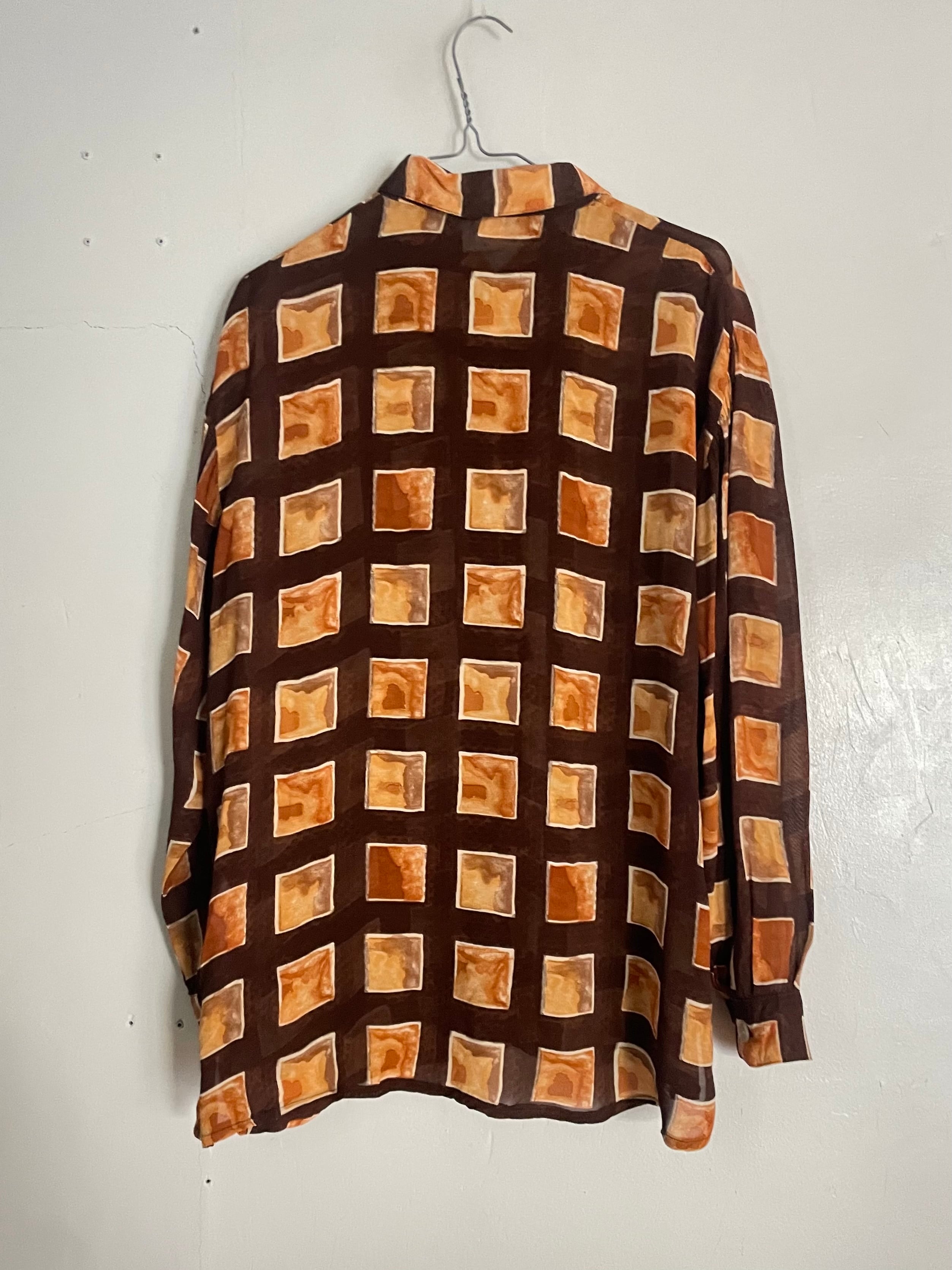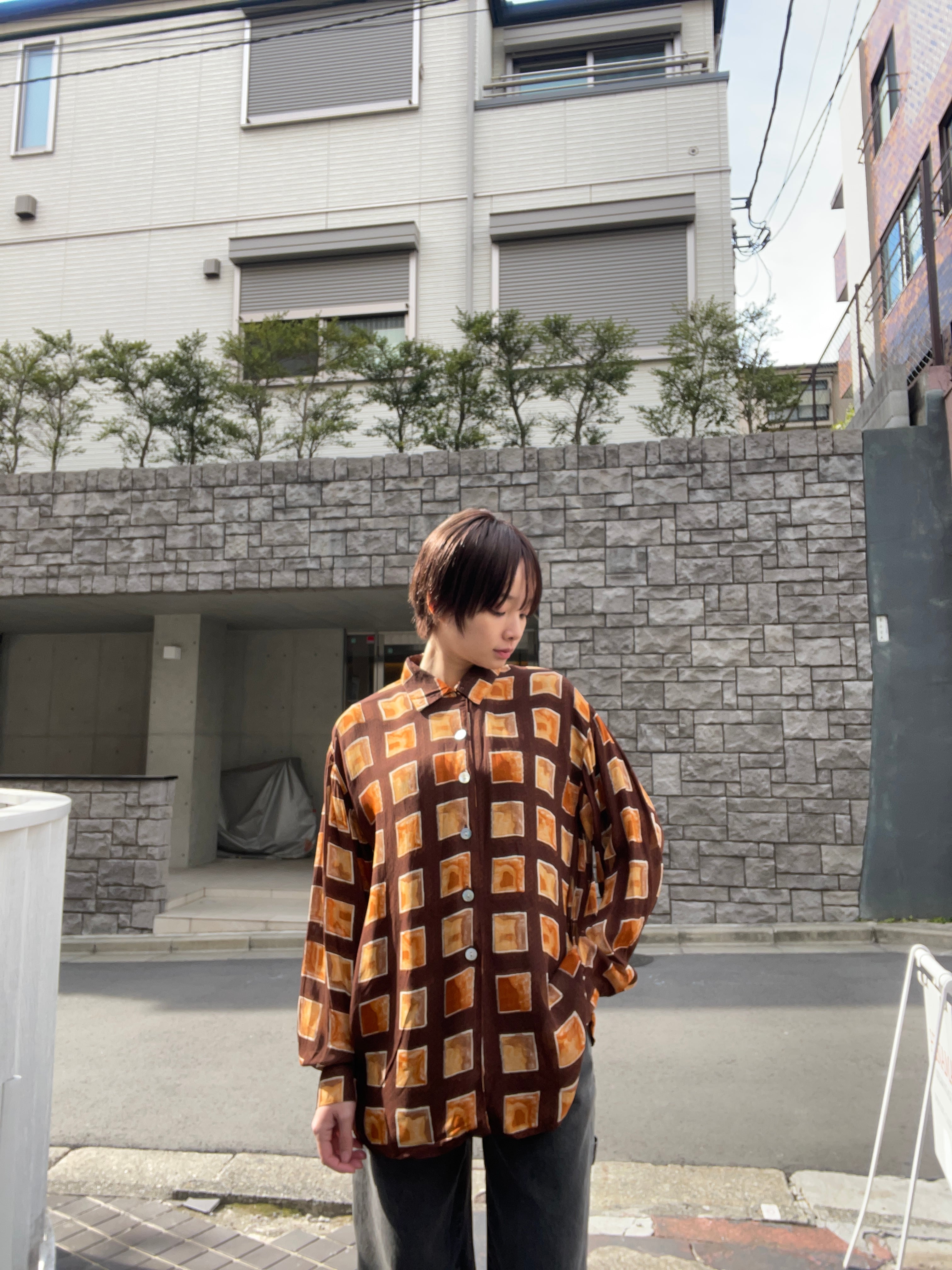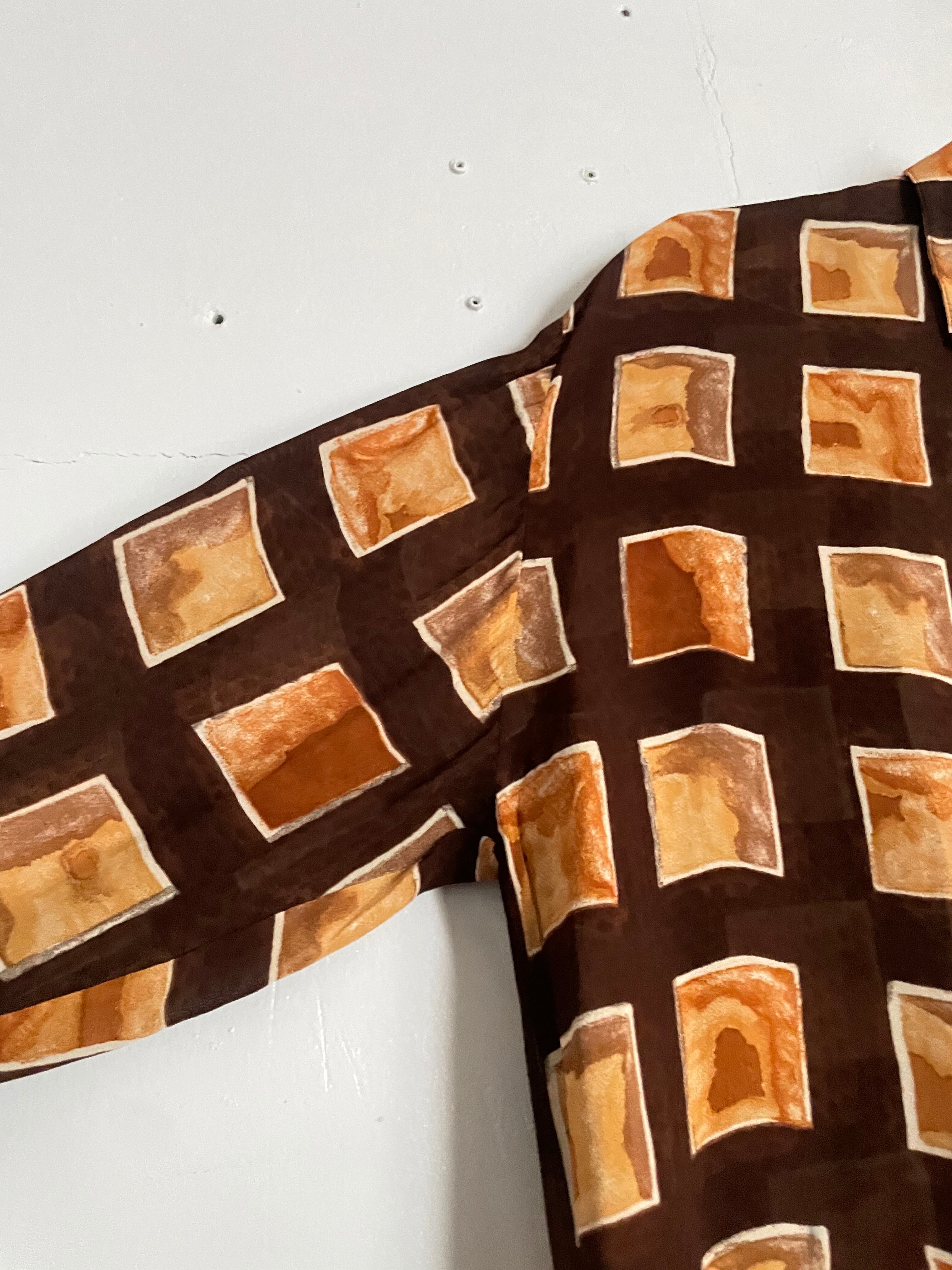 ブラウンをベースに、温かみのあるスクエア柄が全面に配されたデザインシャツ。手書きのようなムラ感のある配色が特徴で、落ち着いた色味の中に個性を感じる一着です。とろみのある質感で、軽やかに着用でき、動くたびに自然なドレープが生まれます。一枚で着るのはもちろん、羽織りとしてもお使い頂ける万能アイテムです。