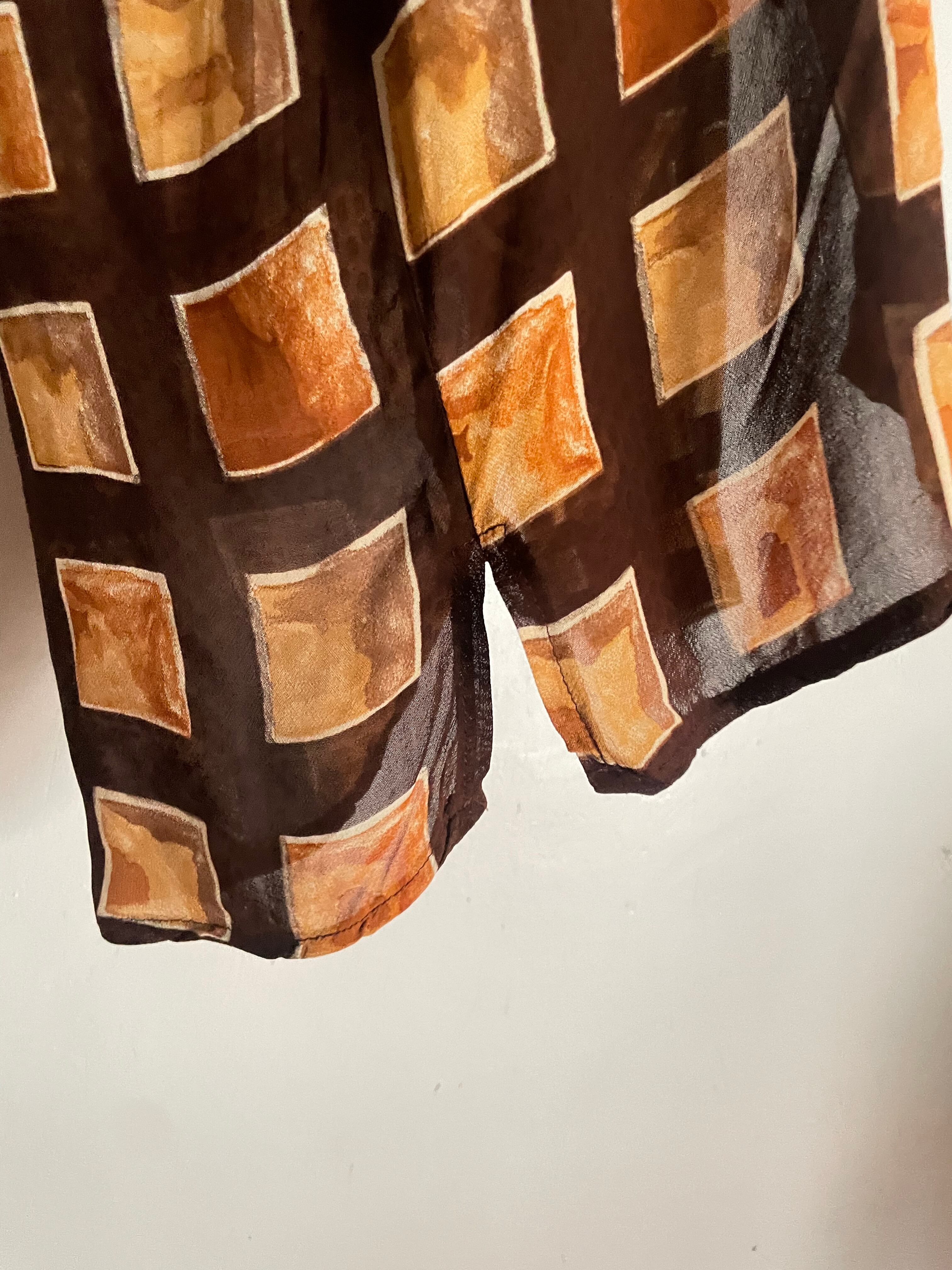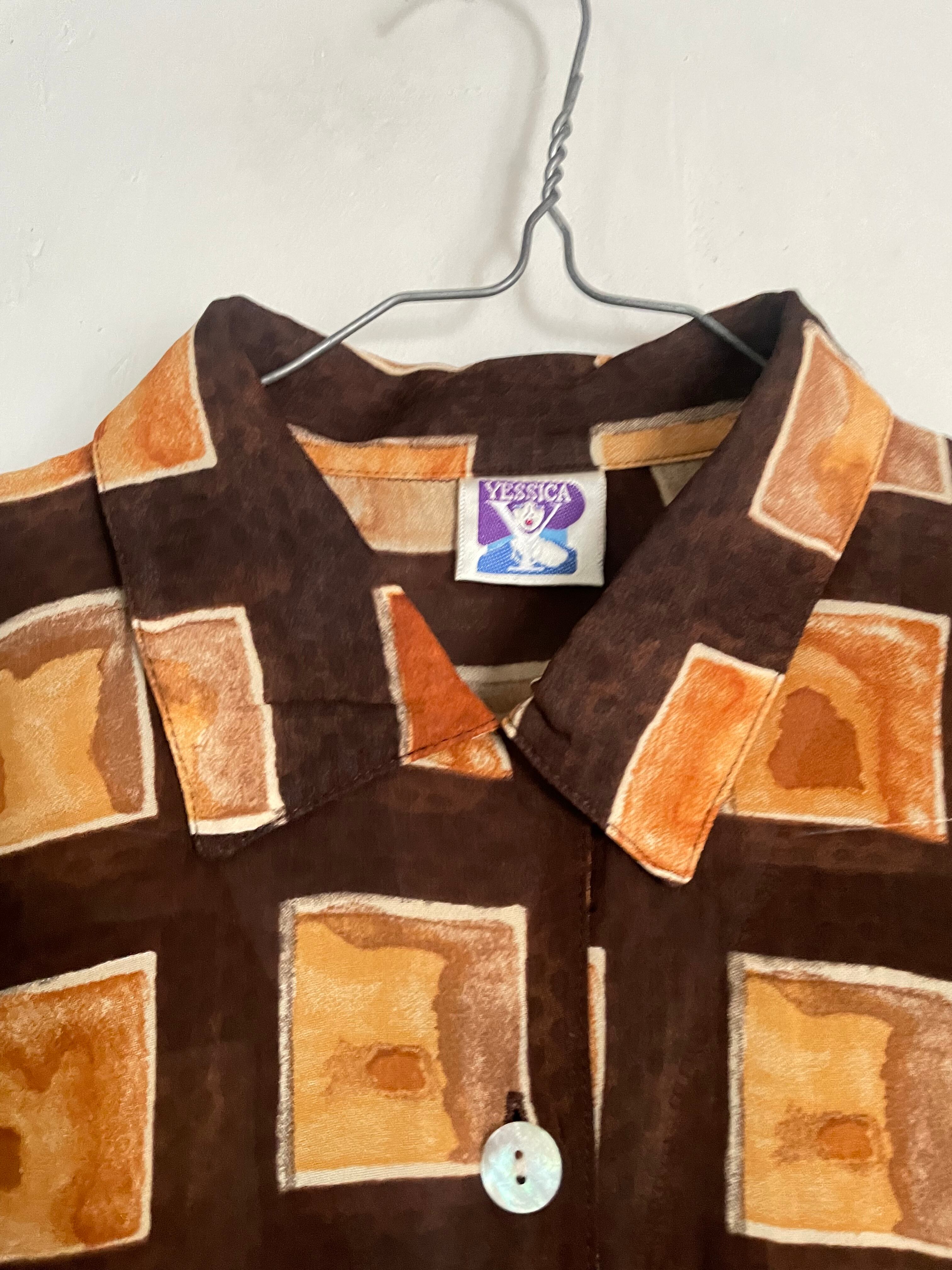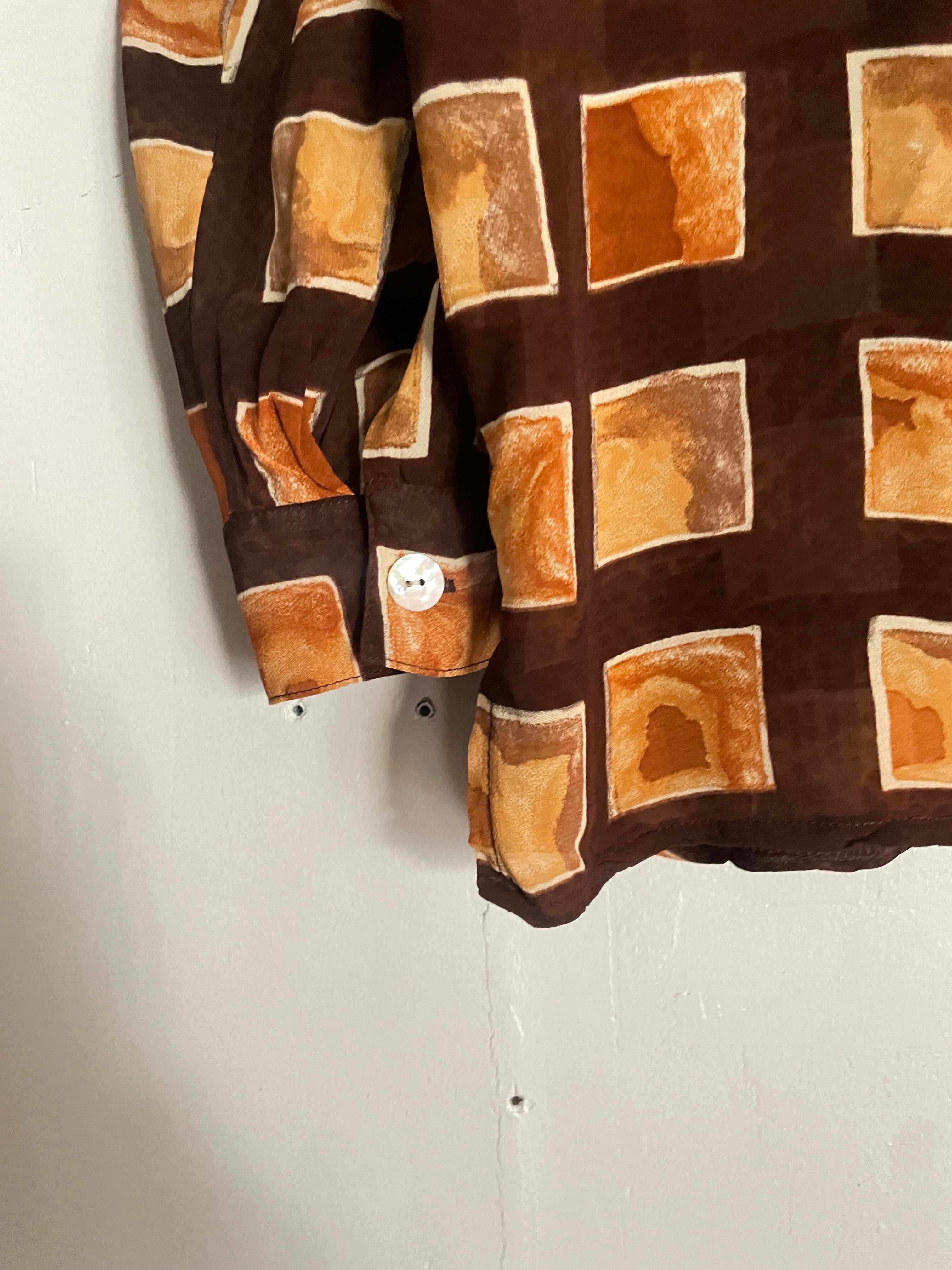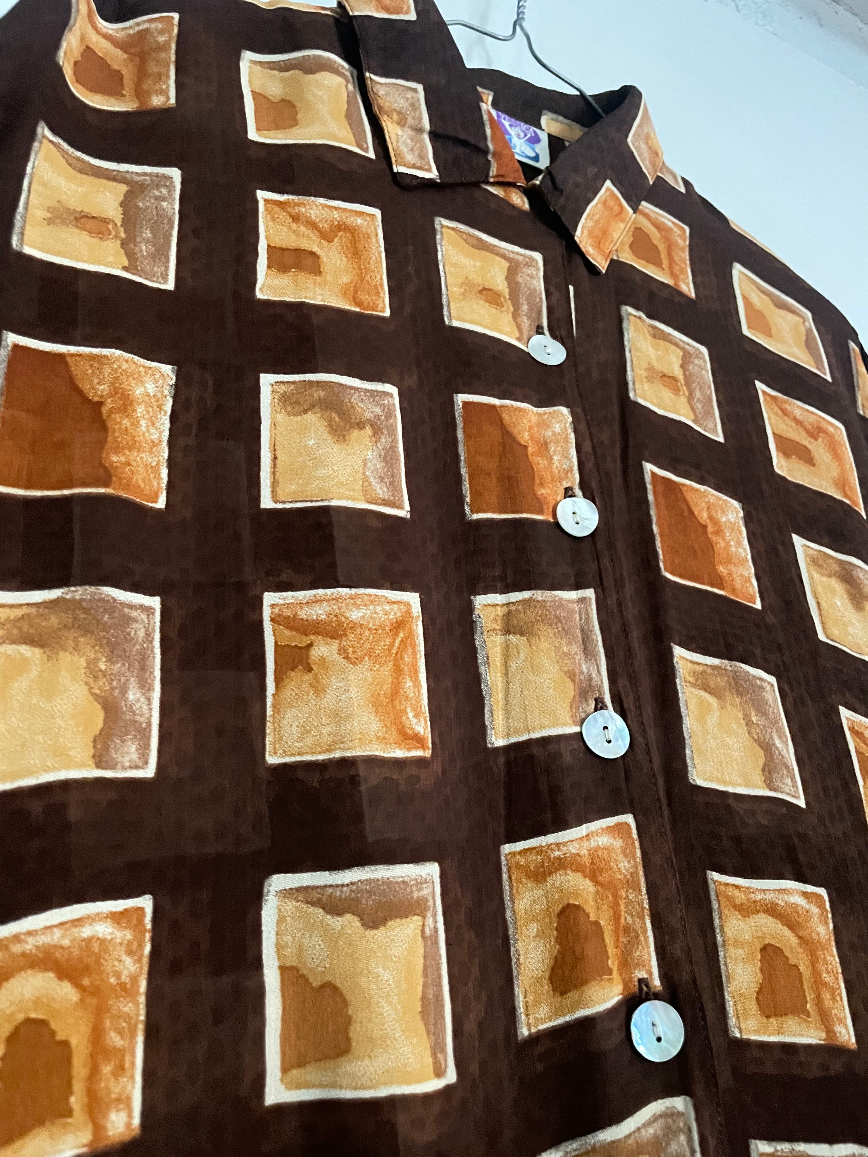 ブラウンをベースに、温かみのあるスクエア柄が全面に配されたデザインシャツ。手書きのようなムラ感のある配色が特徴で、落ち着いた色味の中に個性を感じる一着です。とろみのある質感で、軽やかに着用でき、動くたびに自然なドレープが生まれます。一枚で着るのはもちろん、羽織りとしてもお使い頂ける万能アイテムです。