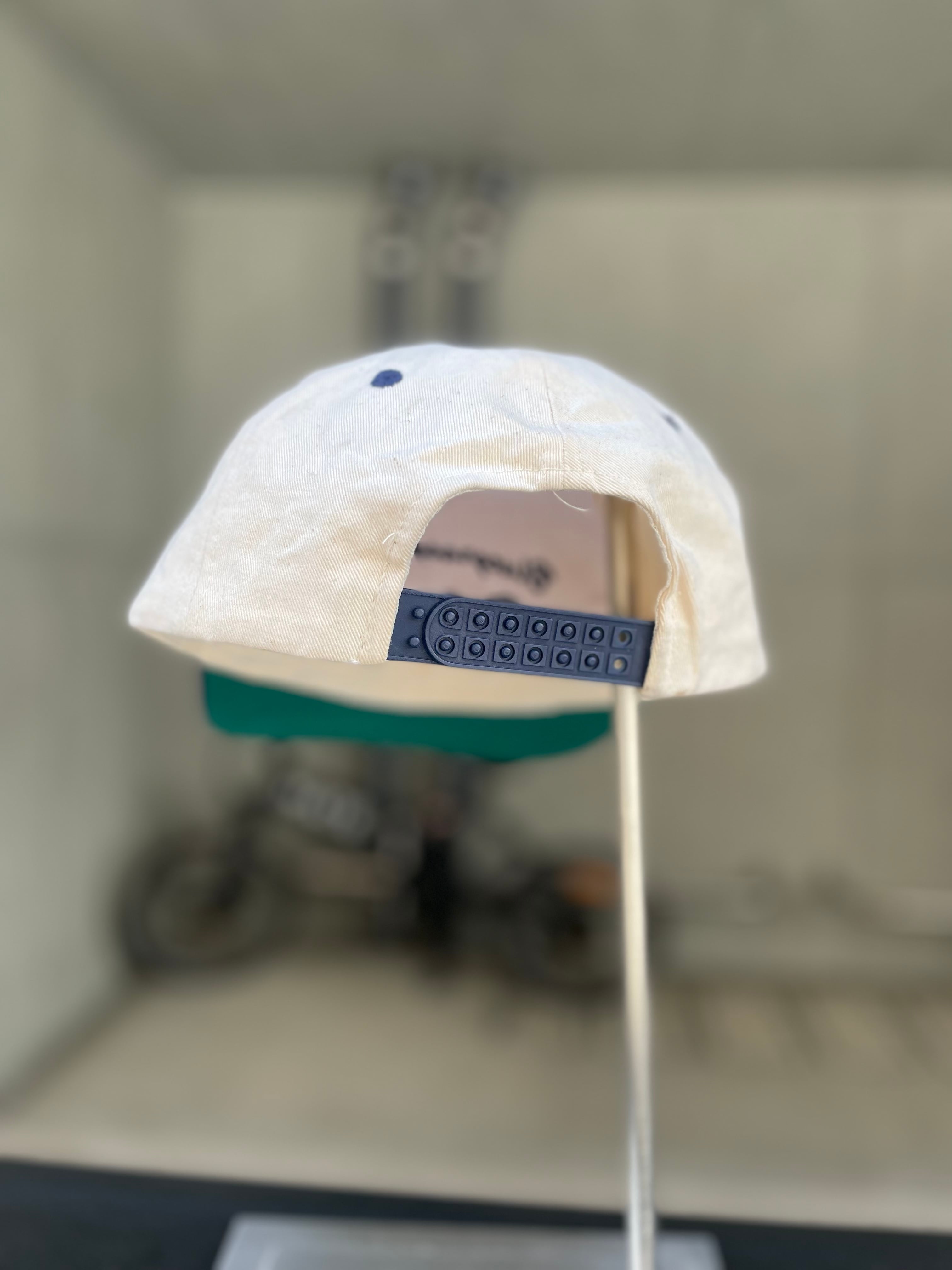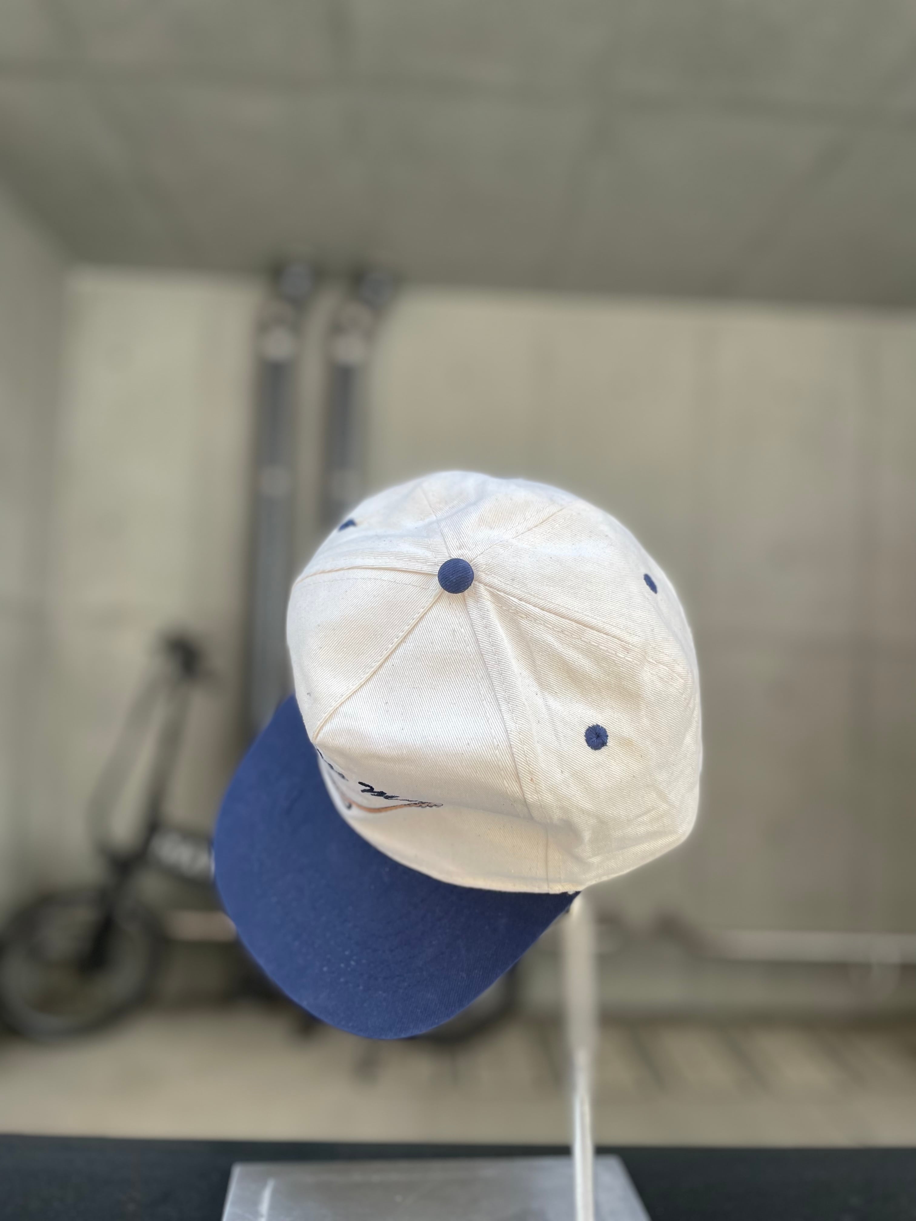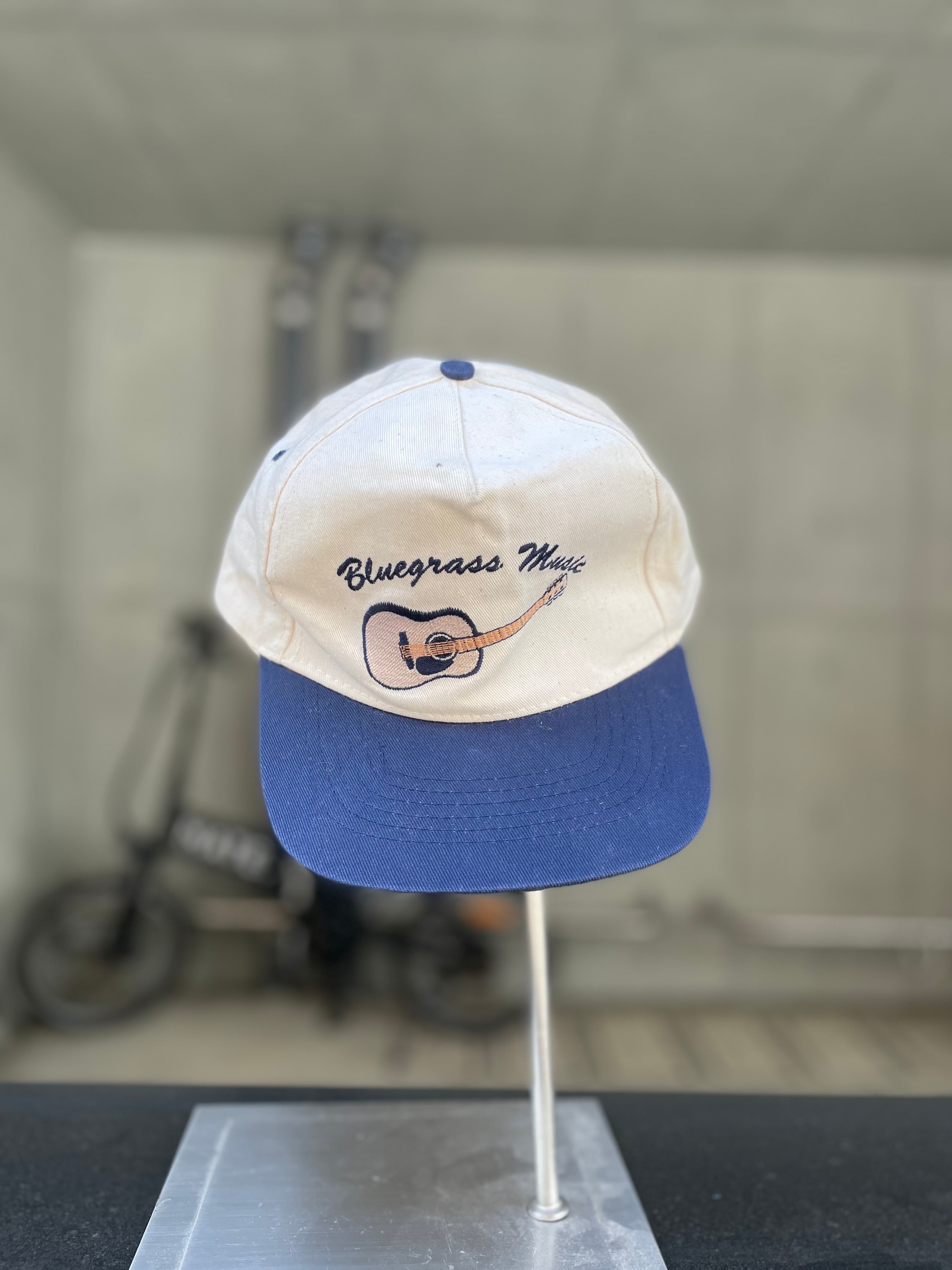 フロントに「Bluegrass Music」のロゴとギターの刺繍が施されたキャップ。ナチュラルな生成りボディにブルーのツバが爽やかなデザインです。刺繍は主張しすぎず、音楽モチーフながらも落ち着いた印象です。ベーシックなベースボールキャップ型で、デイリーに使いやすいアイテムです。