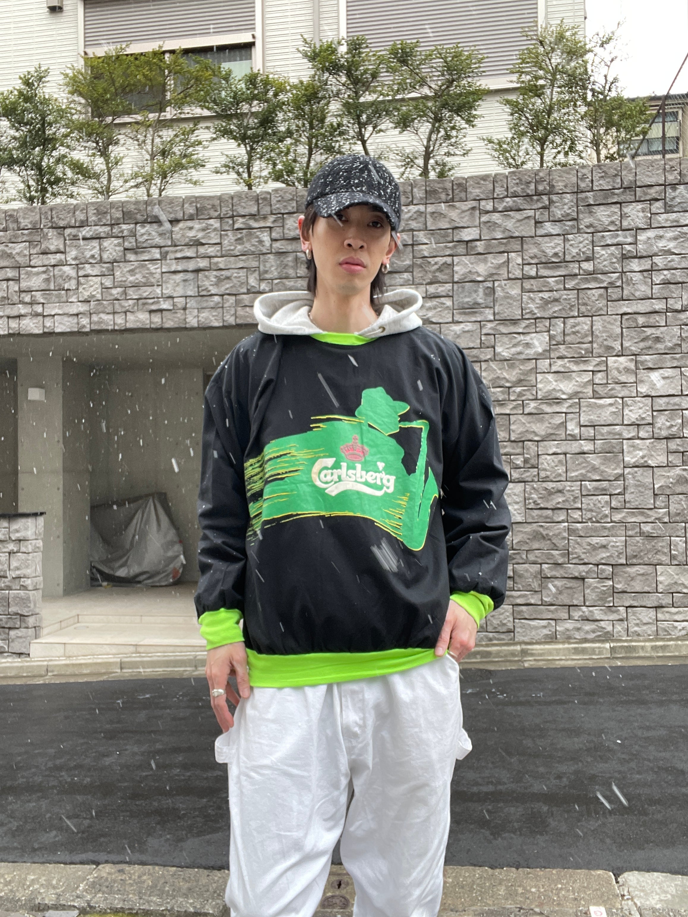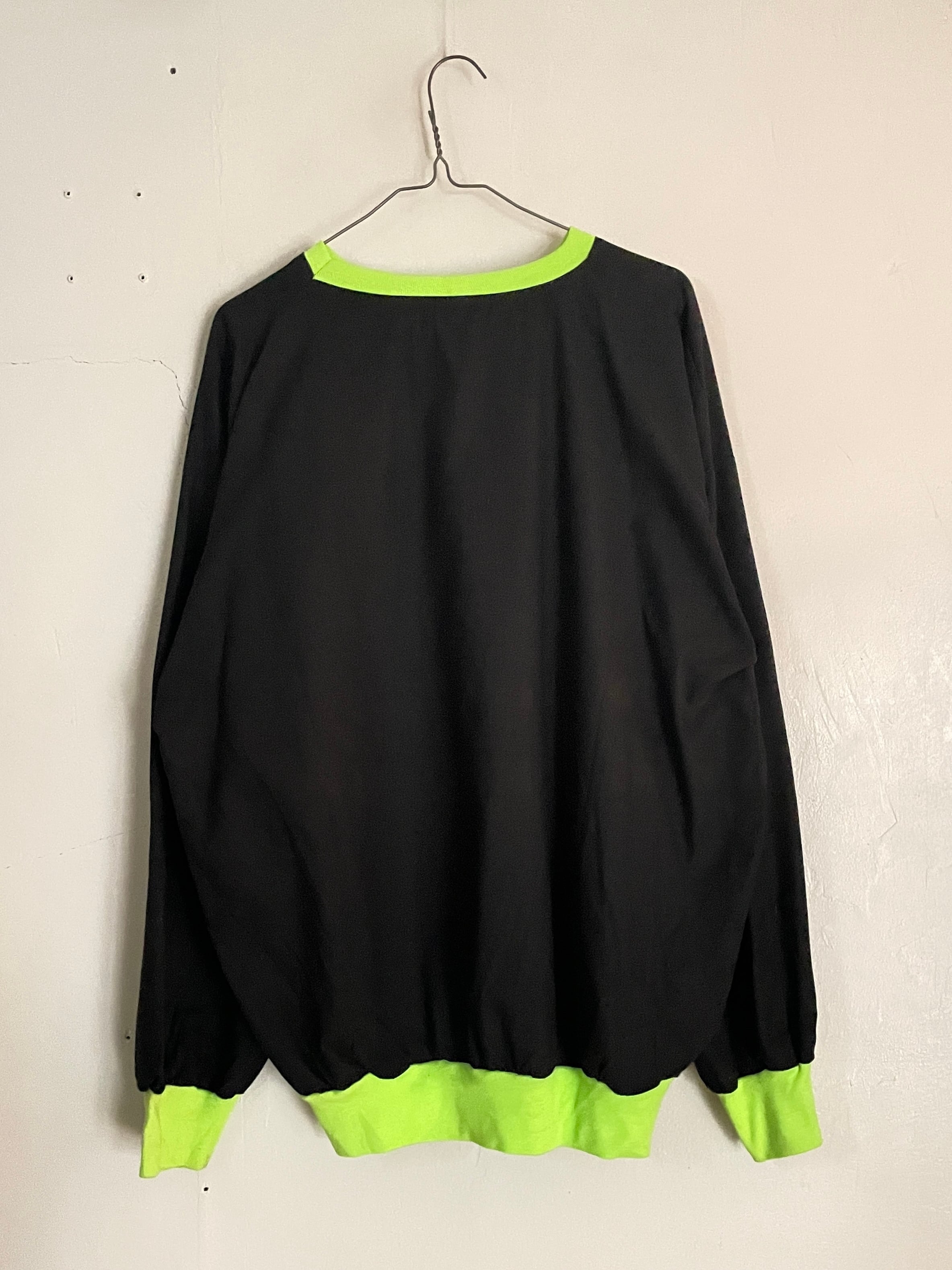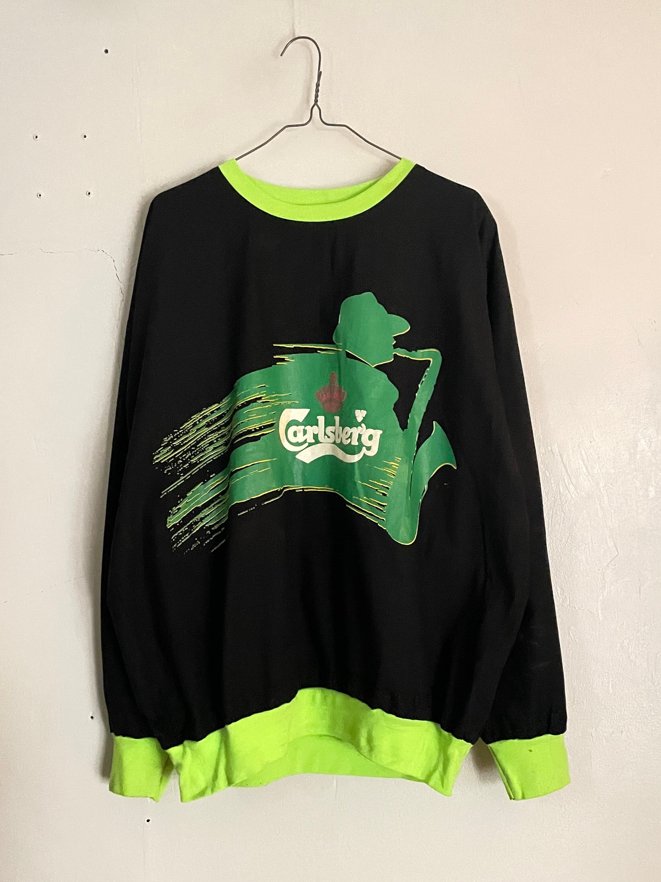 ブラックボディに、デンマーク発祥のビールブランド”カールスバーグ”のプリントが施された、プルオーバートップス。明るめなグリーンのプリントで、ポップでお洒落なデザイン。ネック、袖口、裾は蛍光グリーンの切り替え。全体の色使いが抜群で、ありそうでない珍しい一着かと思います。ゆったりとしたサイズ感で、ラフに着られるのも魅力的です。春には一枚で、今の時期にはインナーとしても活躍してくれるアイテムです。