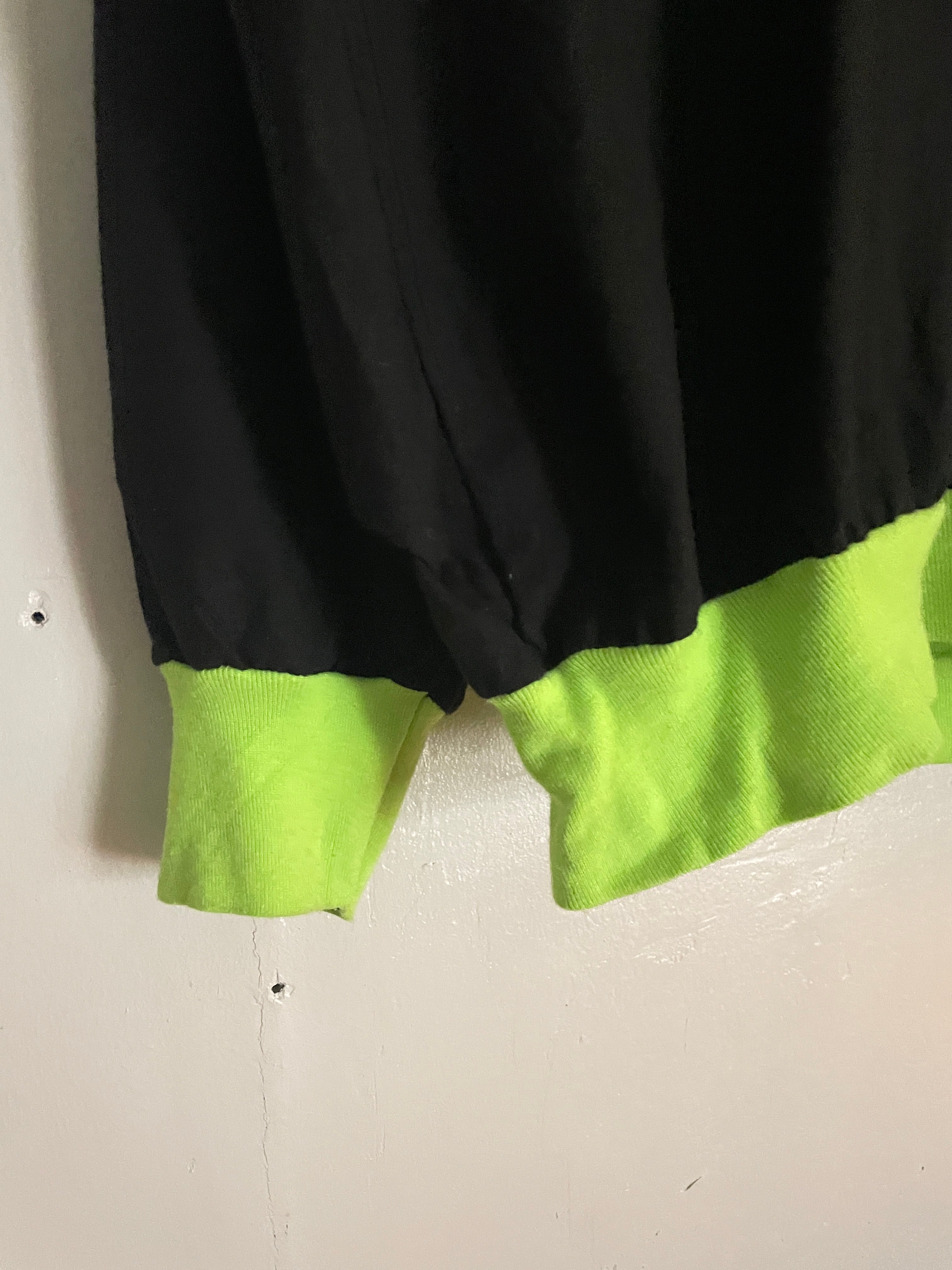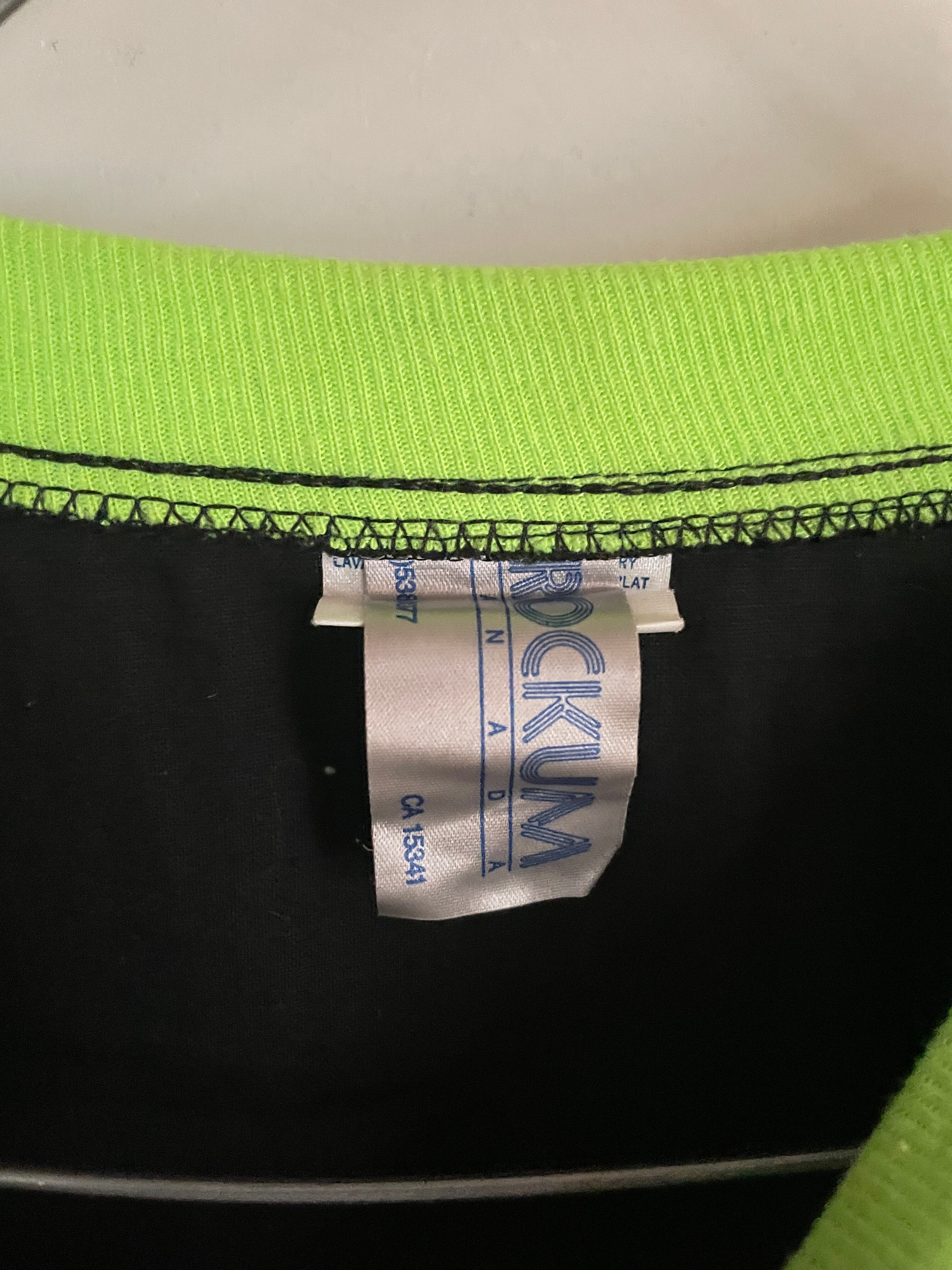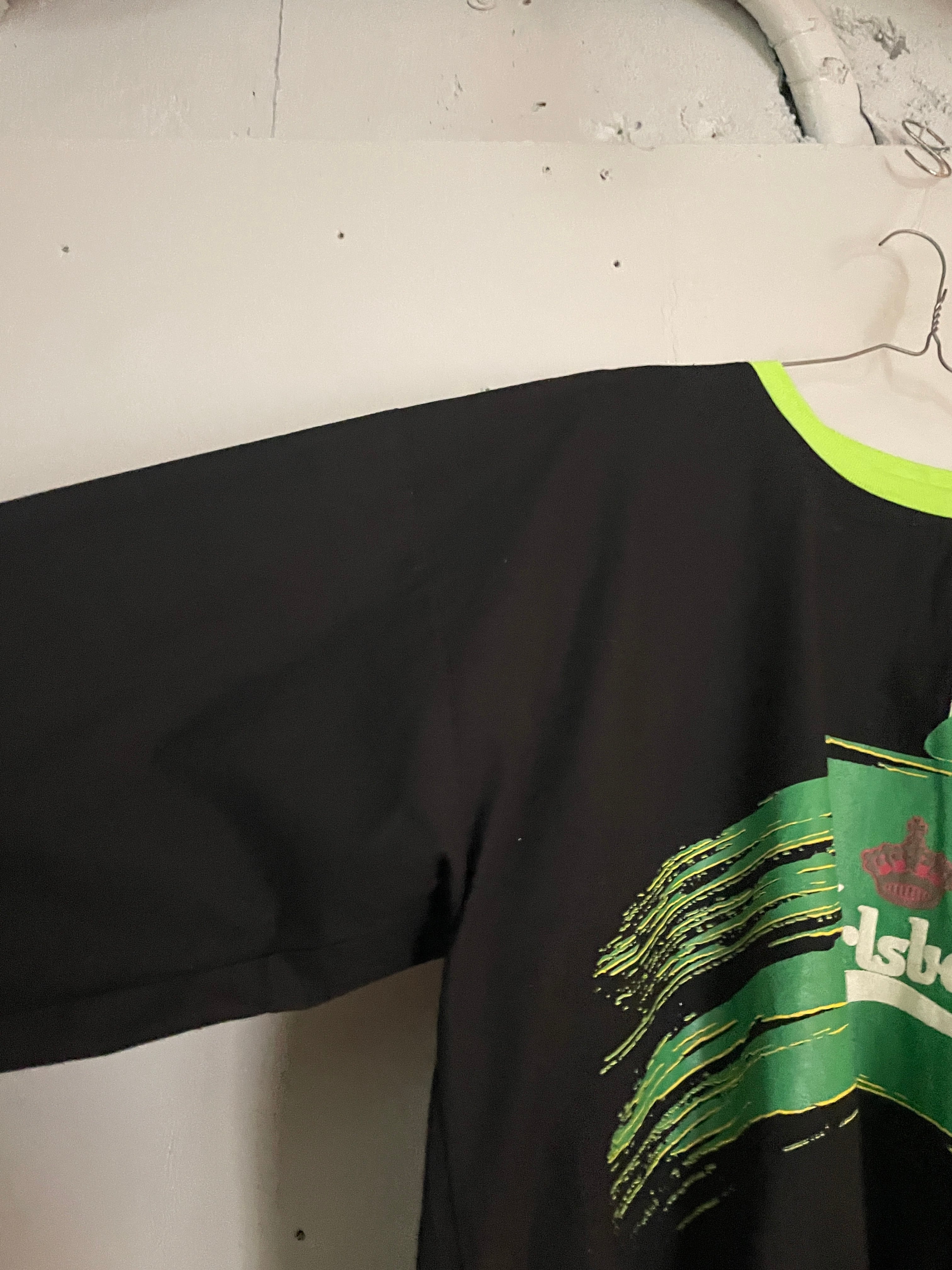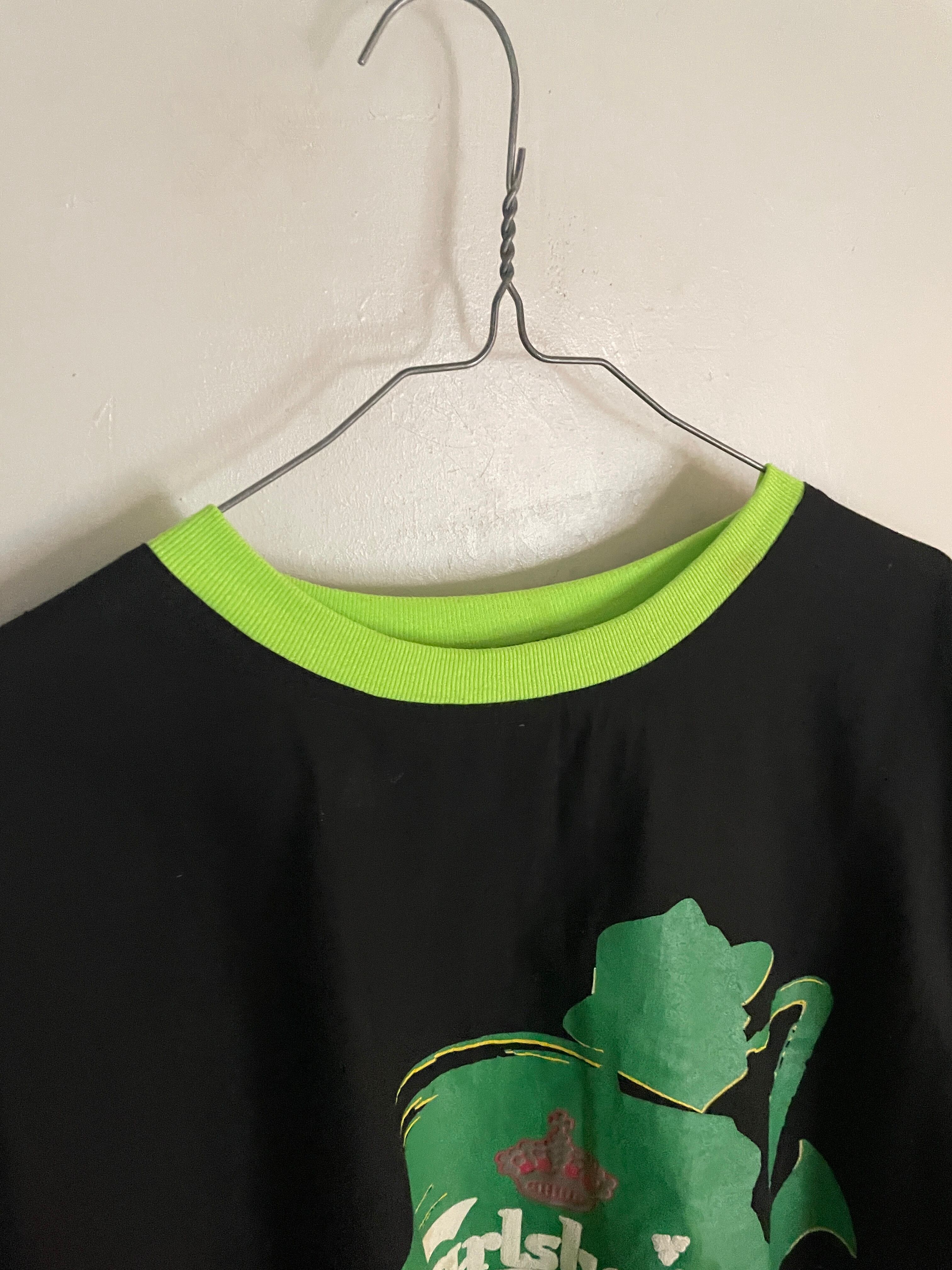 ブラックボディに、デンマーク発祥のビールブランド”カールスバーグ”のプリントが施された、プルオーバートップス。明るめなグリーンのプリントで、ポップでお洒落なデザイン。ネック、袖口、裾は蛍光グリーンの切り替え。全体の色使いが抜群で、ありそうでない珍しい一着かと思います。ゆったりとしたサイズ感で、ラフに着られるのも魅力的です。春には一枚で、今の時期にはインナーとしても活躍してくれるアイテムです。