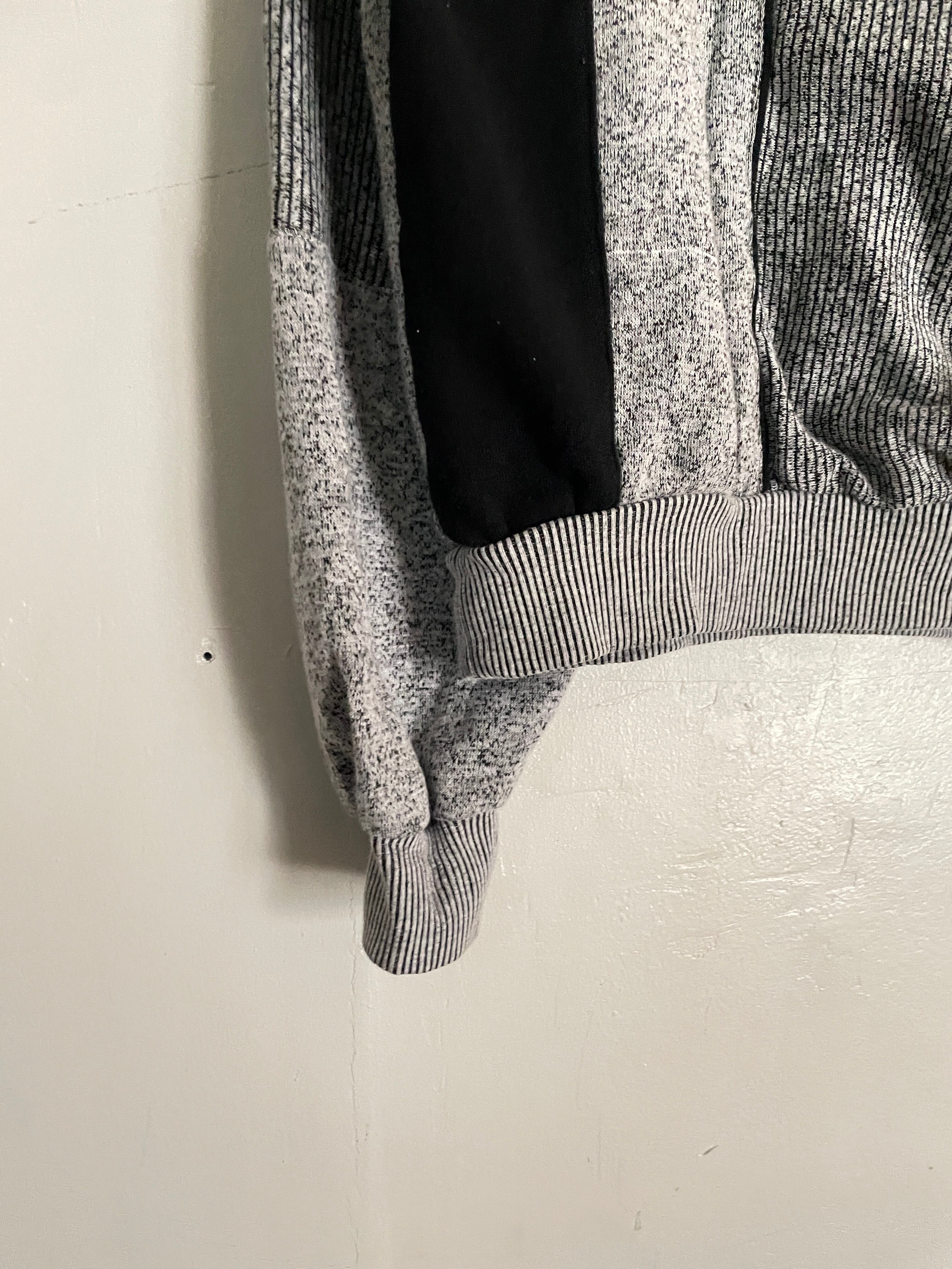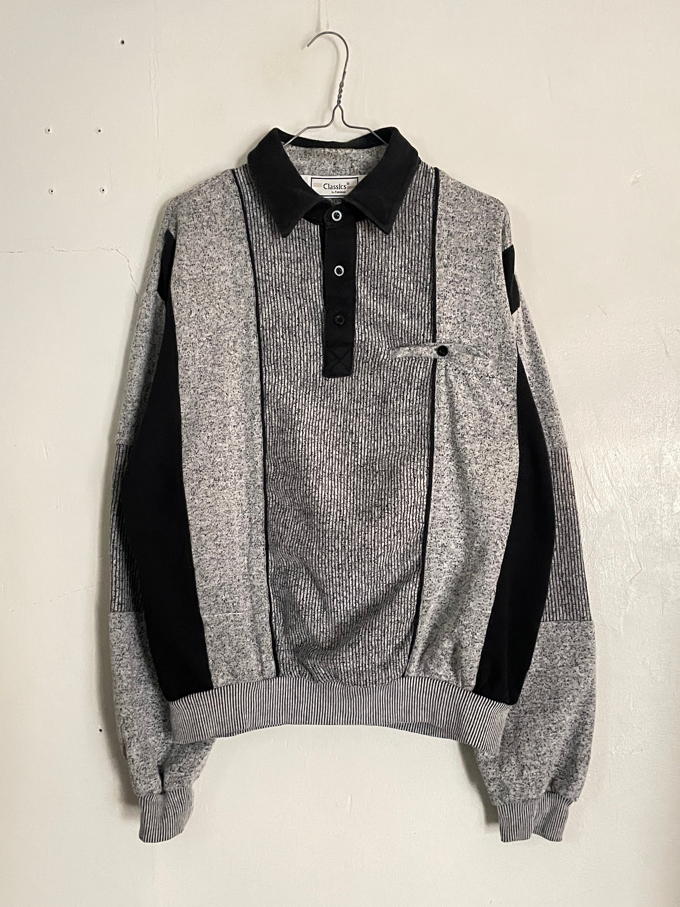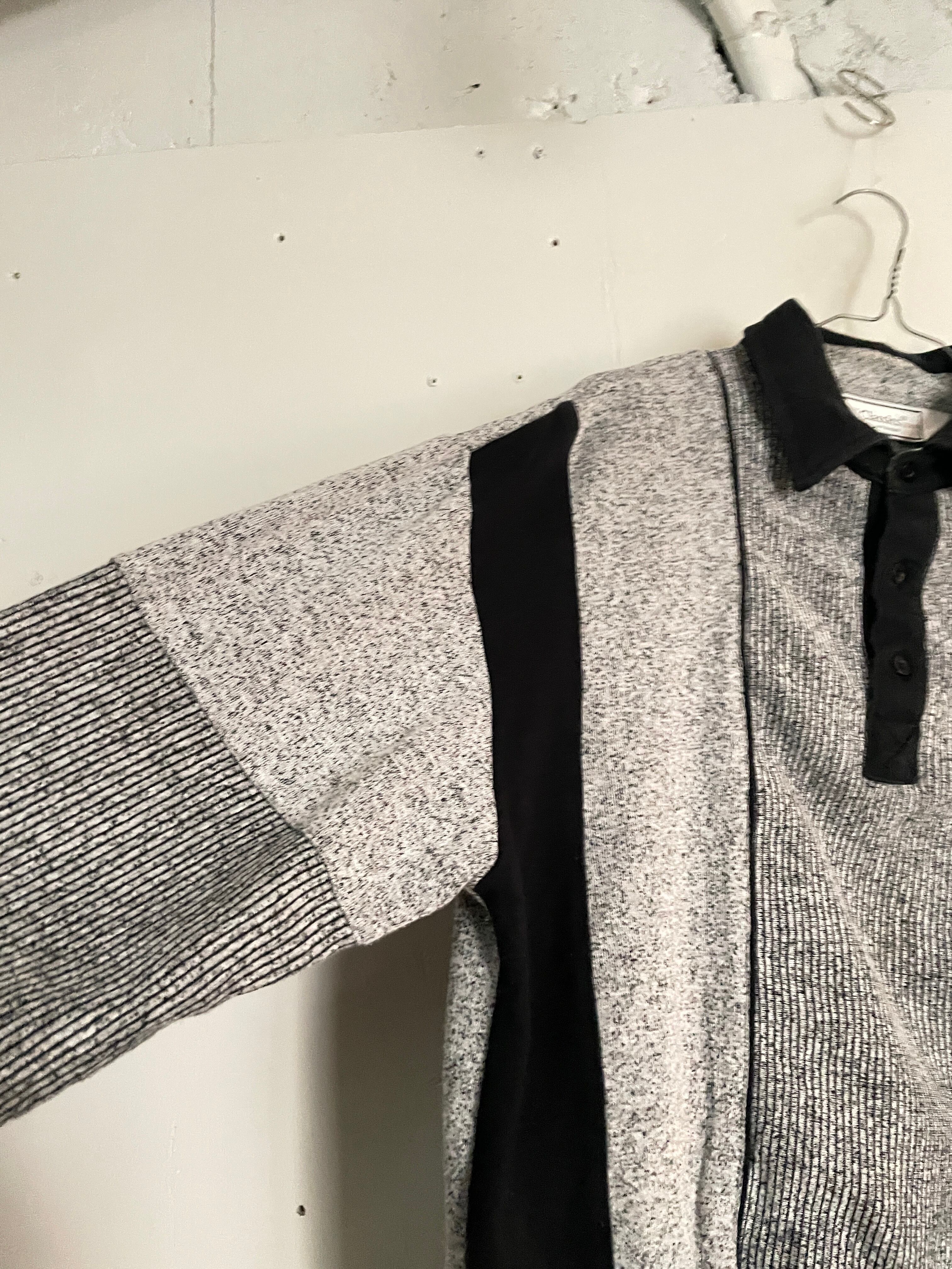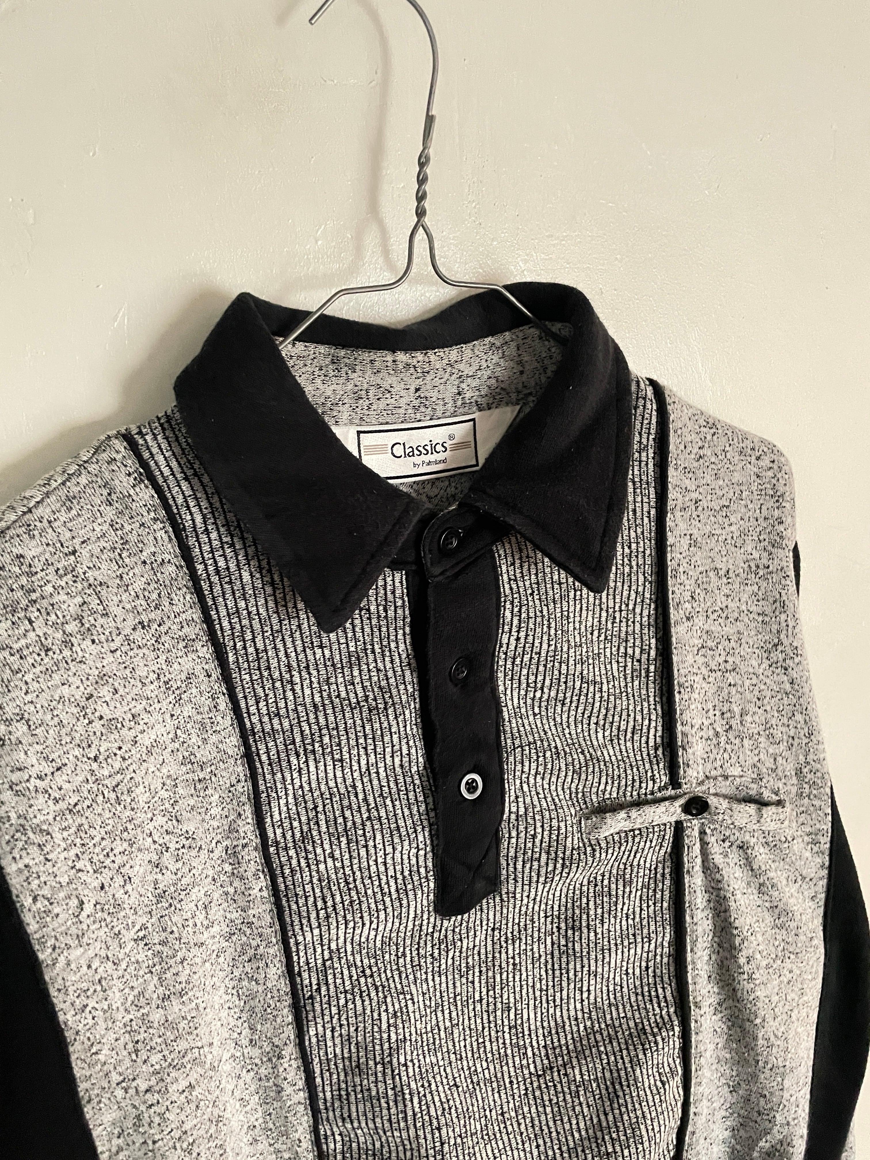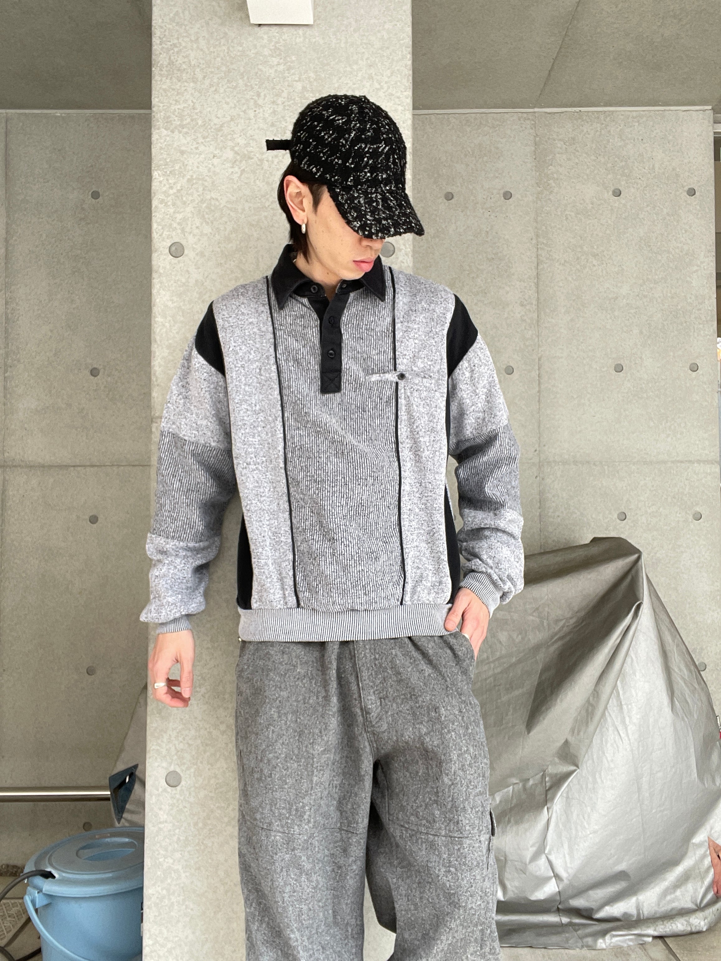 グレーとブラック、霜降りボディで、切り替えデザインが施されたポロスウェット。落ち着いた配色デザインで、使い勝手の良さそうな一着。リブの締まりがしっかりしているので、収まりが良く、綺麗なシルエットを作ってくれます。細かな部分にこだわりが感じられる一着です。ゆったりめなサイズ感なので、ラフに着られるのも魅力的です。