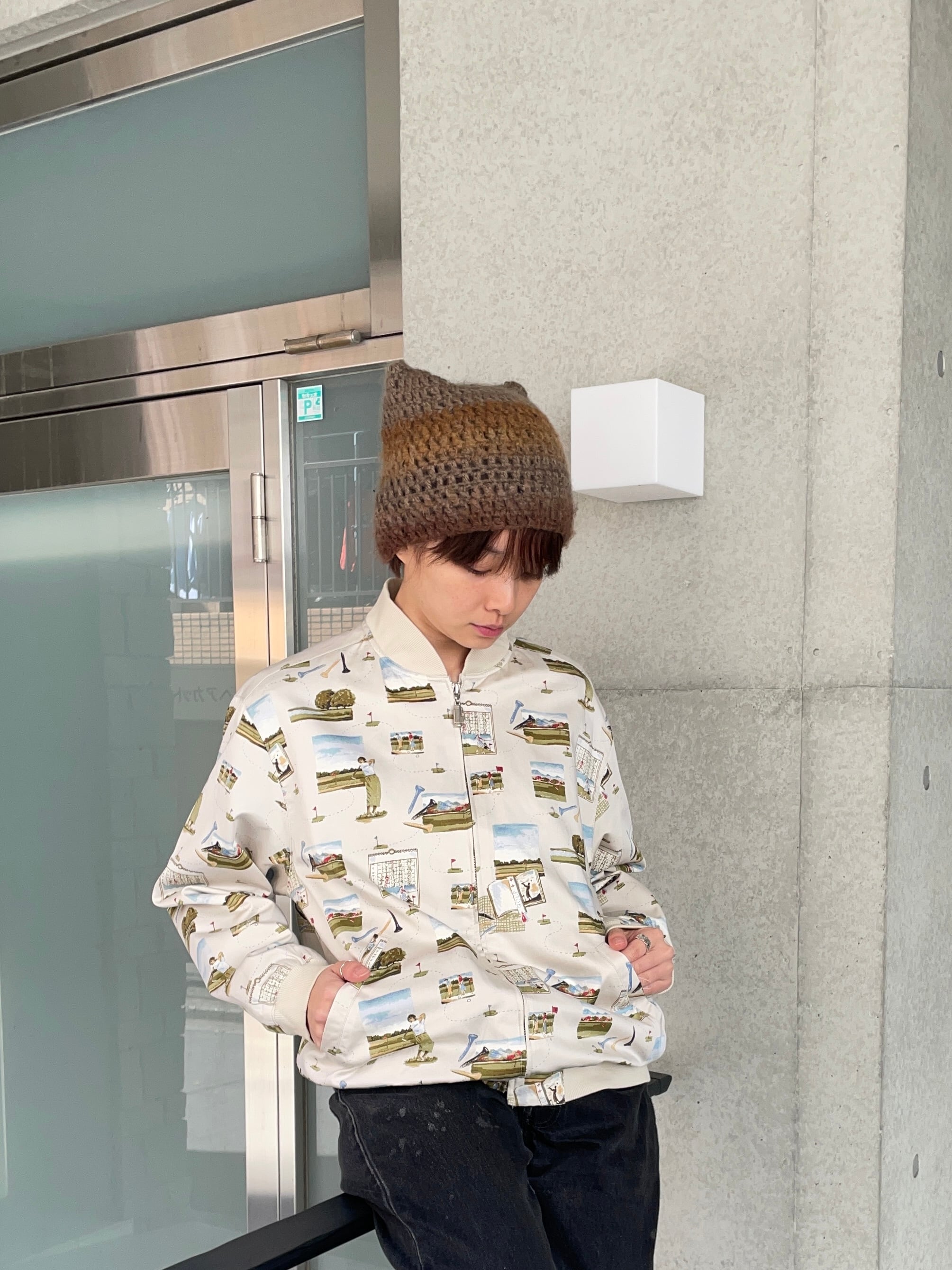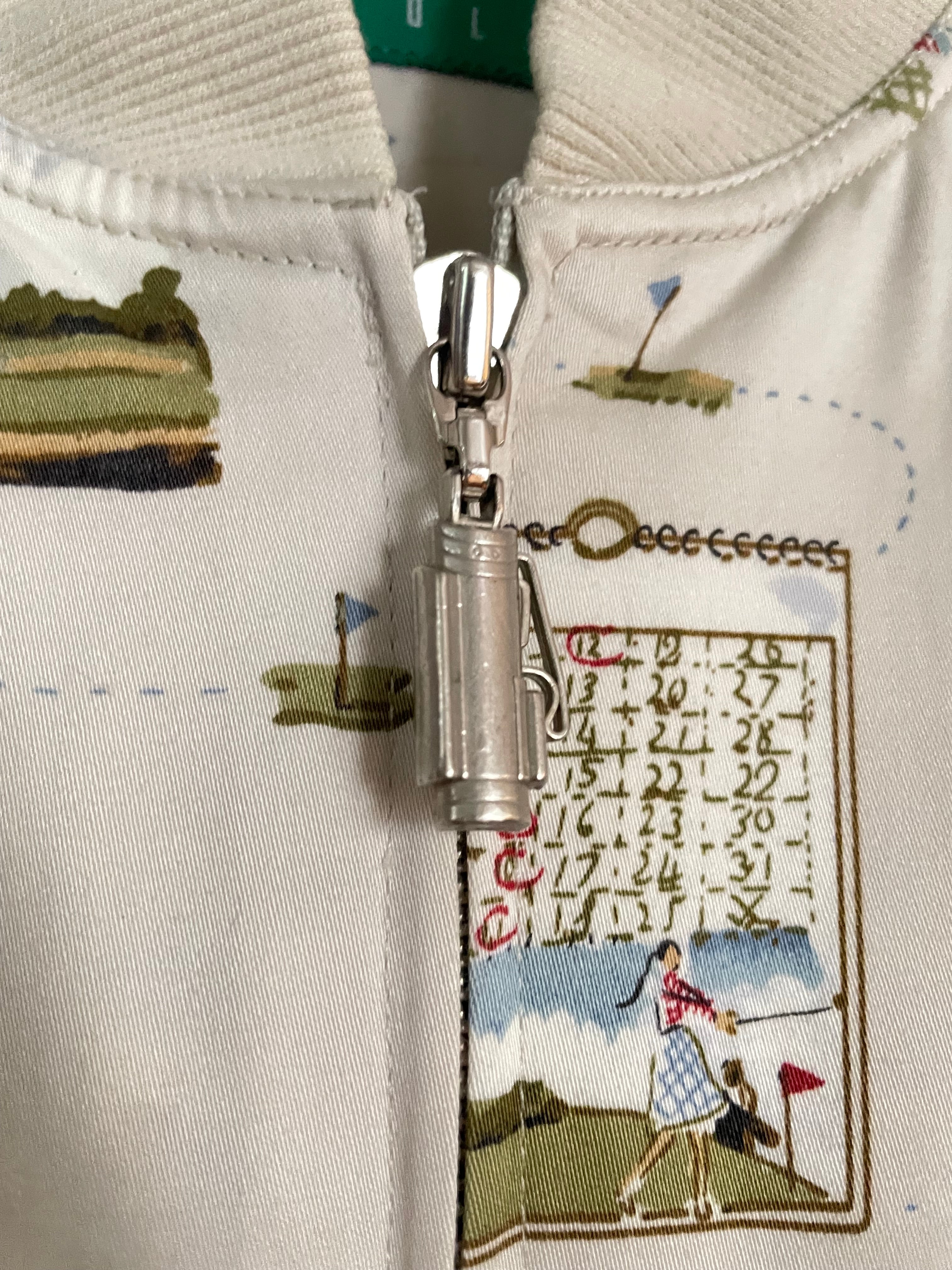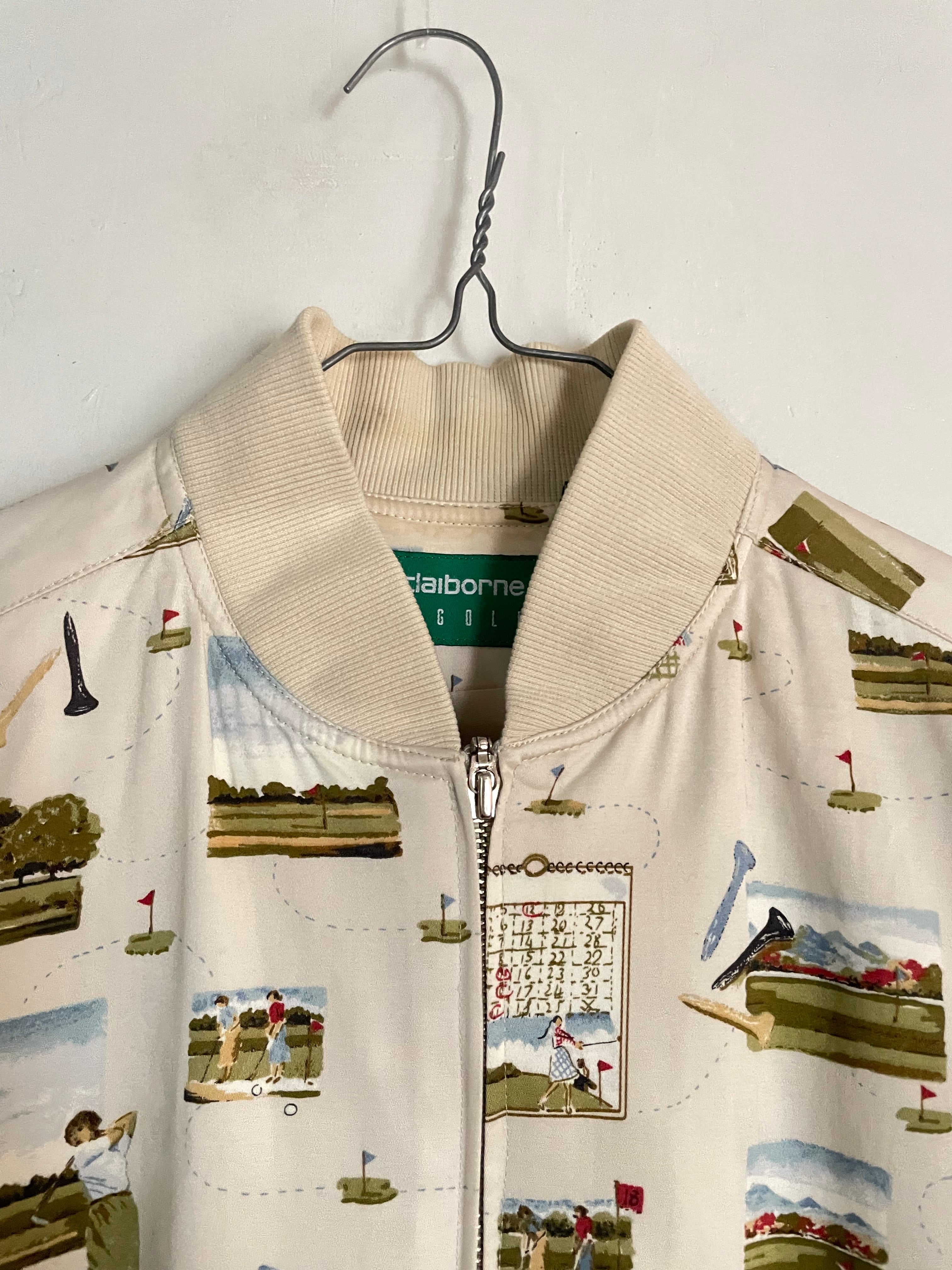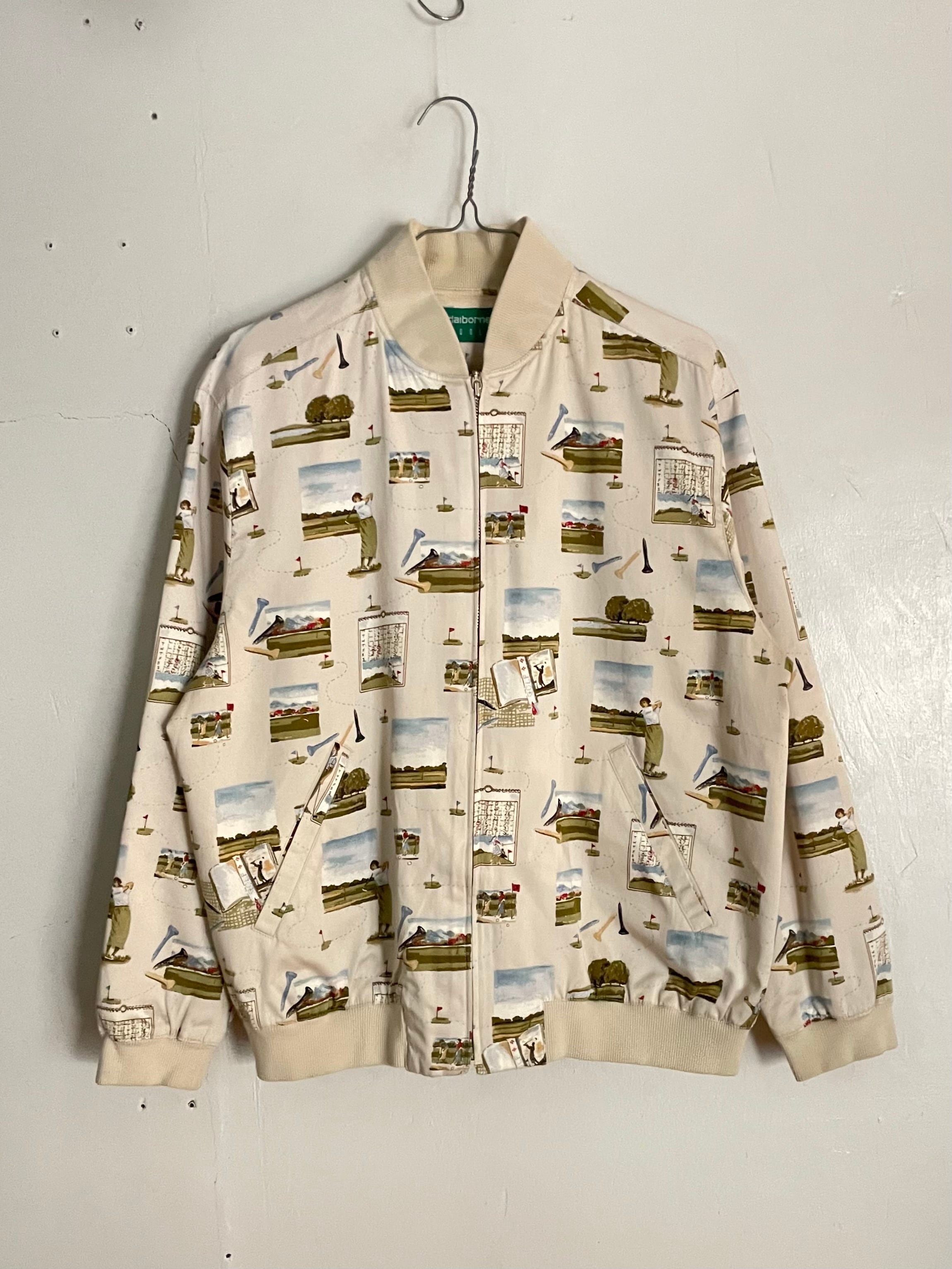 ゴルフモチーフが全面にプリントされた、遊び心たっぷりのジップアップブルゾン。コース風景やスコアカード、ゴルファーのイラストが散りばめられた総柄デザインで、優しいタッチが魅力です。アイボリー系のベースカラーに、落ち着いたグリーンやブルーが使われているので、総柄ながら主張しすぎずコーデに馴染みやすい一着です。