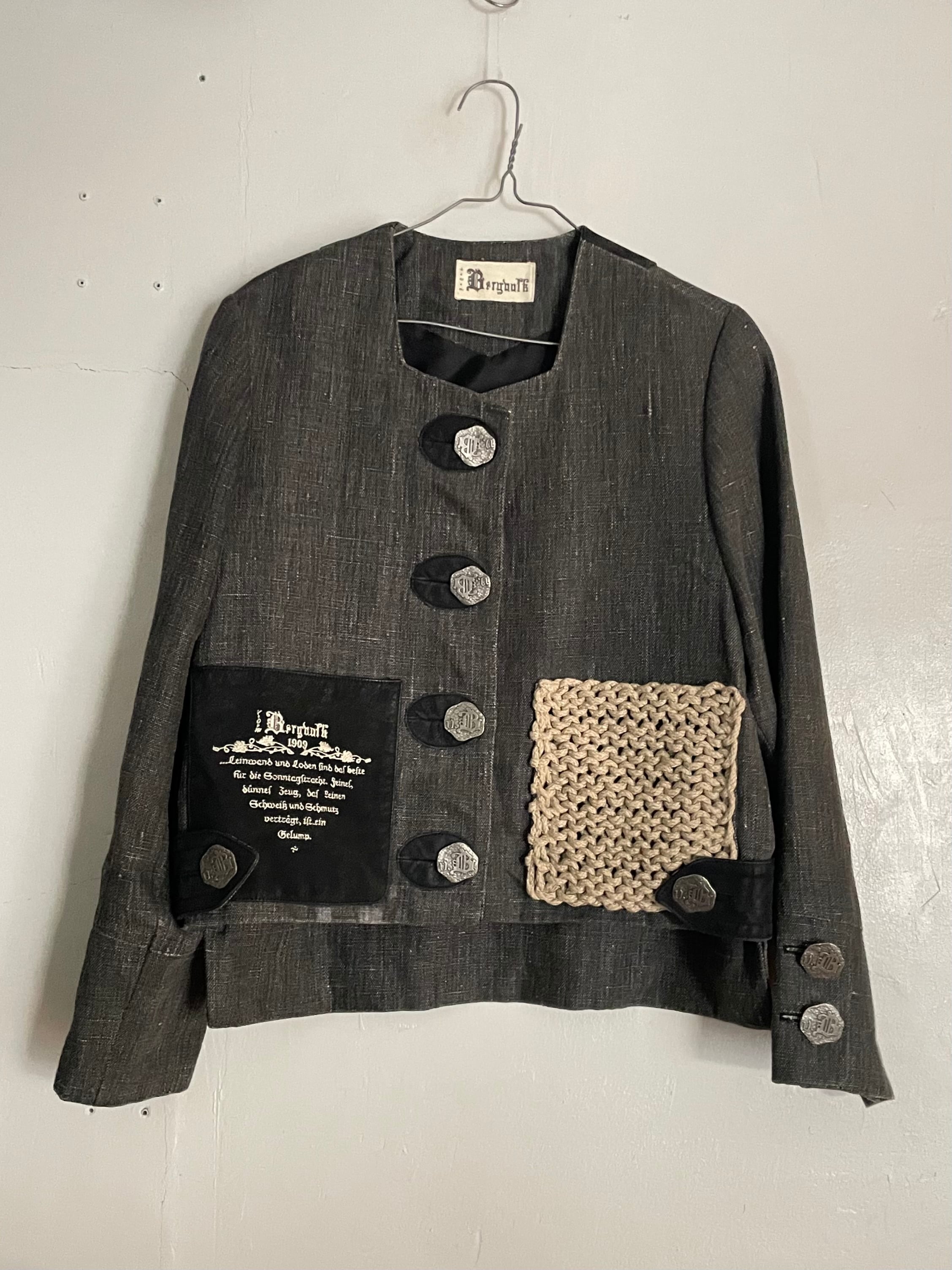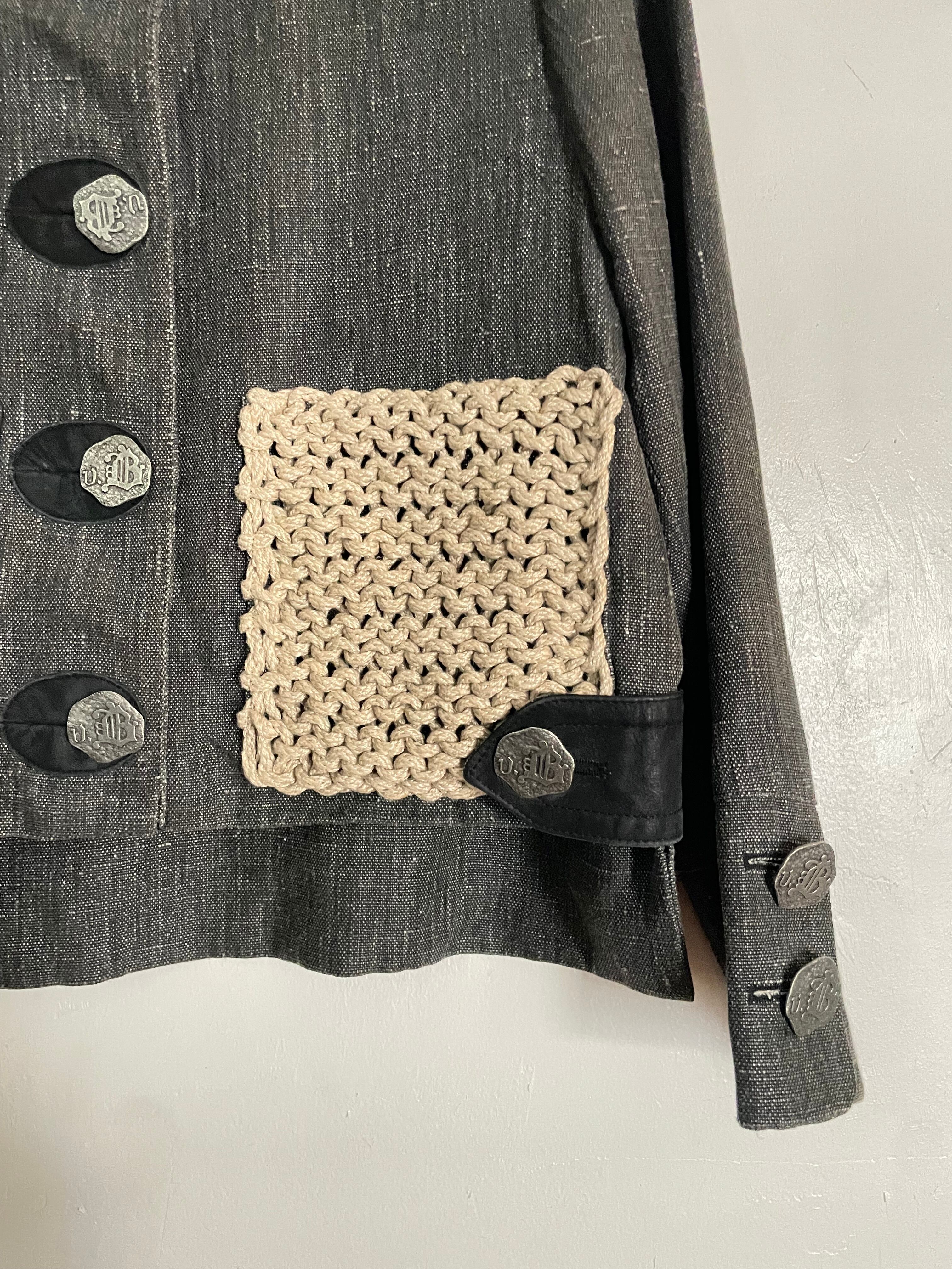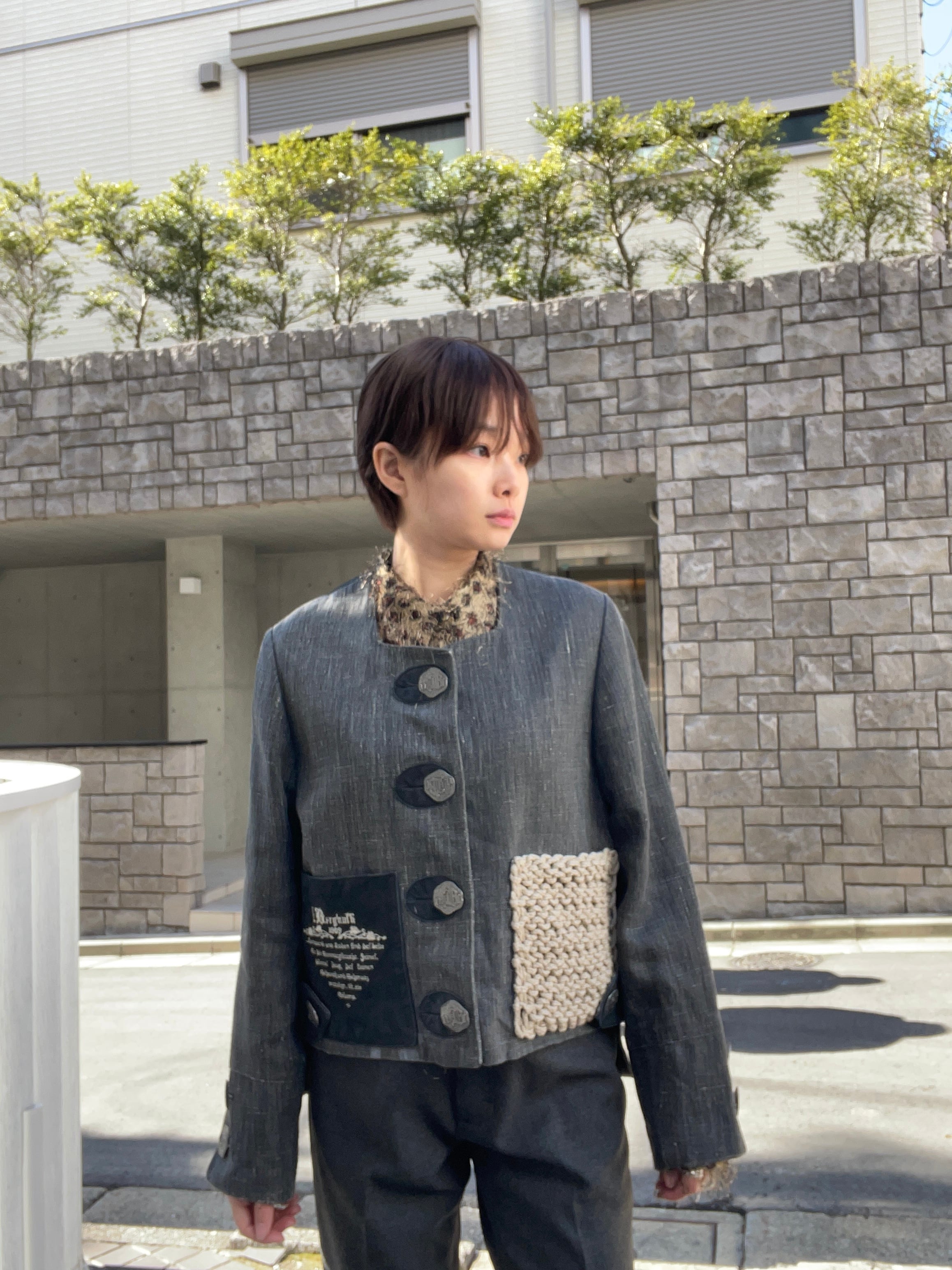 異素材の組み合わせが個性的なデザインジャケット。メタル調のボタンとコントラストの効いたポケットディテールが目を引く一着です。首元はノーカラー仕様ですっきりとしていて、程よくコンパクトな丈感で主役級のアイテム。左側には刺繍入りのレザーポケット、右側には手編み風のニットポケットを配置し、クラフト感とアート性を感じるデザインです。