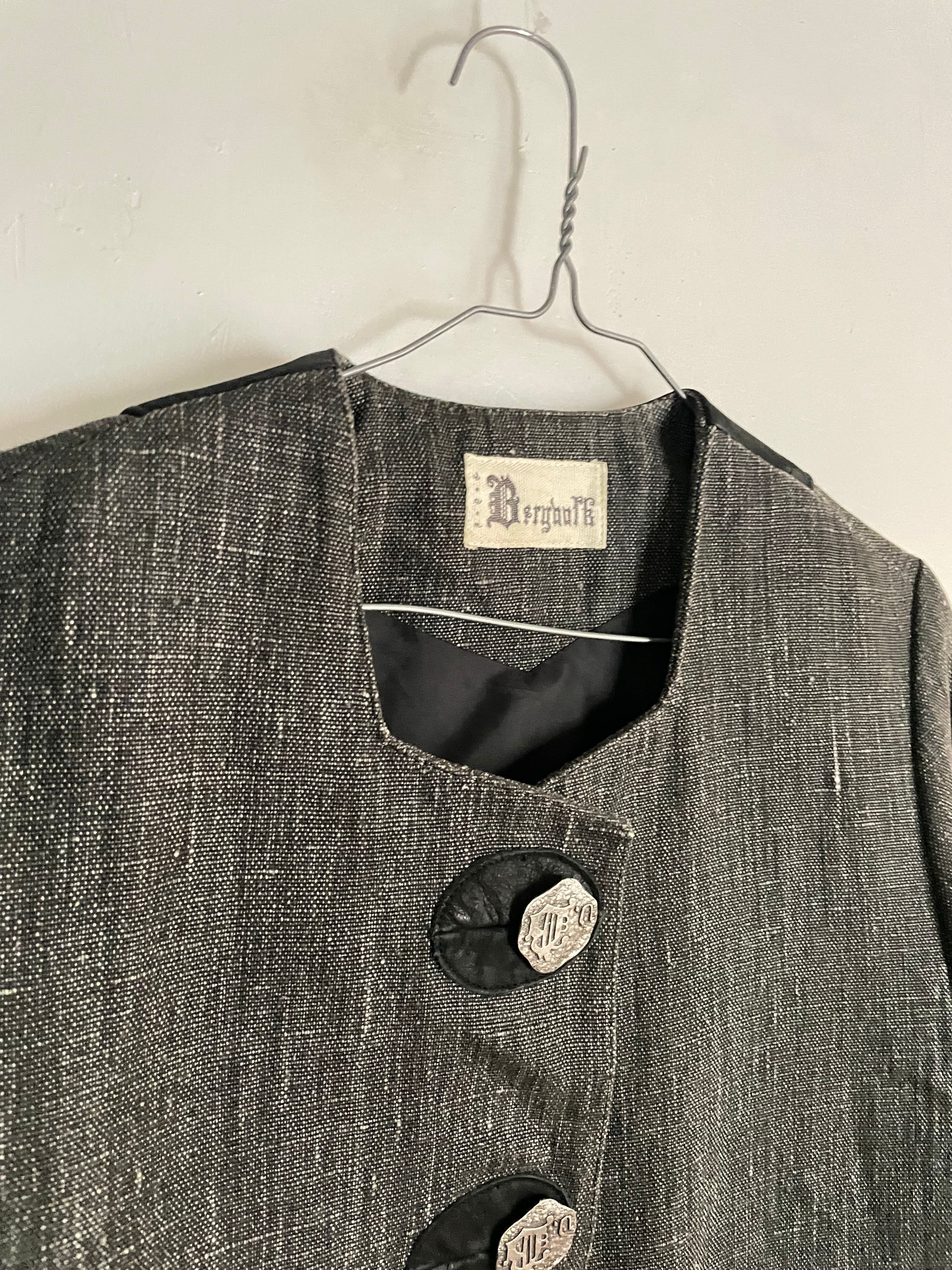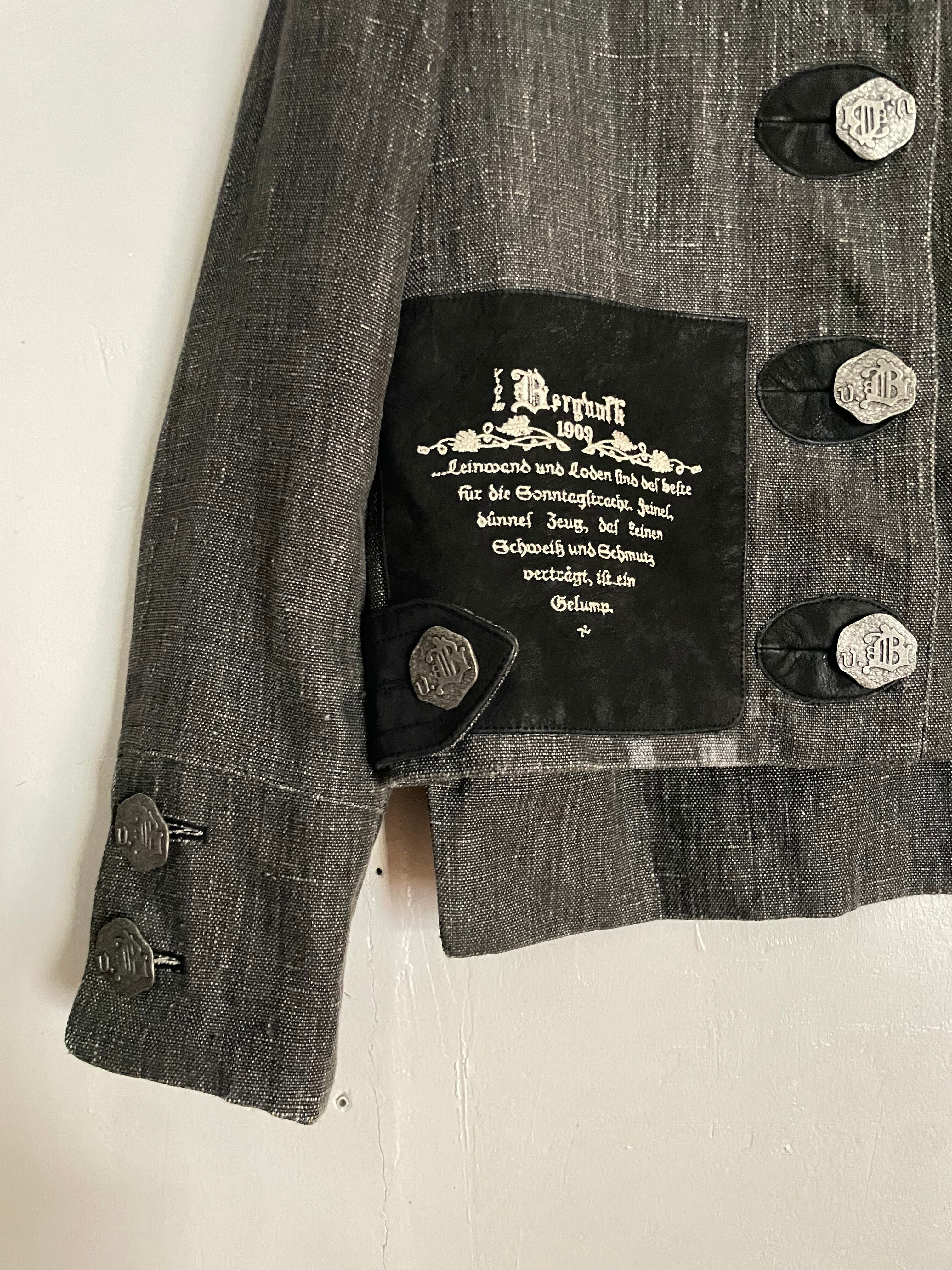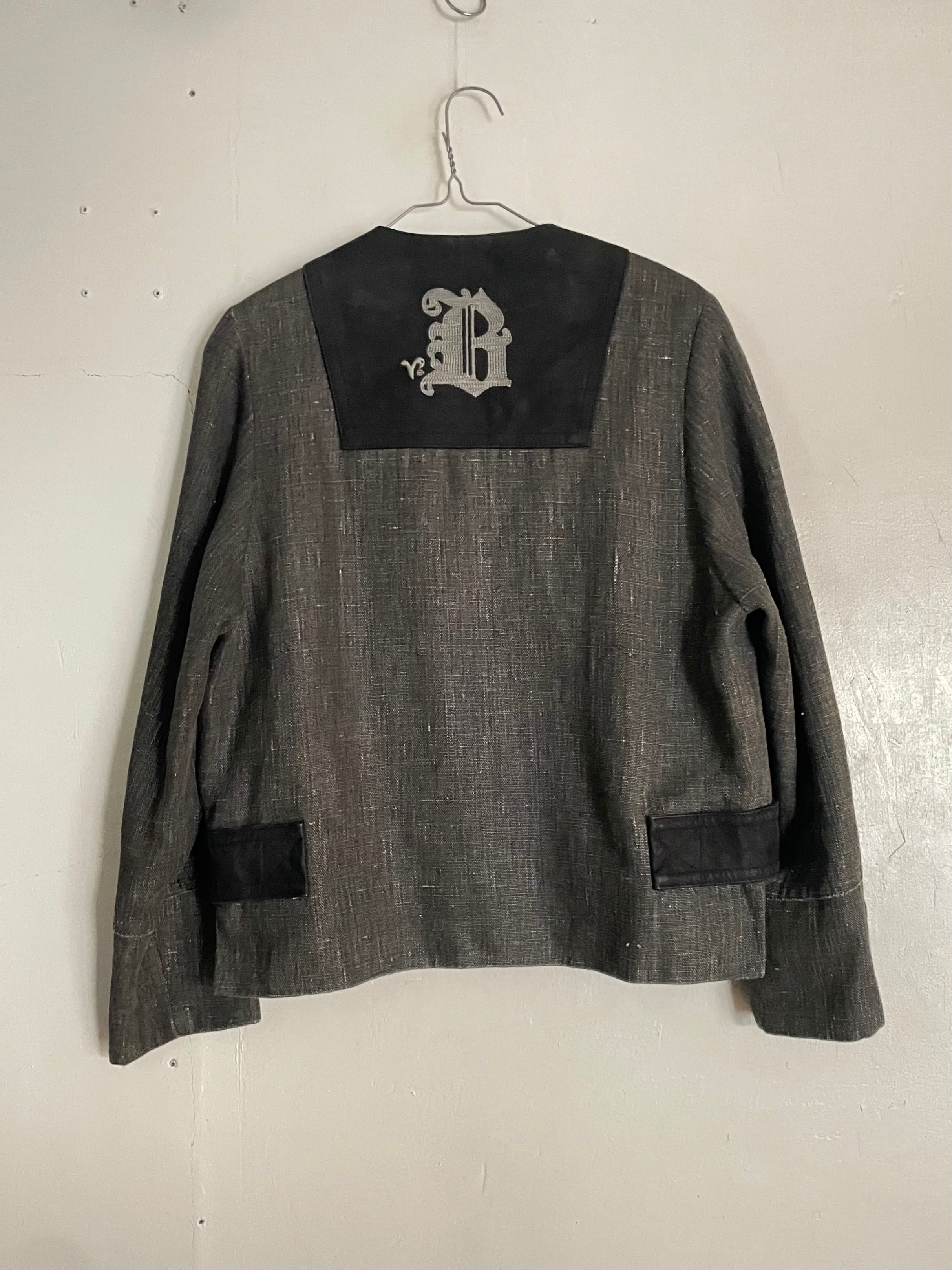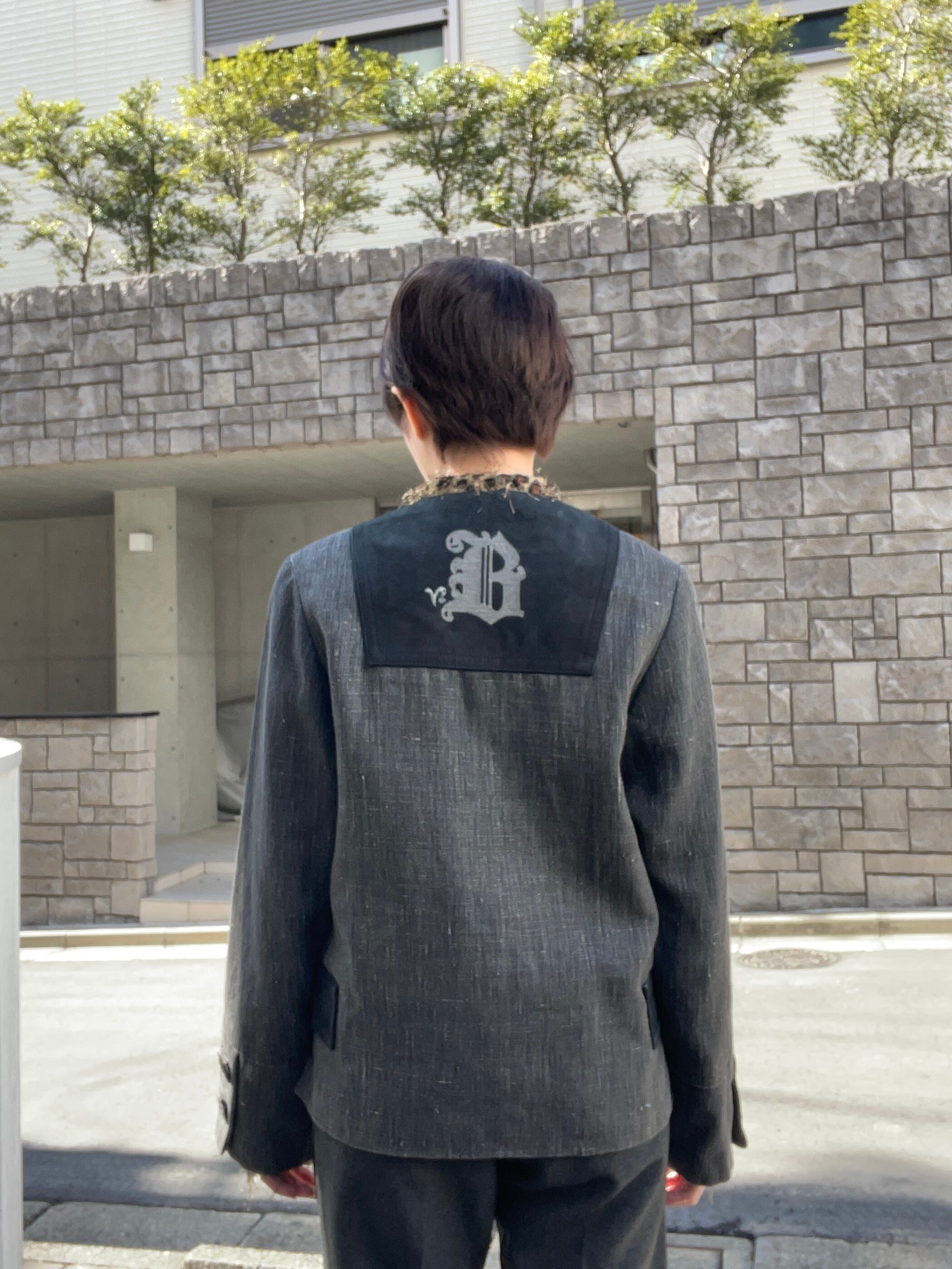 異素材の組み合わせが個性的なデザインジャケット。メタル調のボタンとコントラストの効いたポケットディテールが目を引く一着です。首元はノーカラー仕様ですっきりとしていて、程よくコンパクトな丈感で主役級のアイテム。左側には刺繍入りのレザーポケット、右側には手編み風のニットポケットを配置し、クラフト感とアート性を感じるデザインです。