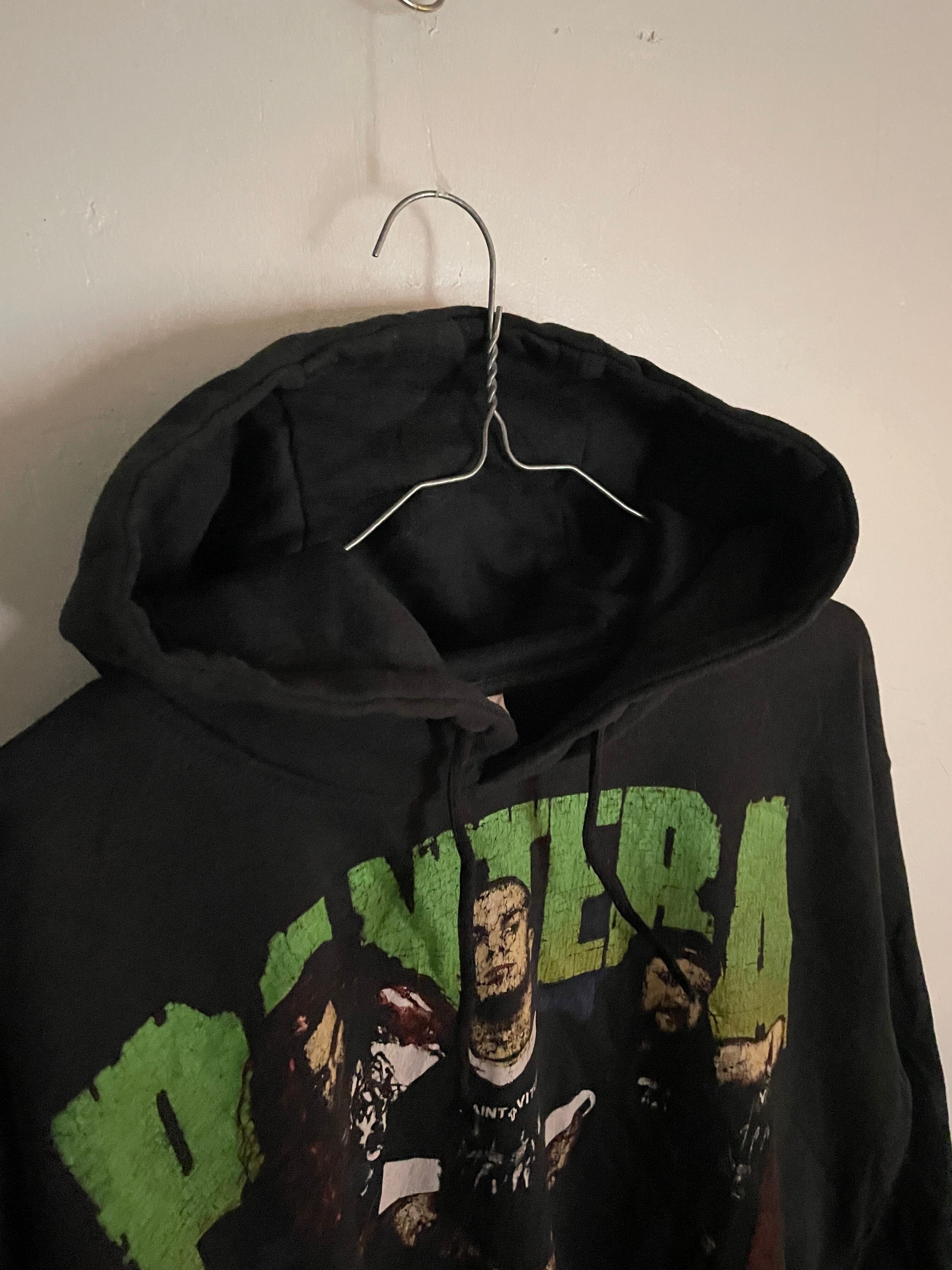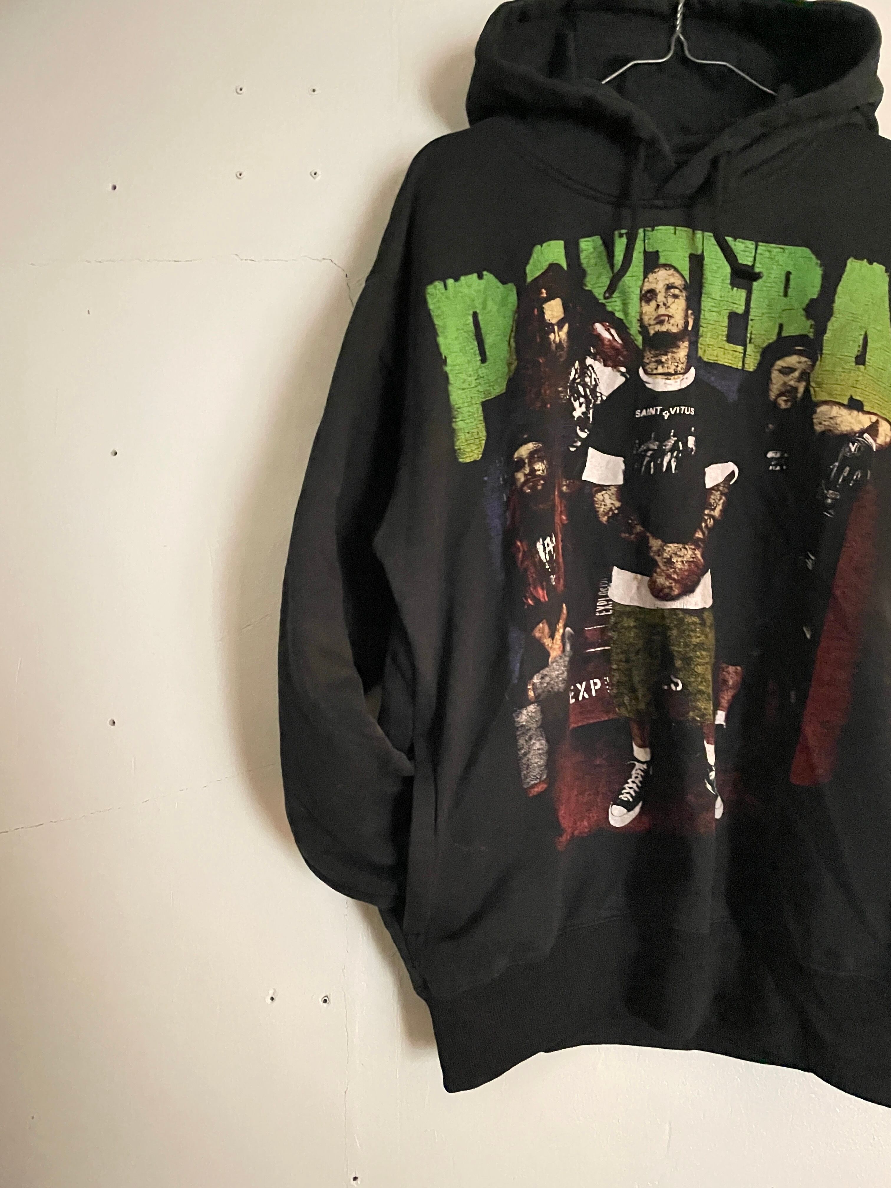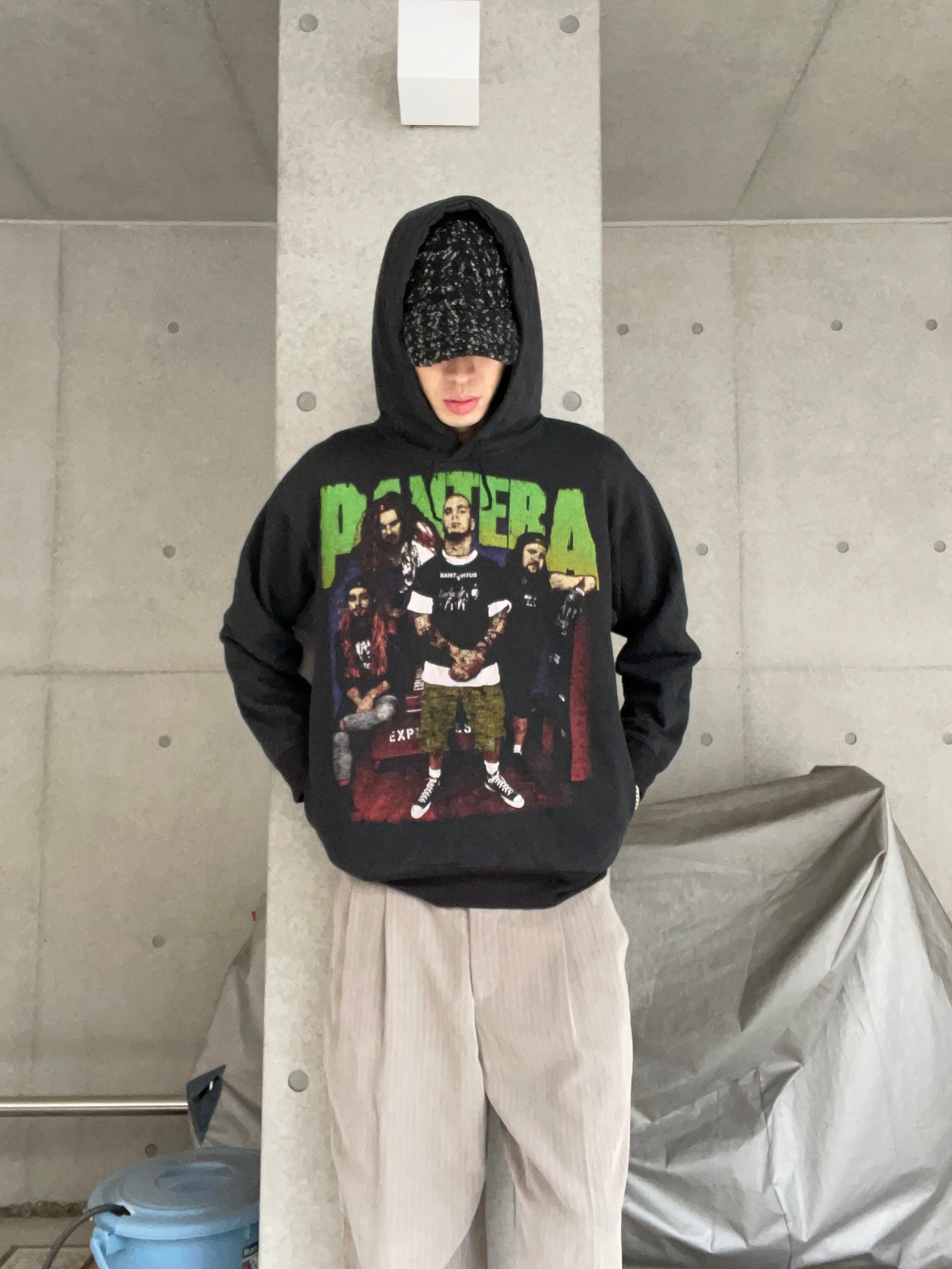 ブラックボディに、アメリカのヘヴィメタルバンド”パンテラ”のグラフィックプリントが施されたパーカー。フロントには大きく、ネオングリーンのバンドロゴと共に、かっこいいメンバーのフォトプリント。文句なしでクールなデザイン。バックにもパンテラのネームプリントが施されています。バンドパーカーは、年々数が減ってきているので、かなり希少かと思います。大き過ぎず、小さ過ぎないサイズ感なので、男女共におすすめしたい一着です。