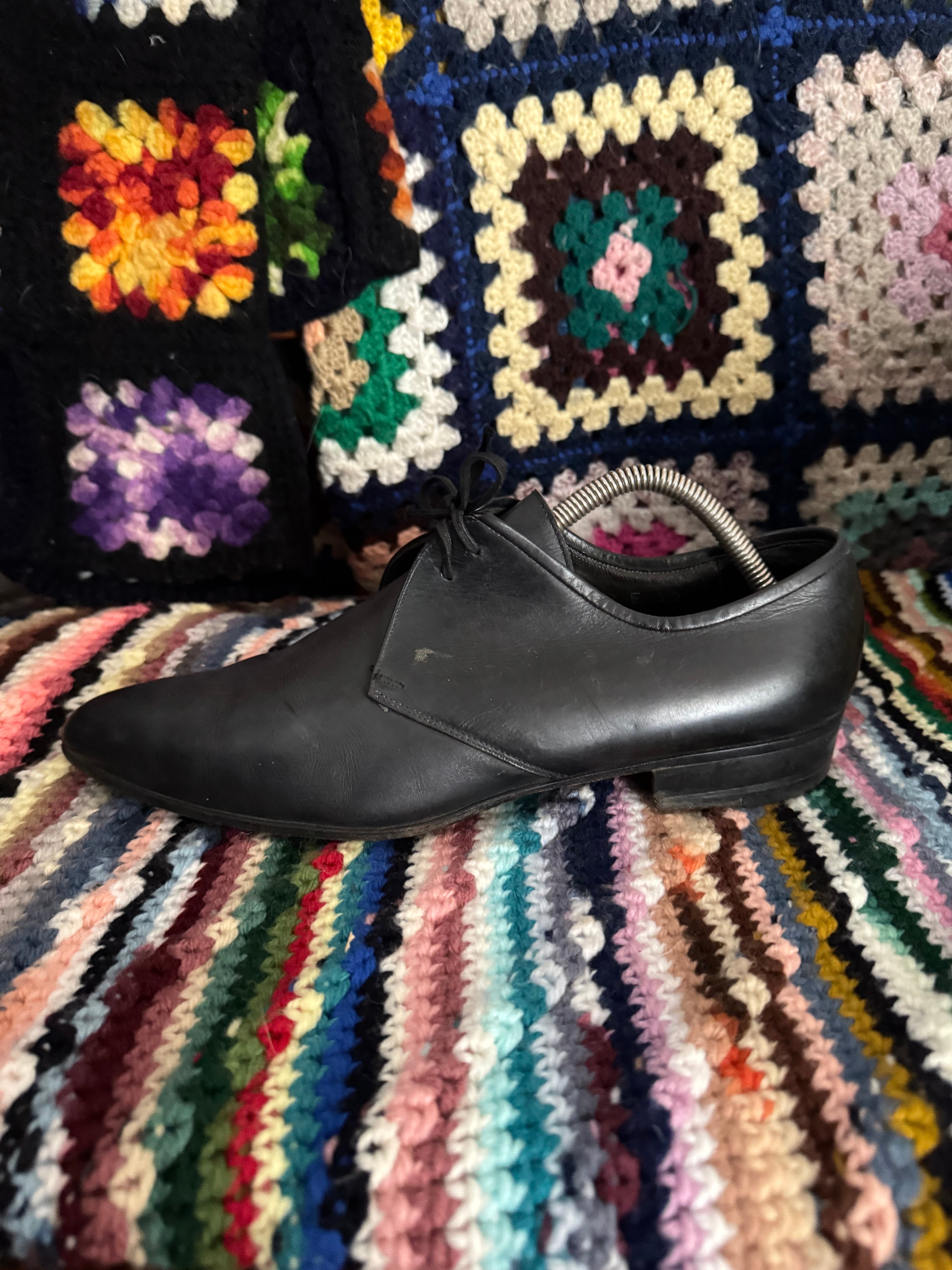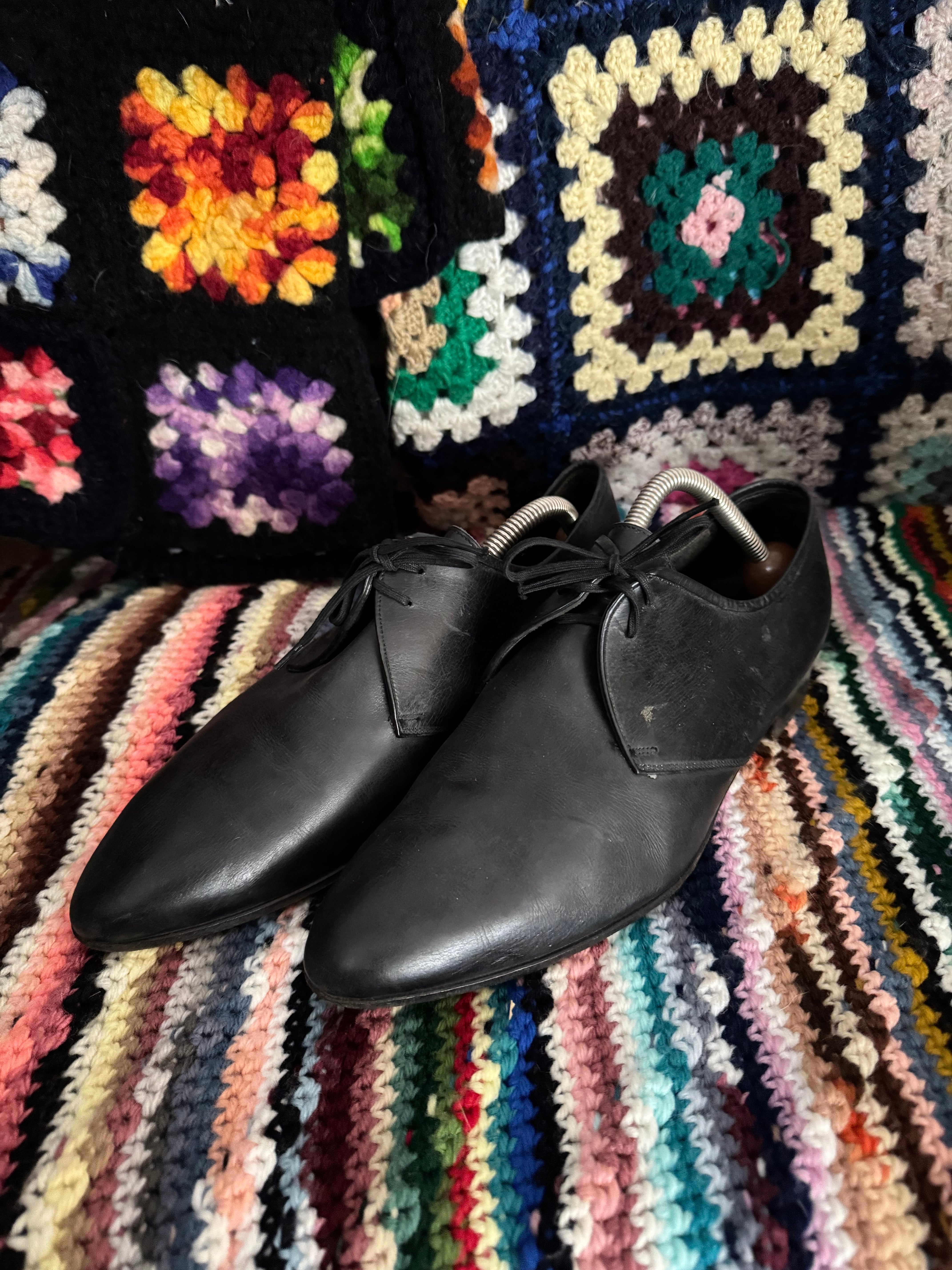 上質なブラックレザーを使用したプレーントゥのダービーシューズ。無駄のないミニマルなデザインで、シャープなラストが足元をすっきりと演出します。ドレススタイルはもちろん、ワイドパンツやデニムと合わせた抜け感のあるスタイリングにも。程良い使用感があり、革の表情を楽しめる一足です。