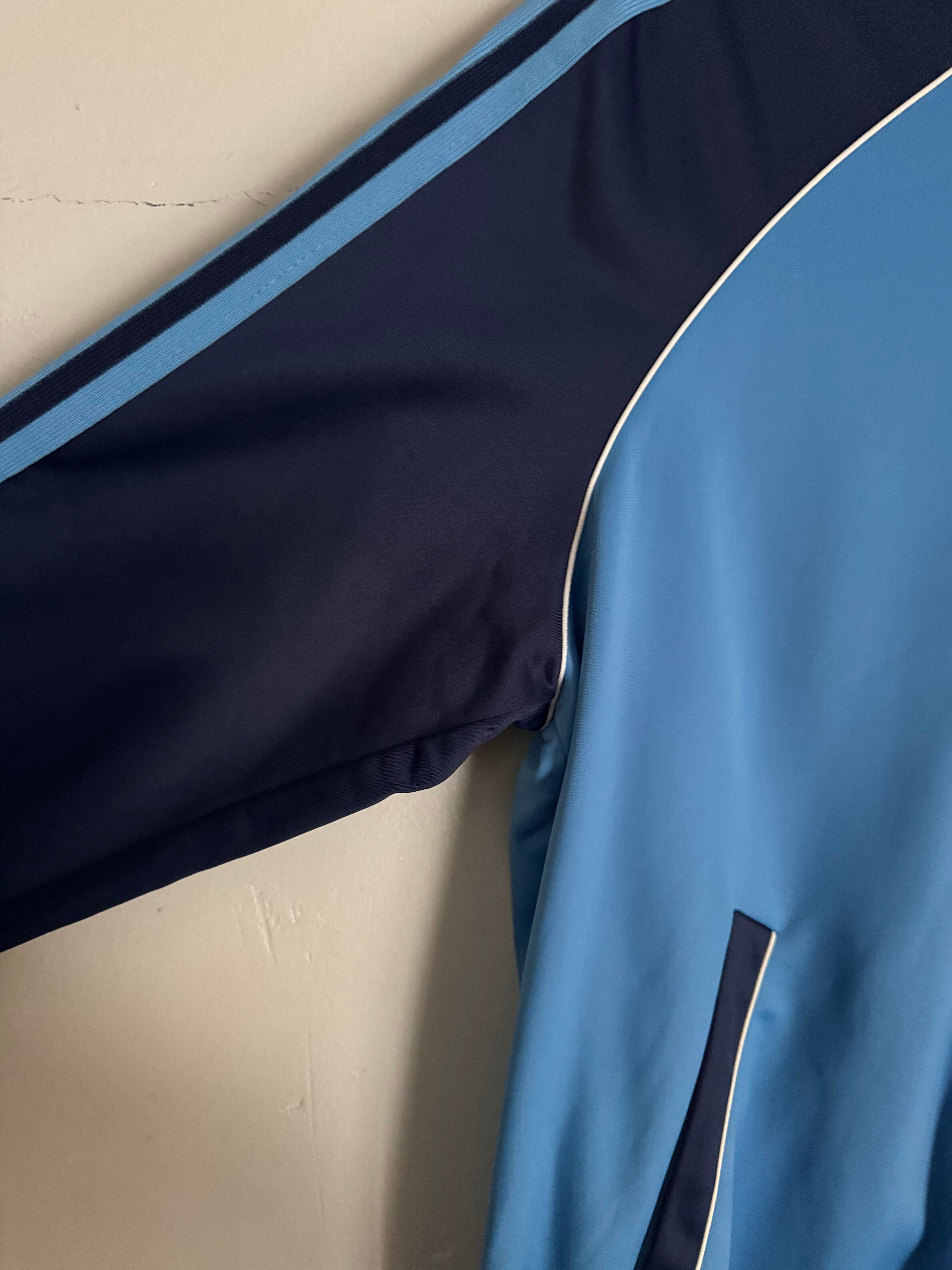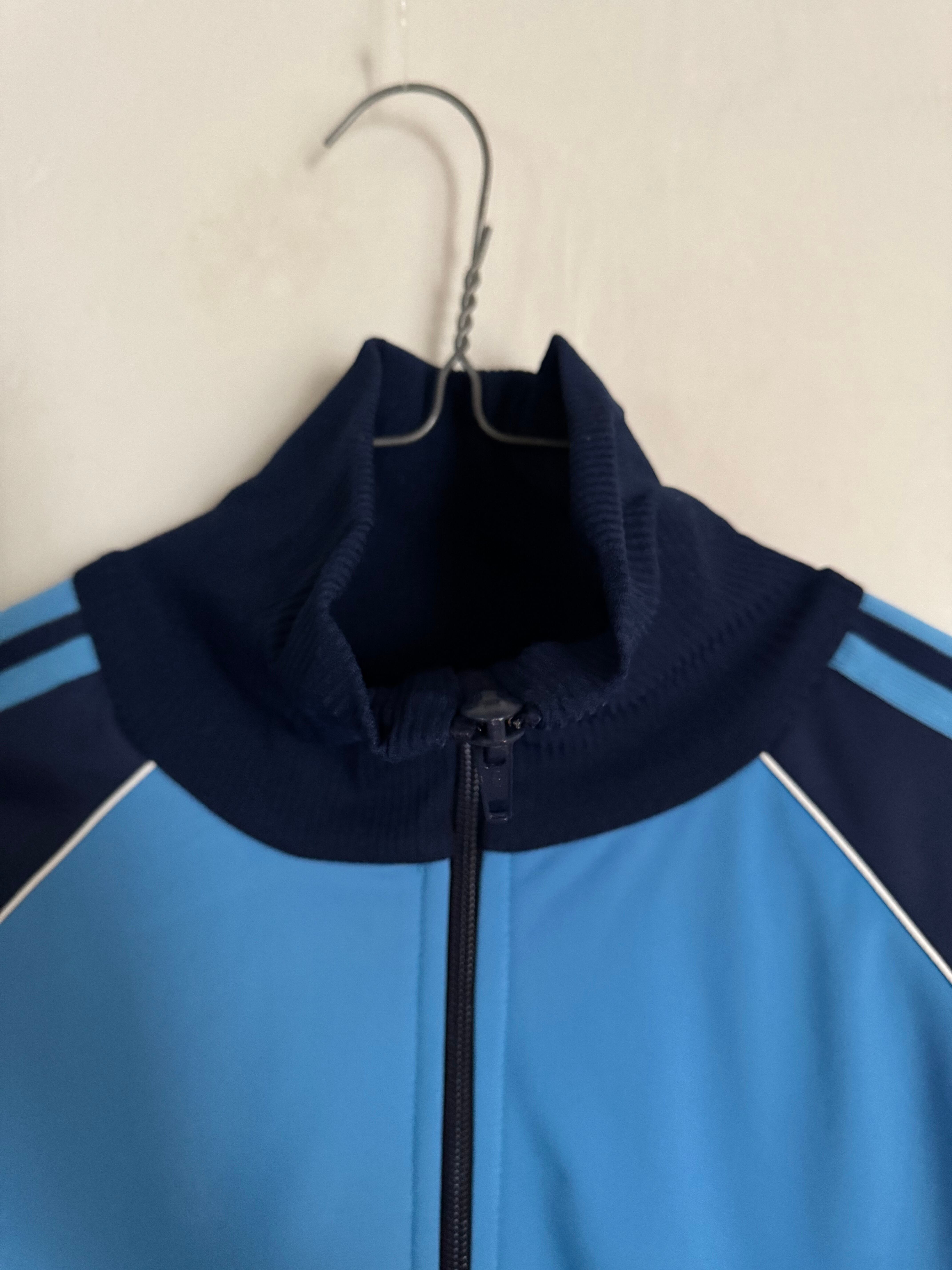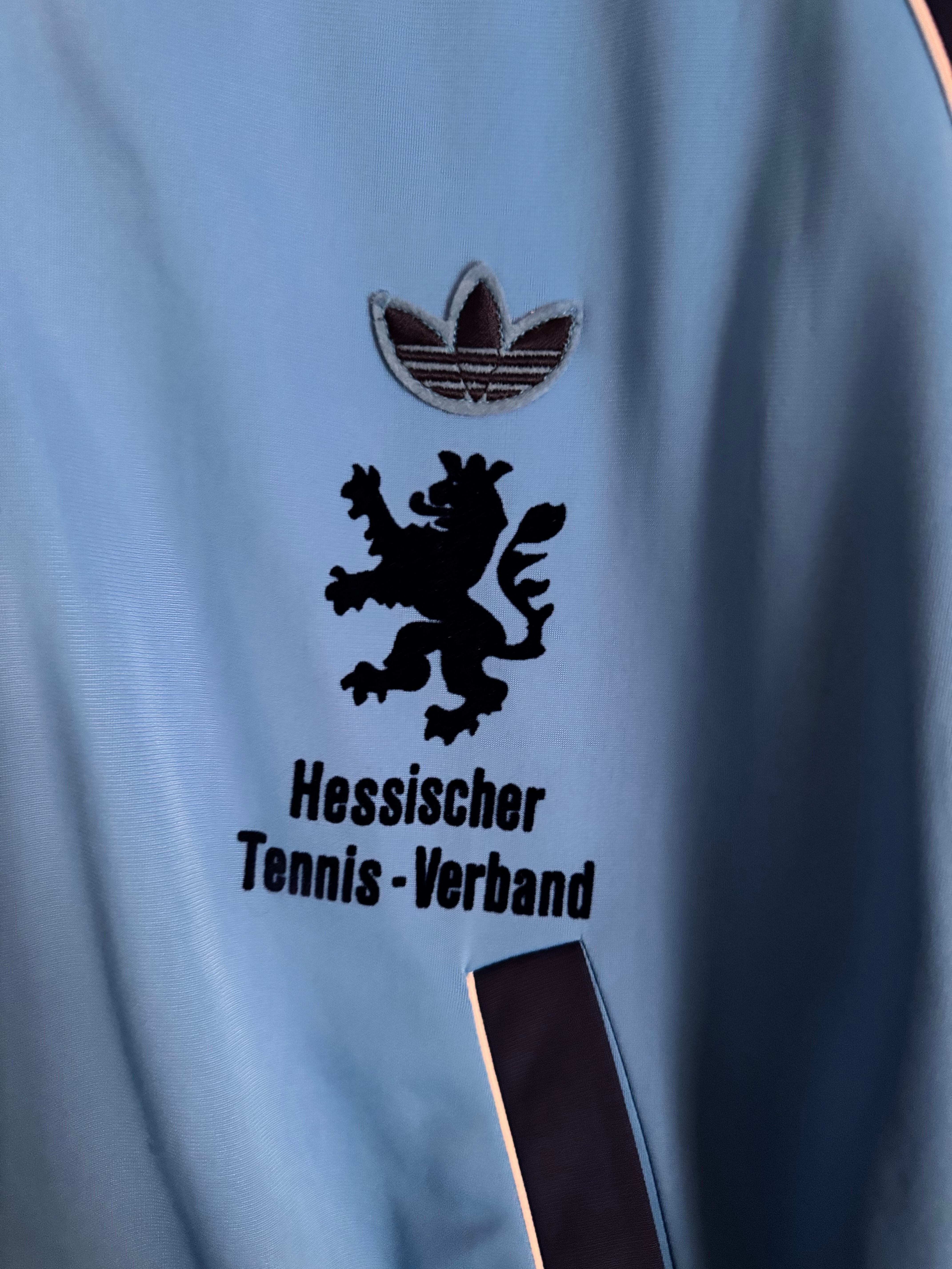 adidas製、ドイツ・ヘッセン州テニス協会モデルのトラックジャケット。爽やかなスカイブルーをベースに、ネイビー切り替えとスリーストライプ。胸元にはトレフォイルロゴとライオンエンブレム入り。クラシックなハイネック仕様、ラグランスリーブで動きやすく、スポーツミックスやストリートスタイルにもハマる一着です。