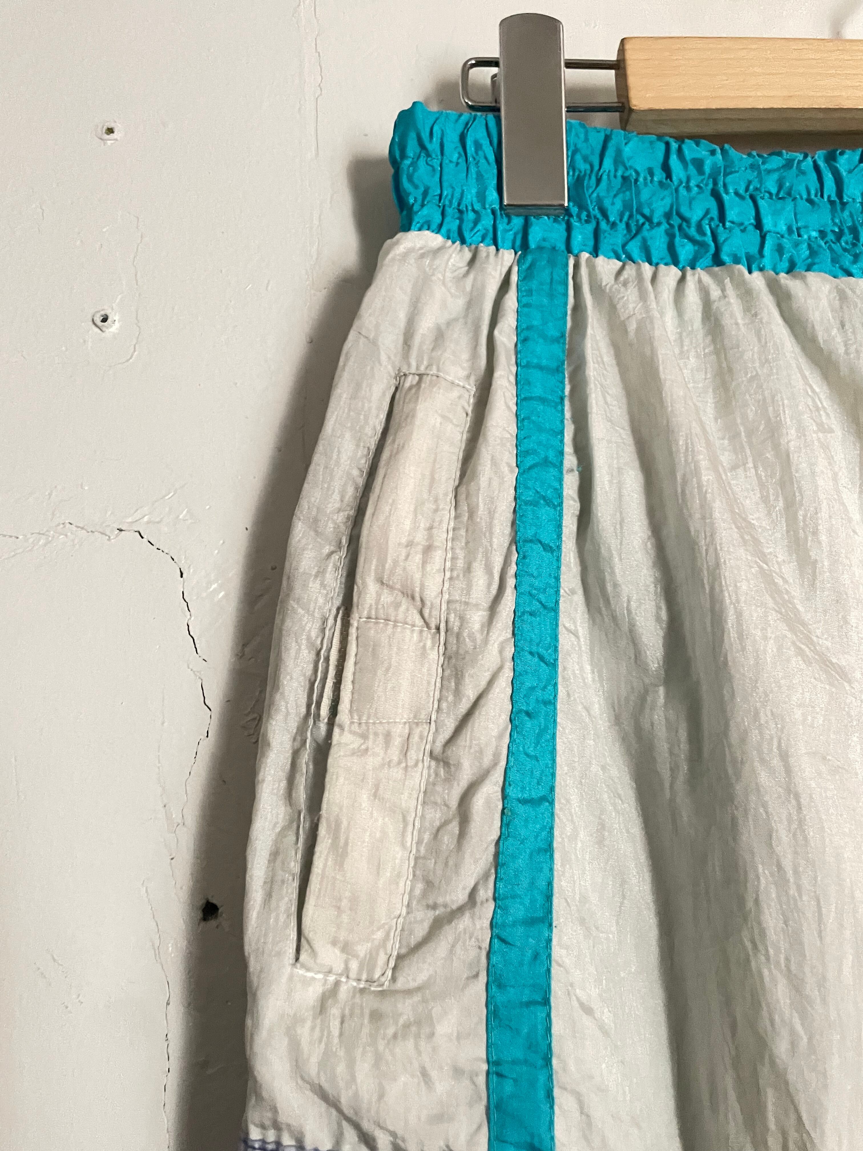 軽やかなナイロン素材を使用した、レトロな配色が魅力のトラックパンツ。アイボリーベースにターコイズのサイドラインが可愛いアイテム。ピッツサイドには切り替えパネルが施され、90年代らしいスポーティーな雰囲気です。ウエストはゴム仕様でリラックス感があり履き心地は◎。裾はジップ付きでシューズに合わせた調整も可能です。