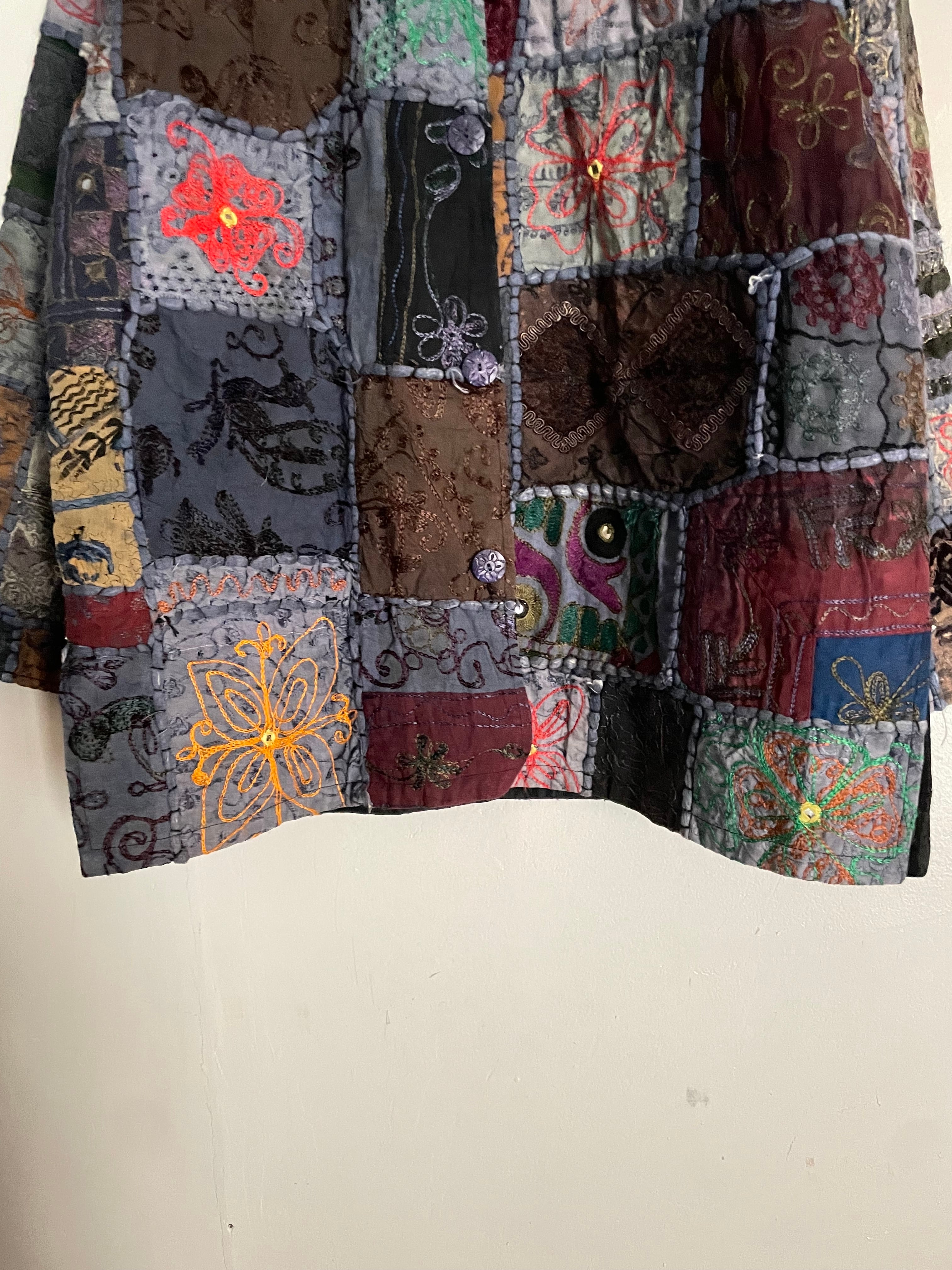 一点物のような存在感を放つ、パッチワークデザインのジャケット。グレーをベースに、ボルドー・ブラウン・グリーンなどの深みのあるカラーを組み合わせたクラフト感あふれる一着。それぞれ異なるテキスタイルに刺繍やスパンコール装飾が施され、立体感と温かみのある雰囲気です。ゆとりのあるシルエットで、ニットなど厚手のものの上からも羽織りやすいデザインです。