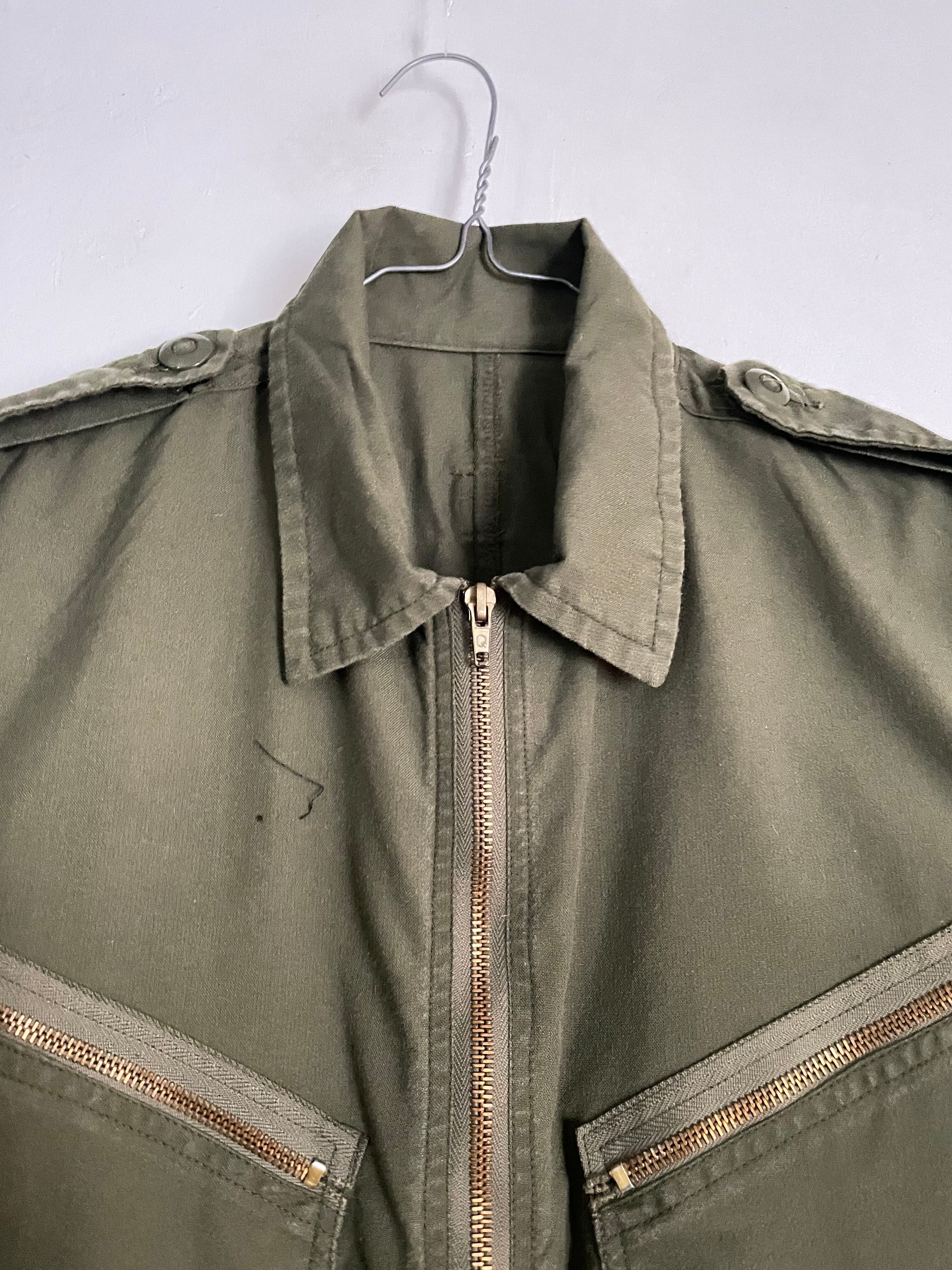 無骨さが魅力のカナダ軍車両乗組員用のカバーオール。胸元ともも部分にはジップポケットが施され、機能性とデザイン性を両立しています。ウエストにはアジャスター付きでシルエット調整が可能です。方にはエポレットを備え、ミリタリーらしいディテールが光る一着。裾はドローコード付きで、ブーツにもスニーカーにも合わせやすくなっています。