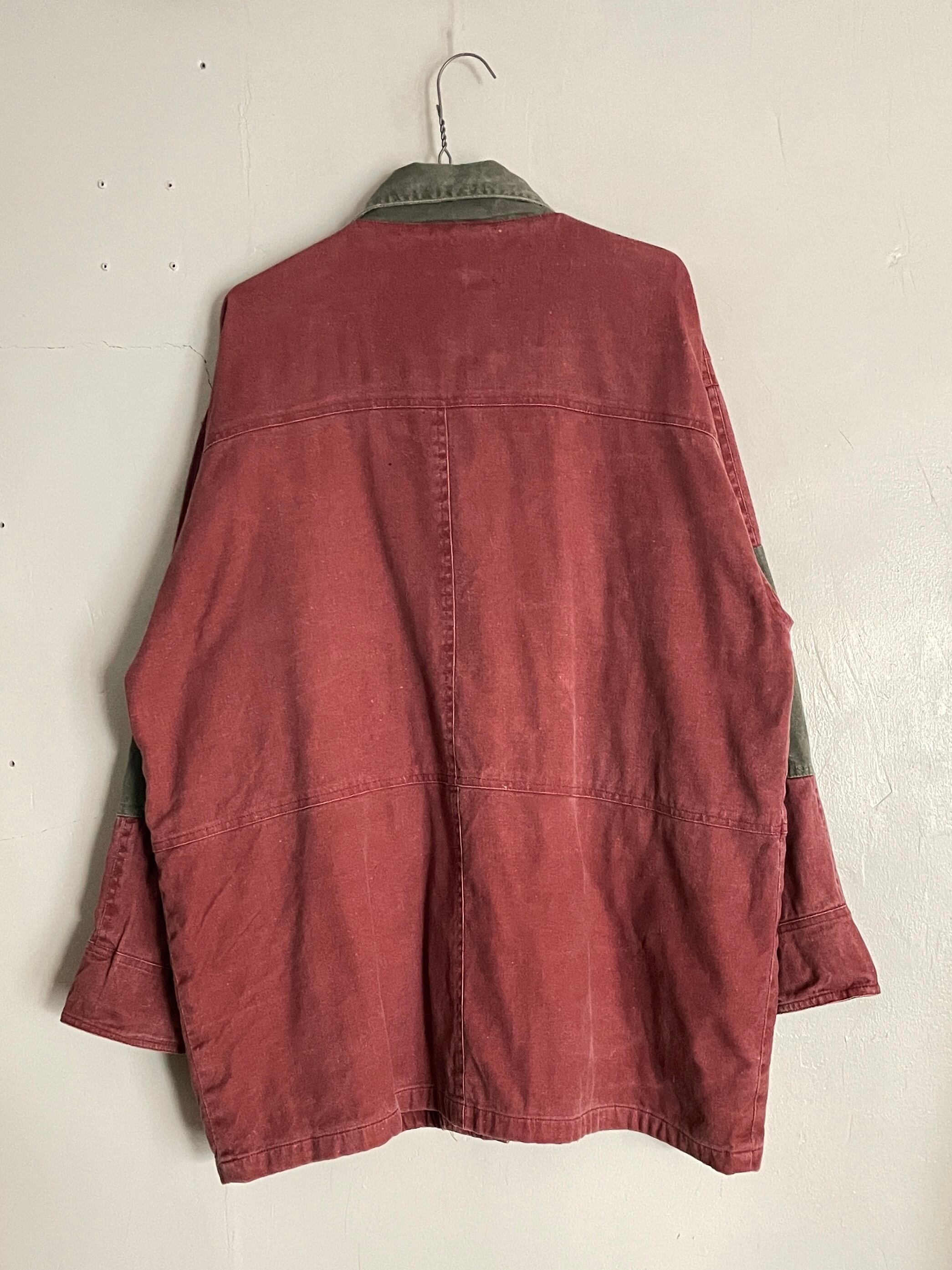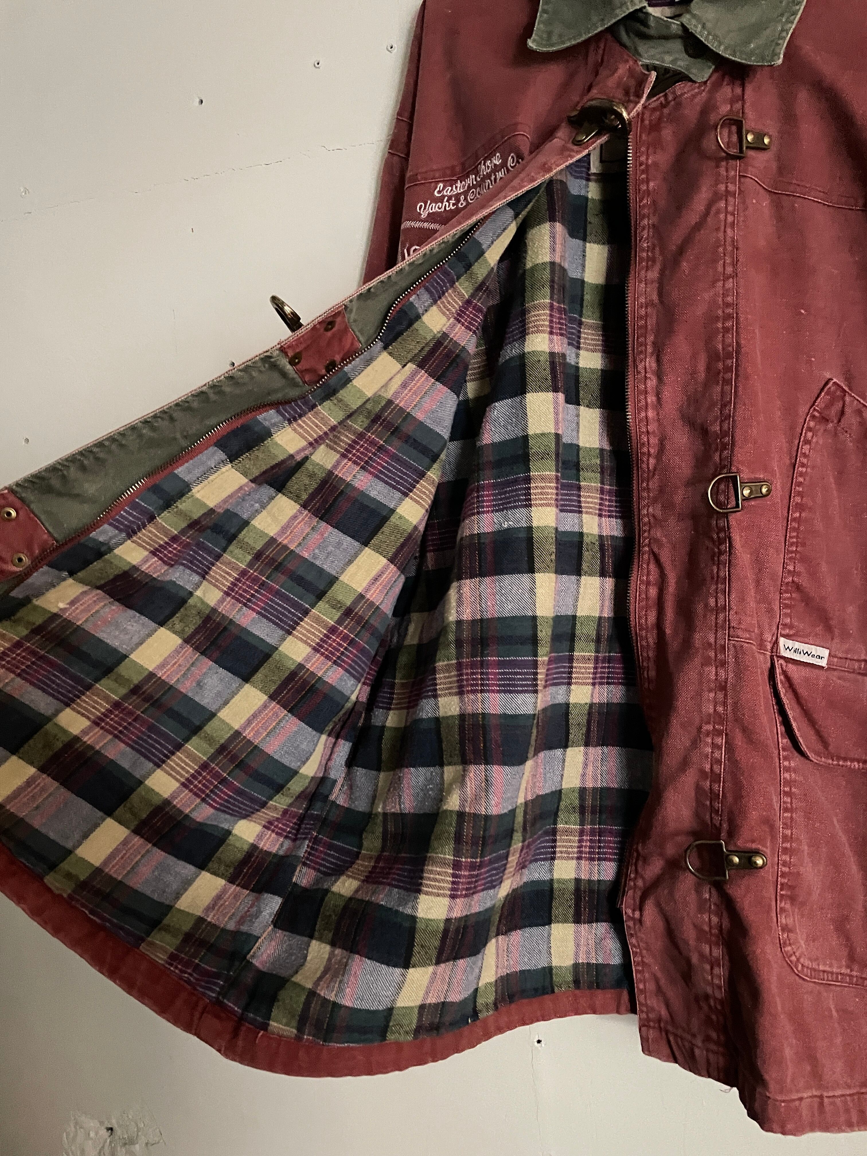 フェードしたレッドボディで、フロント部分にワンポイントで刺繍デザインが施された、ファイヤーマンジャケット。金属製のトグル、通称ファイヤーマンフックがファイヤーマンジャケットの最大の特徴です。襟、肘パッチはオリーブカラーで切り替えられています。4ポケット付きで機能性も優れたジャケットです。裏地は鮮やかなチェック柄デザインで、細かな部分まで、手の行き届いたこだわりが感じられるアイテムです。ゆったりとしたサイズ感で、インナーにもしっかりと着込めそうです。今の時期にはもちろんですが、春にもファッションの主役になってくれそうです。