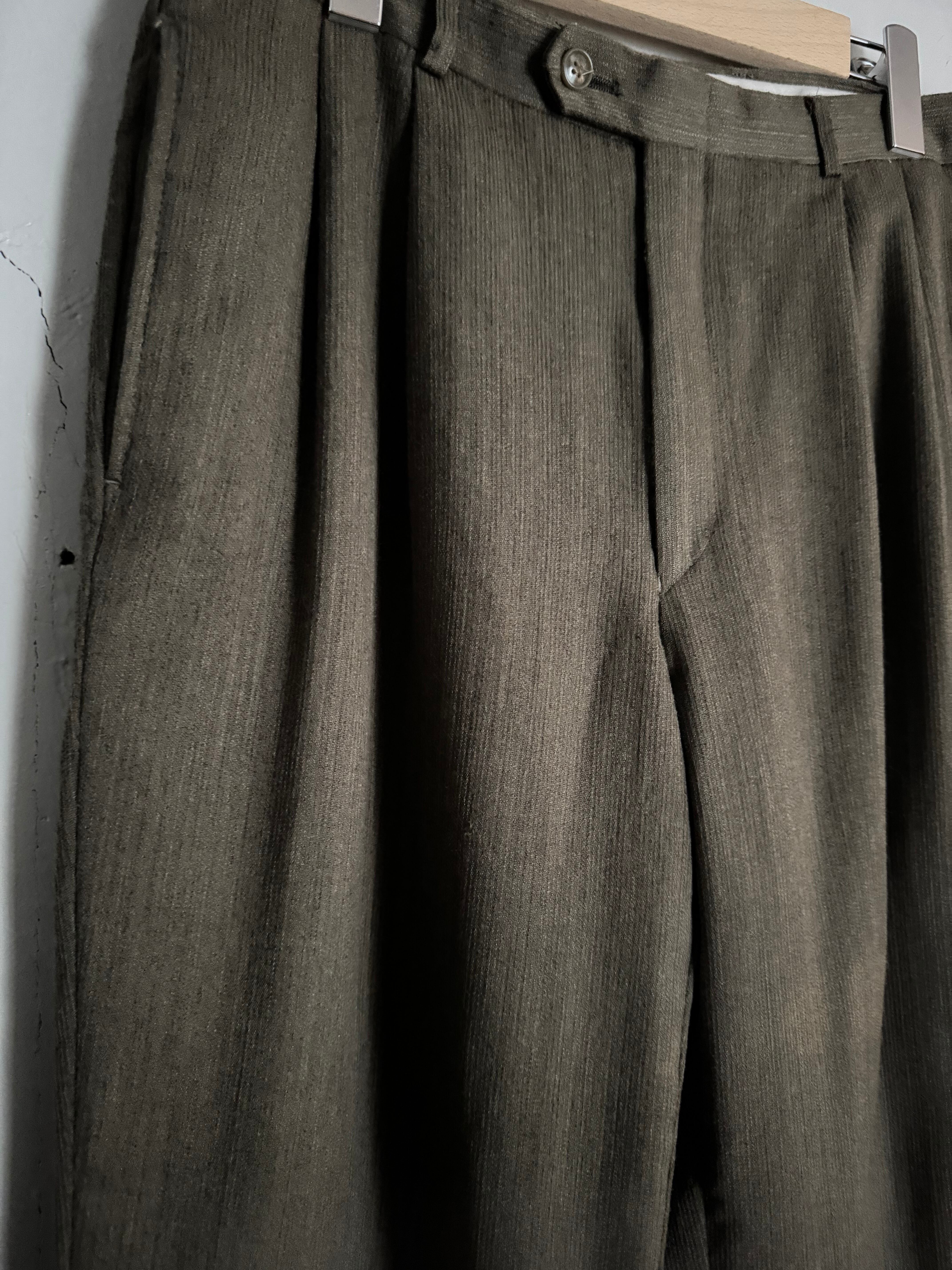 落ちついたオリーブブラウンカラーのツータックスラックス。フロントはツータック仕様で腰回りにゆとりがあり、裾にかけて自然に落ちる綺麗なシルエット。シャツやニットと合わせた綺麗めスタイルはもちろん、スウェットやトラックジャケットと合わせたミックスコーデにも合う一本です。