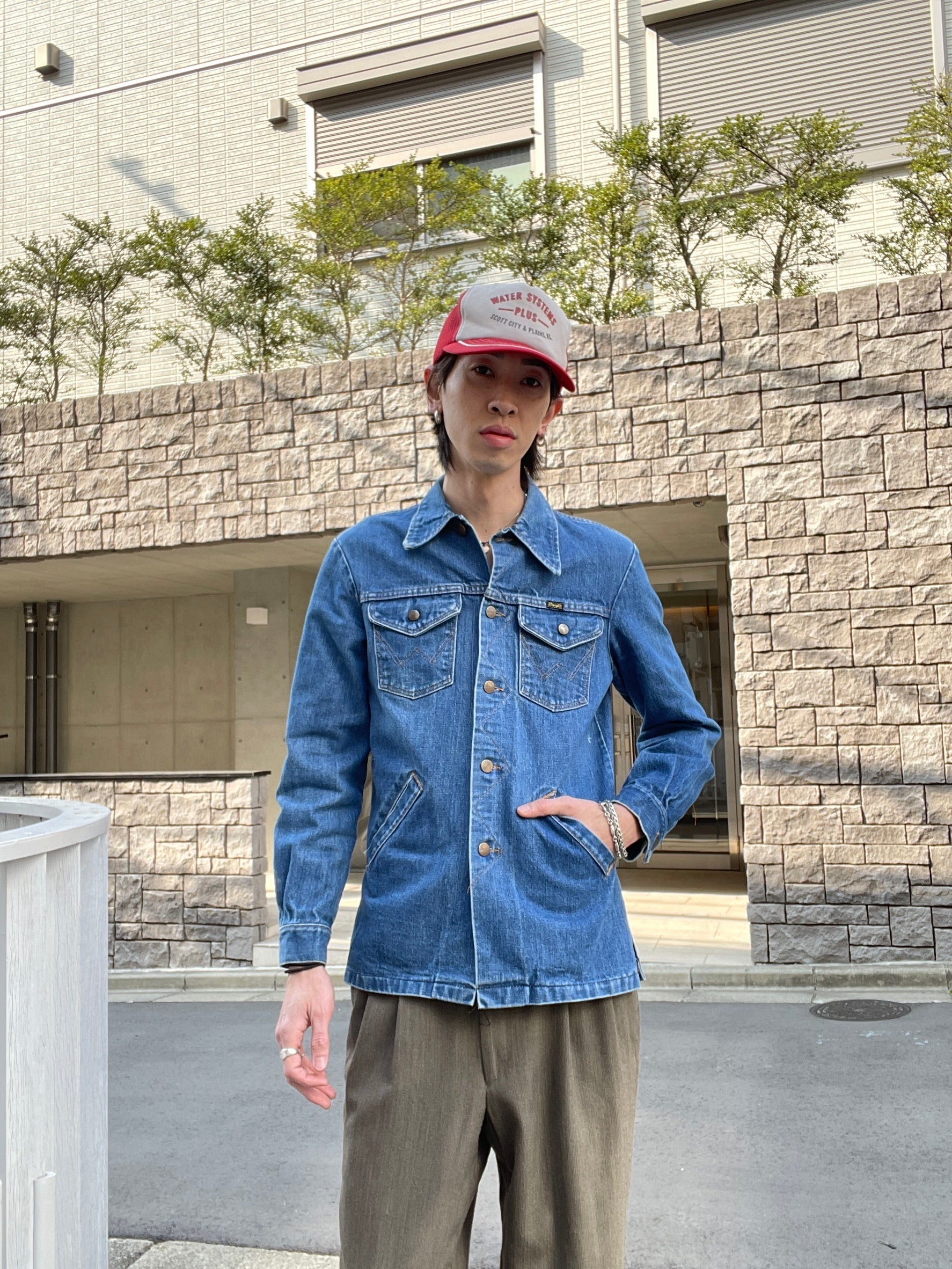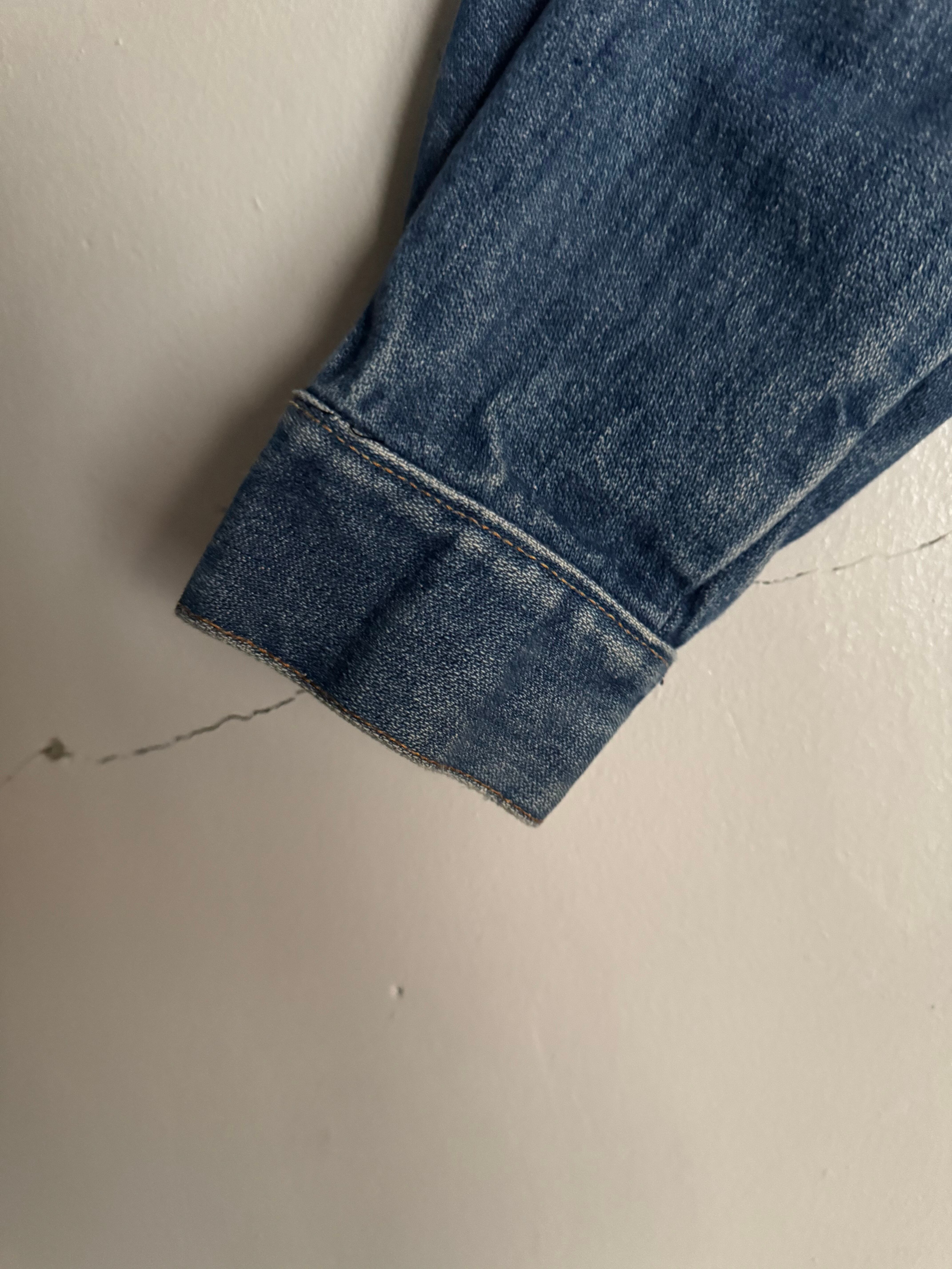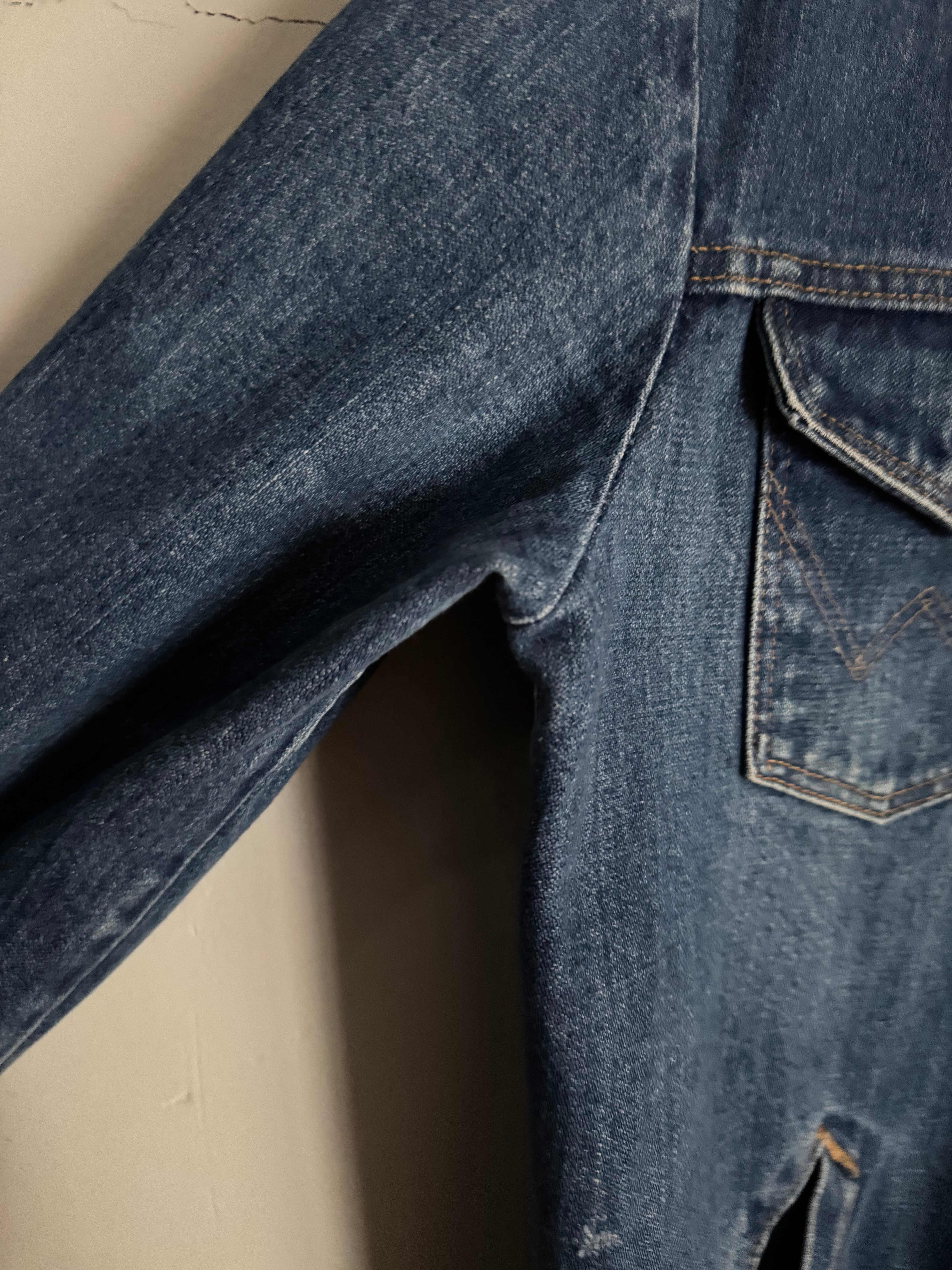 1970年代後半のWranglerのデニムジャケット。程よく色落ちしたミディアムインディゴで、ヴィンテージライクな雰囲気が魅力の一着。ブランドを象徴するWステッチ入り胸ポケットに加え、ハンドウォーマーポケットも備えた実用的なデザイン。ワークテイストを感じさせながらも、シャツ感覚で軽く羽織れるバランスの良いシルエットです。