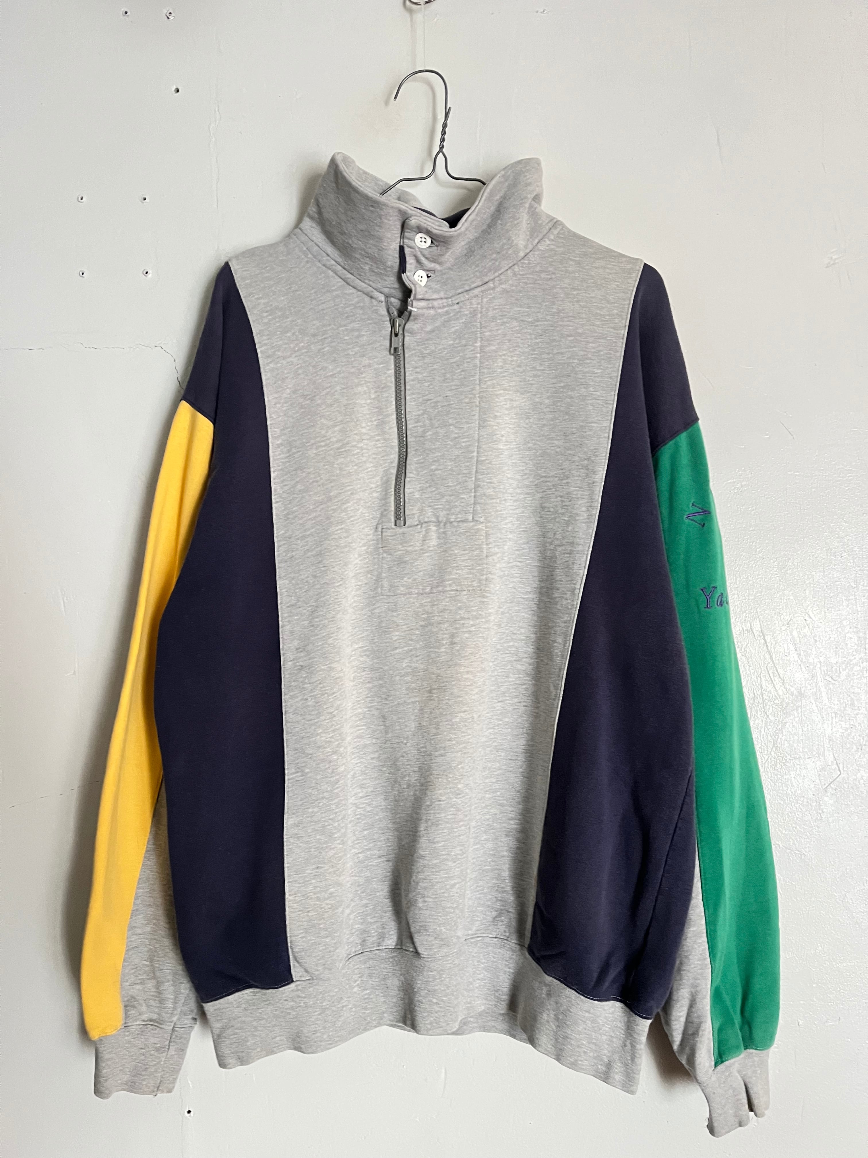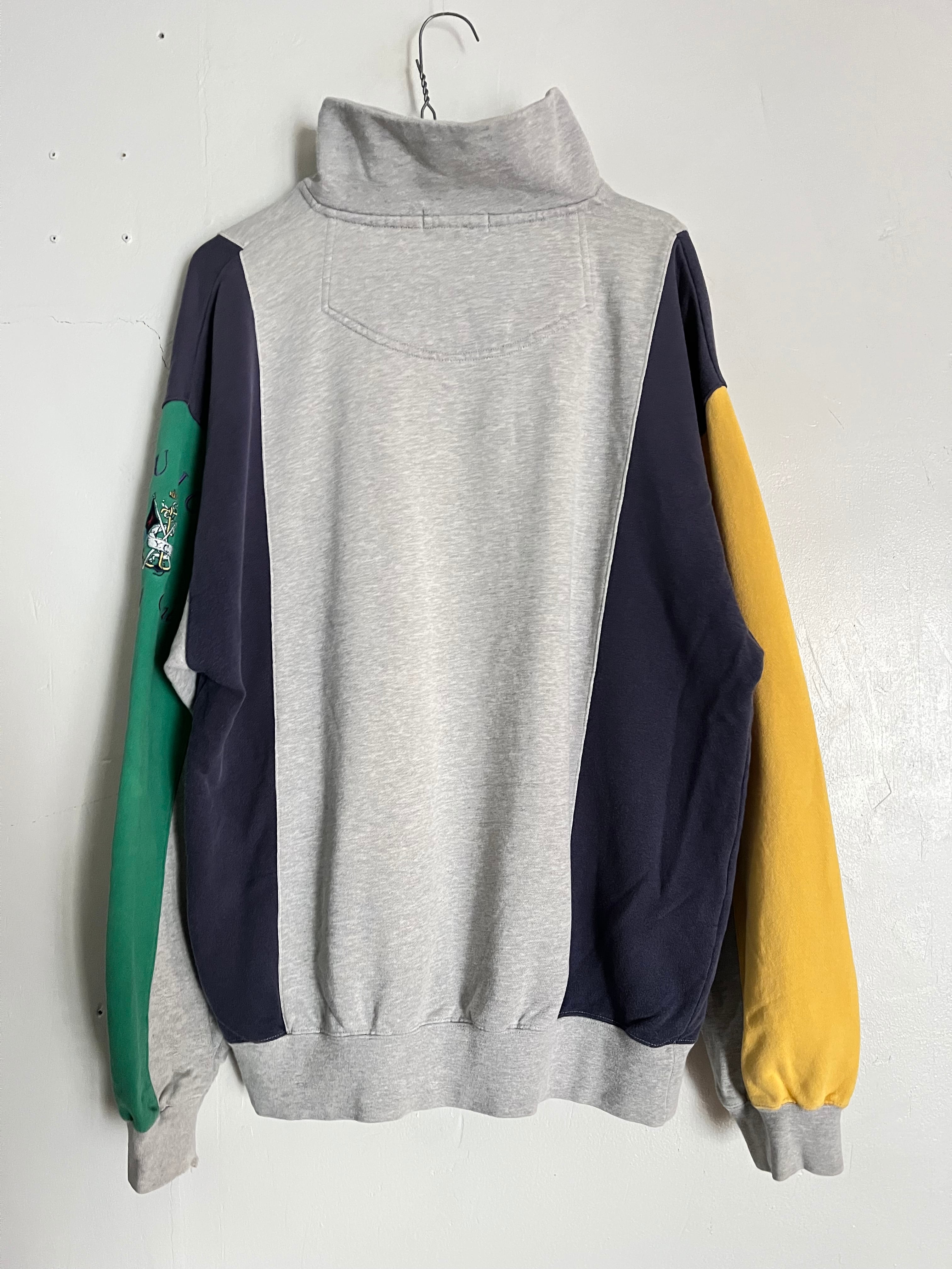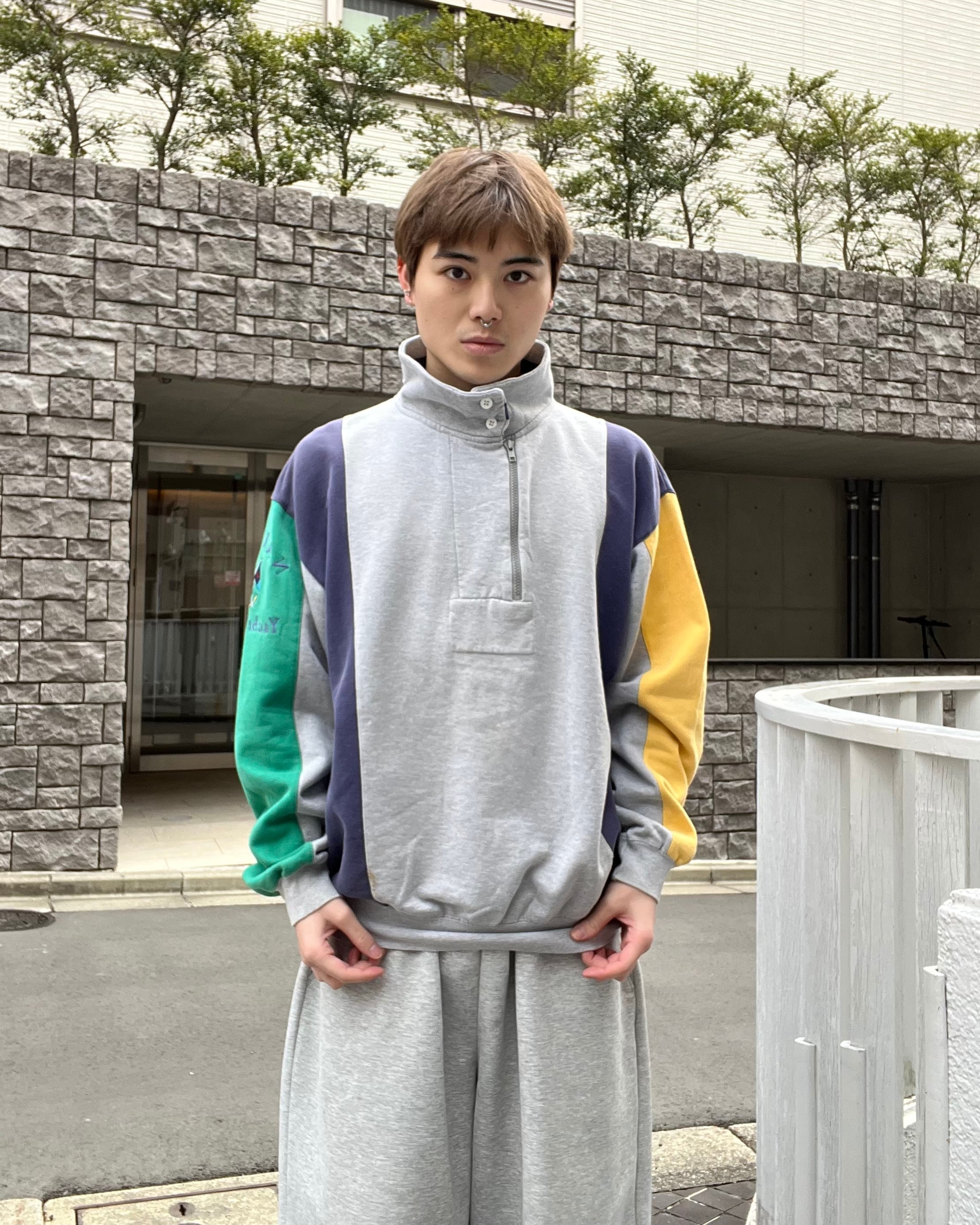 左右で袖の色が変わっており、トレーナーには珍しいスタンドカラーにボタンとハーフジップが付いたデザイン性のあるアイテムです。身幅もやや大きめなのでゆとりがあり、あまりストレスの感じずに楽に着ていただけます。また、スタンドカラーのところがボタンになっているので、ボタンを外して折り曲げていただくと襟を作ることが可能です。そのためカジュアルにフォーマル感を混ぜたようなファッションスタイルをお楽しみいただけると思います。