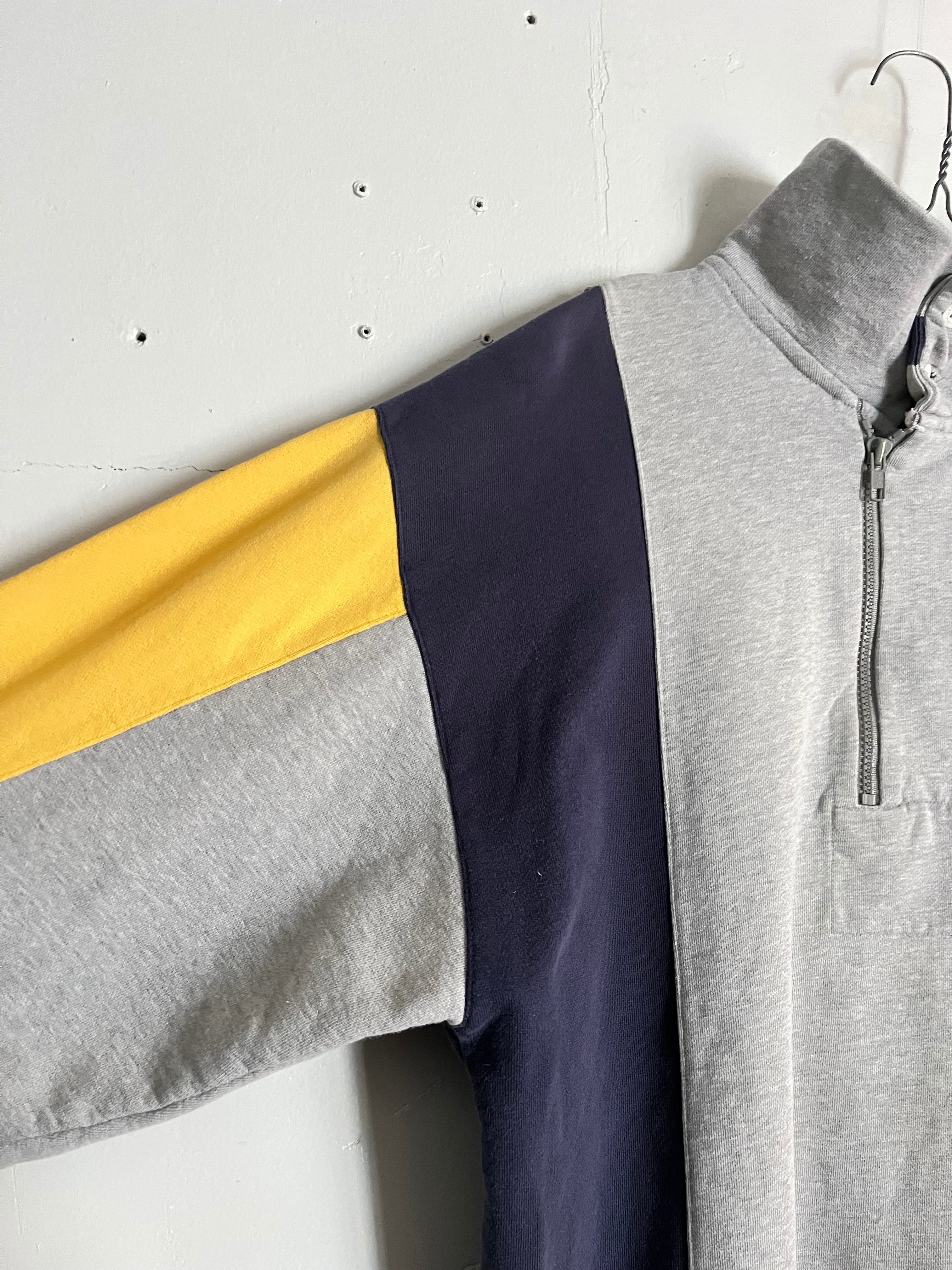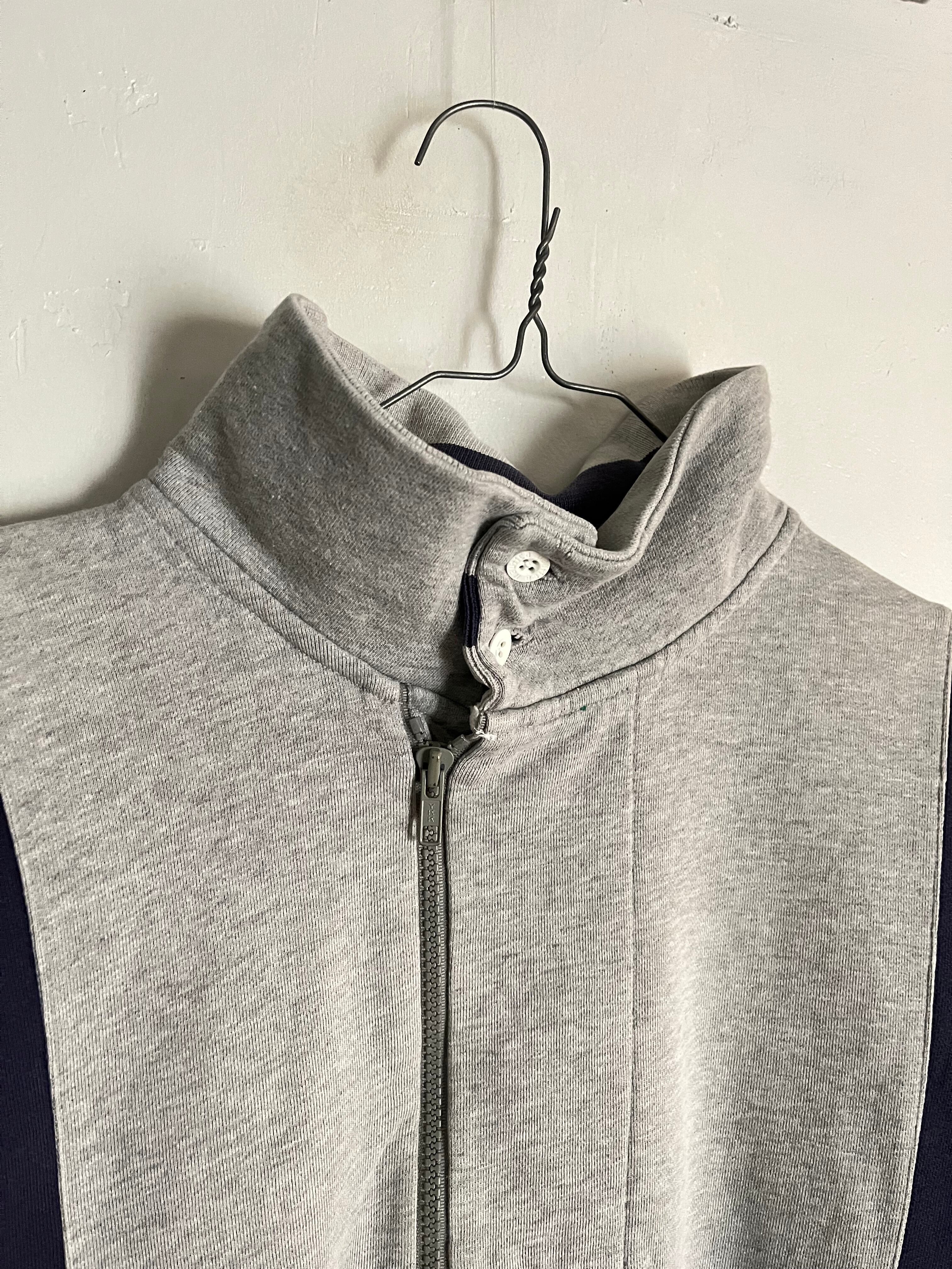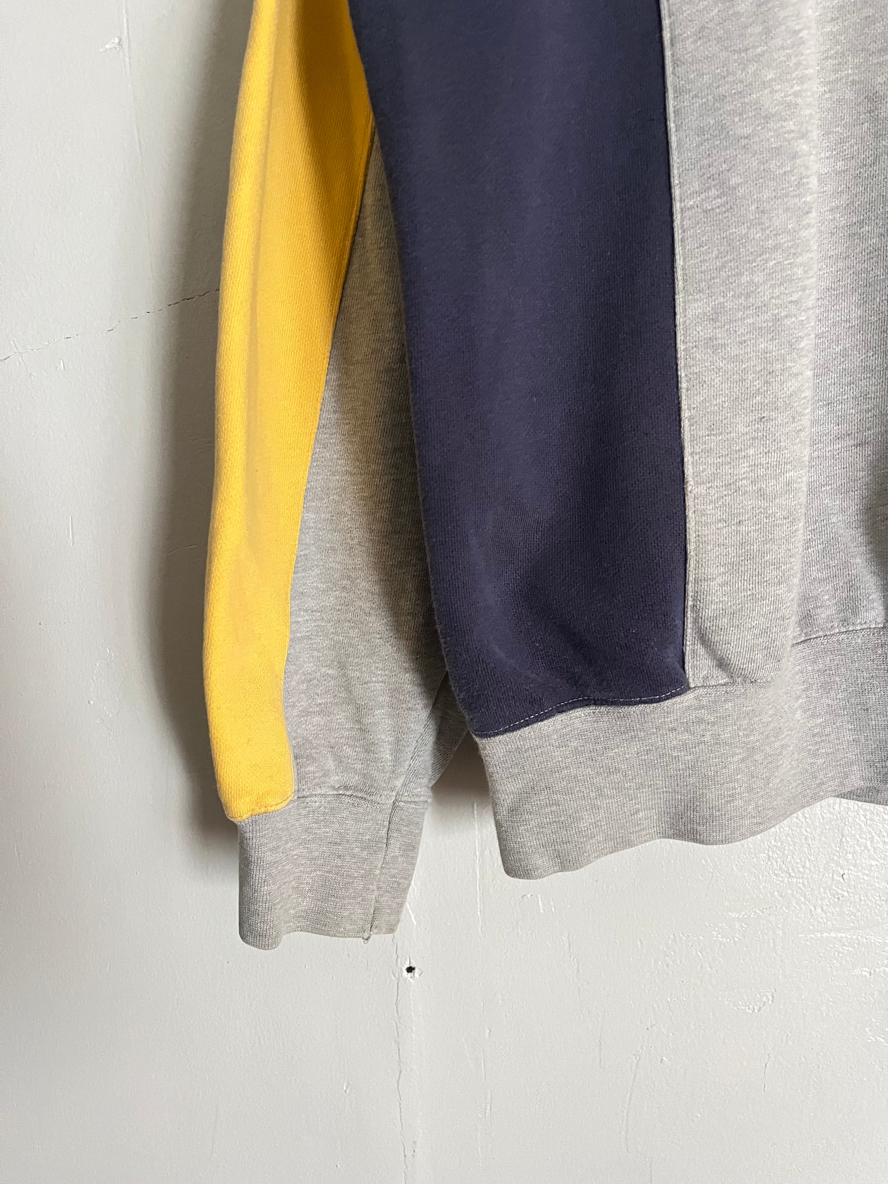 左右で袖の色が変わっており、トレーナーには珍しいスタンドカラーにボタンとハーフジップが付いたデザイン性のあるアイテムです。身幅もやや大きめなのでゆとりがあり、あまりストレスの感じずに楽に着ていただけます。また、スタンドカラーのところがボタンになっているので、ボタンを外して折り曲げていただくと襟を作ることが可能です。そのためカジュアルにフォーマル感を混ぜたようなファッションスタイルをお楽しみいただけると思います。