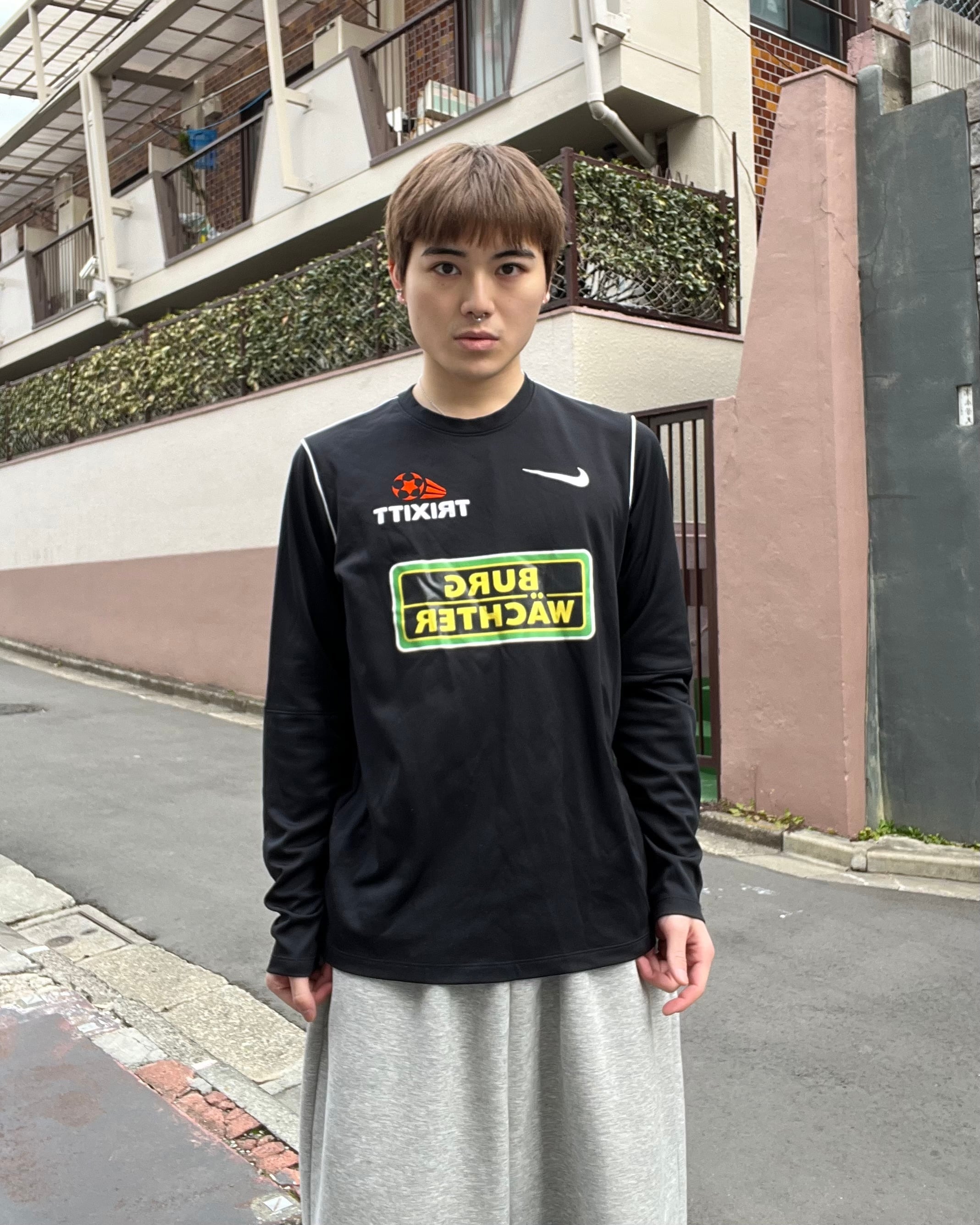 フロントに入るスポンサーグラフィックが印象的なロングスリーブシャツ。スポーツウェア特有のミニマルなデザインに、企業ロゴの配色がアクセントとして映える一枚です。程よく力の抜けたシルエットで、ストリートスタイルにも合わせやすいアイテム。一枚でもインナーでも活躍する万能なロンTです。
