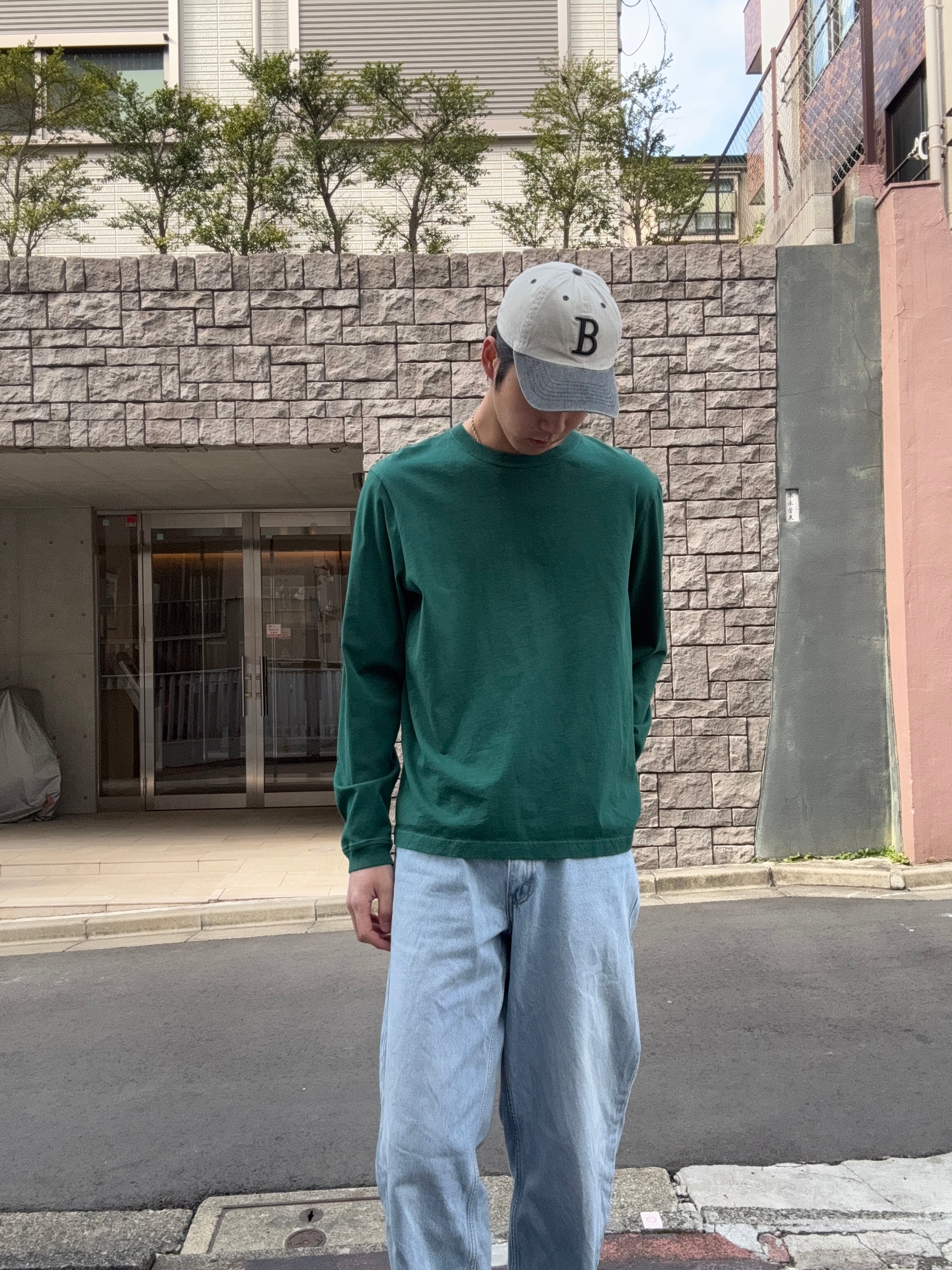 深みのあるグリーンが魅力のロングスリーブTシャツ。無地のミニマルなデザインで、一枚でもインナーとしても着回しやすい万能アイテム。程良い色味がこなれた印象を演出し、カジュアルからストリートまで幅広く合わせられます。ゆったりとしたシルエットで、リラックス感のある着用感もポイント。