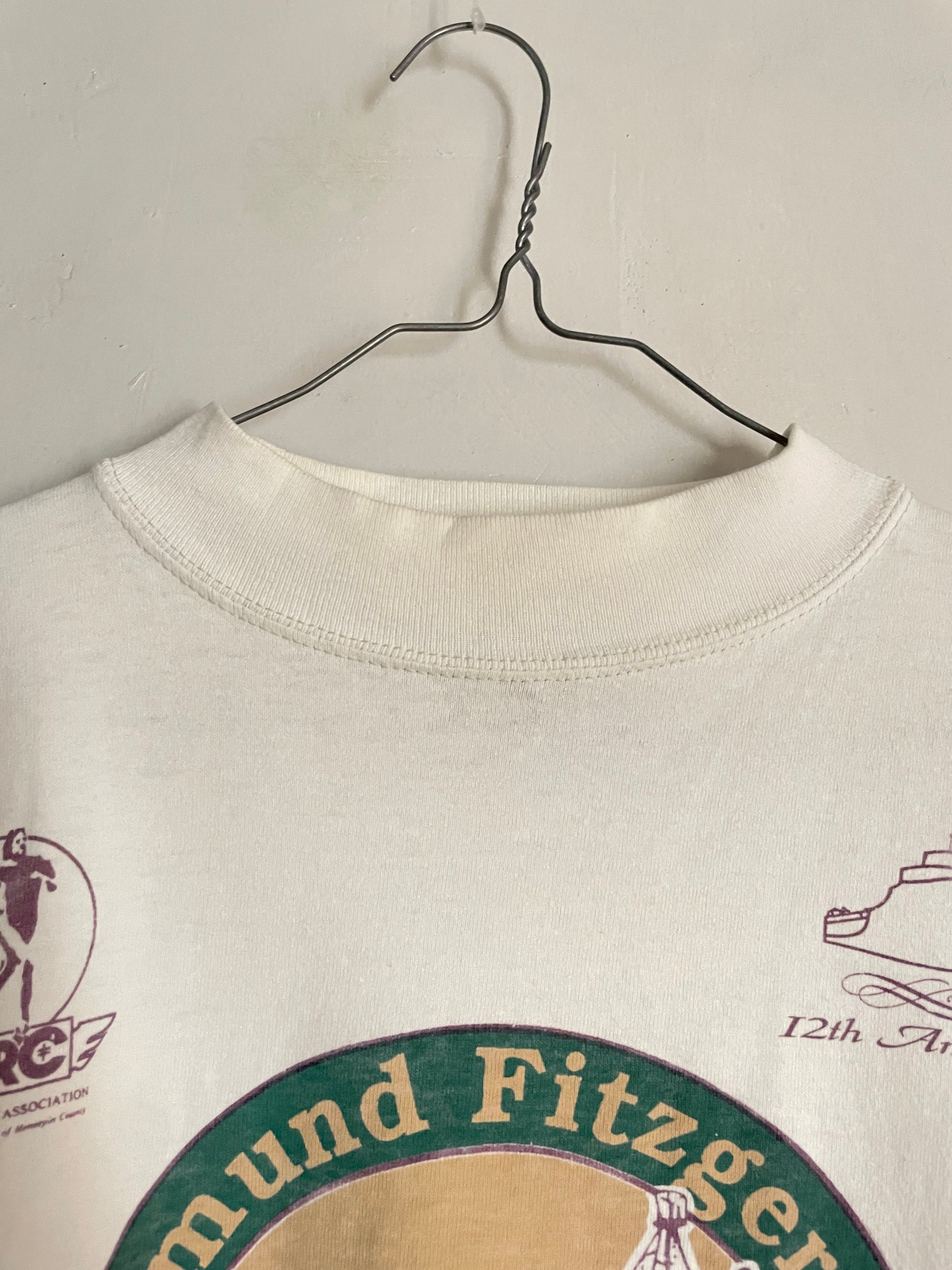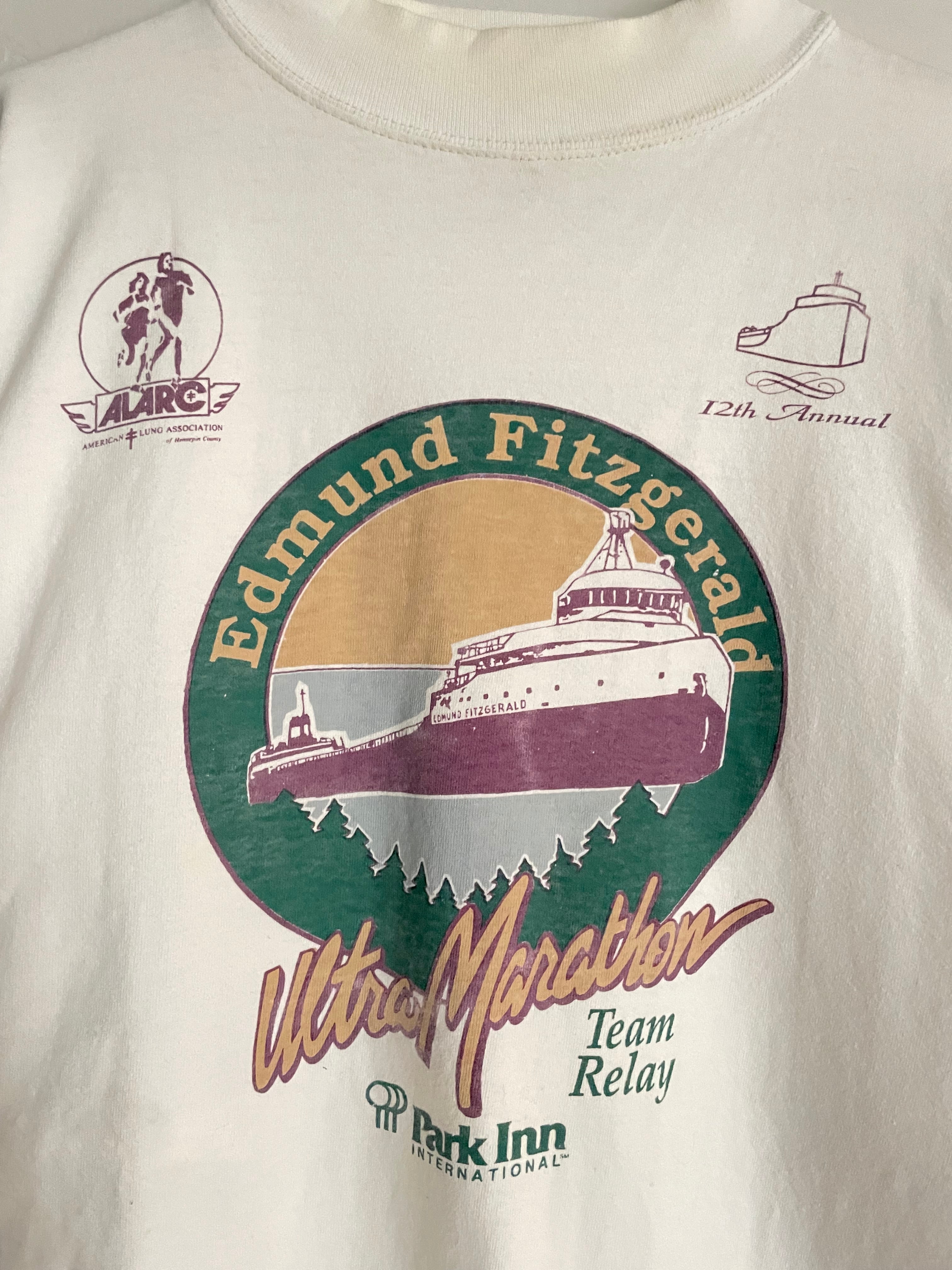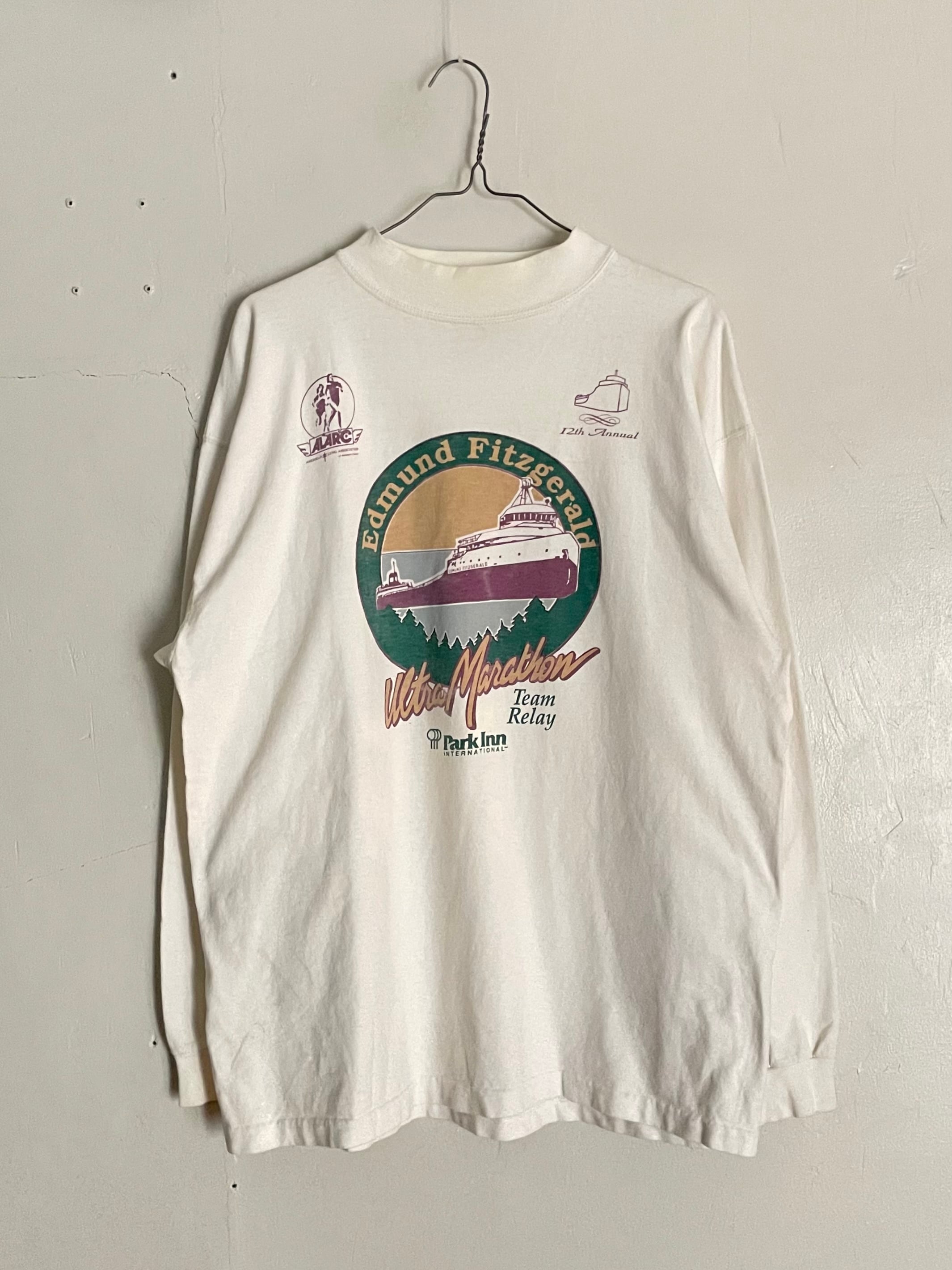"Edmund Fitzgerald Ultra Marathon Team Relay"のグラフィックが施されたロングスリーブTシャツ。中央には船のイラストが大きくプリントされ、グリーン×パープルの配色が可愛い一枚。ナチュラルなアイボリーカラーのボディは、柔らかな風合いで着心地も◎。スポーツイベント系ののグラフィックが今のスタイルとも相性抜群です。