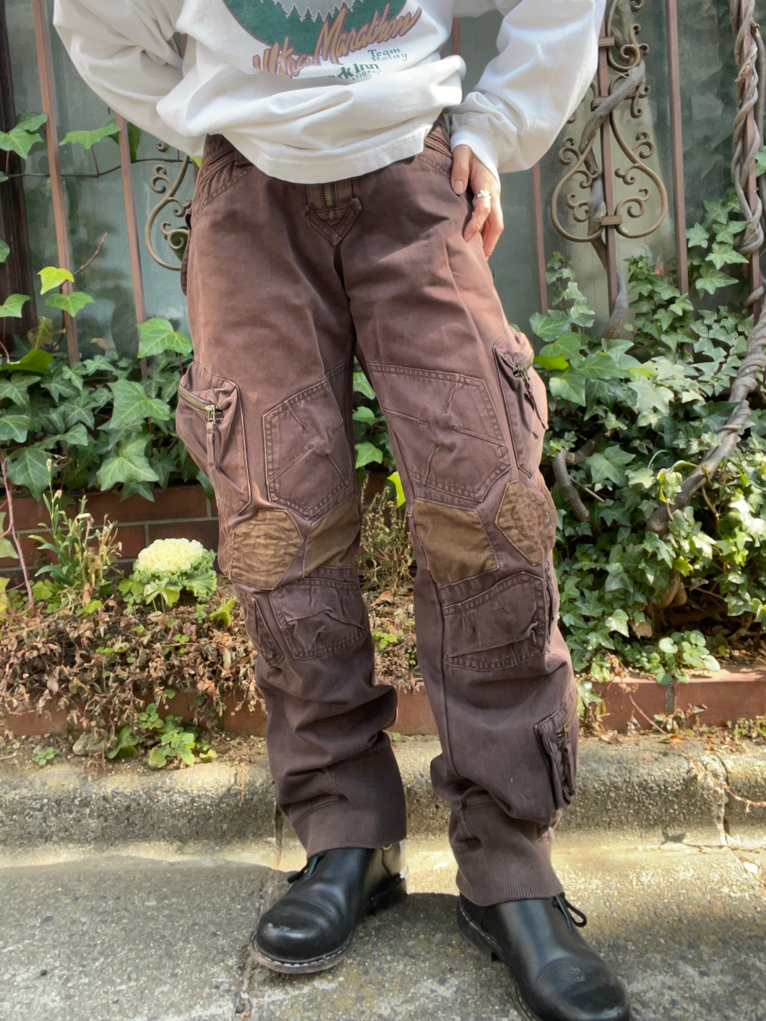 深みのあるブラウンカラーが魅力のジルボーのカーゴパンツ。立体的なパターン構造と随所に施されたジップポケットが、無骨で存在感のあるデザインになっています。フロント・サイド・バックに多数のポケットを備え、実用性も抜群。程よくテーパーどしたラインで、ブーツやスニーカーとも好相性です。ミリタリー、Y2Kテイストにもおすすめの一本です。