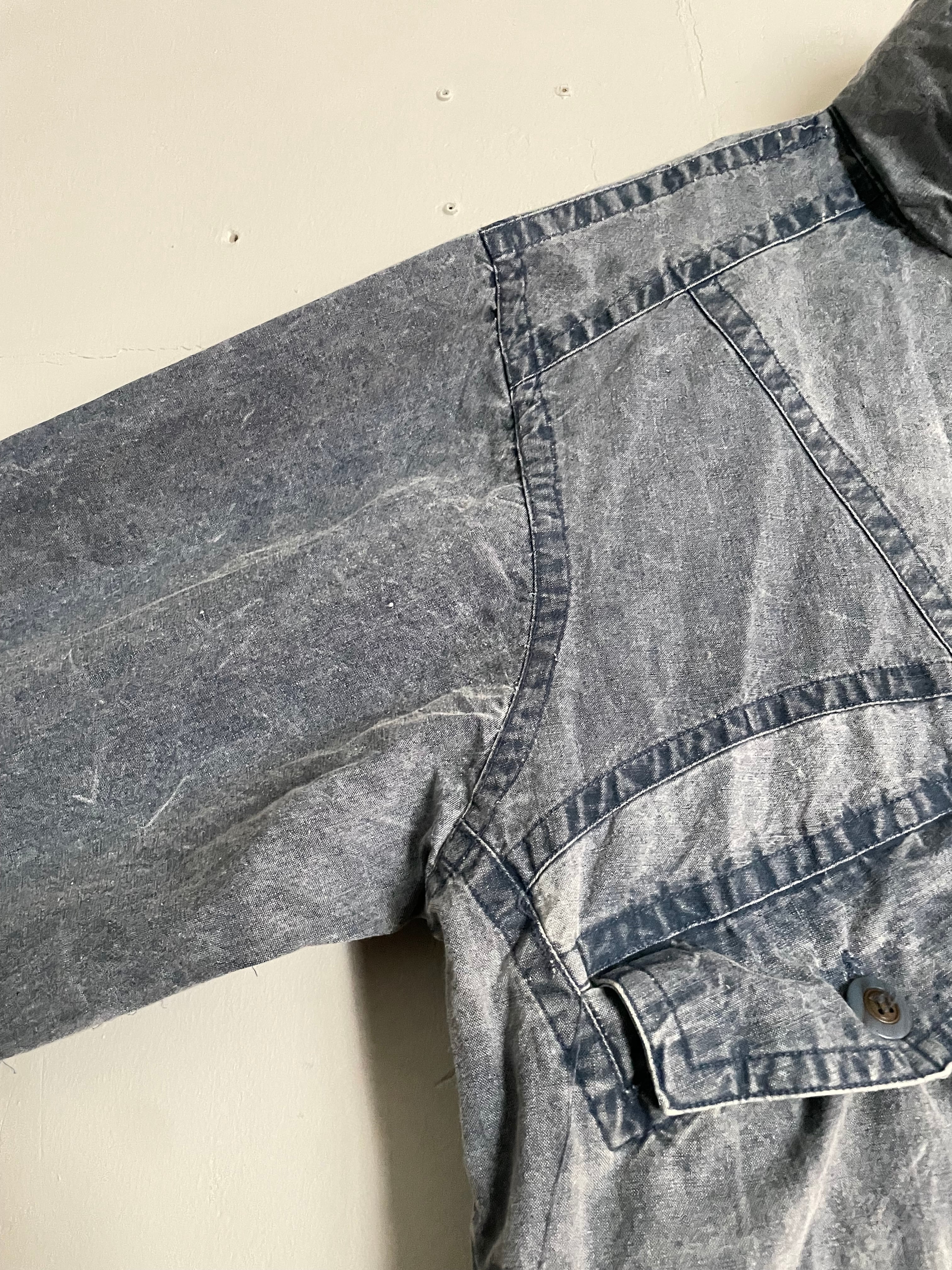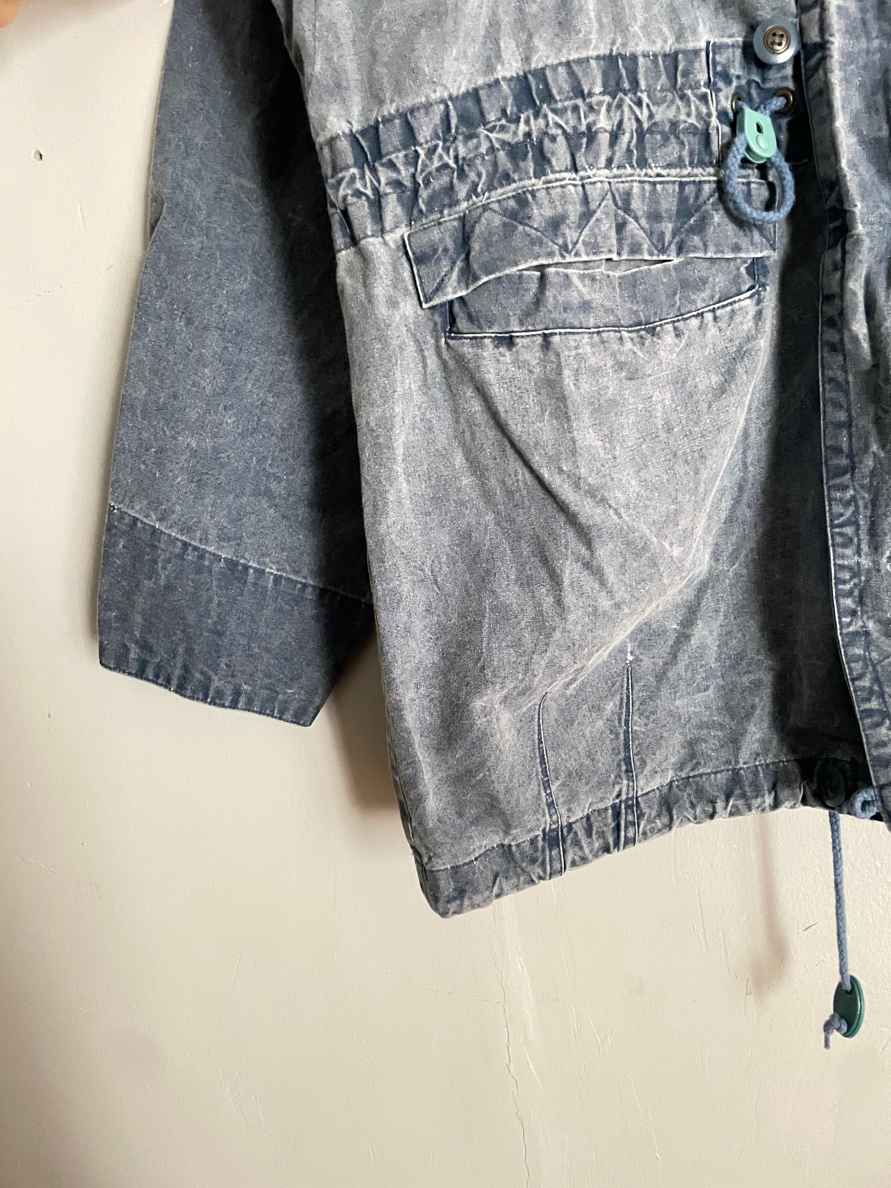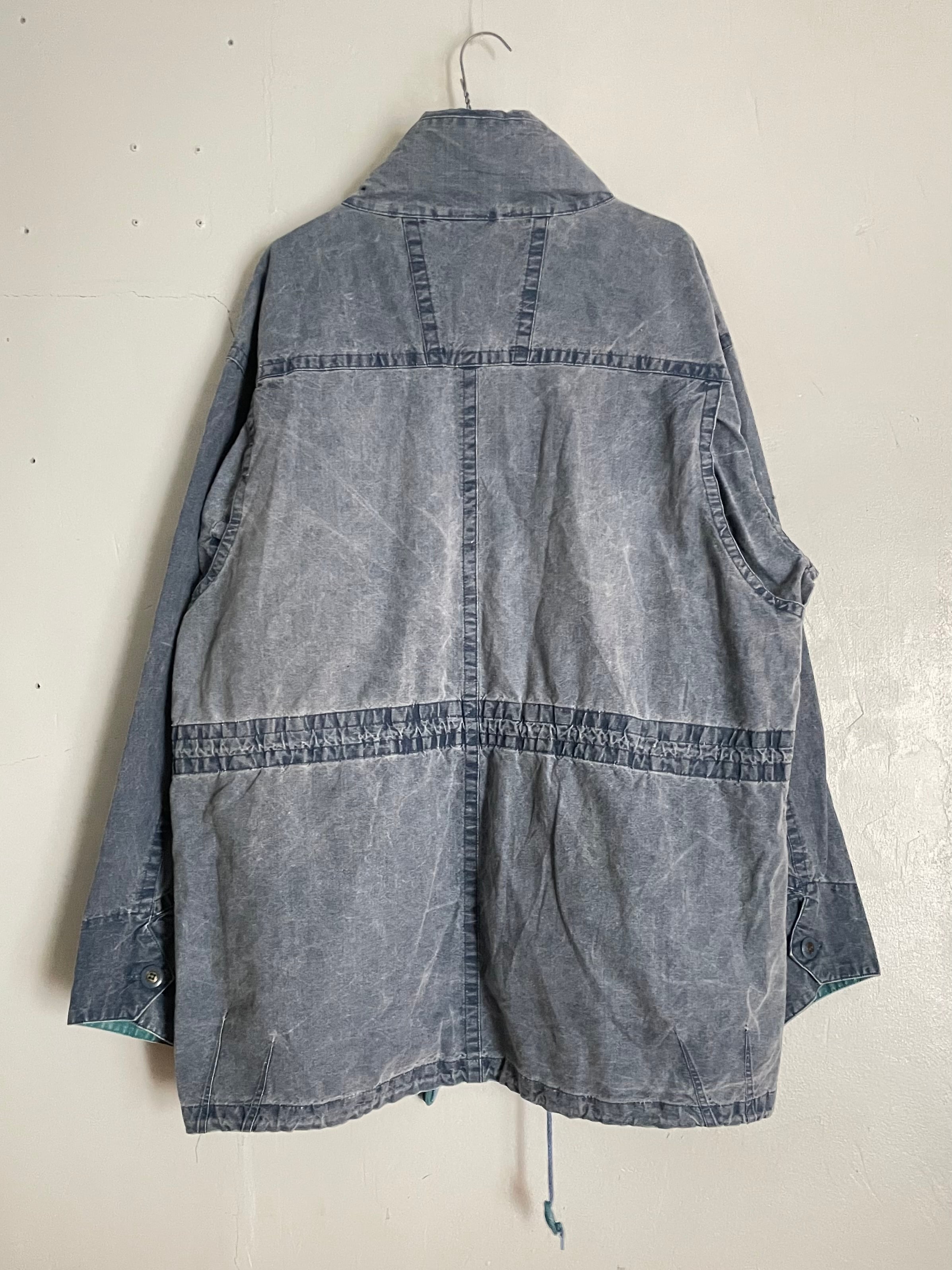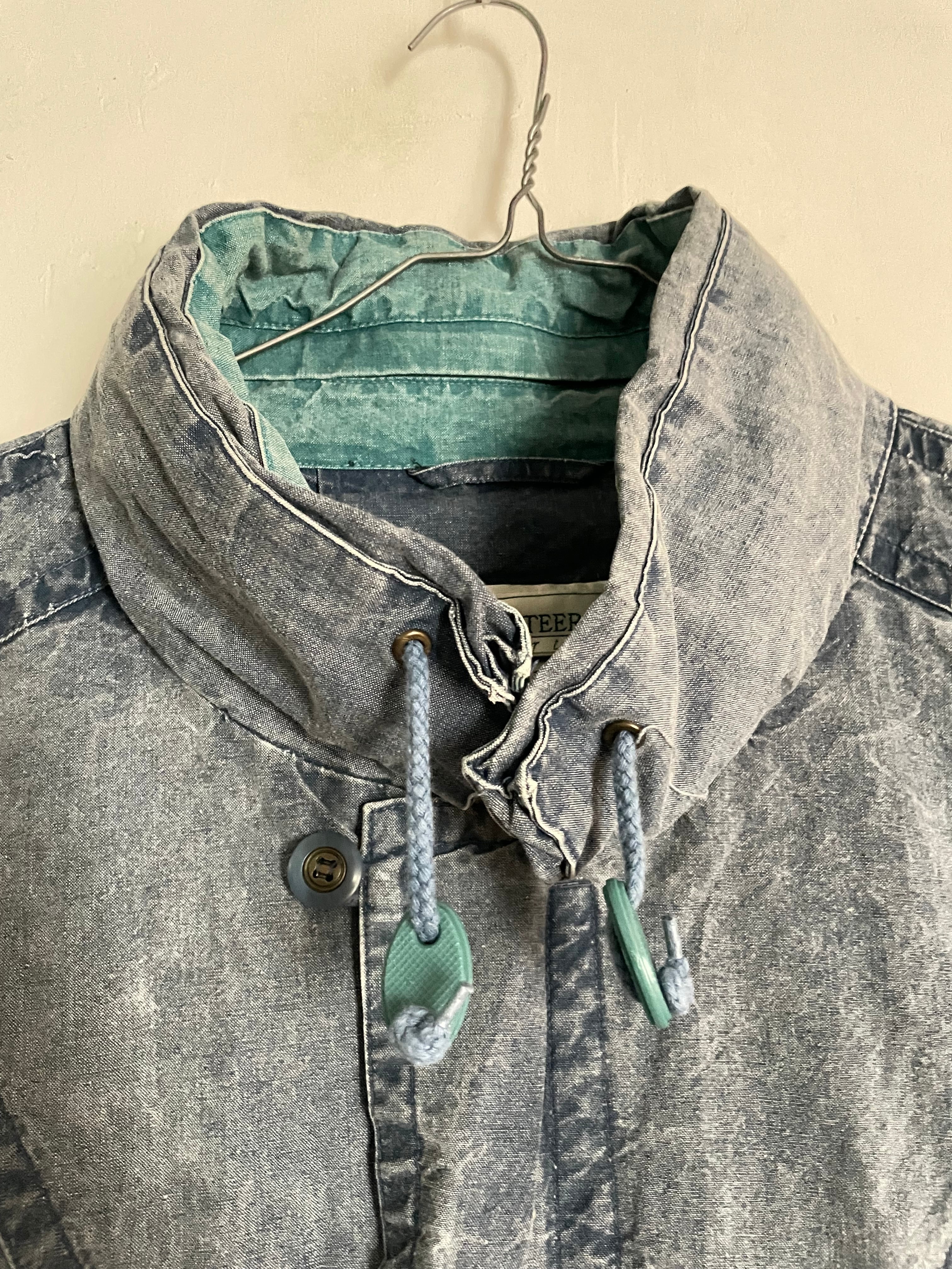 フェード感のあるウォッシュドブルーが魅力のデニムジャケット。程よく色落ちした風合いが、こなれた雰囲気と奥行きのある印象を出してくれます。立体感のあるフラップポケット、ウエスト部分にはドローコード付きでシルエット調整が可能です。ハイネック仕様で防風性もあり、内側の淡いターコイズカラーとのコントラストもポイントです。
