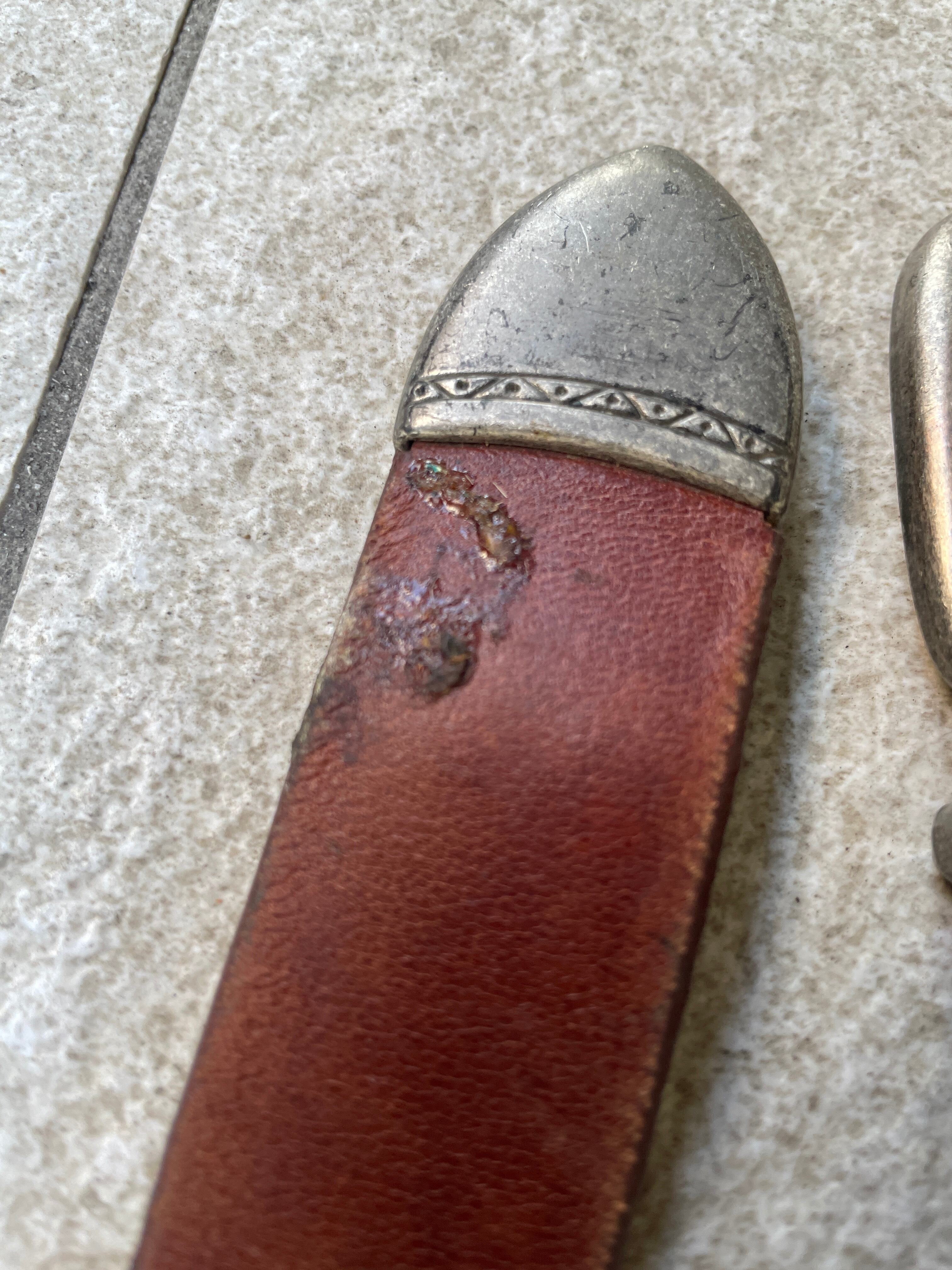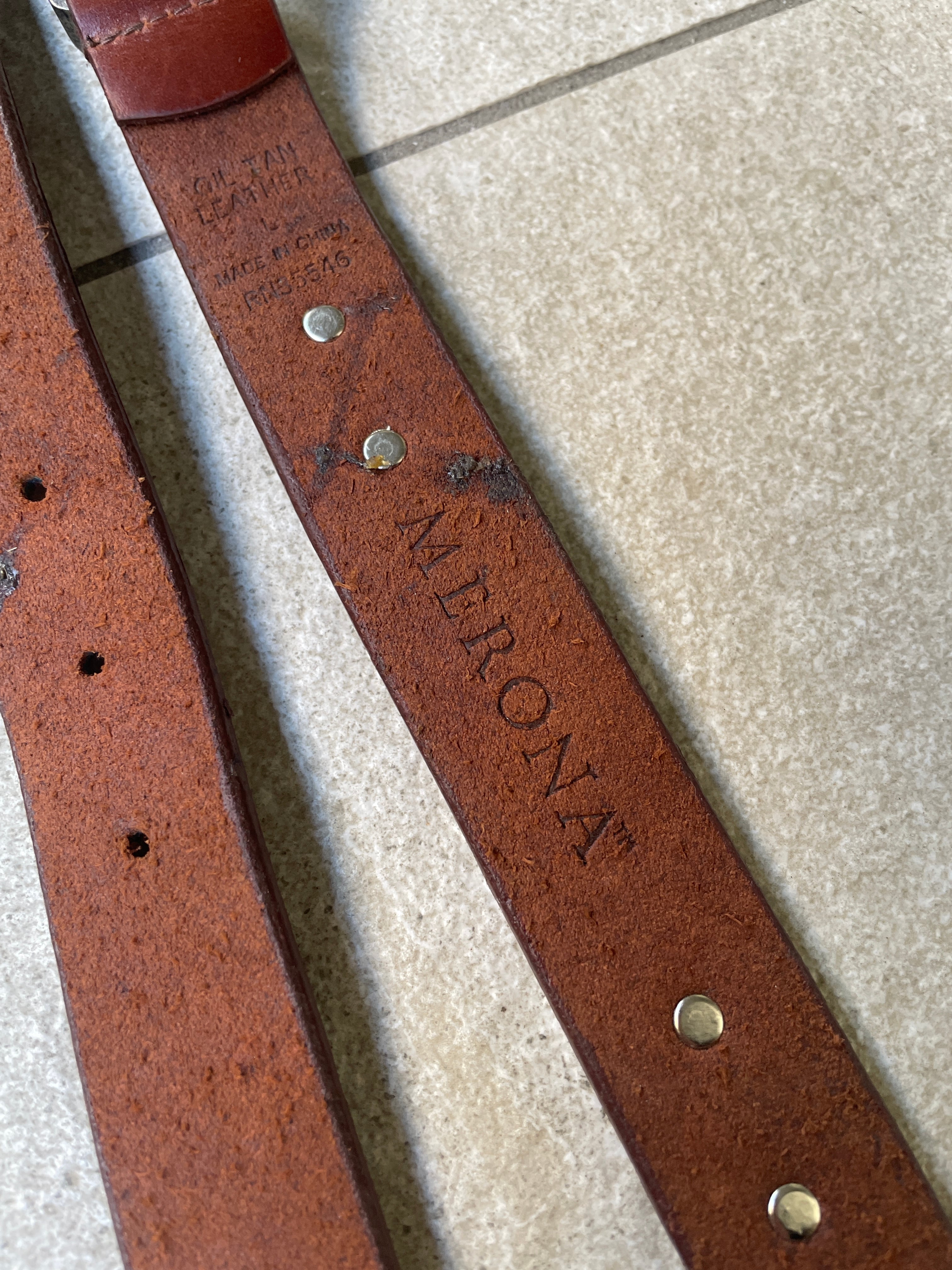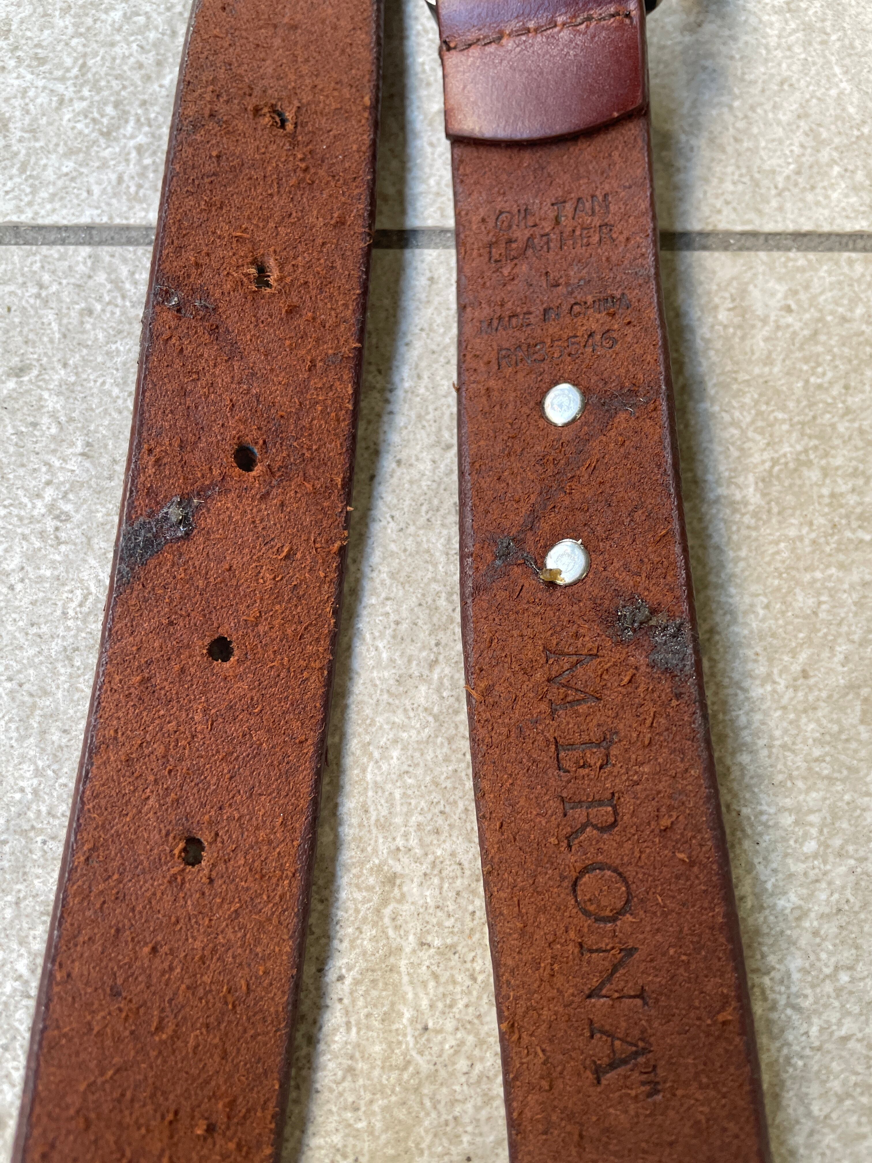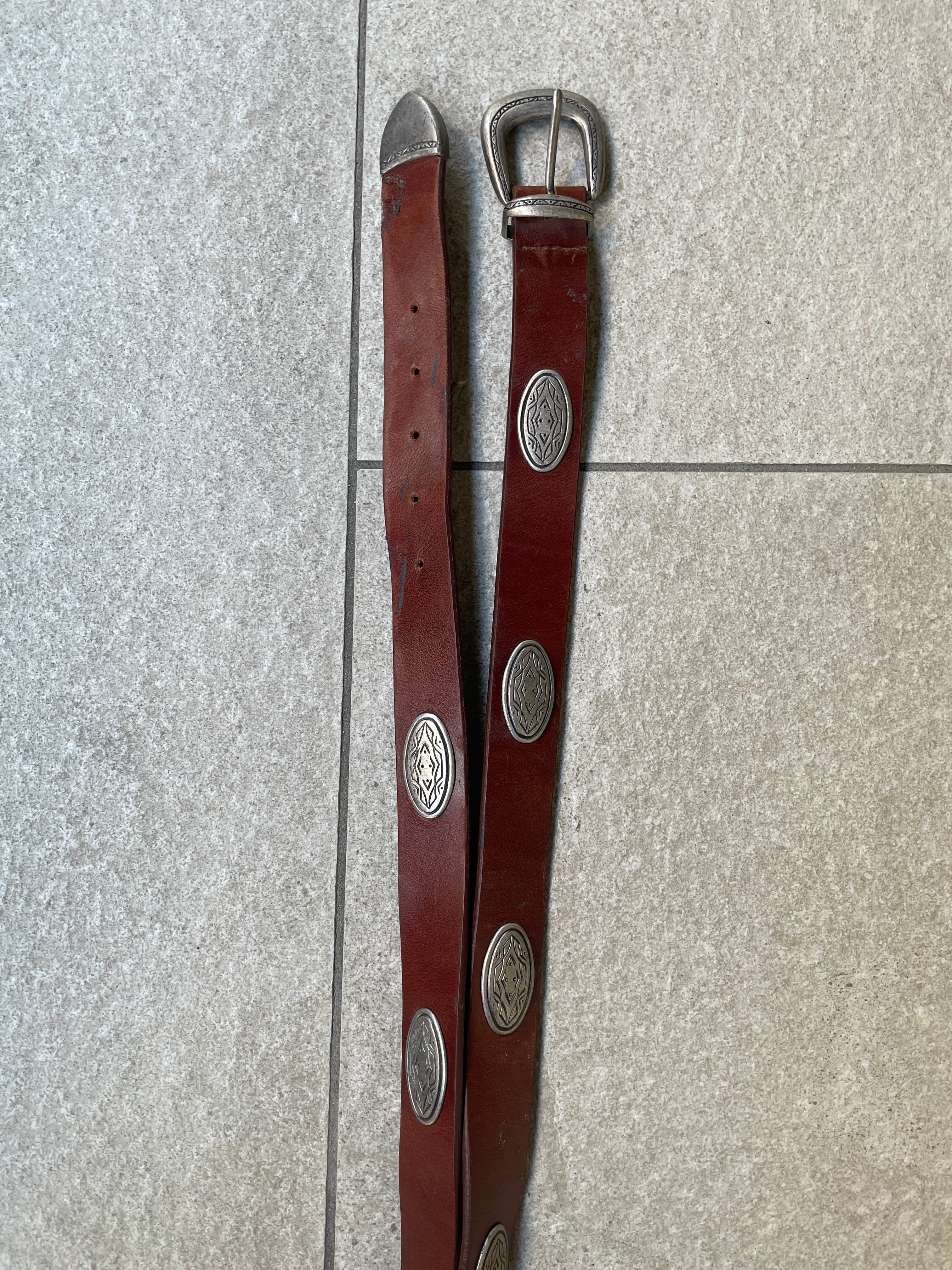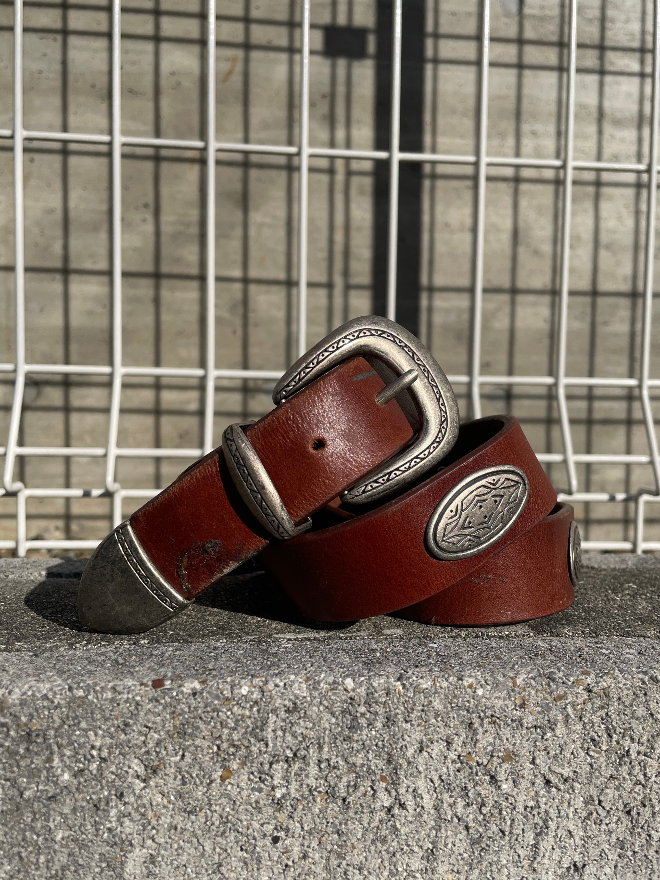 渋さのあるブラウンカラーで、コンチョデザインが施されたウエスタンレザーベルト。バックル、コンチョに細かな彫刻が施されています。深みのあるブラウンレザーで、使えば使うほど風合いが増すベルトかと思います。アメカジなどにはもちろんですが、様々なファッションの良いアクセントになってくれるアイテムかと思います。