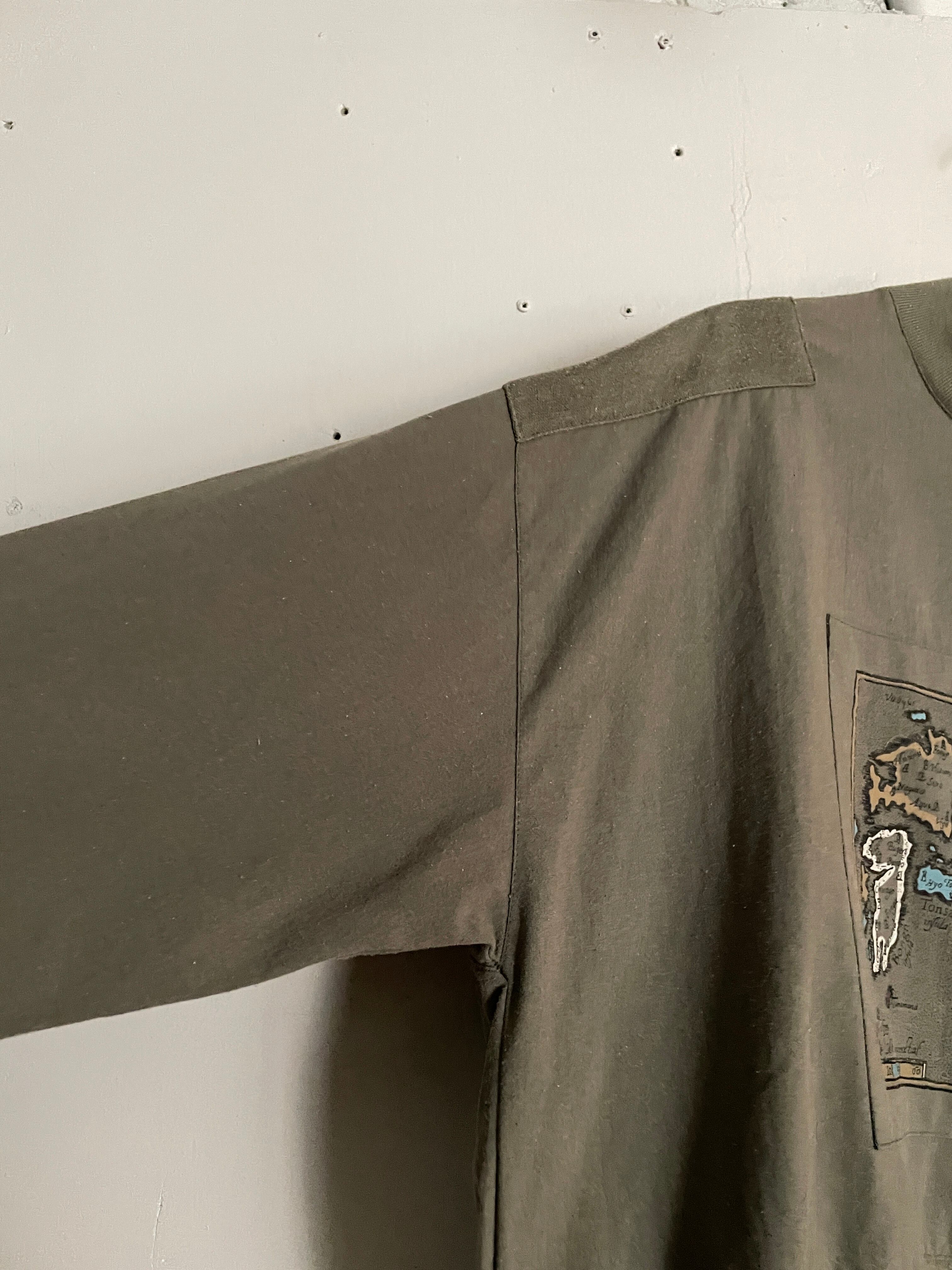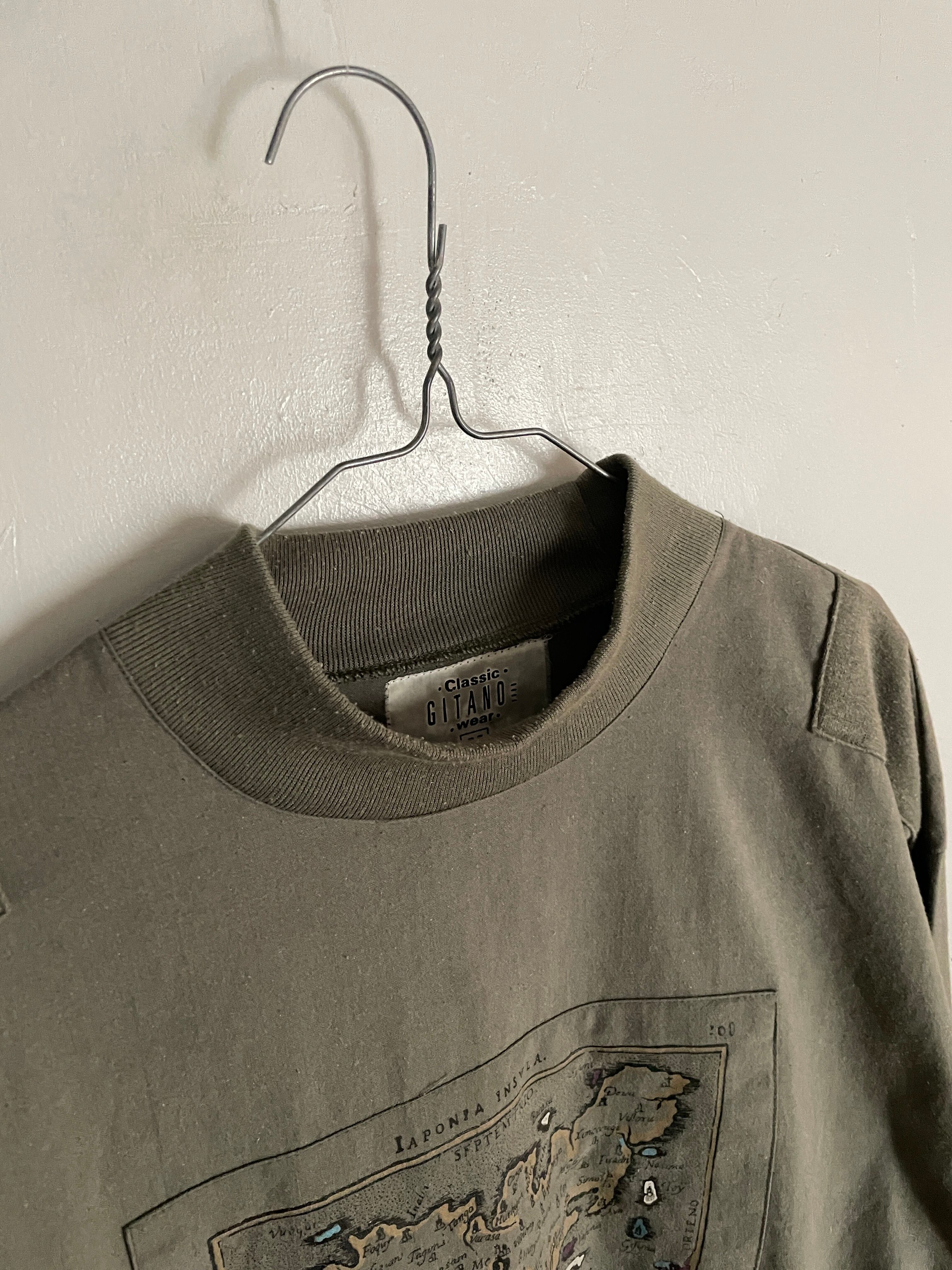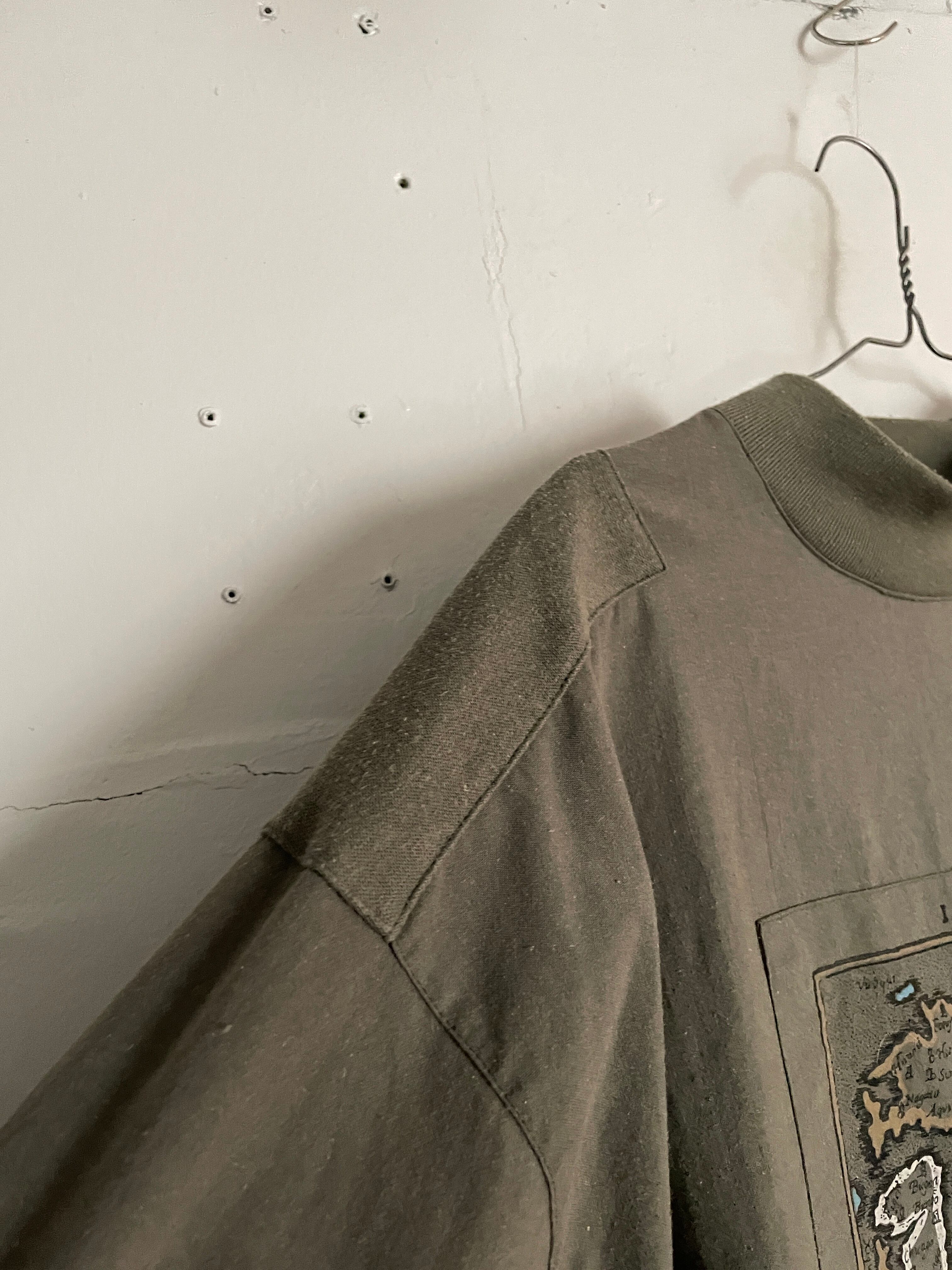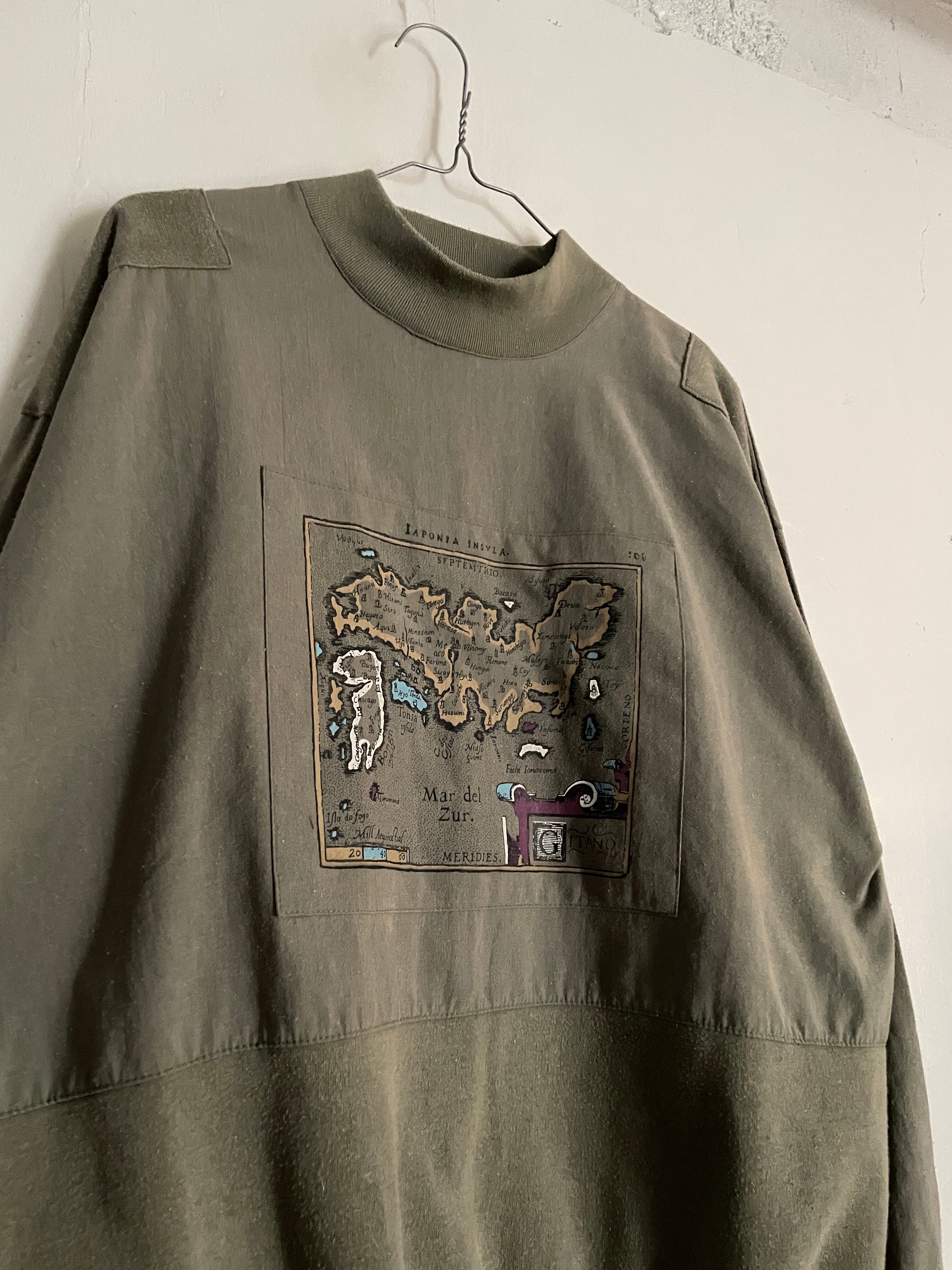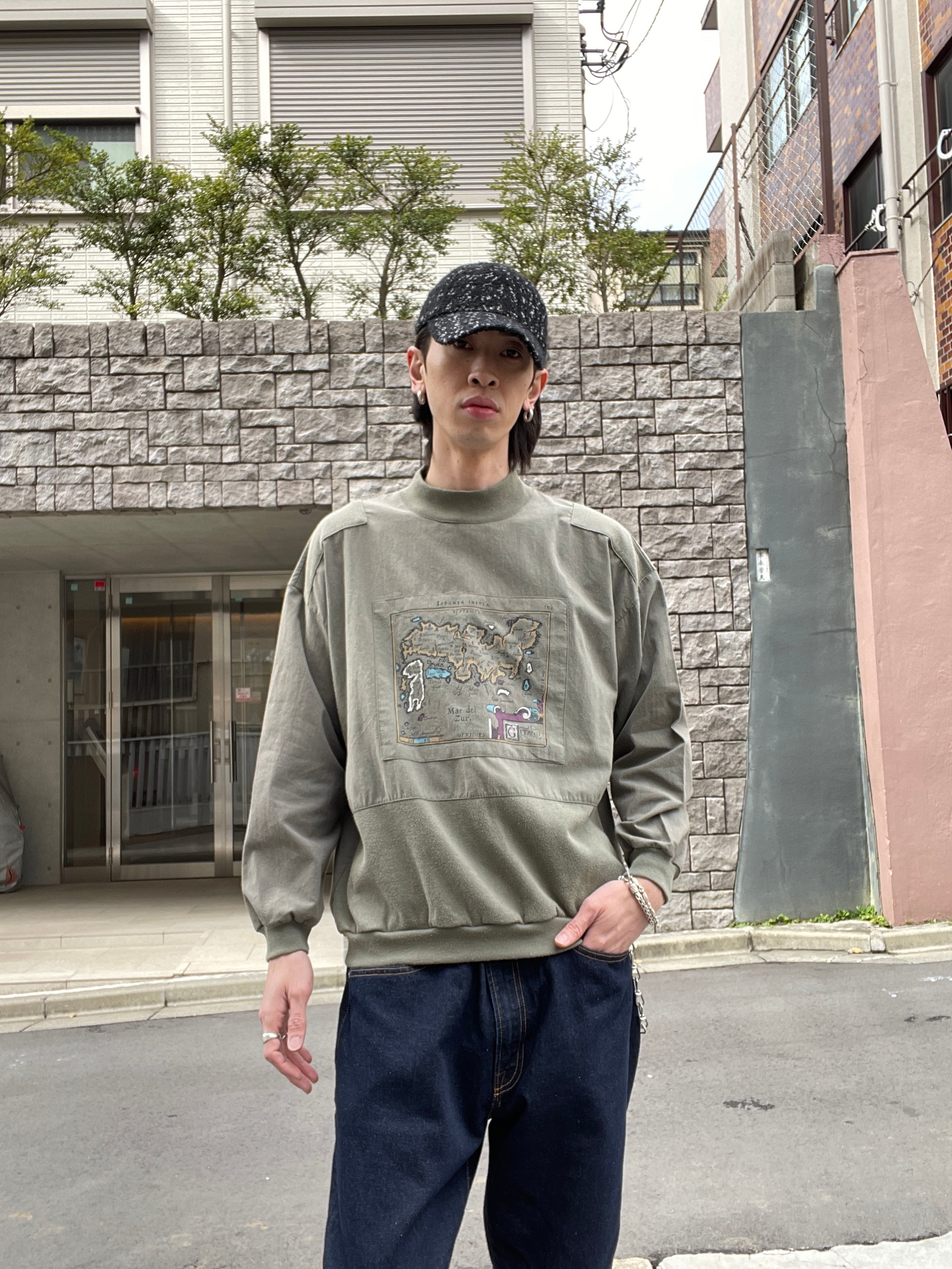 カーキボディに、古い地図のイラストパッチデザインが施された、スウェット。一つ一つに細かく島の名前がプリントされています。ただのプリントではなく、パッチで貼り付けられているのも面白いです。肩部分にも同じカーキでパッチデザイン。こういったさりげないデザインからもこだわりが感じられます。ポリとコットンの軽くて着やすい素材感。一枚ではもちろん、インナーとしても活躍してくれる一着です。