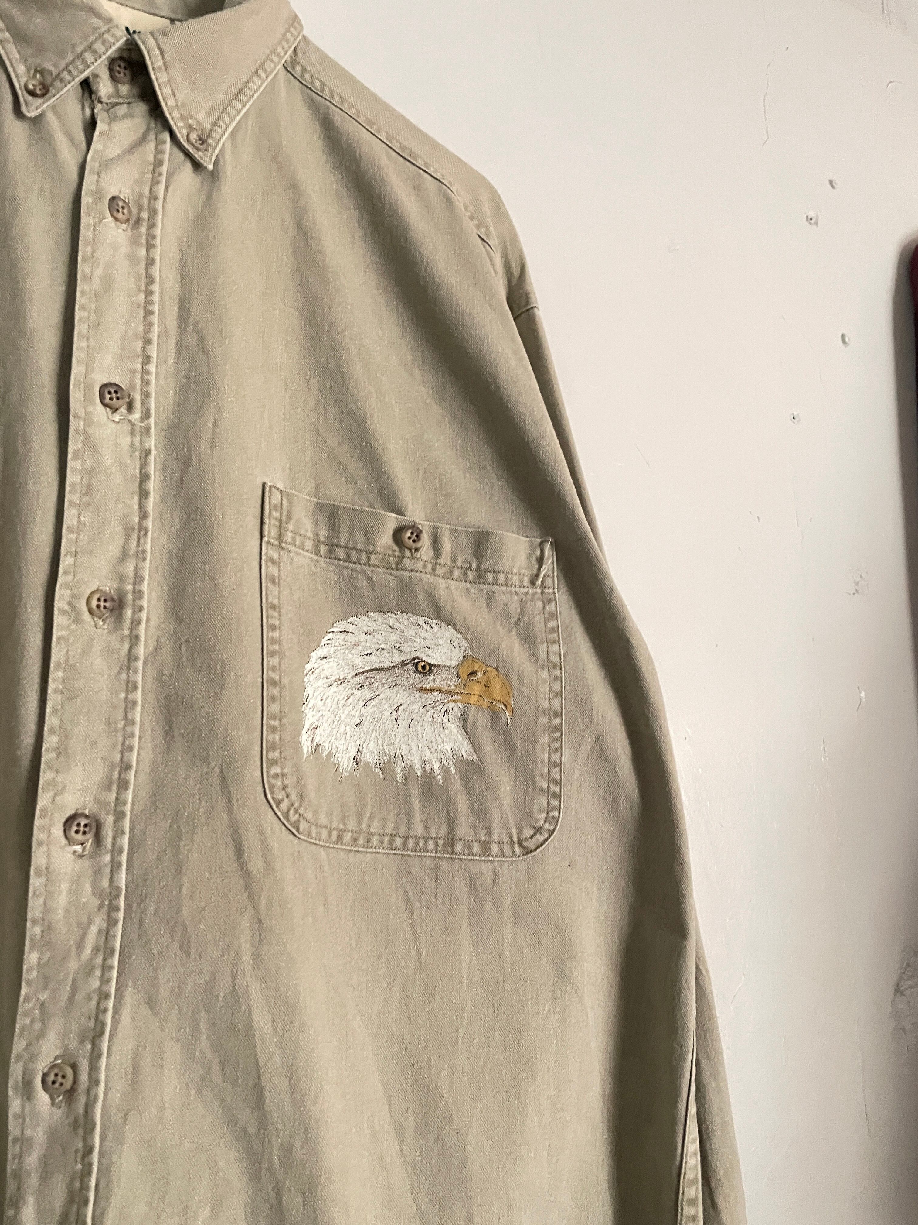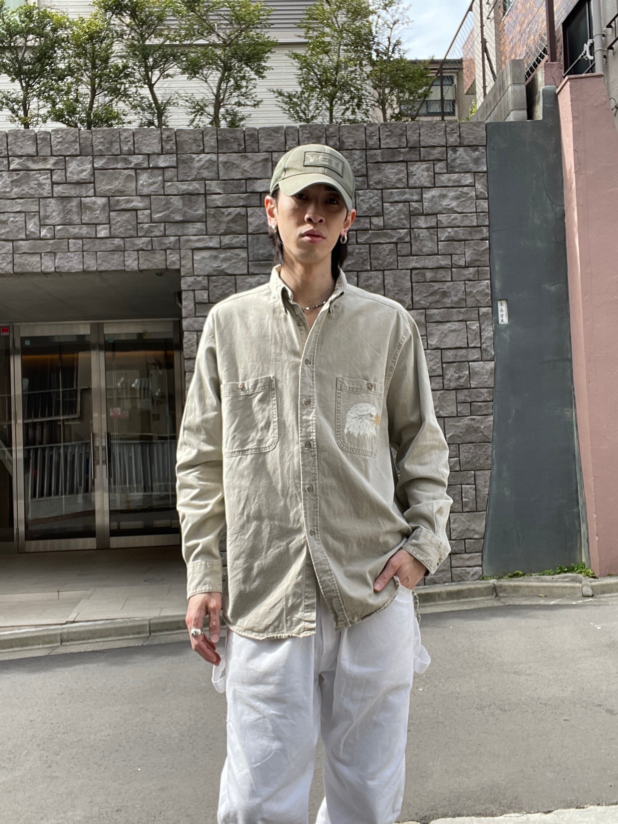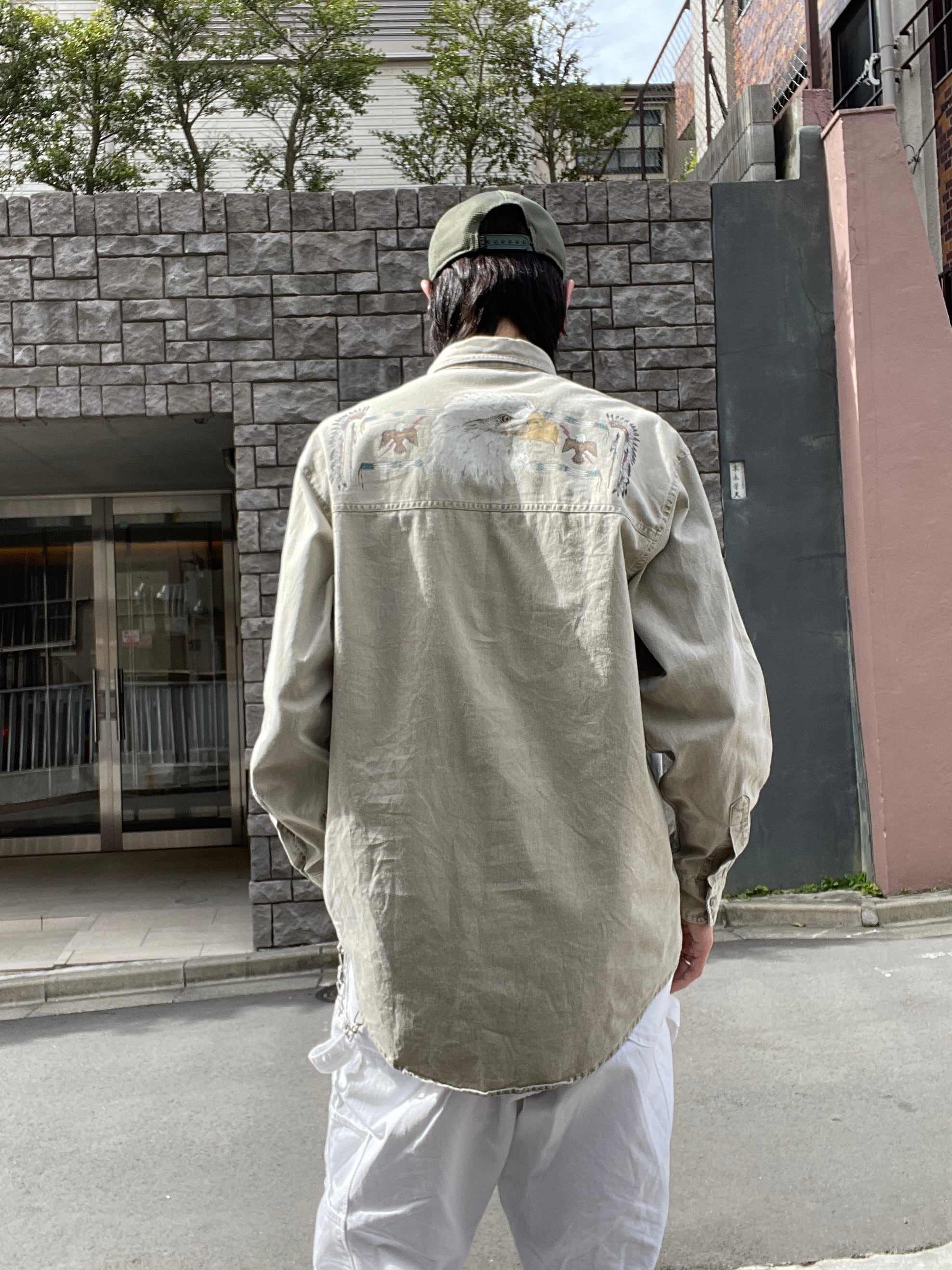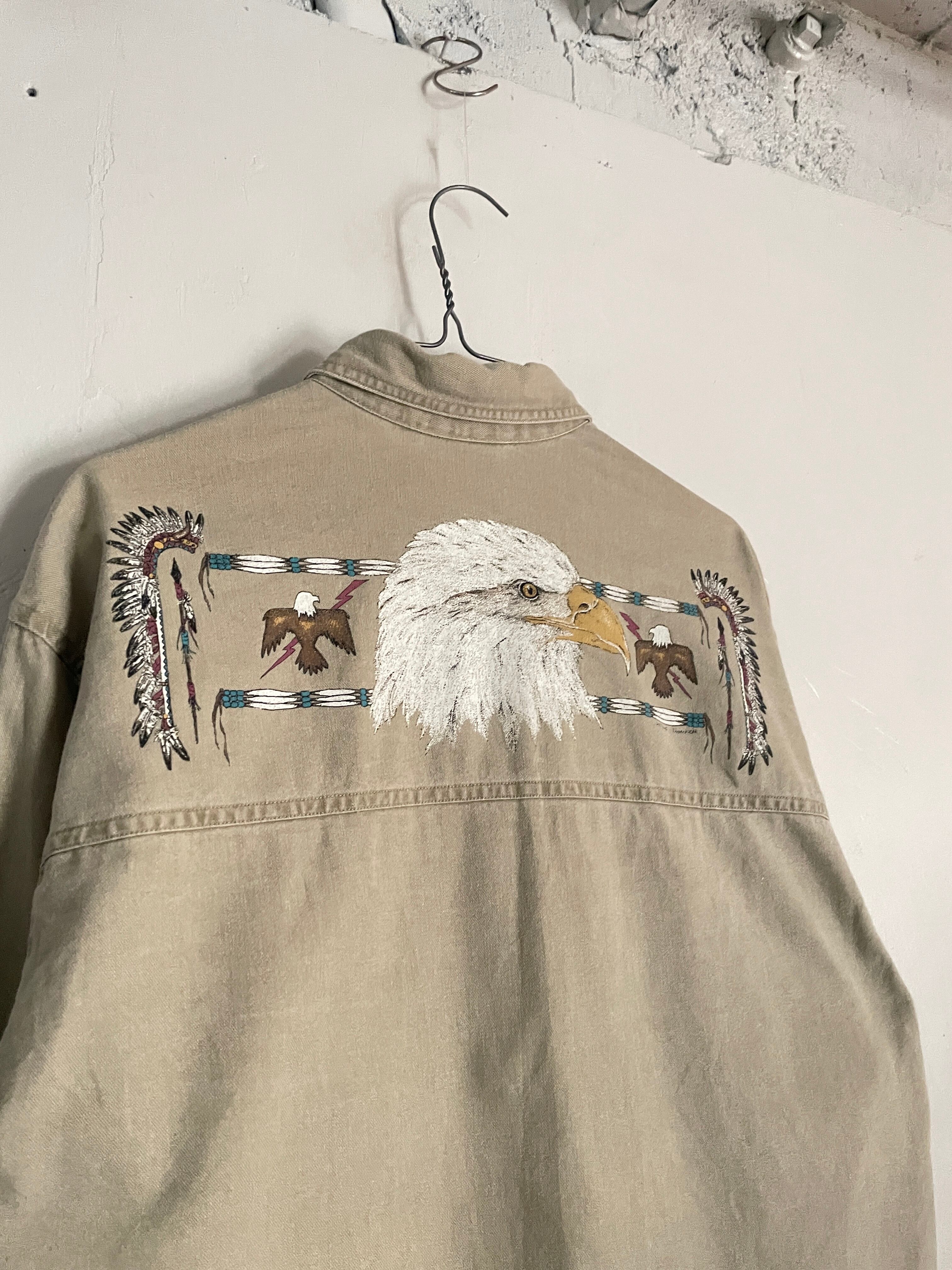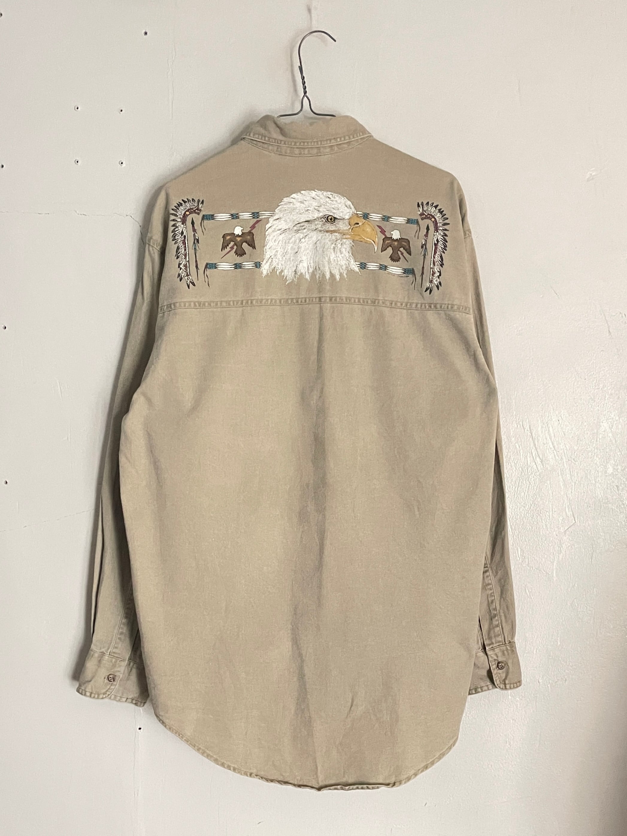 ベージュボディに、ネイティブアメリカンをモチーフにしたプリントが両面に施されたコットンシャツ。フロント部分にはポケット上にイーグルプリント。バックにはデカめのイーグルとネイティブアメリカンの羽根飾りのようなプリントが施されています。アートティスティックなプリントデザインがお洒落です。ゆったりとしたサイズ感なので、春などには一枚でラフに着られそうです。USA製なのもポイントが高いです。