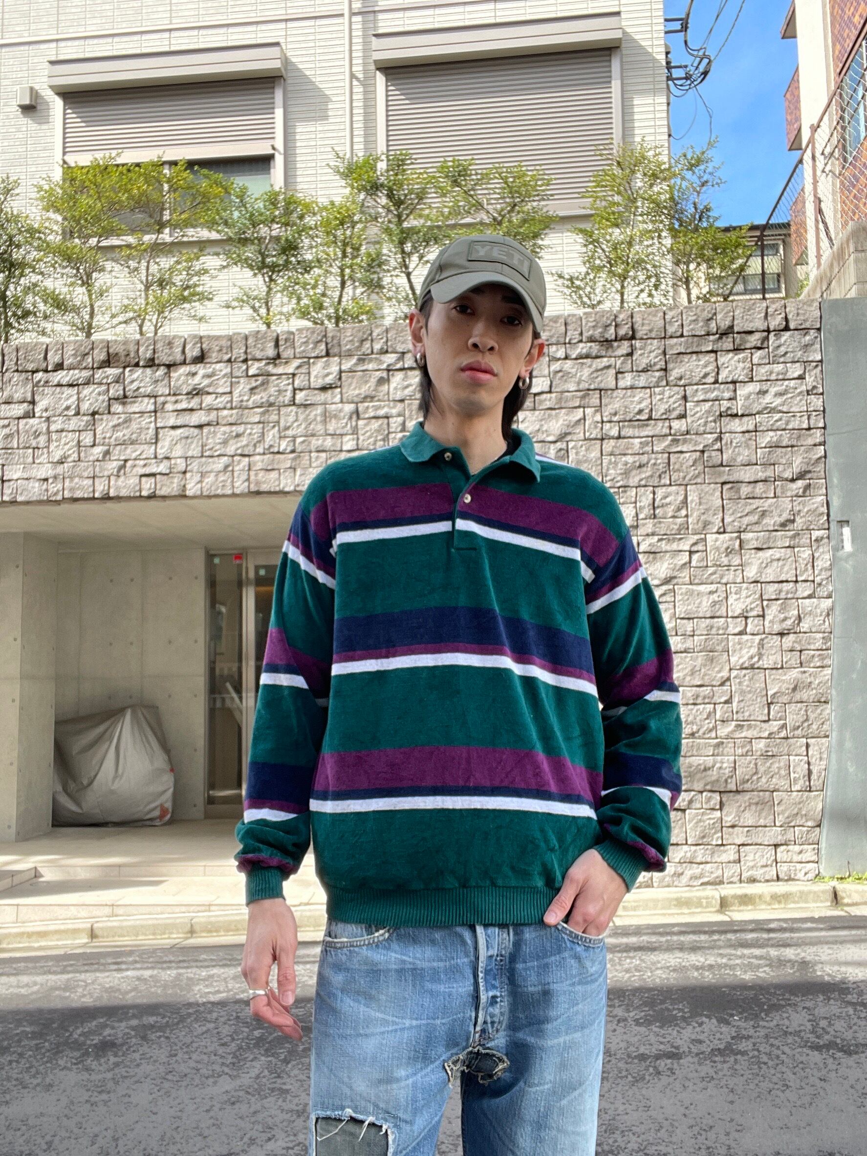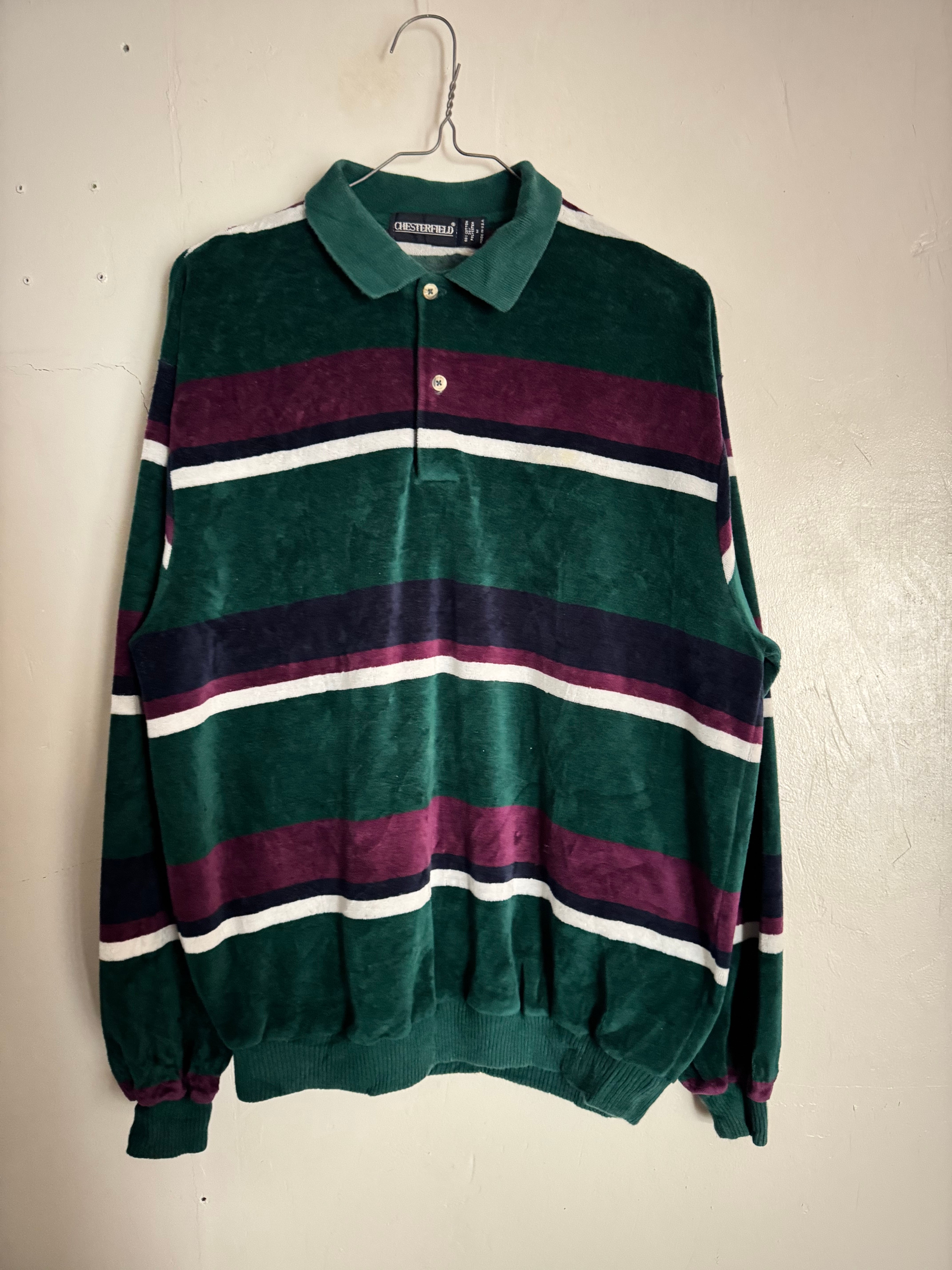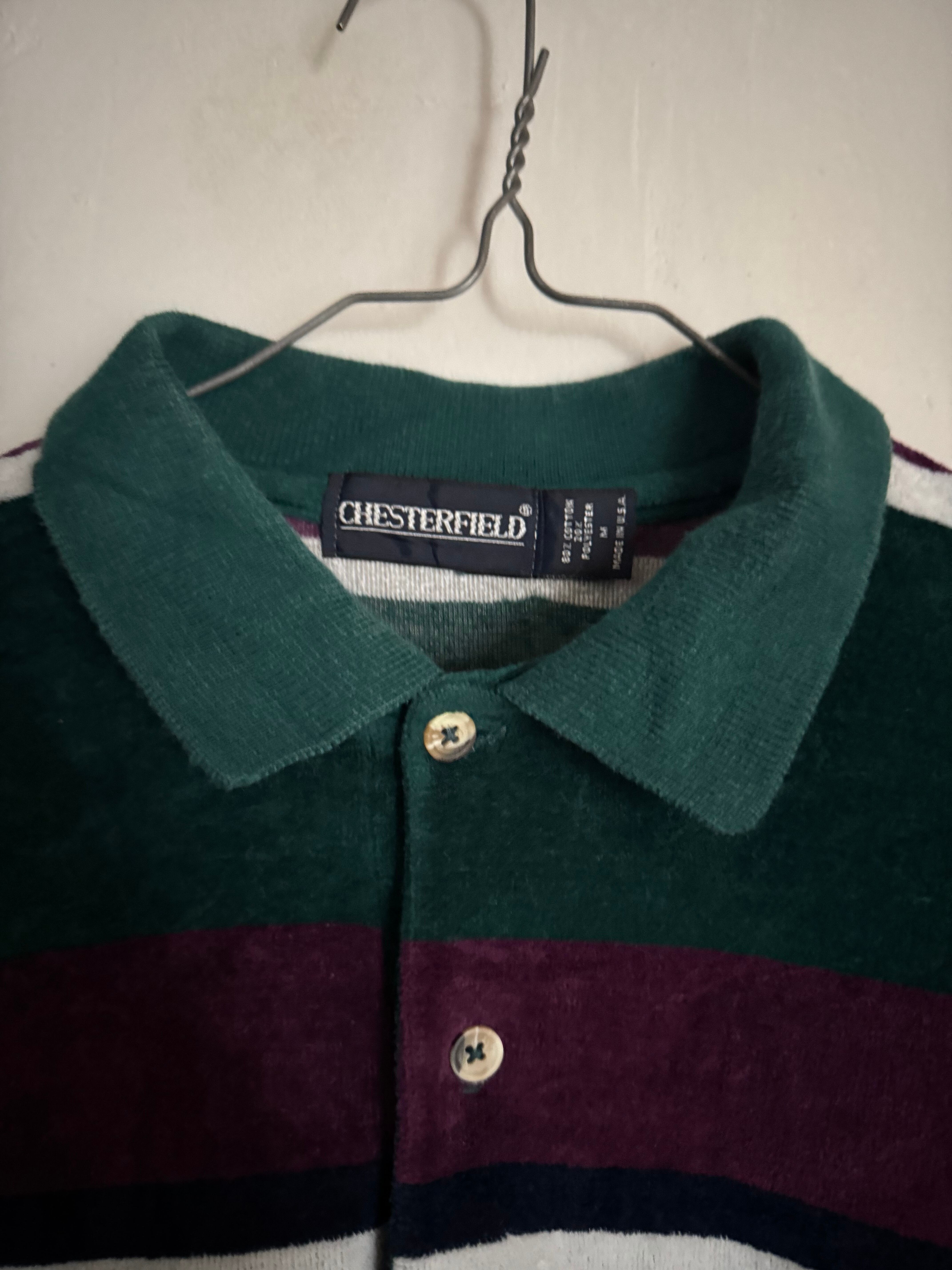 深みのあるグリーンをベースに、パープルとネイビー、ホワイトのボダーが映えるChesterfieldのベロアポロ。光沢感のある柔らかなベロア素材が特徴で、角度によって表情が変わる上品な一枚です。ゆったりとしたシルエットにリブ仕様の裾と袖口が程良い丸みを生み、クラシックながら今っぽいバランス。スラックスで品よく、デニムでカジュアルにも合わせられる万能な一着です。